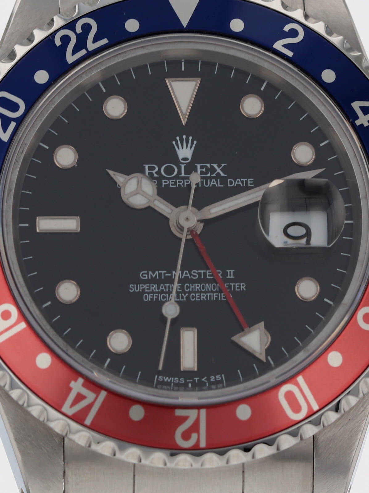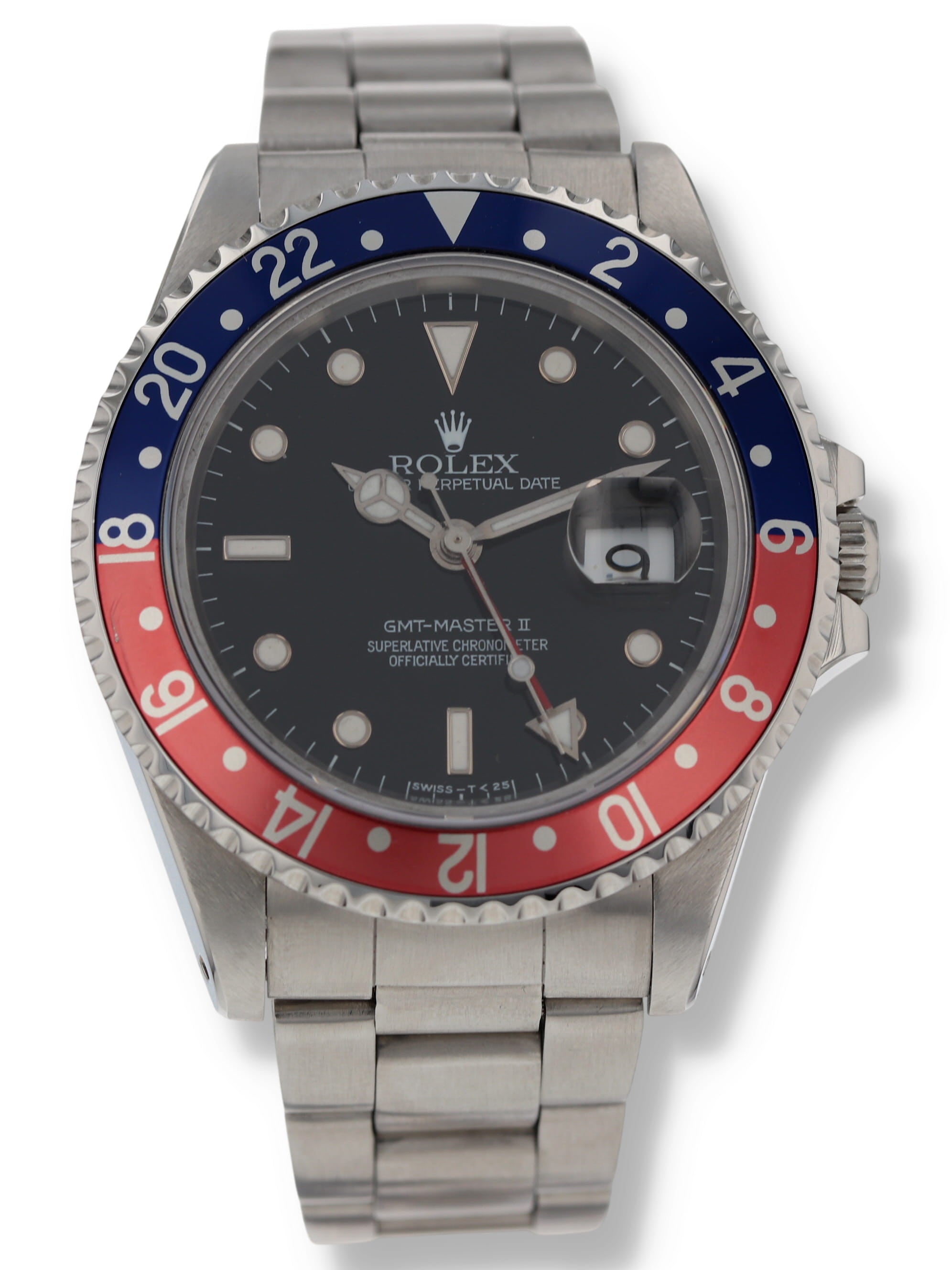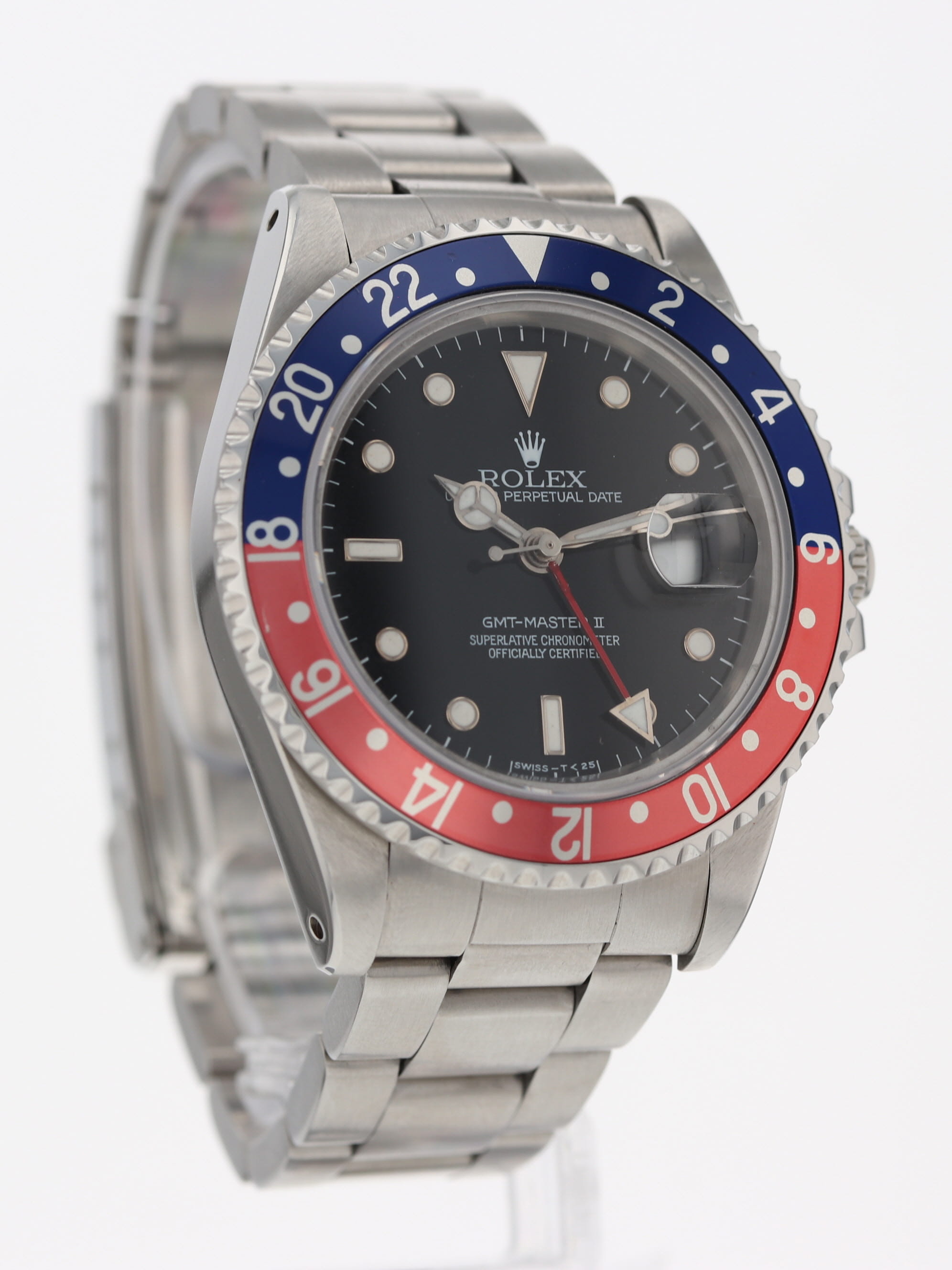 Rolex stainless steel GMT-Master II, automatic, size 40mm. Rolex reference 16710 with a stainless steel case and Oyster bracelet, blue/red "Pepsi" rotating 24-hour bezel, black index dial, magnified date display, sapphire crystal. "T" serial. Rolex papers dated 1995. One year full warranty.