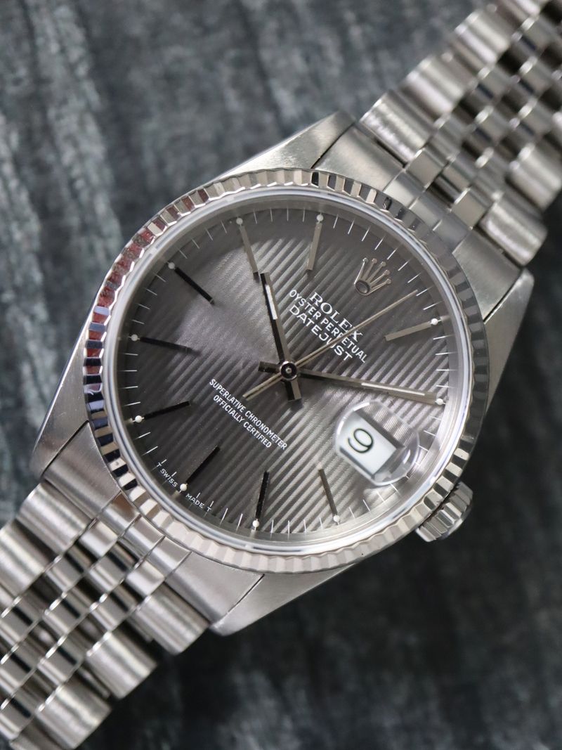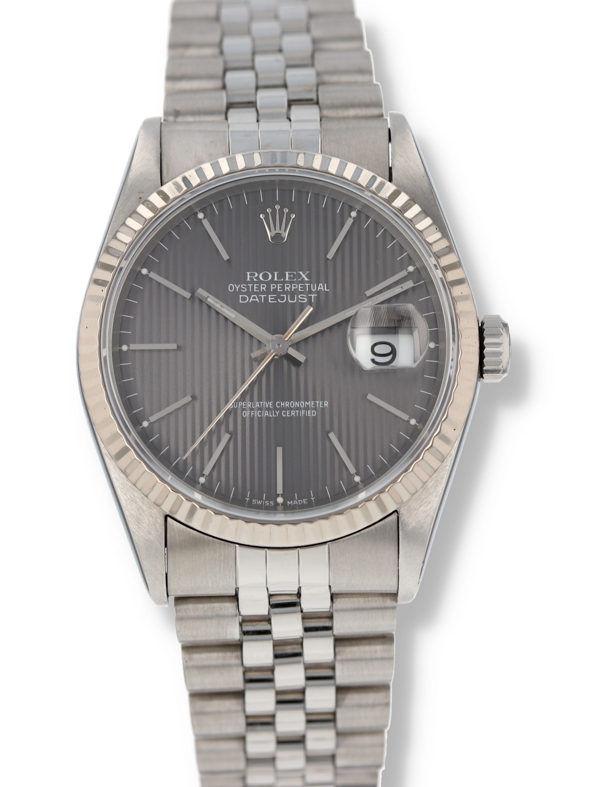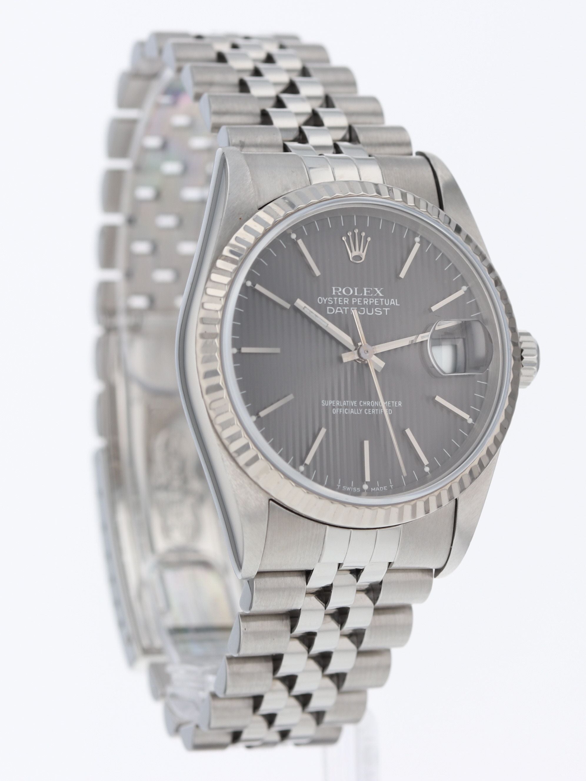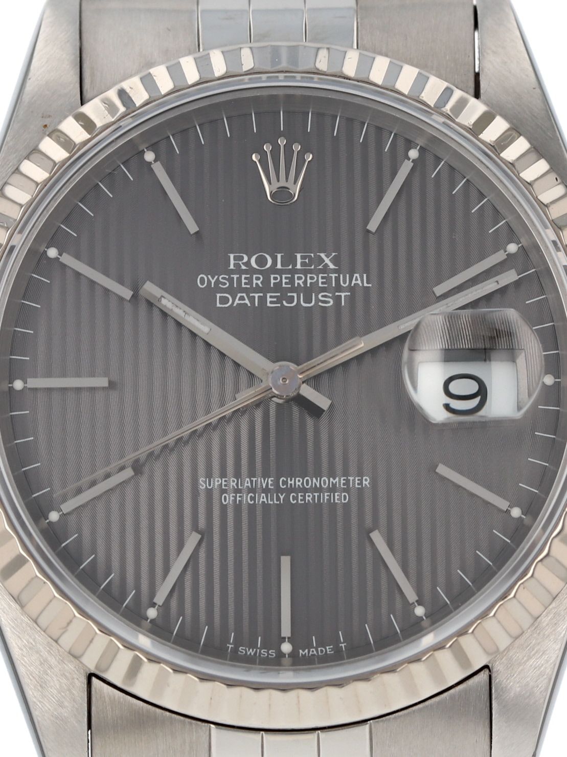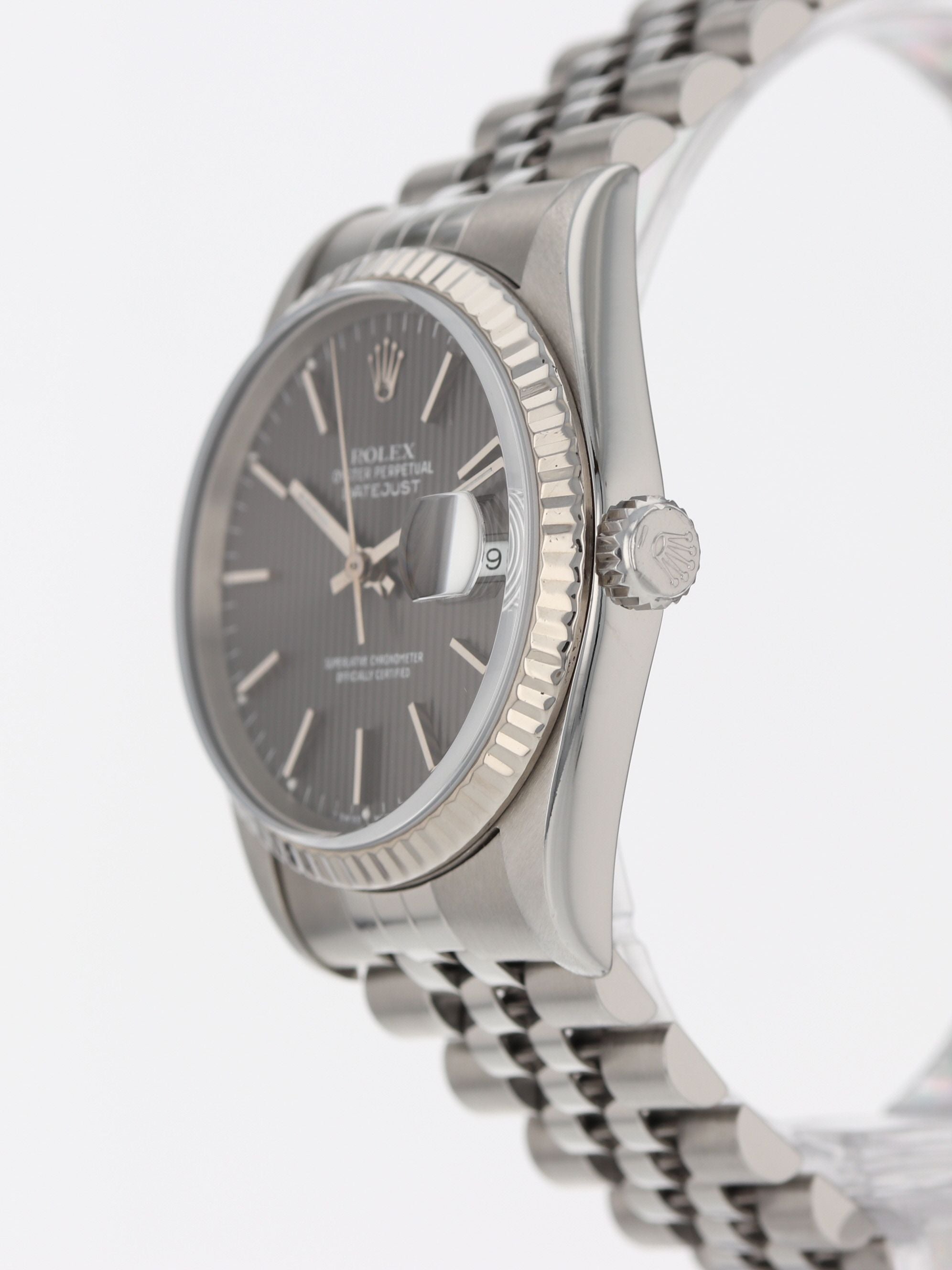 Rolex stainless steel Datejust, automatic, size 36mm. Rolex reference 16234 with a stainless case and Jubilee bracelet, 18k white gold fluted bezel, grey tapestry dial, magnified date display, sapphire crystal. "W" serial, circa 1995. One year full warranty.