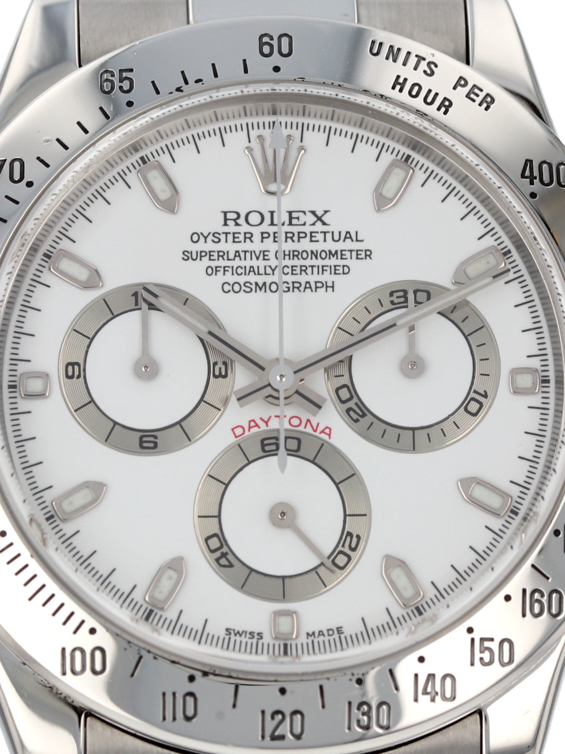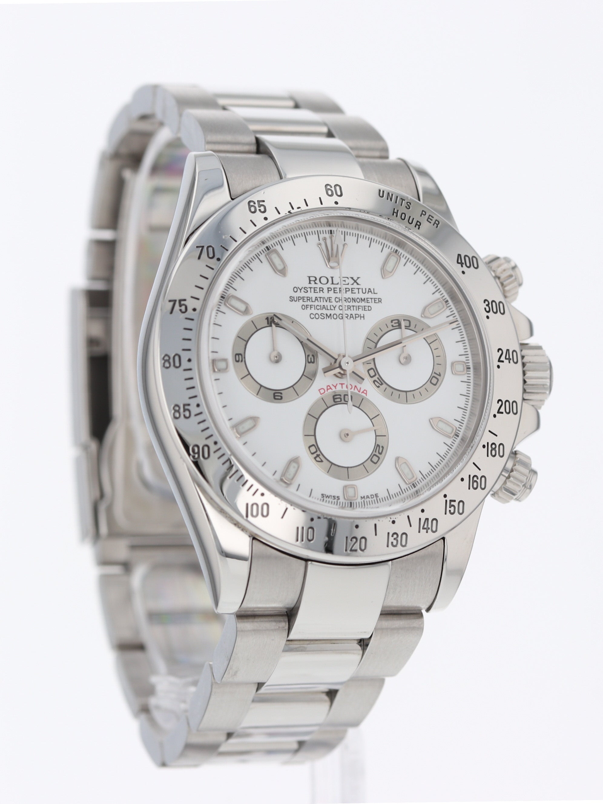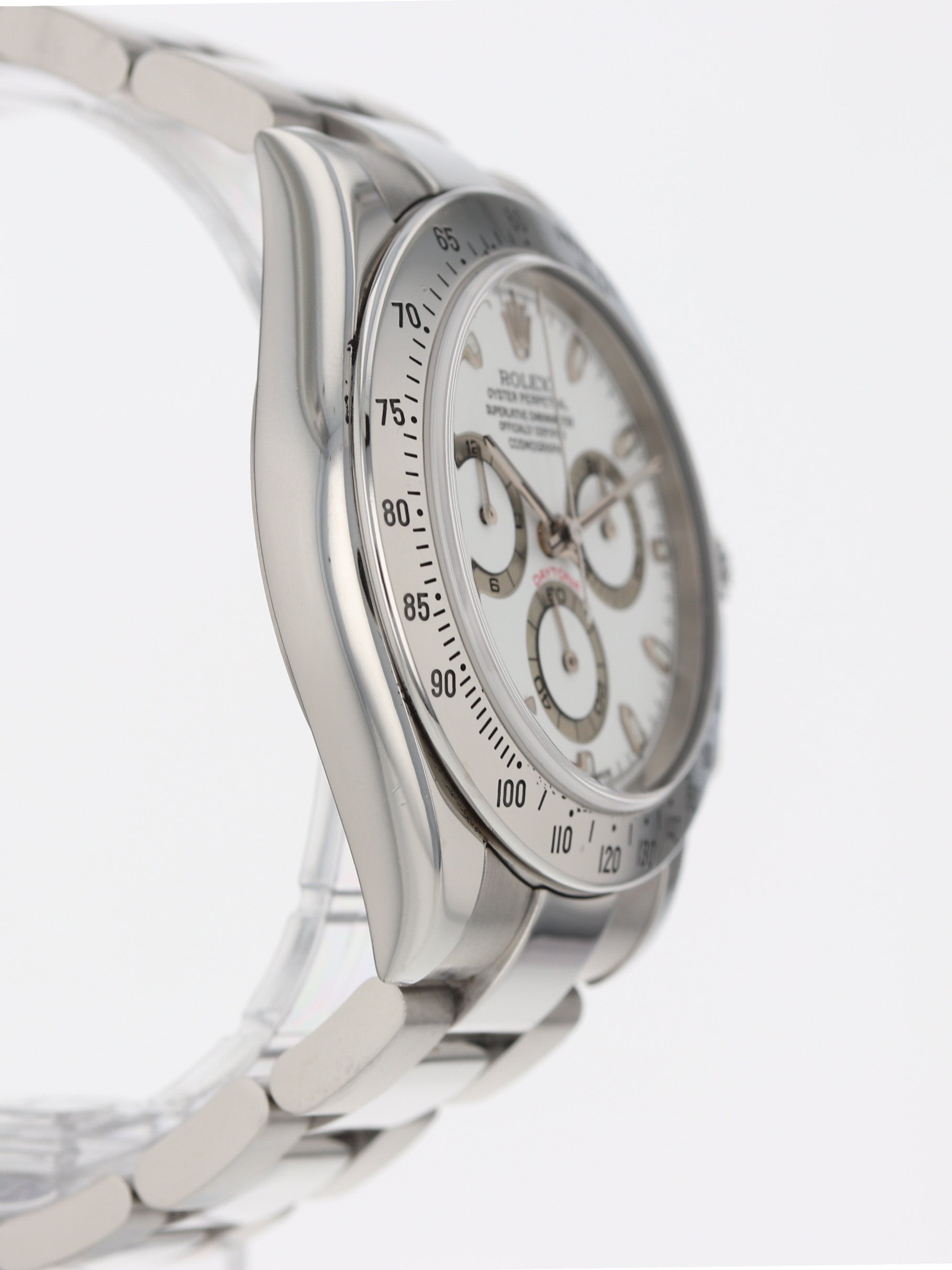 Rolex stainless steel Cosmograph Daytona, automatic, size 40mm. Rolex reference 116520 with a stainless steel case and Oyster bracelet with flip-lock clasp, 5mm comfort extension link, white Swiss Made index dial, luminescent markers and hands, fixed tachymetre bezel, chronograph, sapphire crystal. "P" serial, circa 2000. One year full warranty.