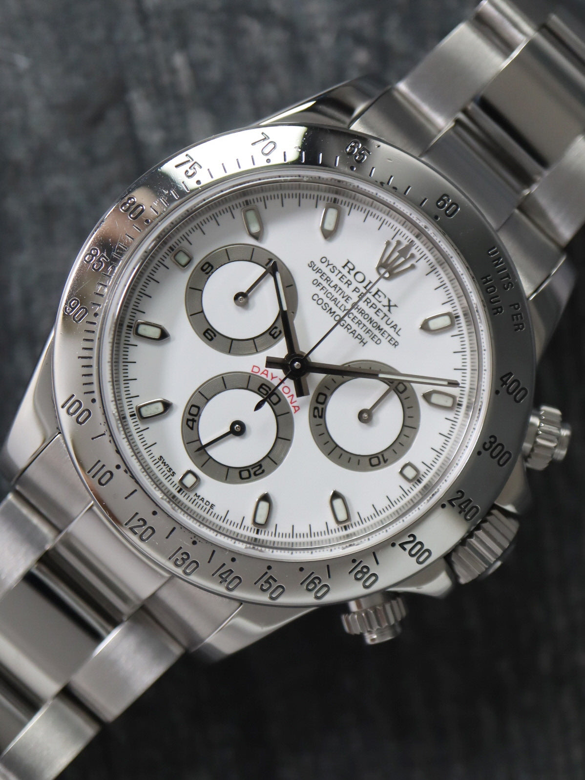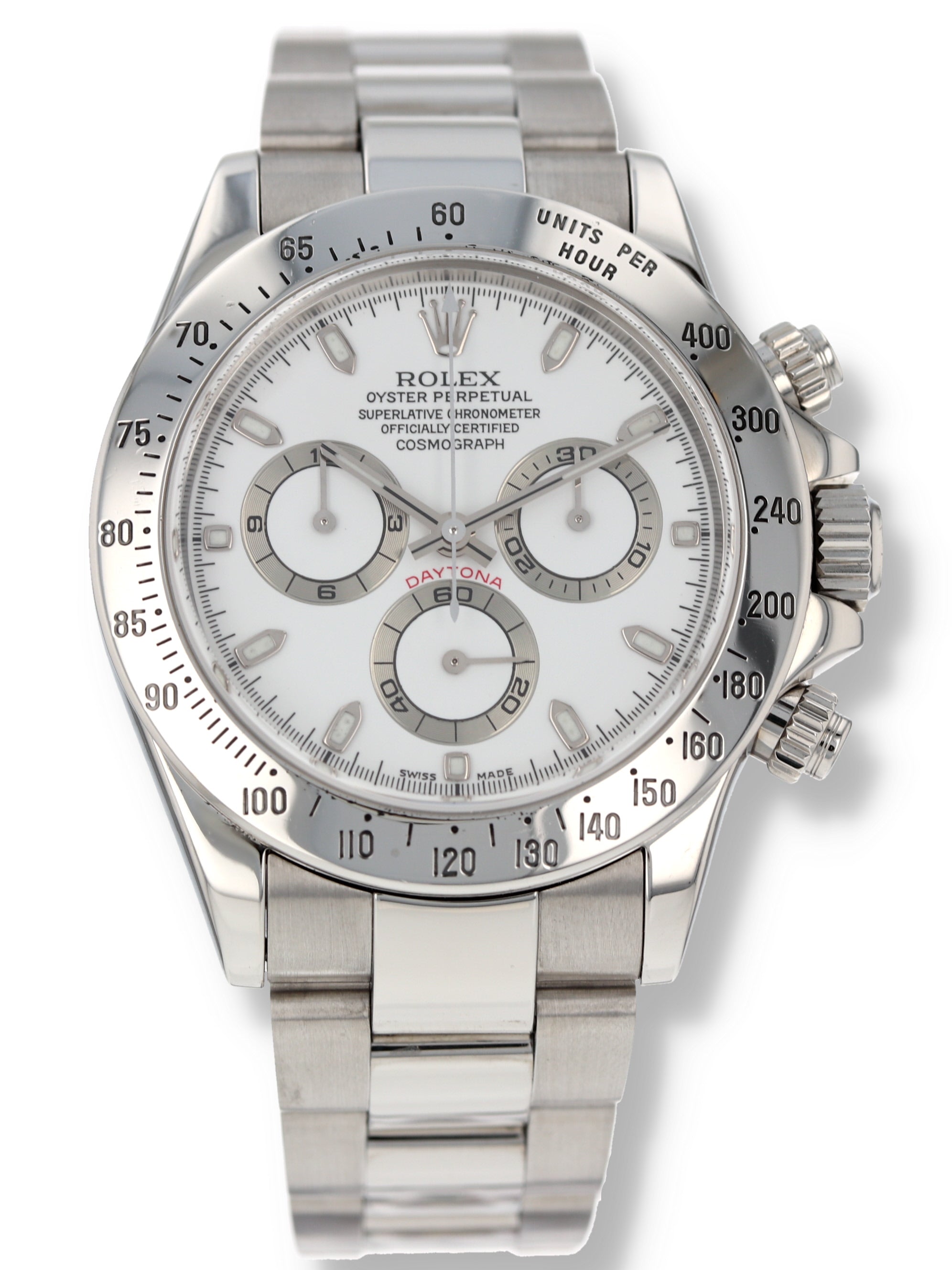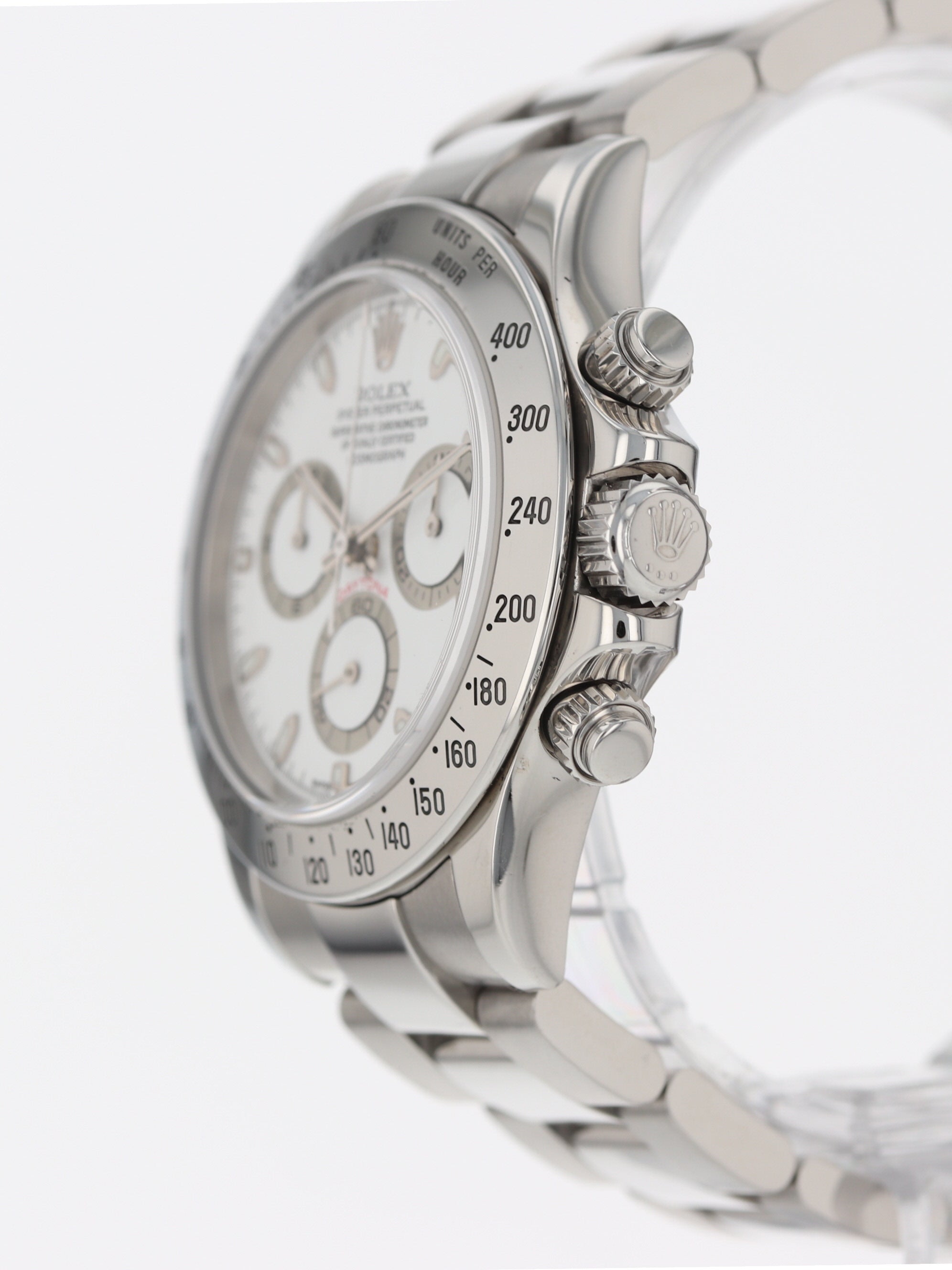 Rolex stainless steel Cosmograph Daytona, automatic, size 40mm. Rolex reference 116520 with a stainless steel case and Oyster bracelet with flip-lock clasp, 5mm comfort extension link, white Swiss Made index dial, luminescent markers and hands, fixed tachymetre bezel, chronograph, sapphire crystal. "P" serial, circa 2000. One year full warranty.