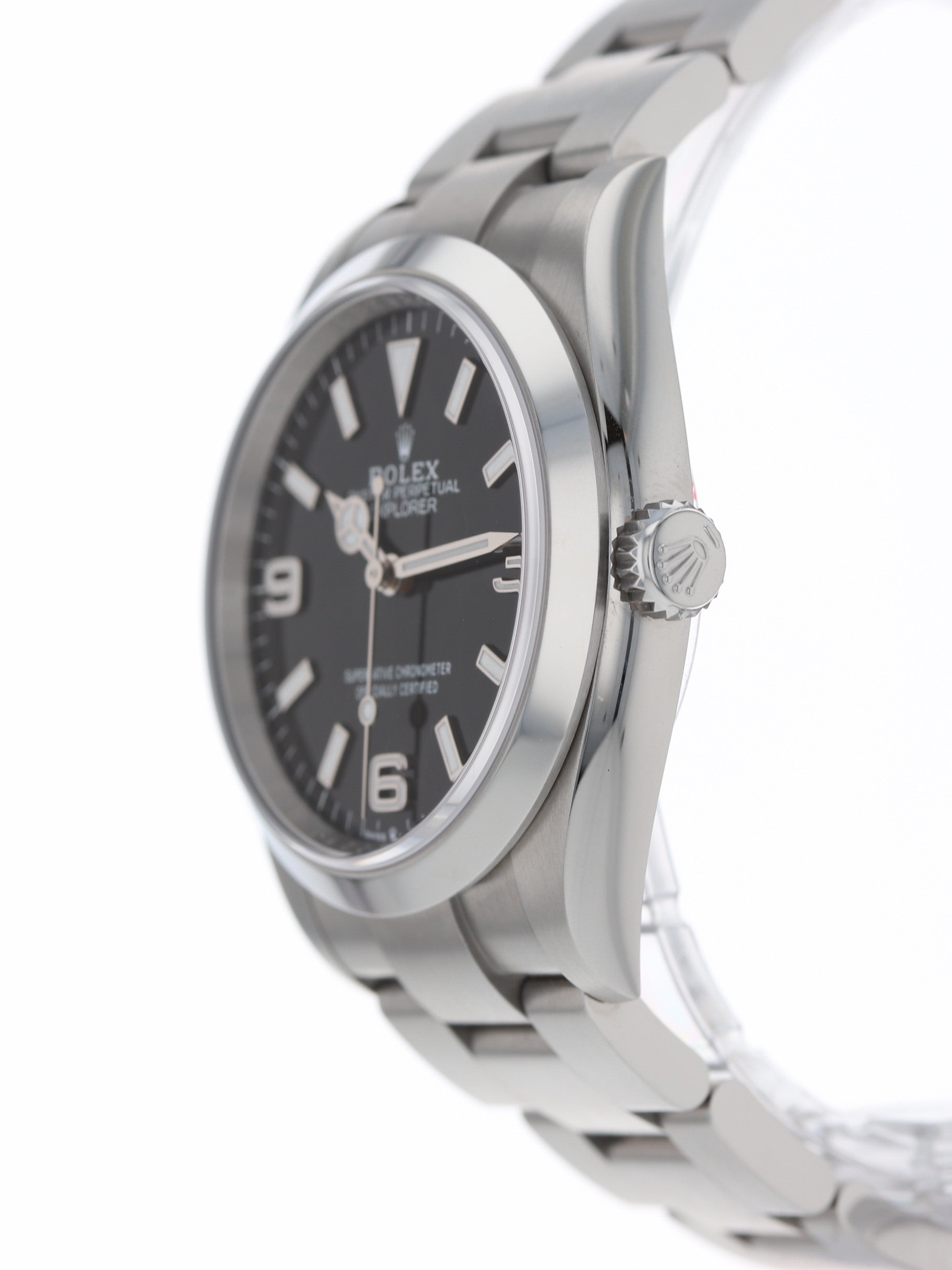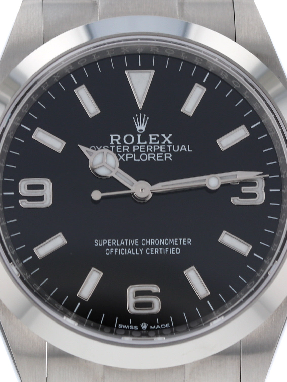 Rolex stainless steel Explorer, automatic, size 36mm. Rolex reference 124270 with a stainless steel case, polished smooth bezel, Oyster bracelet with Easylink 5 mm comfort extension link, black 3, 6, 9 dial, luminescent markers and hands, sapphire crystal. Rolex box and 2025 card. Five year full warranty. Like New condition.