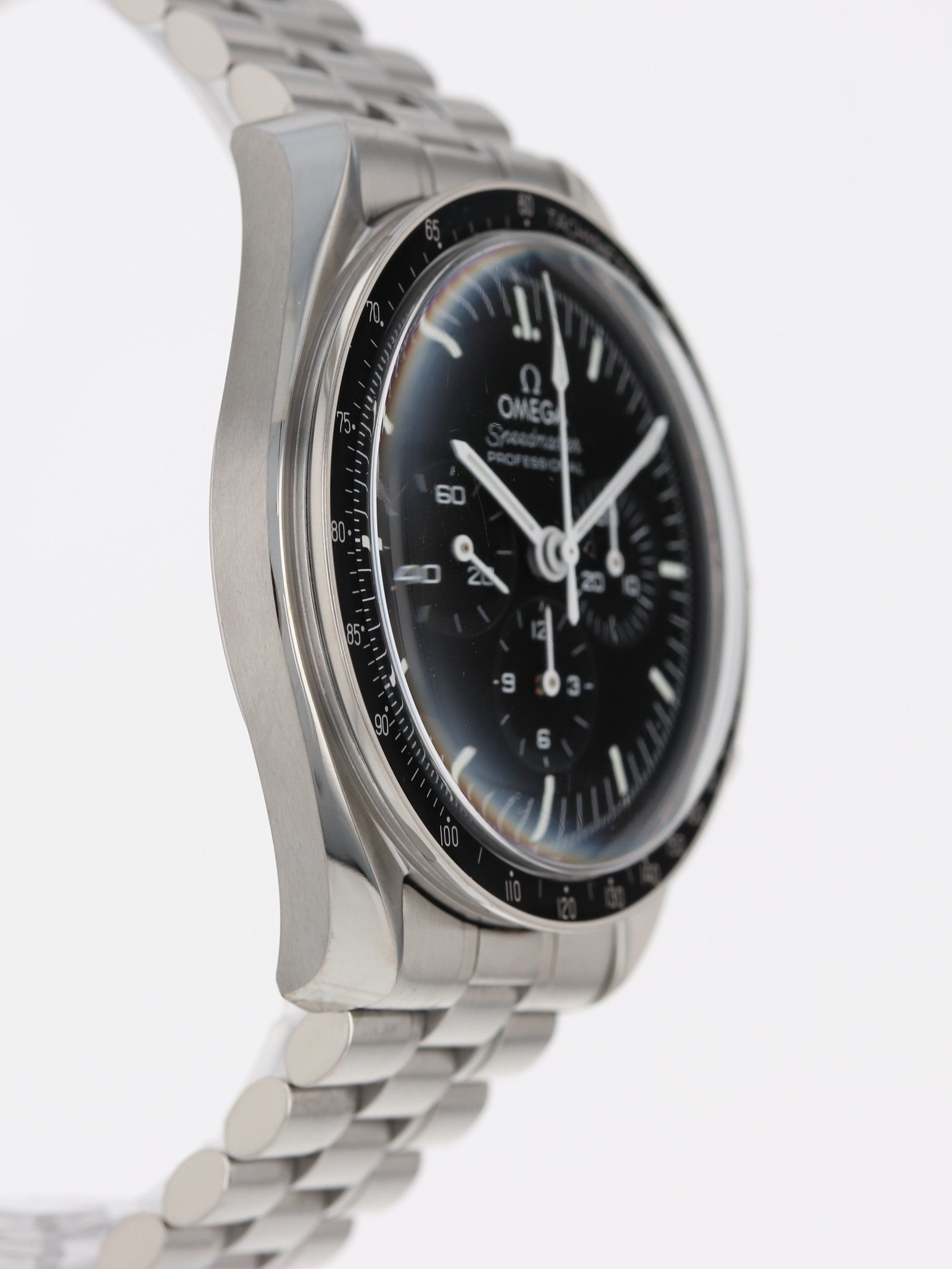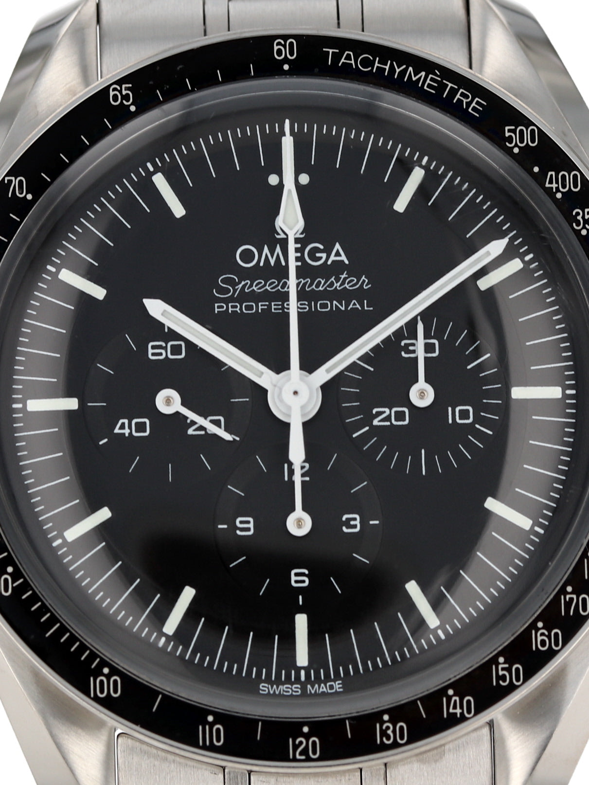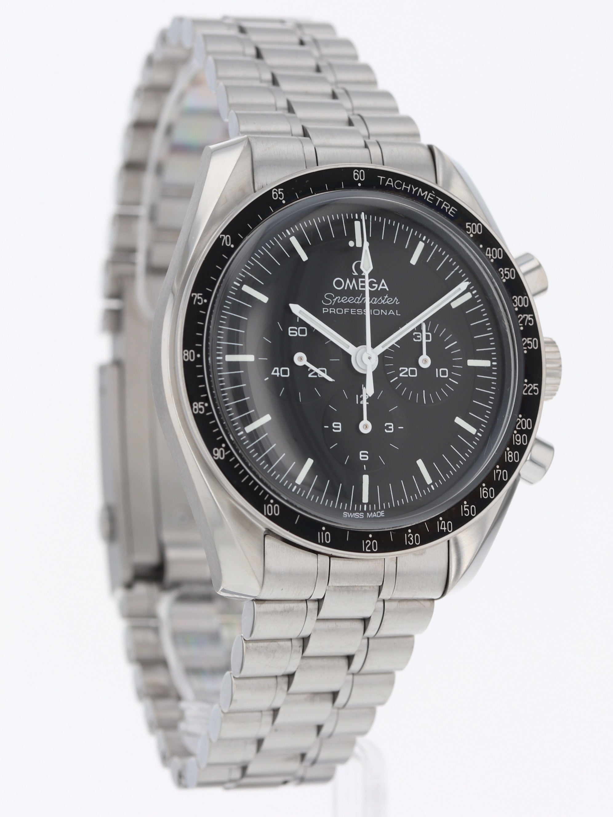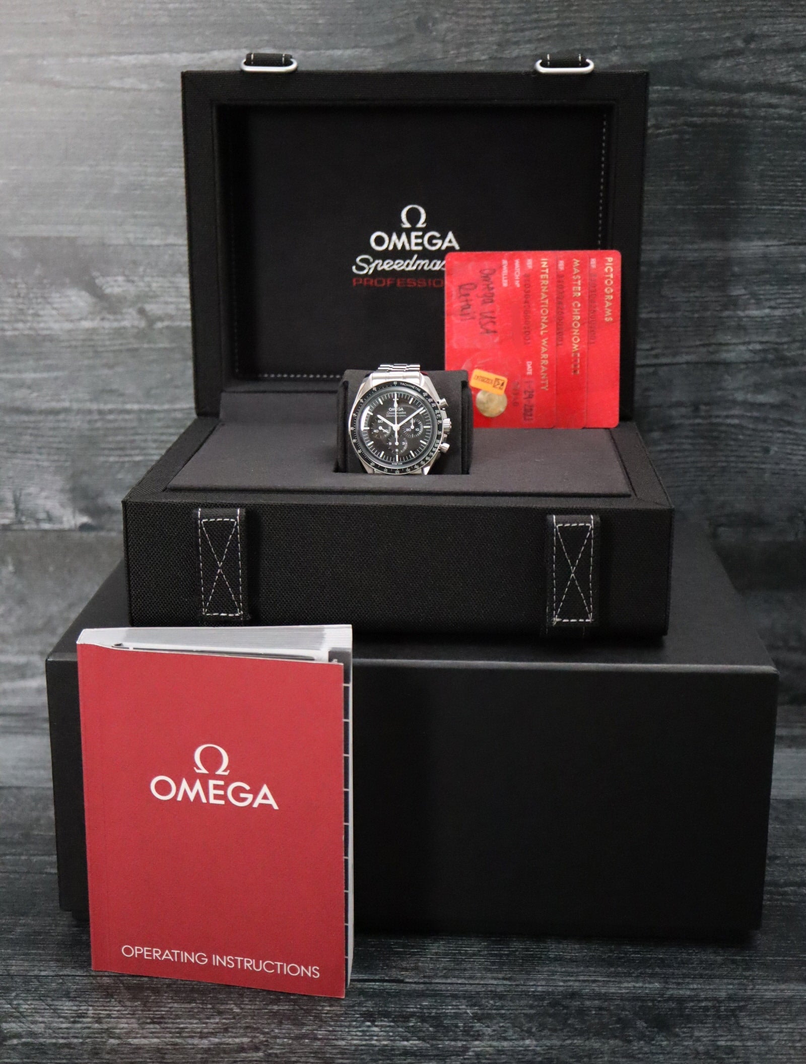 Omega stainless steel Speedmaster Moonwatch, manual, size 42mm. Omega reference 310.30.42.50.01.001 with a stainless steel case and bracelet, black tachymetre bezel, black dial, chronograph, hesalite crystal. Omega box and 2021 card. One year full warranty. List $7,800.