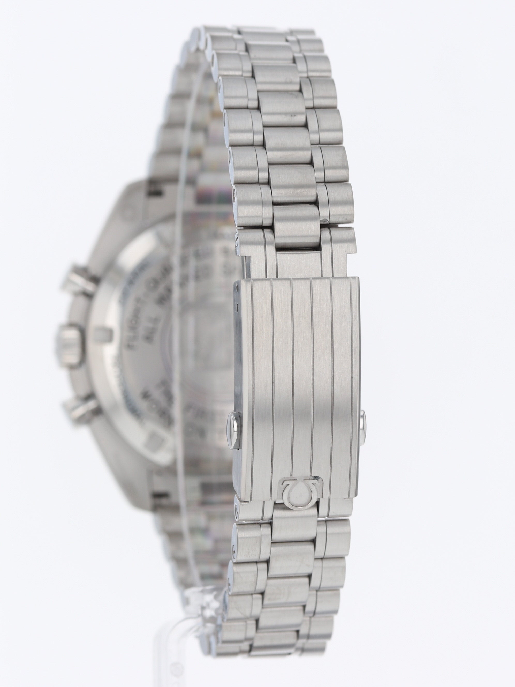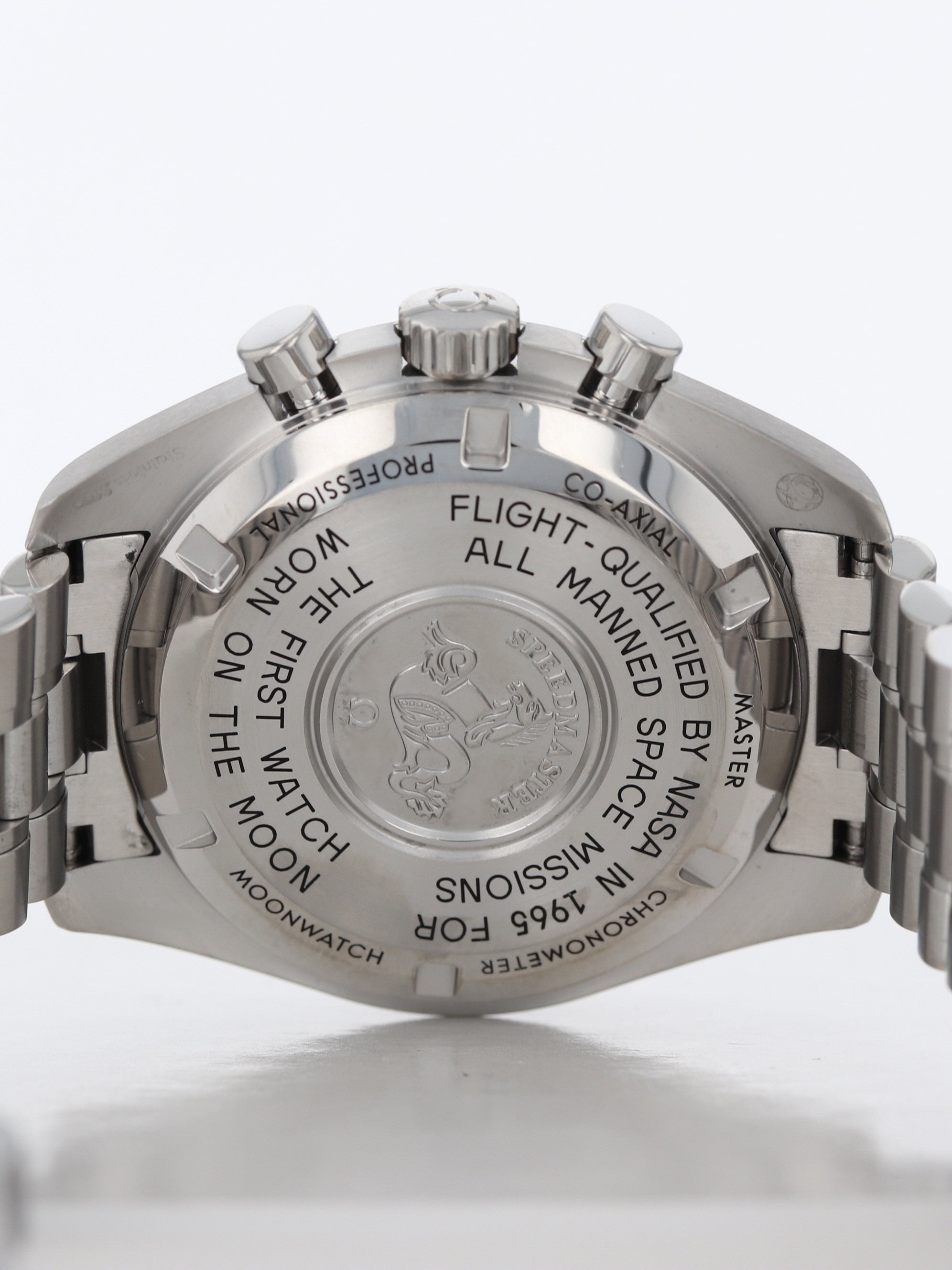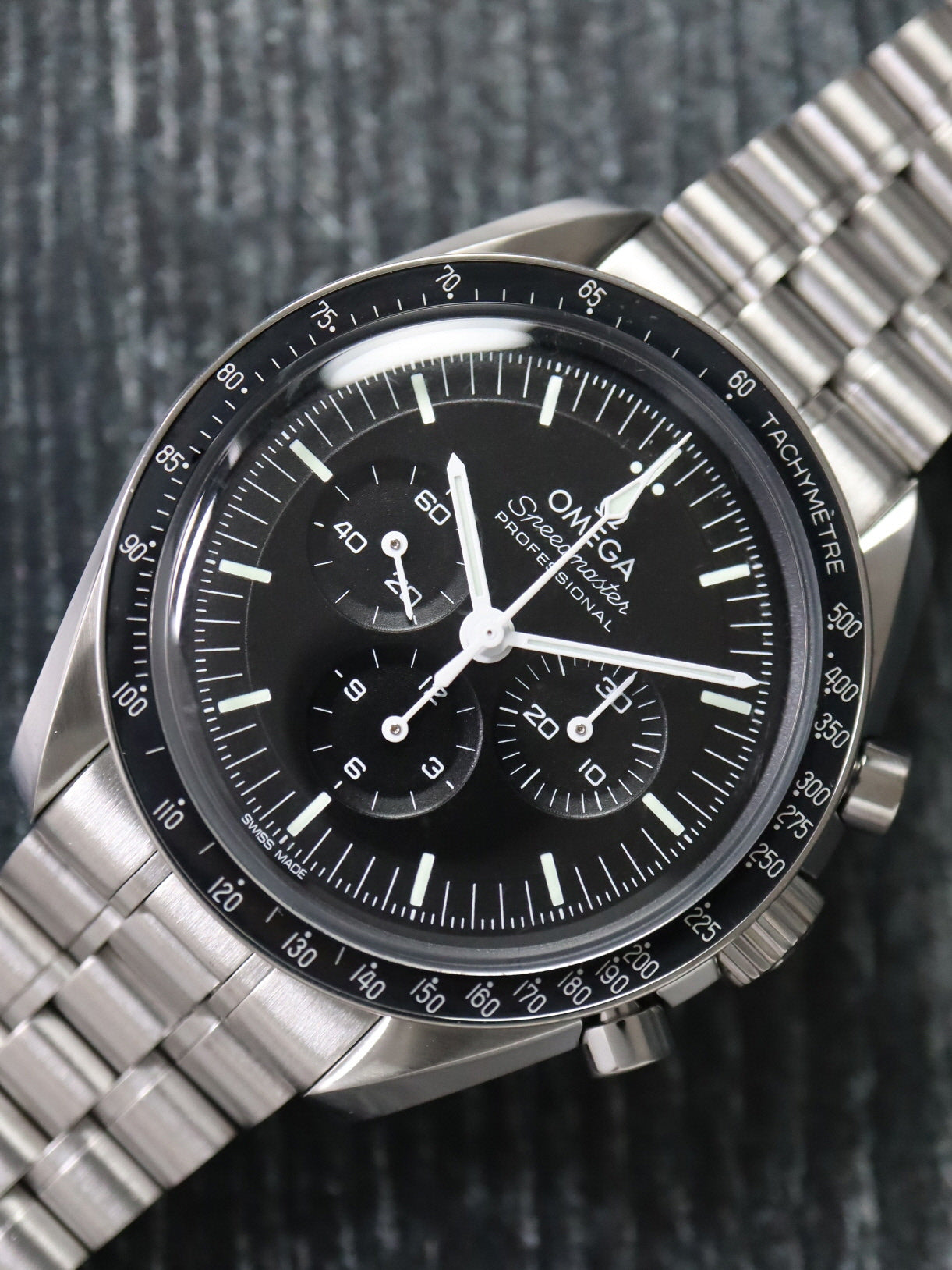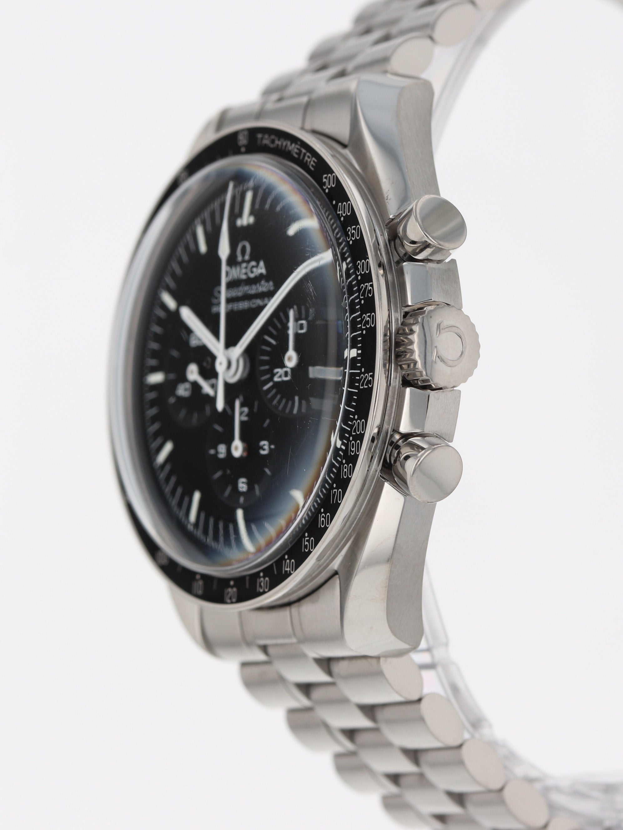Omega stainless steel Speedmaster Moonwatch, manual, size 42mm. Omega reference 310.30.42.50.01.001 with a stainless steel case and bracelet, black tachymetre bezel, black dial, chronograph, hesalite crystal. Omega box and 2021 card. One year full warranty. List $7,800.