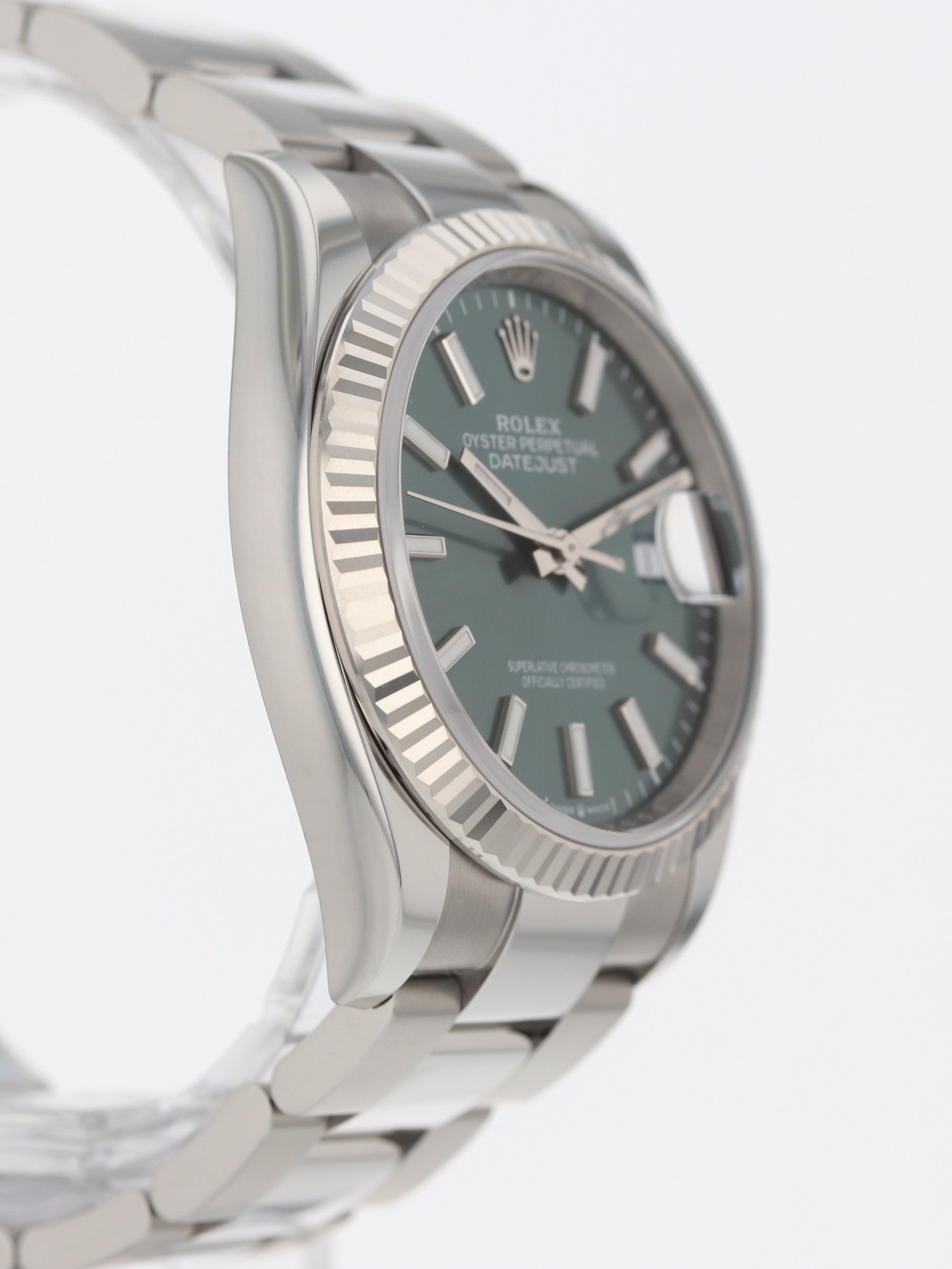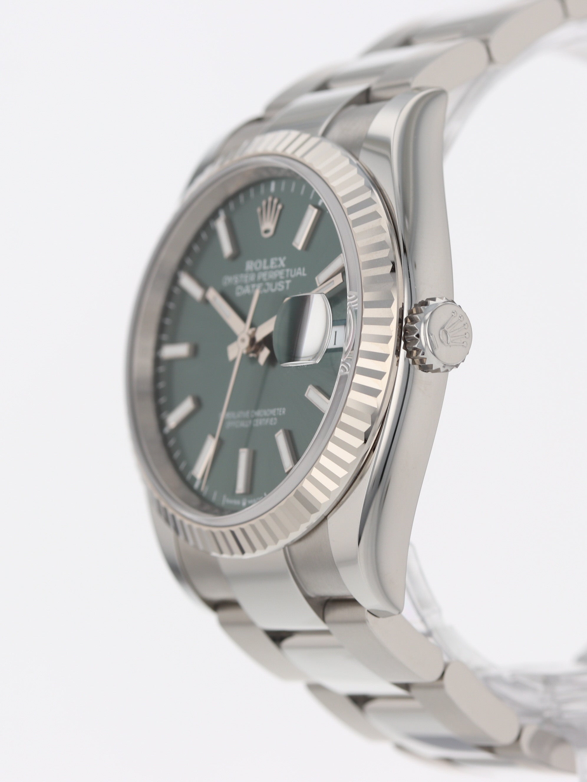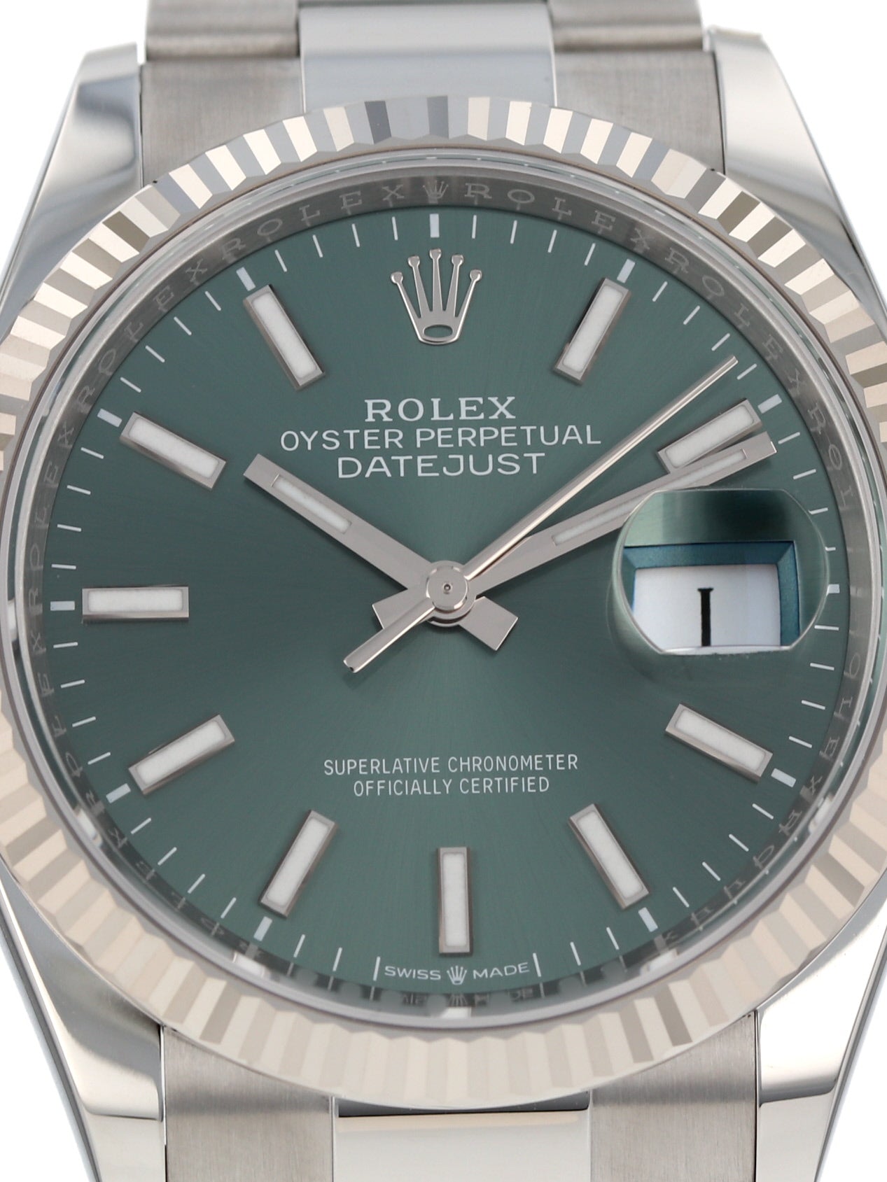Rolex stainless Datejust 36, automatic, size 36mm. Rolex reference 126234 with a stainless steel case and Oyster bracelet, 18k white gold fluted bezel, mint green index dial, luminescent markers and hands, magnified date display, sapphire crystal. Rolex box and 2025 card. Unworn. Five year full warranty.