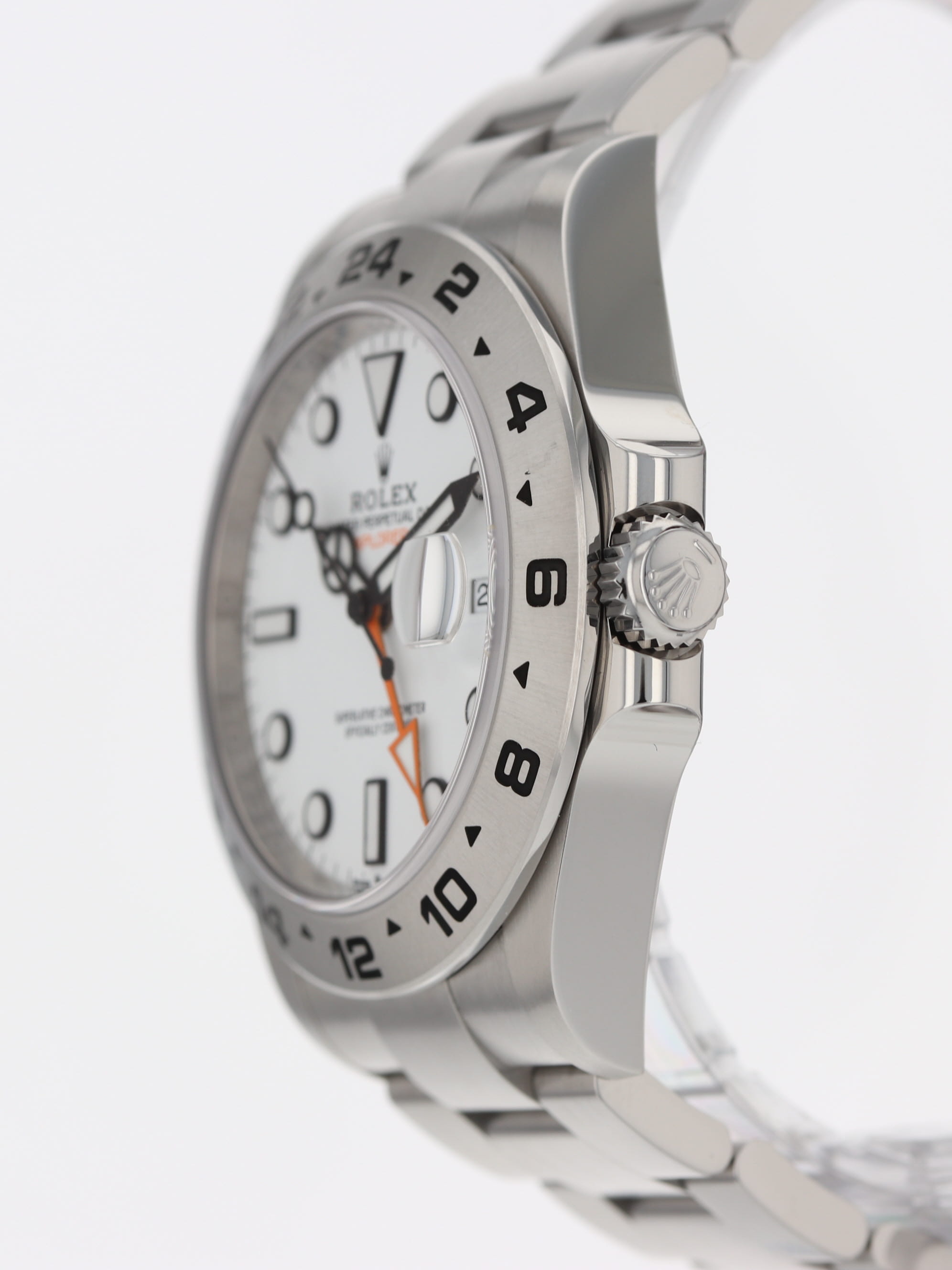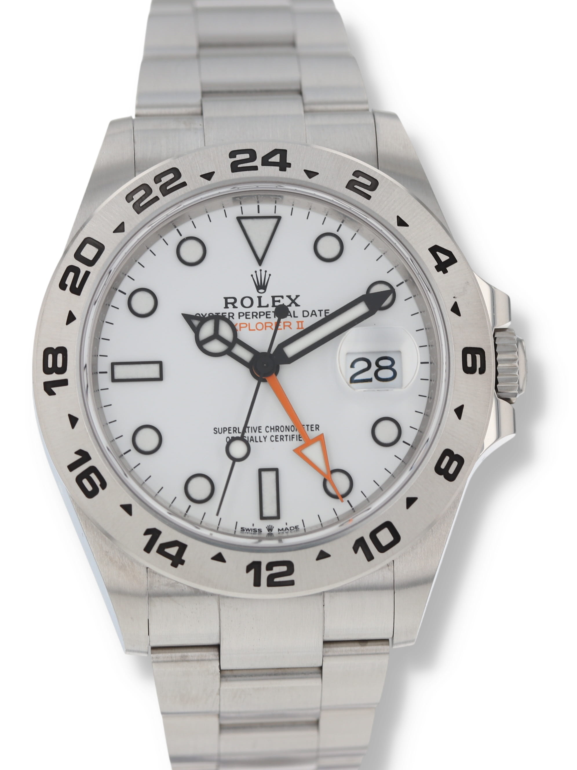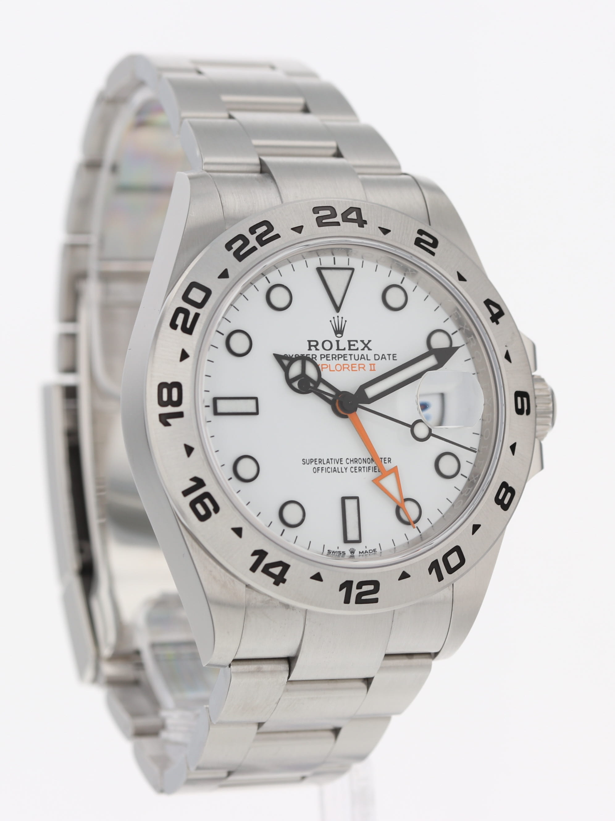 Rolex stainless steel Explorer II, automatic, size 42mm. Rolex reference 226570 with a stainless steel case and Oyster bracelet, Folding Oysterlock safety clasp with Easylink 5 mm comfort extension link, 24-hour bezel, "Polar" white index dial, luminescent markers and hands, magnified date display, sapphire crystal. Rolex box and card dated 2023. Three year full warranty.