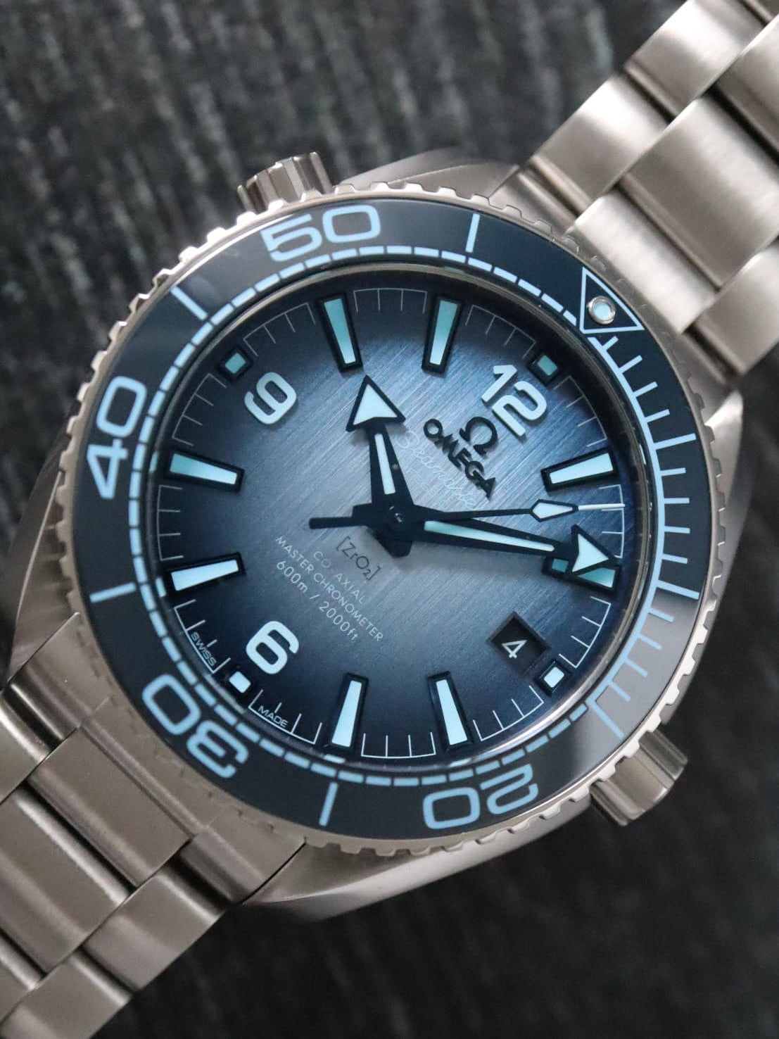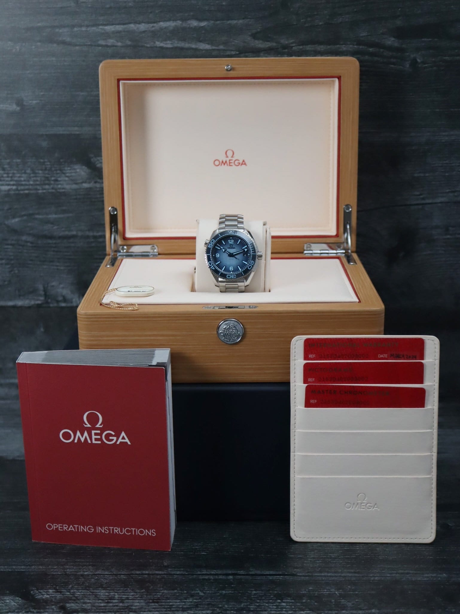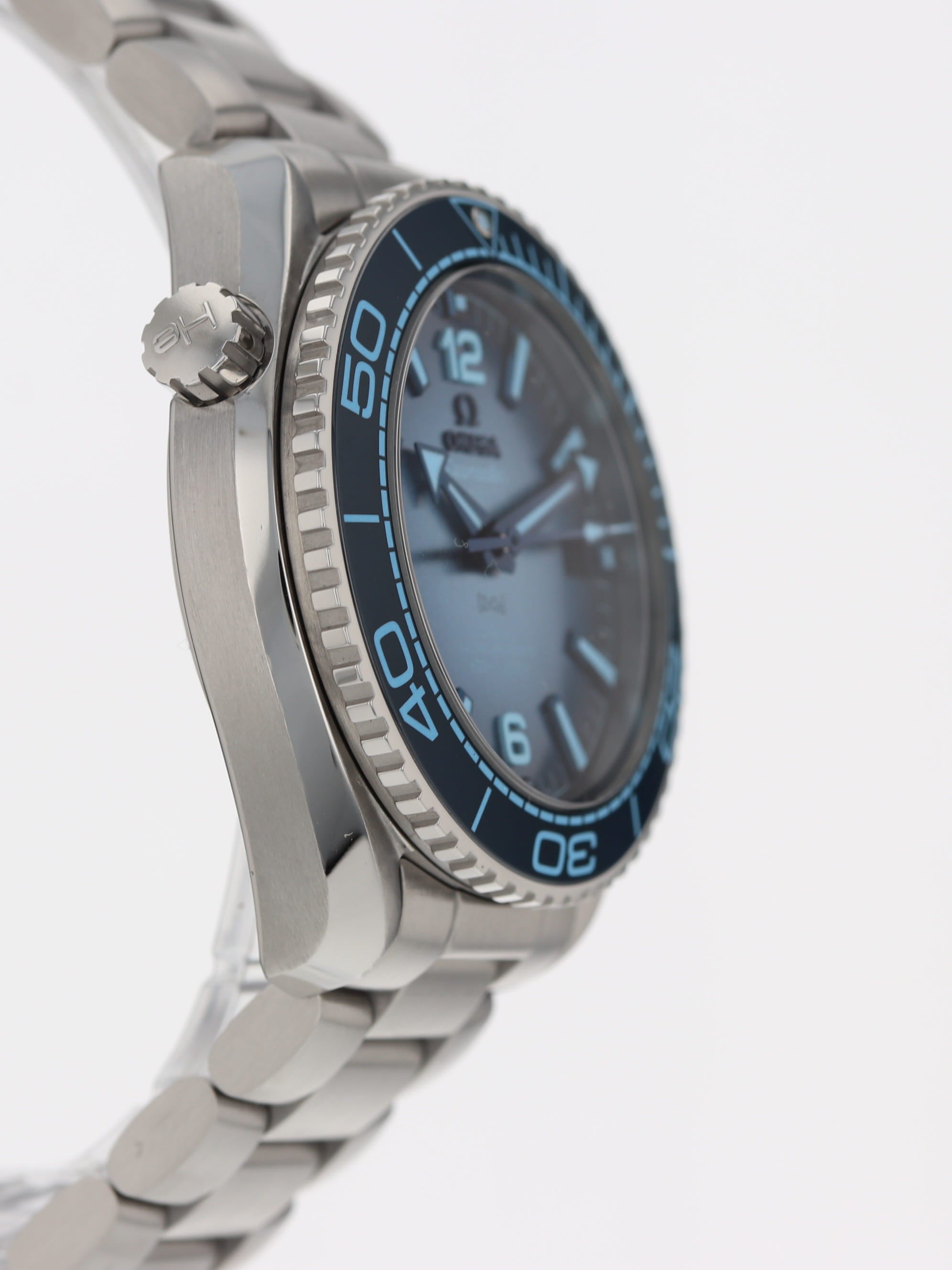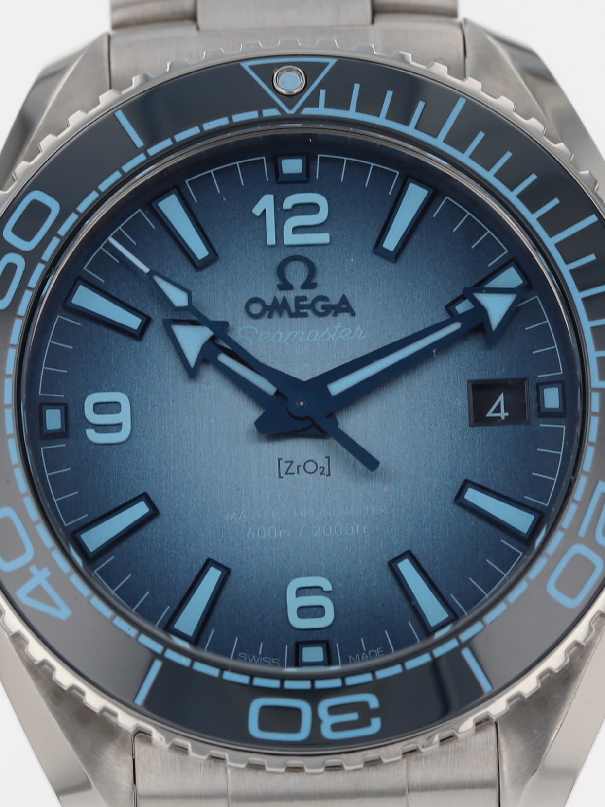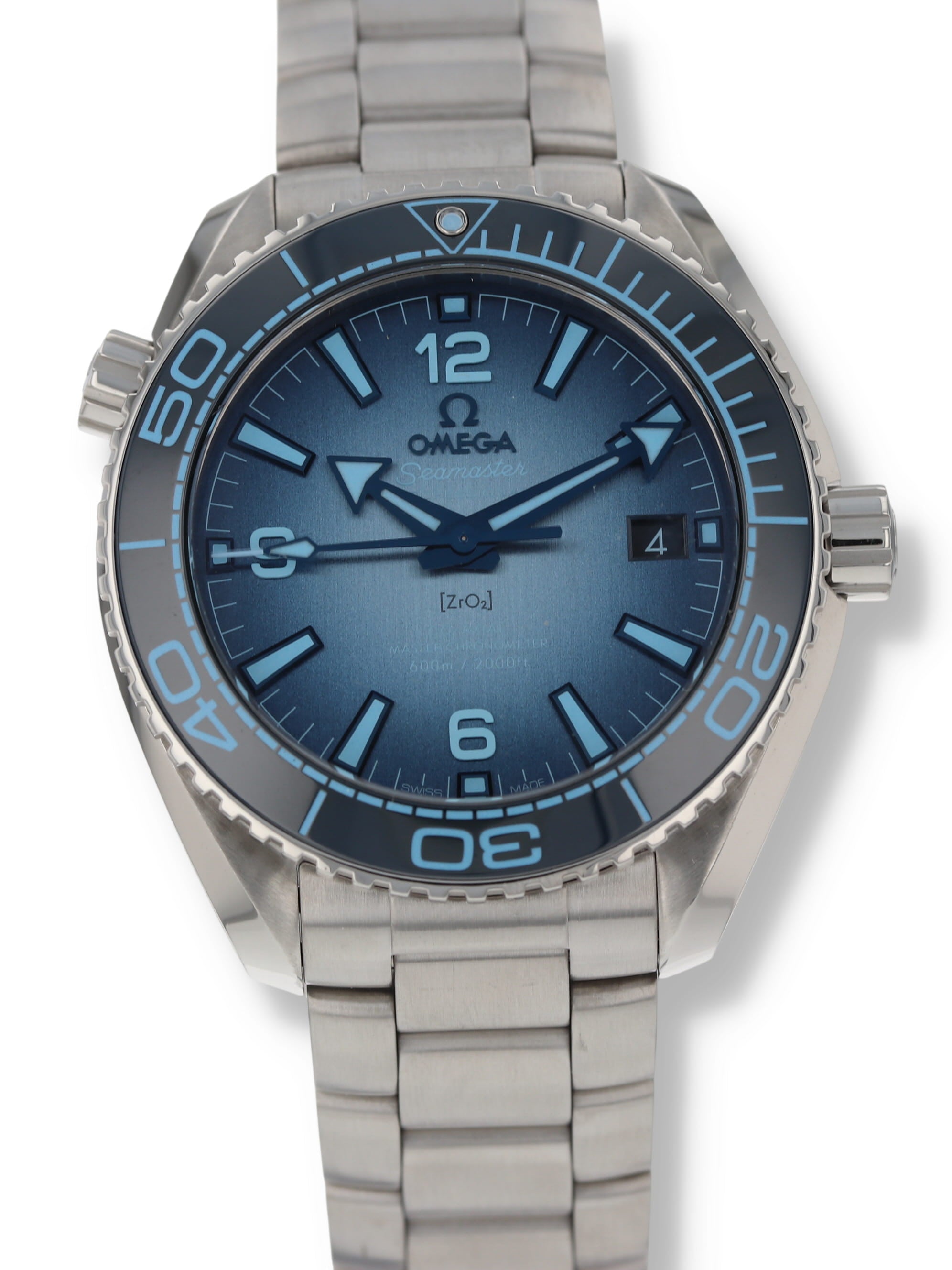 Omega stainless steel Seamaster Planet Ocean 600M, automatic, size 39.5mm. Omega reference 215.30.40.20.03.002 with a stainless steel case and bracelet, fold-over butterfly clasp with comfort setting, blue ceramicunidirectional rotating bezel, "Summer Blue" gradient dial, blue luminscent markers and hands, date display, helium escape valve, domed sapphire crystal. Discontinued reference. Omega box and card dated 2024. Four year full warranty.