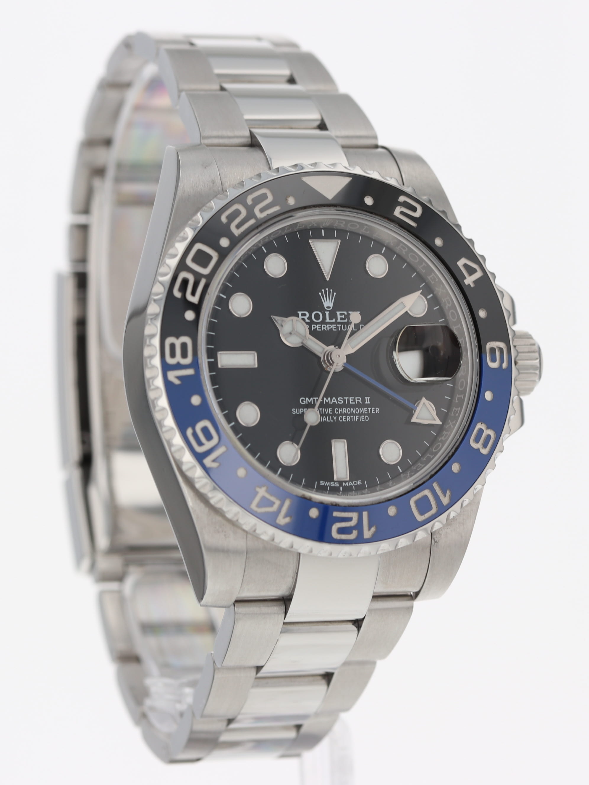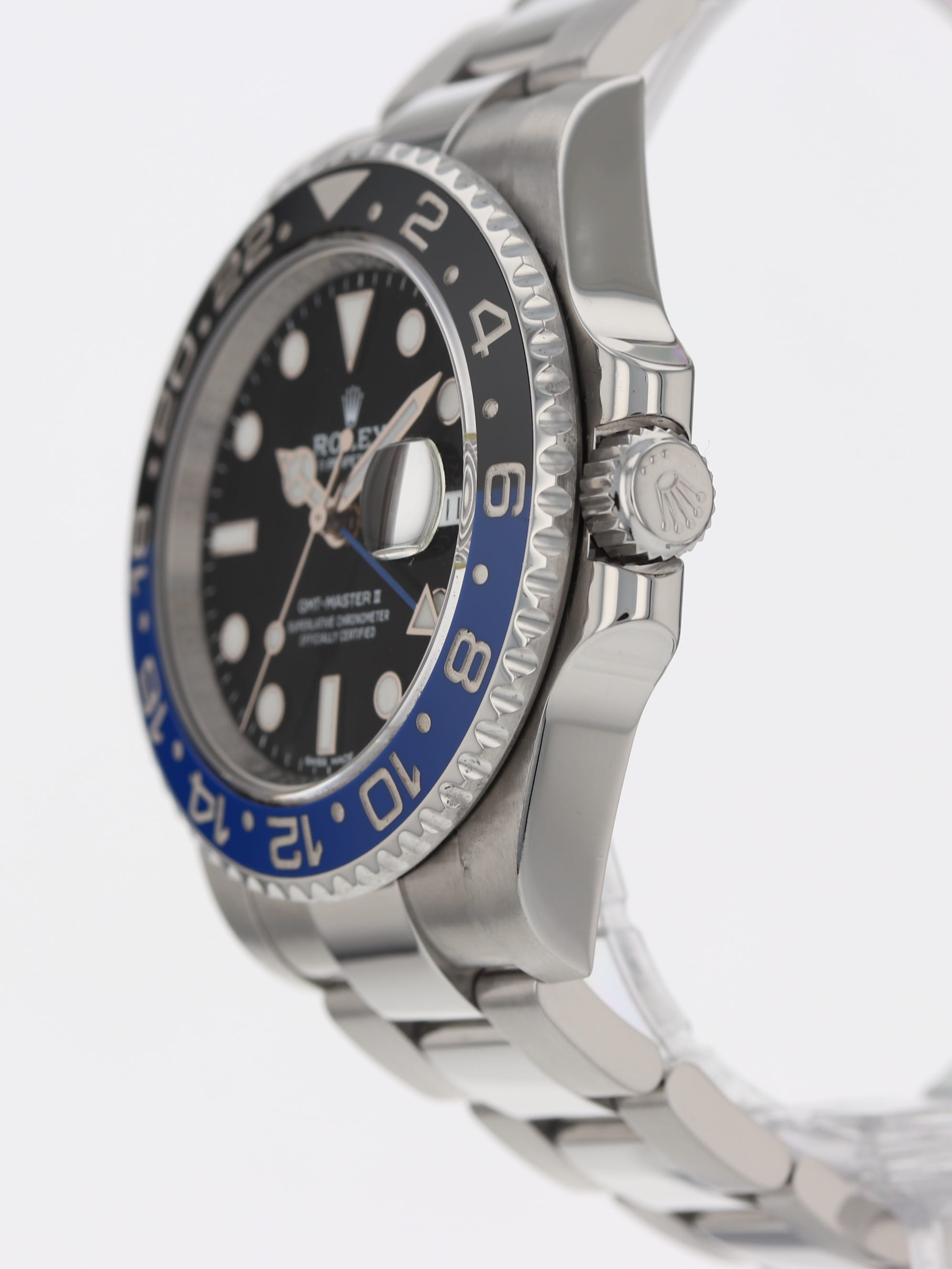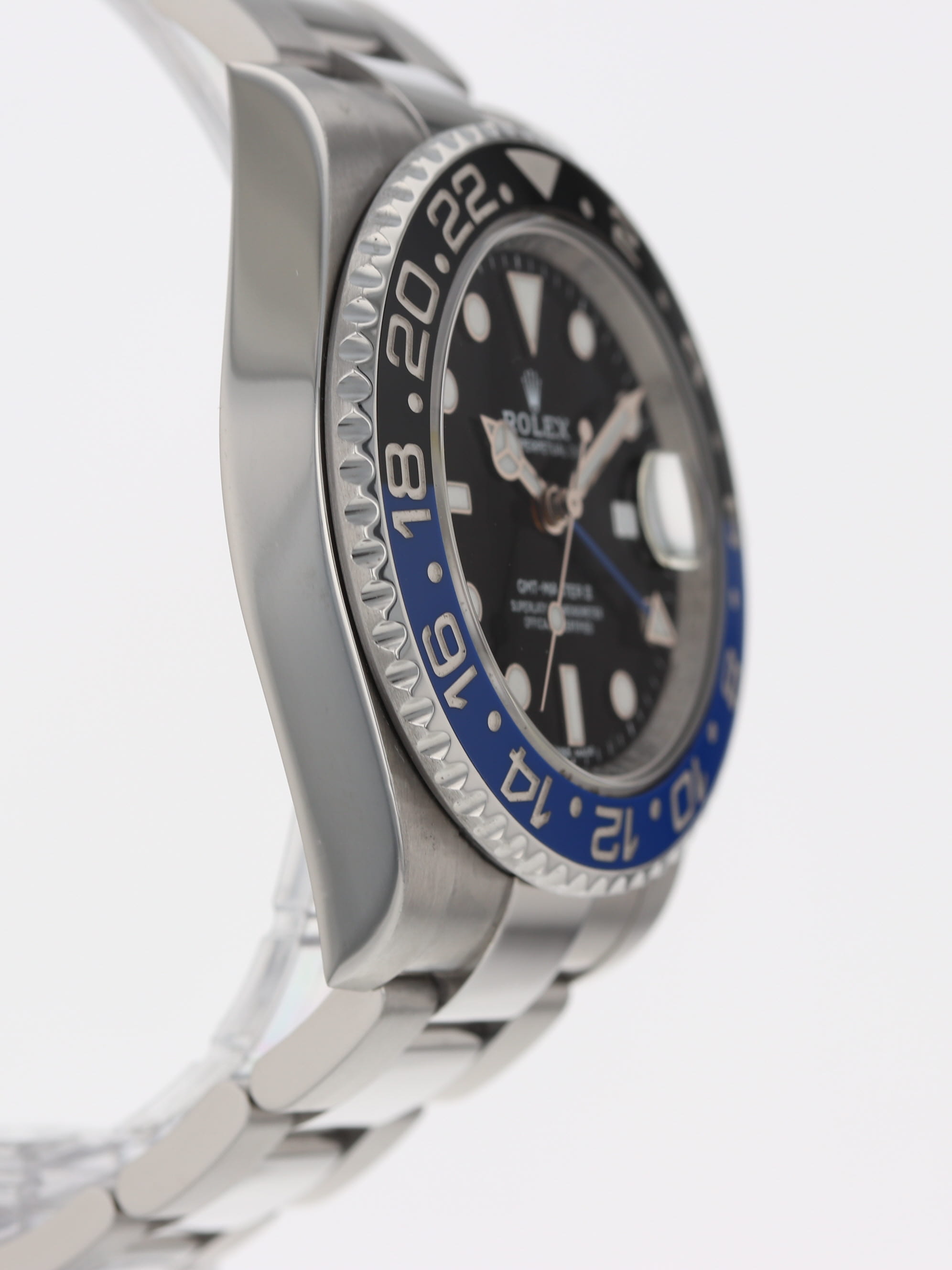 Rolex stainless steel GMT-Master II, automatic, size 40mm. Rolex reference 116710BLNR "Batman" with a stainless steel case and Oyster bracelet,5mm comfort extension link, black index dial, magnified date display, rotating 24-hour blue/black bezel with ceramic insert, sapphire crystal. Rolex box and card dated 2016. One year full warranty.