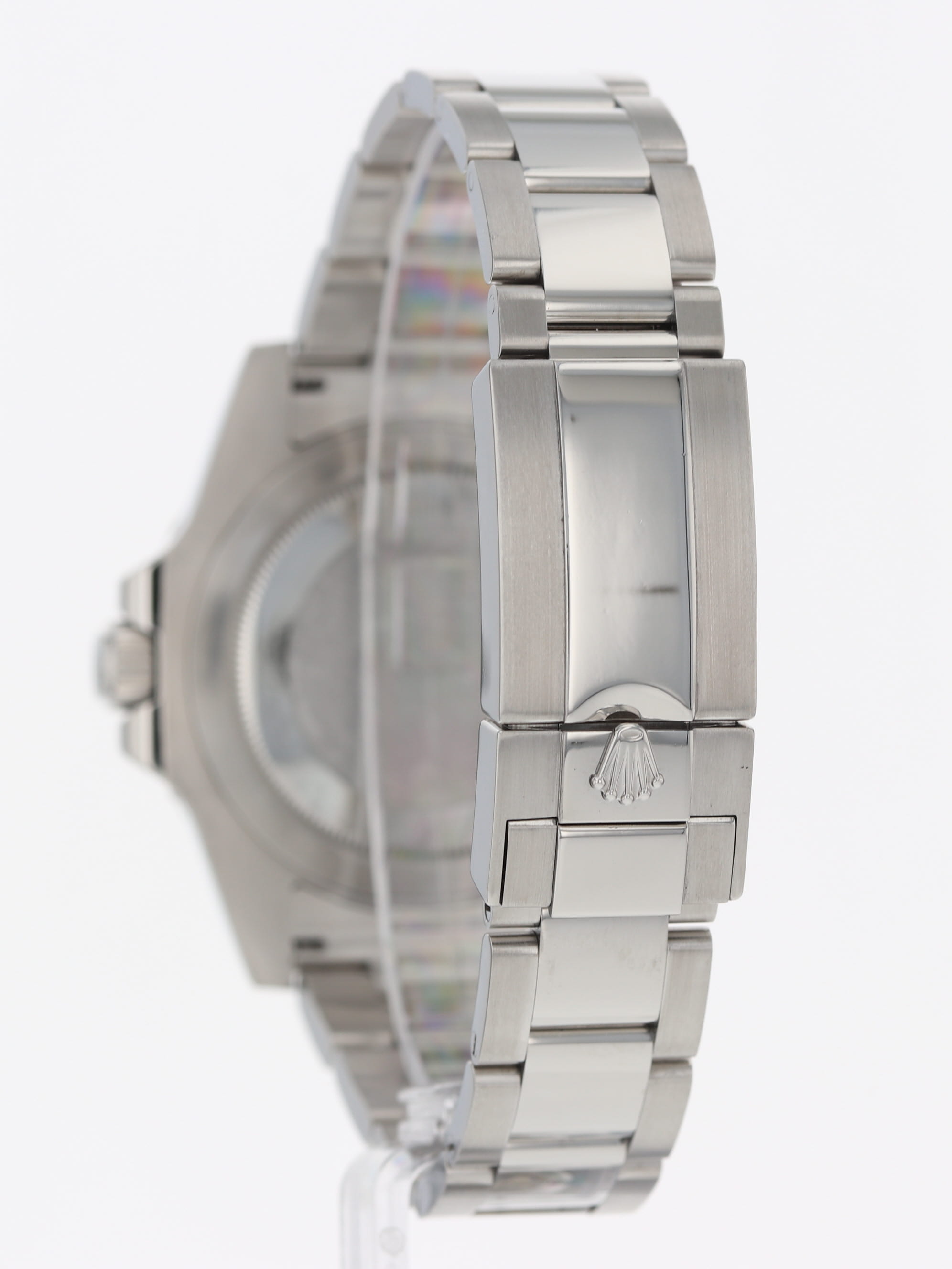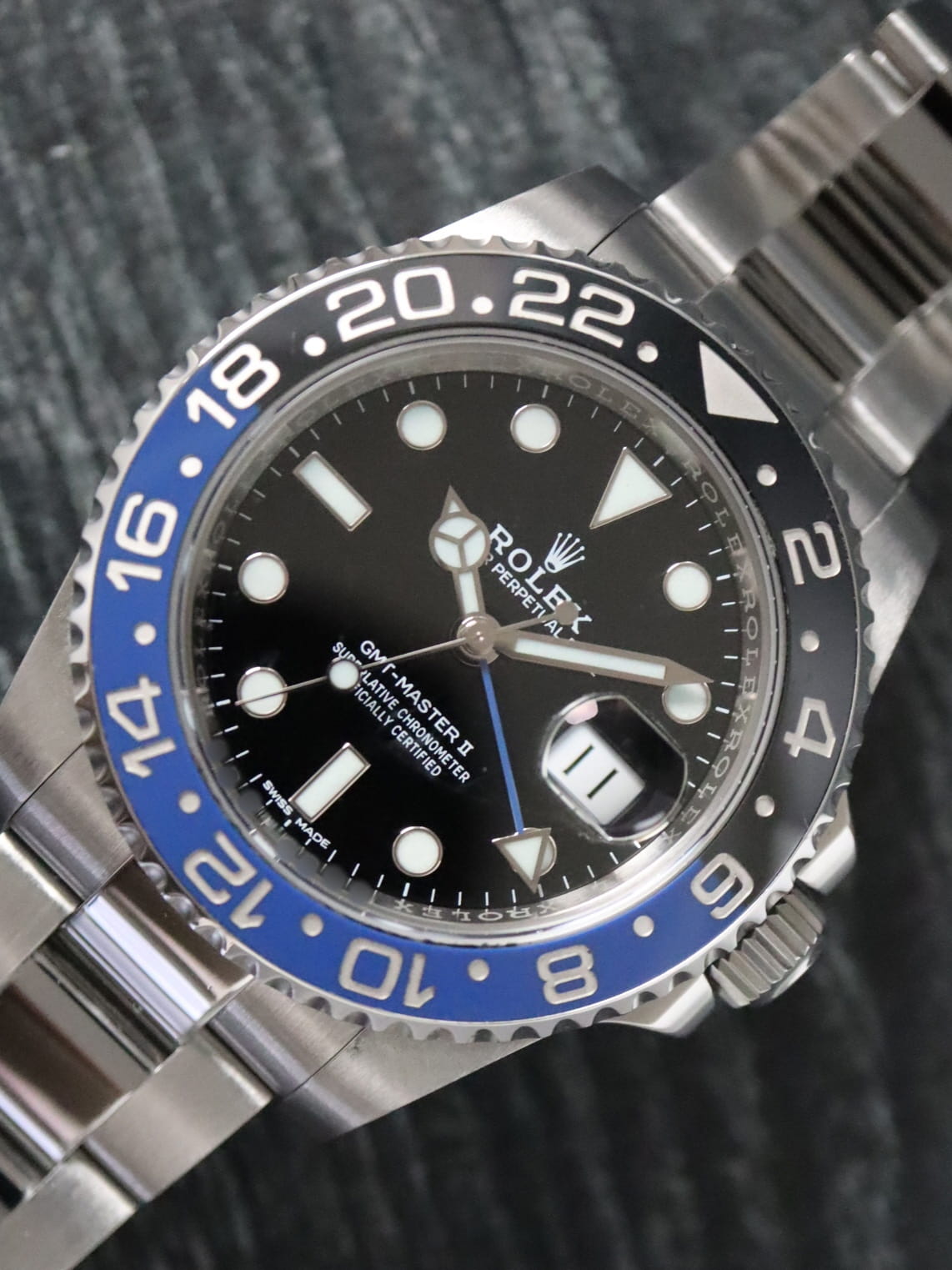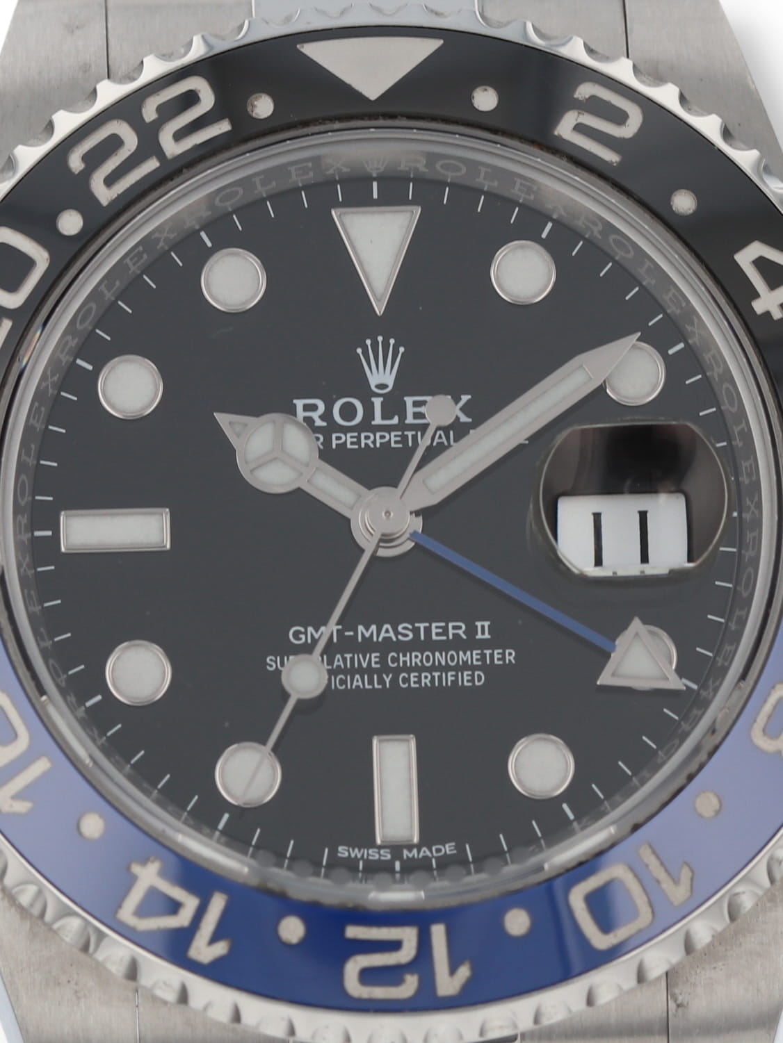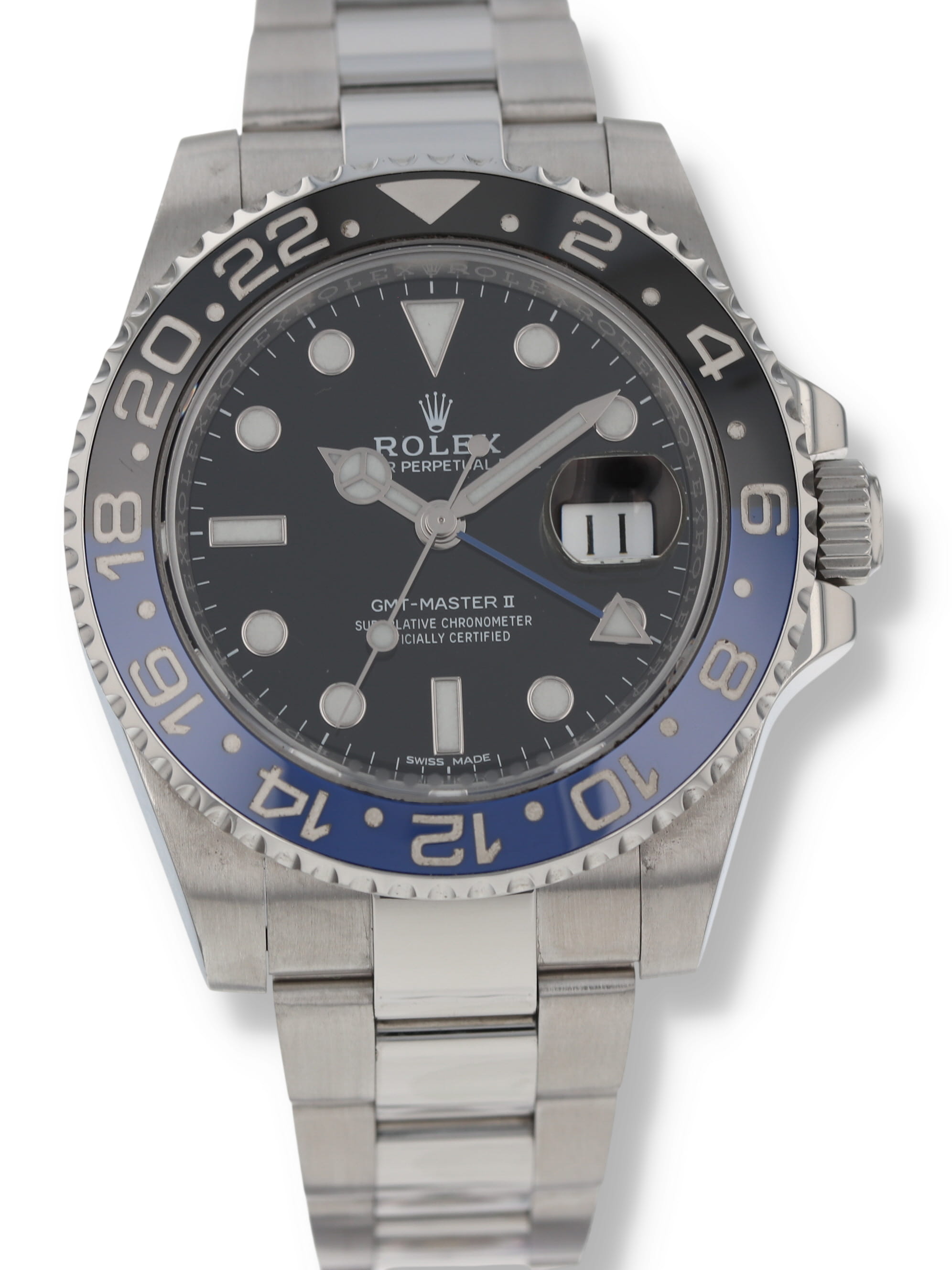 Rolex stainless steel GMT-Master II, automatic, size 40mm. Rolex reference 116710BLNR "Batman" with a stainless steel case and Oyster bracelet,5mm comfort extension link, black index dial, magnified date display, rotating 24-hour blue/black bezel with ceramic insert, sapphire crystal. Rolex box and card dated 2016. One year full warranty.