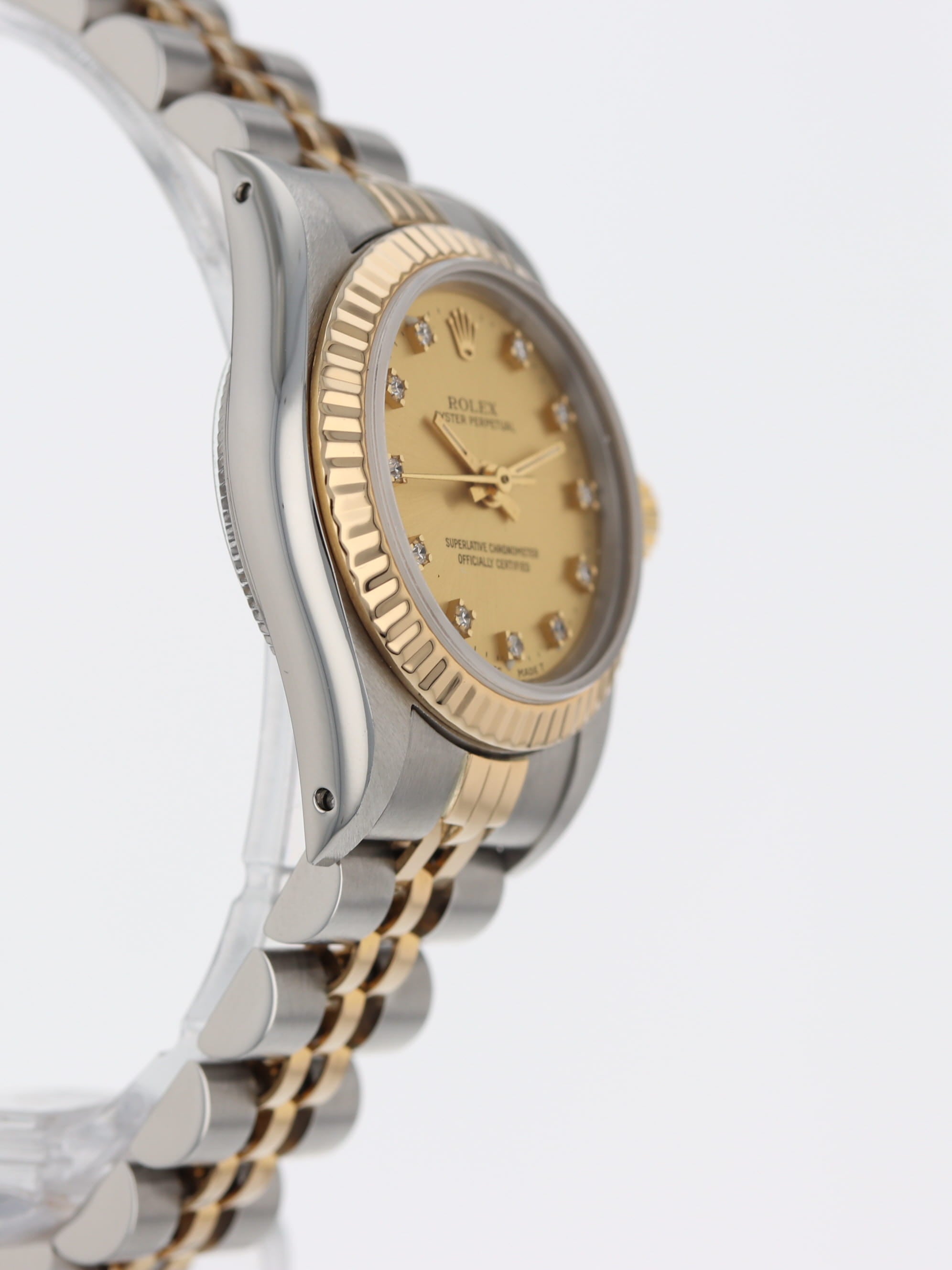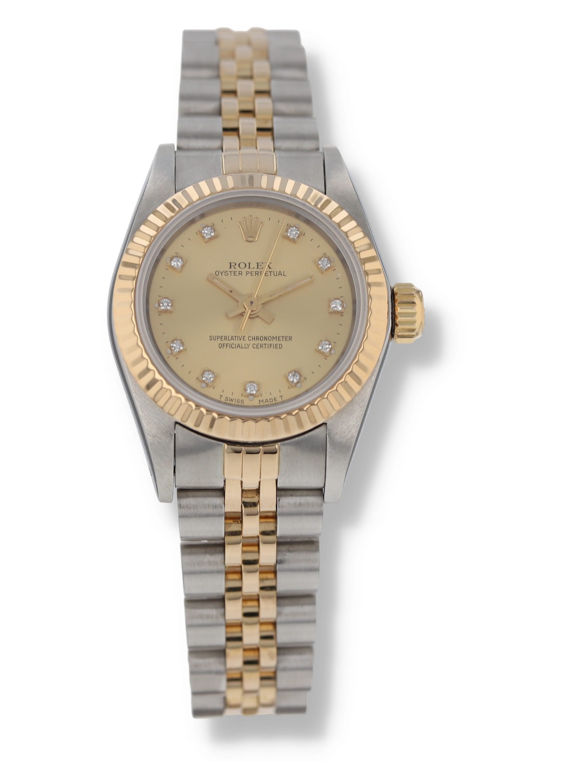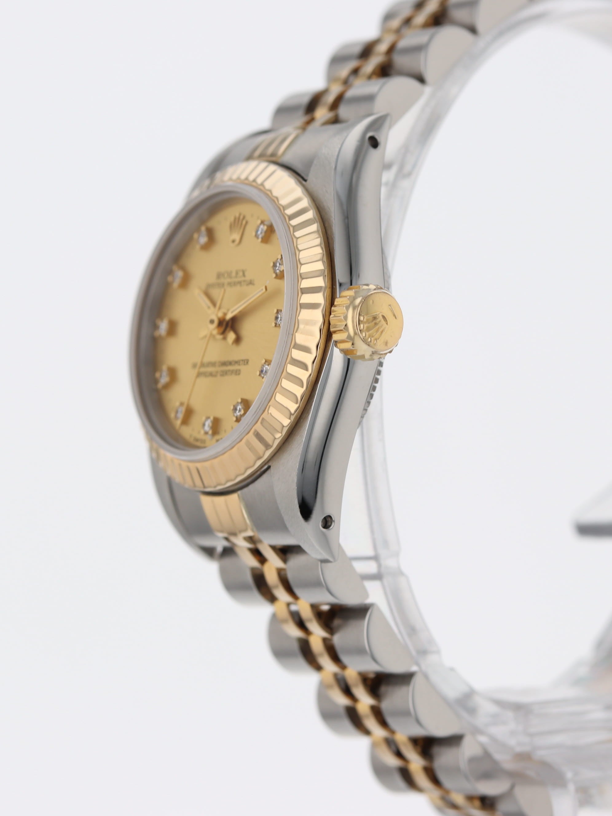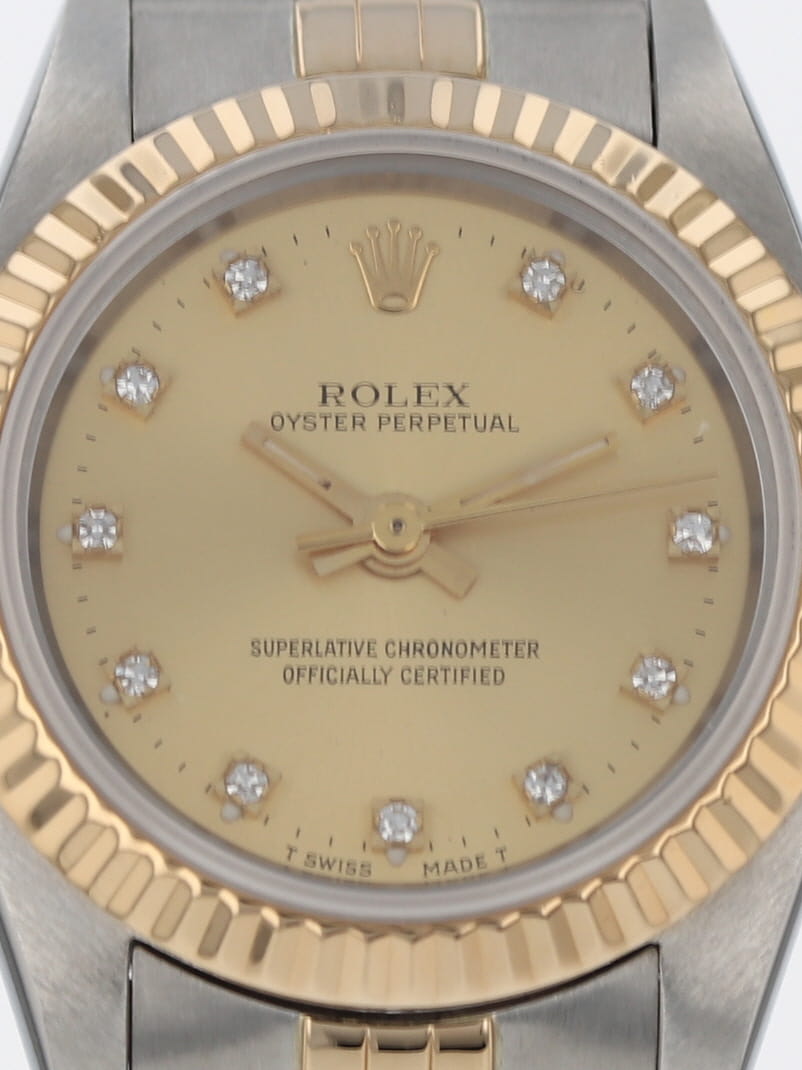Rolex 18k yellow gold and stainless steel ladies Oyster Perpetual, automatic, size 26mm. Rolex reference 67193 with a stainless steel case, 18k yellow gold fluted bezel, two tone Jubilee bracelet, steel folding clasp, champagne diamond dial, sapphire crystal. Rolex box and papers. "E" serial, circa 1990. One year full warranty.