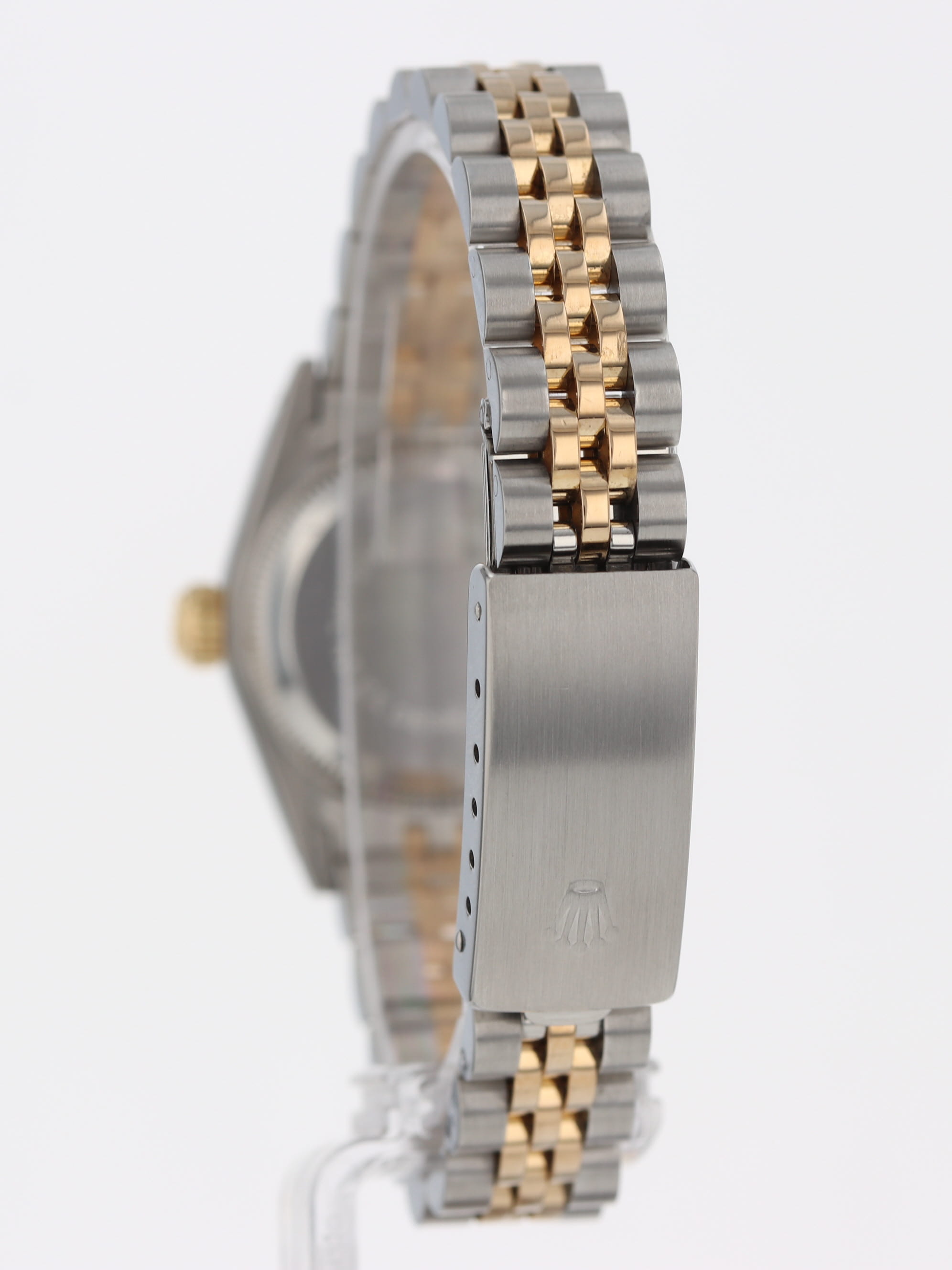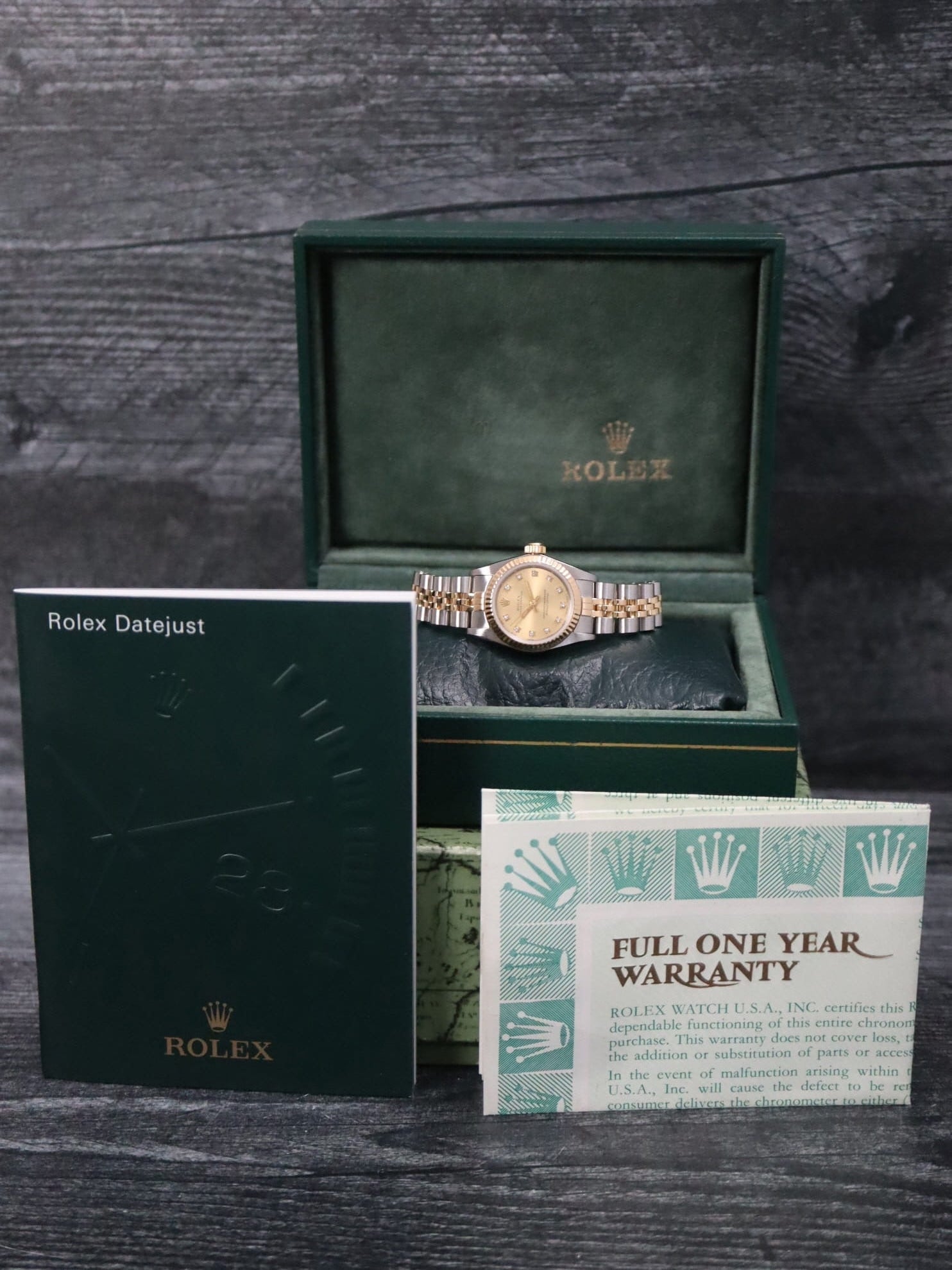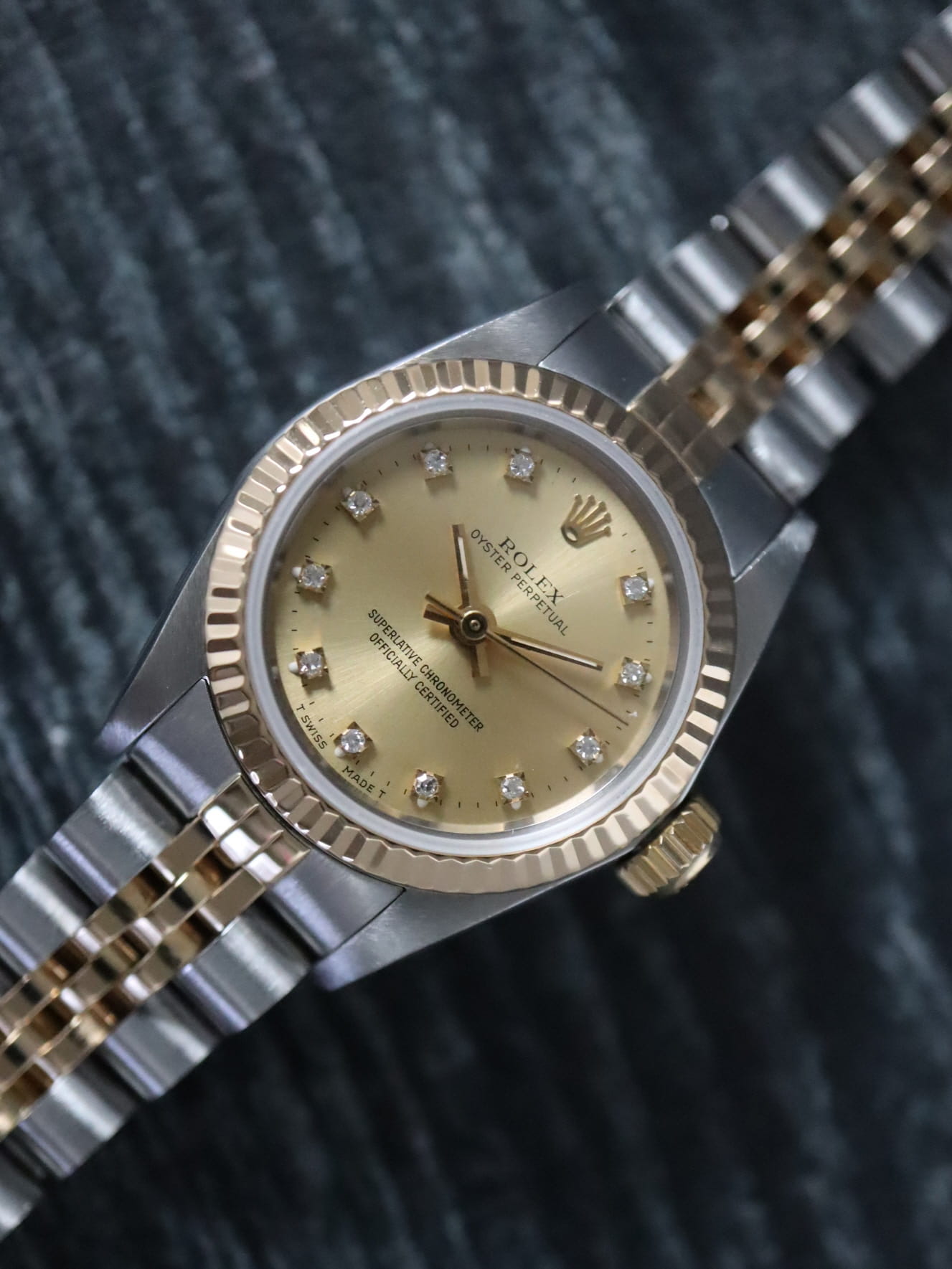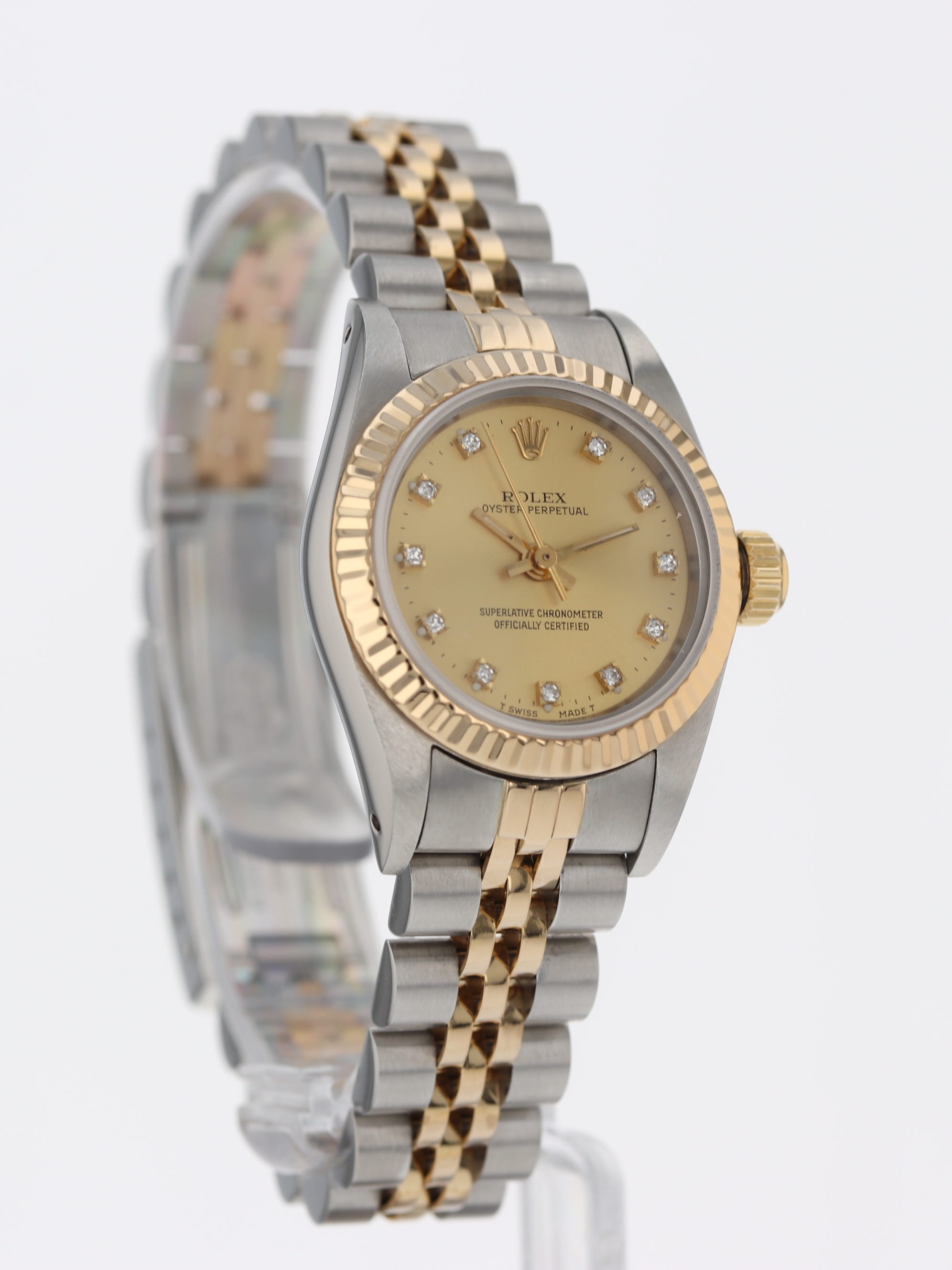 Rolex 18k yellow gold and stainless steel ladies Oyster Perpetual, automatic, size 26mm. Rolex reference 67193 with a stainless steel case, 18k yellow gold fluted bezel, two tone Jubilee bracelet, steel folding clasp, champagne diamond dial, sapphire crystal. Rolex box and papers. "E" serial, circa 1990. One year full warranty.
