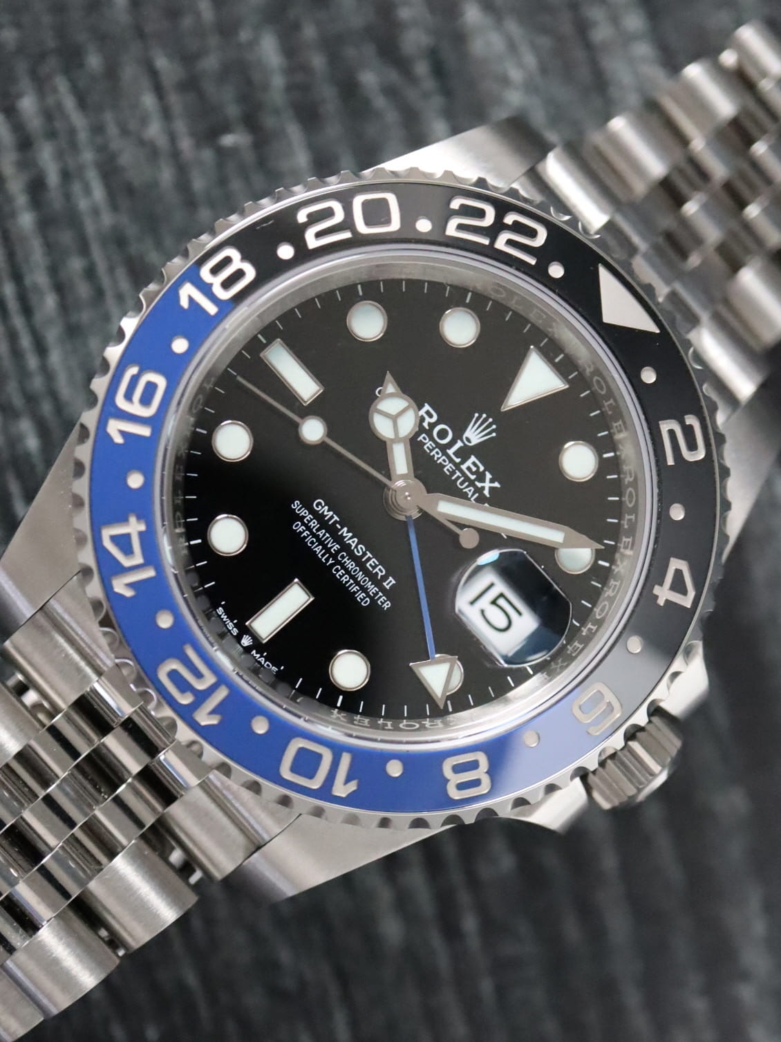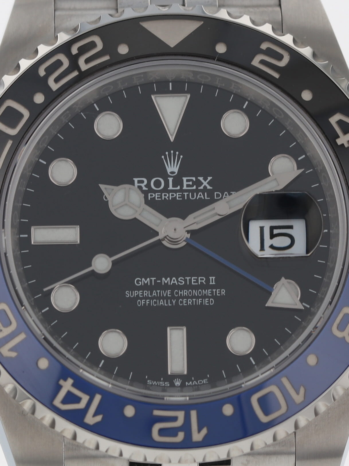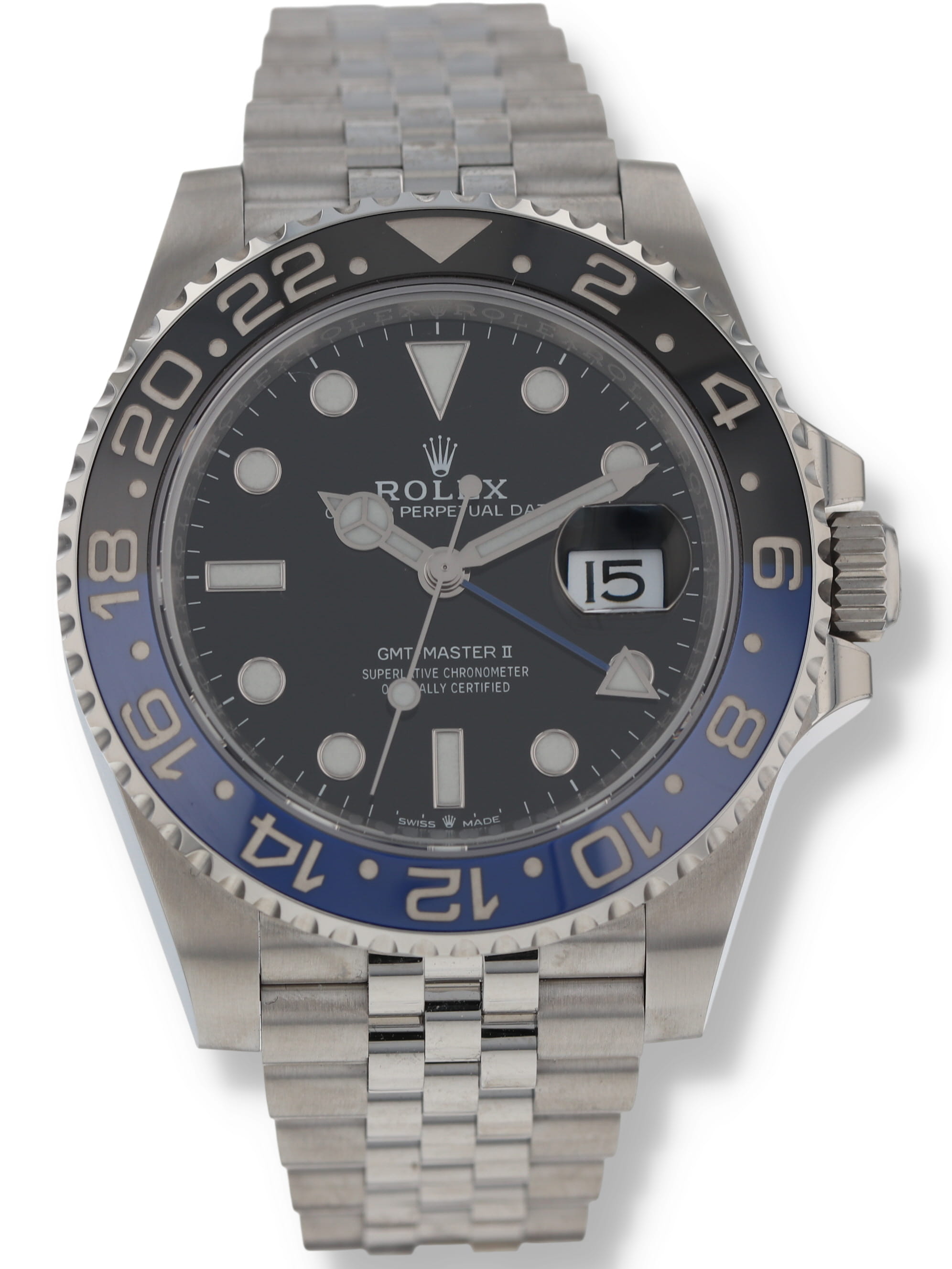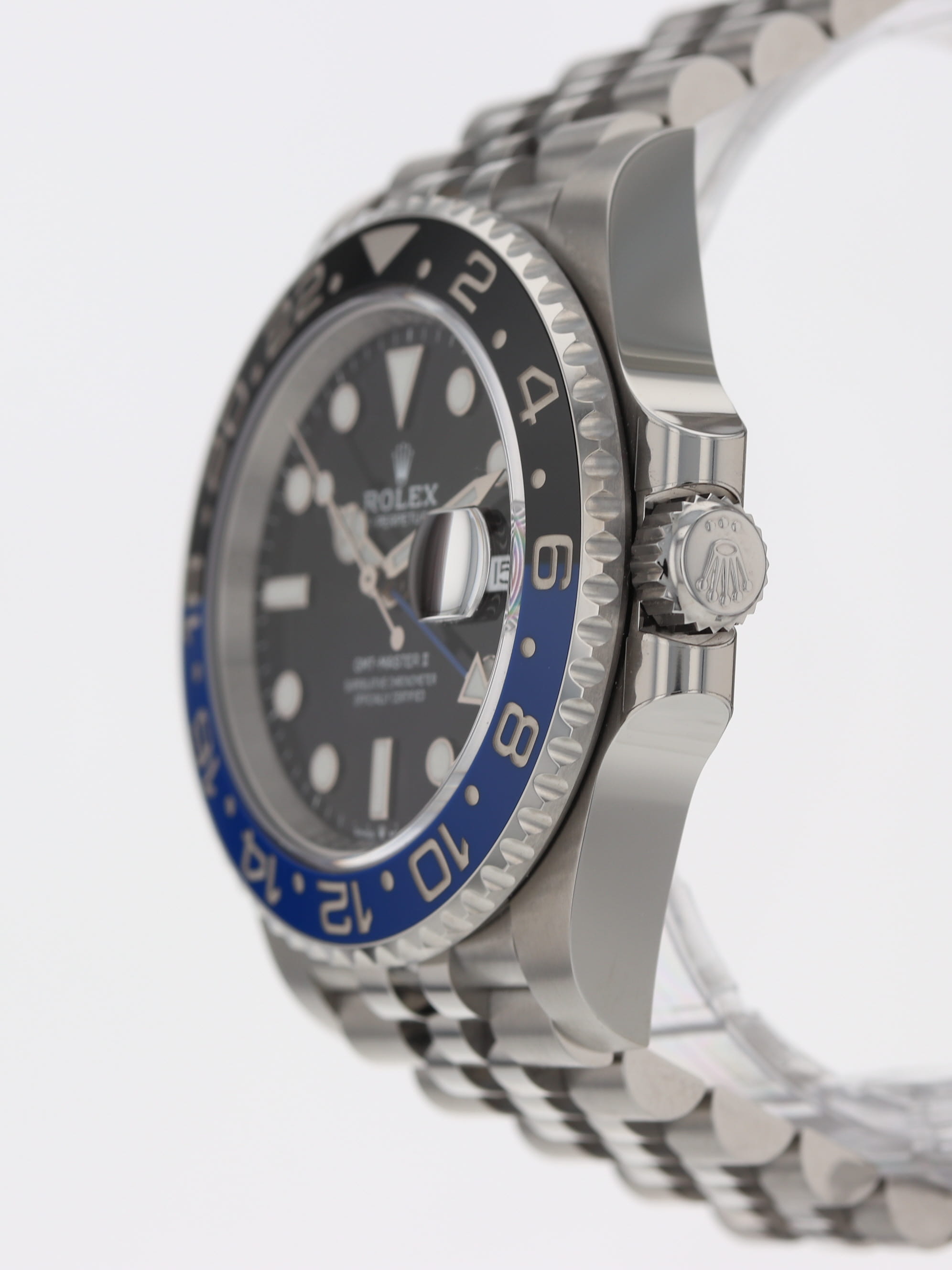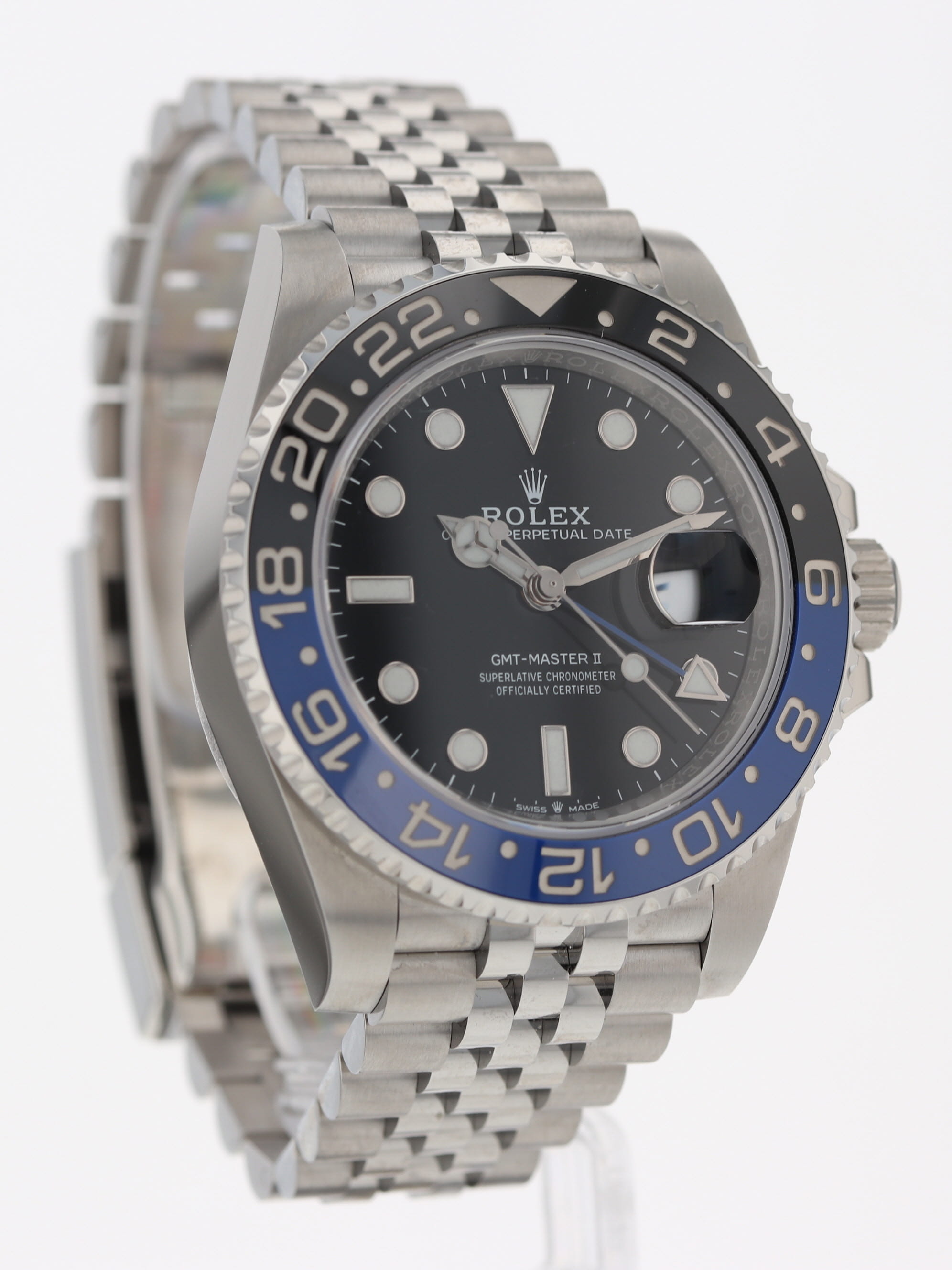 Rolex stainless steel GMT-Master II, automatic, size 40mm. Rolex reference 126710BLNR "Batman Jubilee" or "Batgirl" with a stainless steel case and Jubilee bracelet, 5mm Comfort Extension link, bidirectional rotatable 24-hour graduated bezel with black and blue Cerachrom insert and engraved numerals, black dial, Chromalight luminescence, magnified date display, sapphire crystal. 70 hour power reserve. Rolex box and 2024 card. Five year full warranty. Unworn.