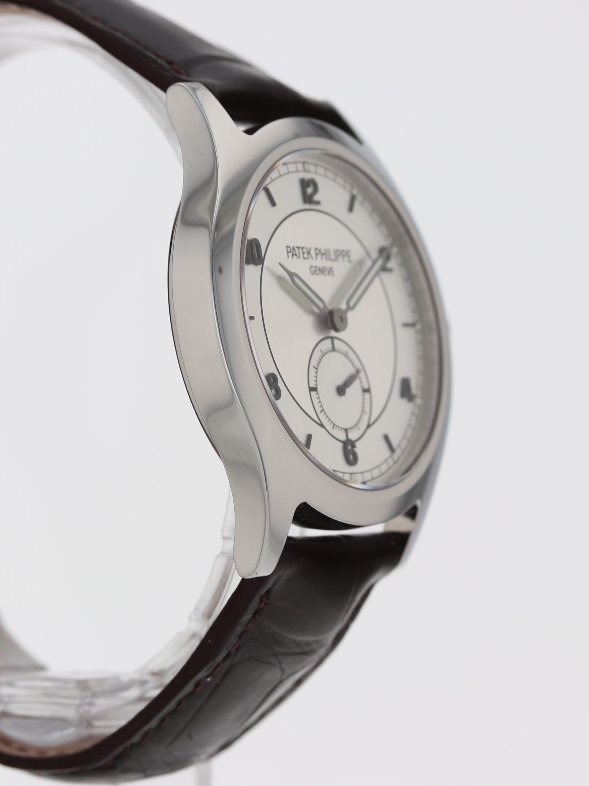 Patek Philippe stainless steel Calatrava Limited Edition, manual, size 36mm. Patek reference 5565 with a stainless steel case and bezel, silver two-tone sector dial with applied Arabic numerals, sapphire crystal. Brown Patek Alligator strap and steel tang buckle. Patek Philippe commemorative box, coin and papers dated 2007.