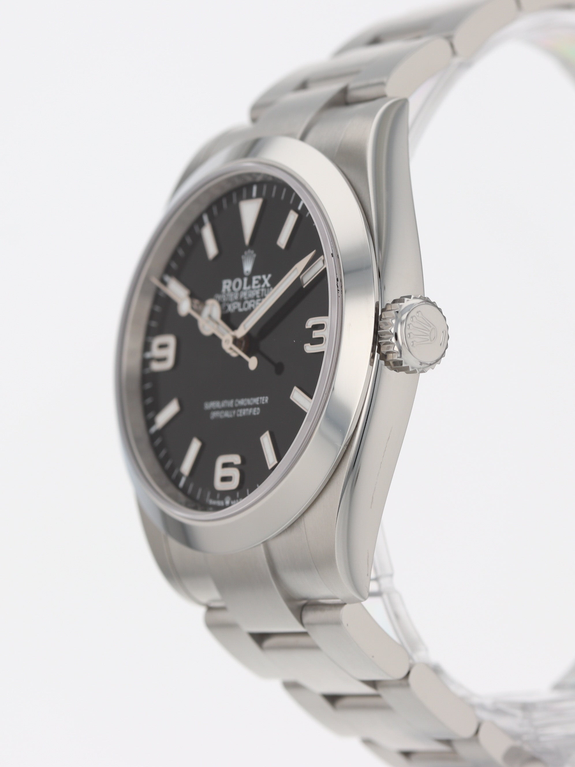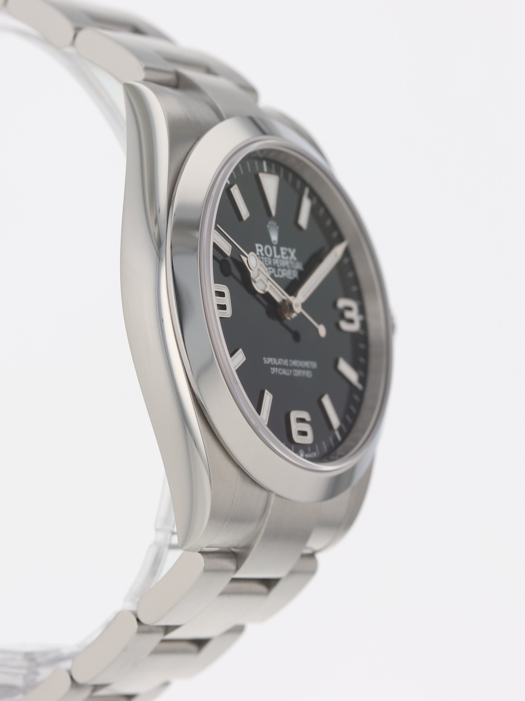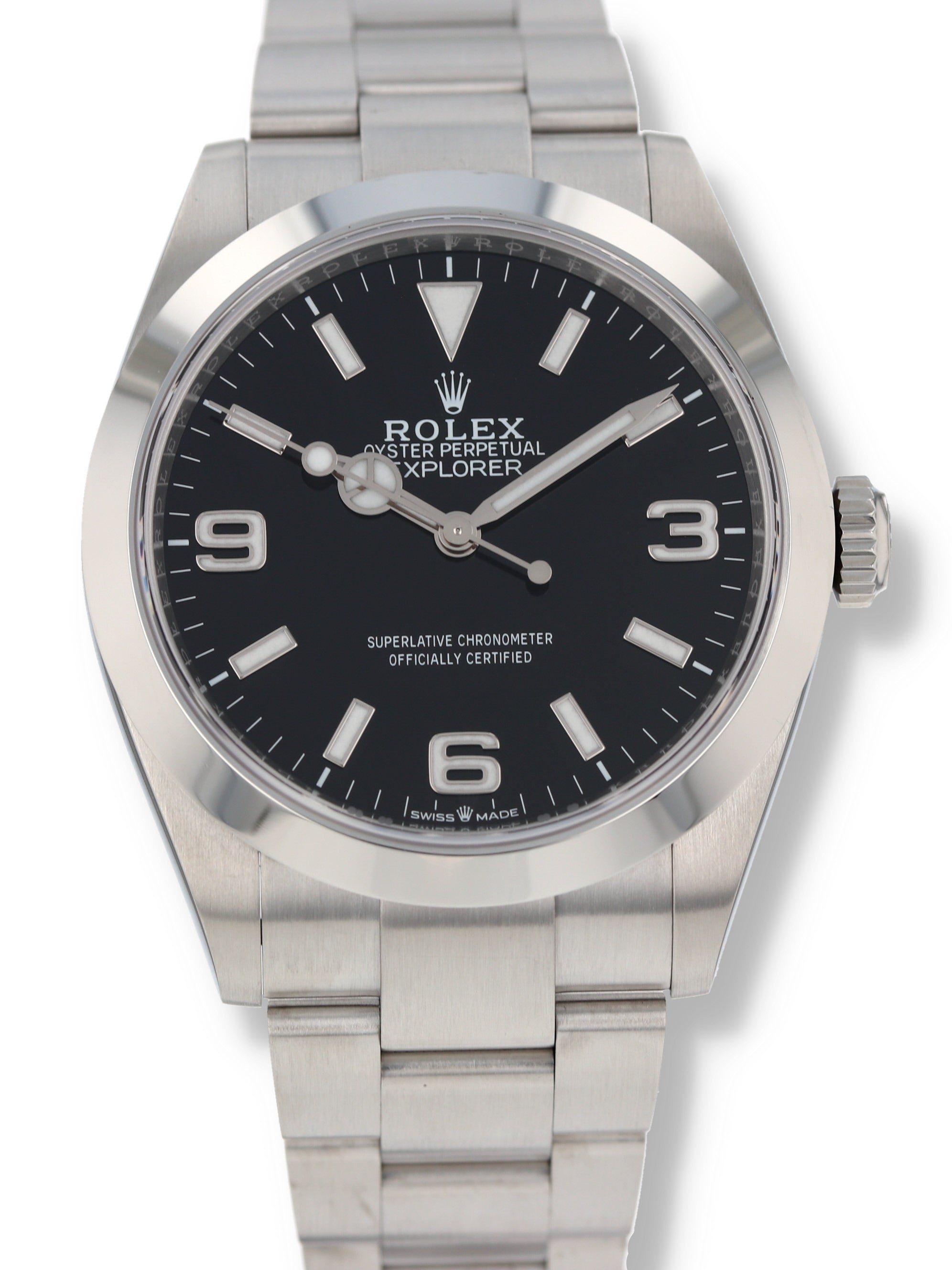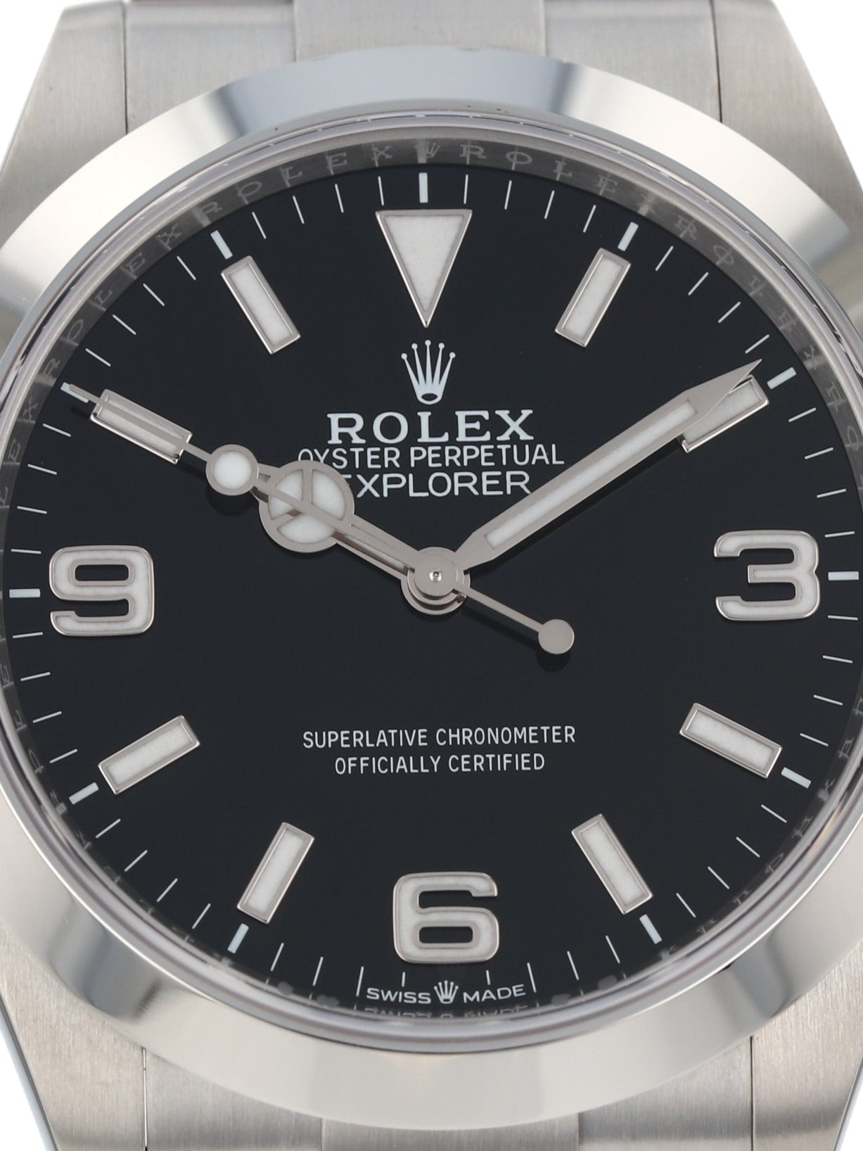 Rolex stainless steel Explorer, automatic, size 40mm. Rolex reference 224270 with a stainless steel case and Oyster bracelet with folding Oysterlock safety clasp and Easylink 5 mm comfort extension link. Black luminescent 3, 6, 9 Arabic dial, sapphire crystal. Rolex box and 2025 card. Five year full warranty.