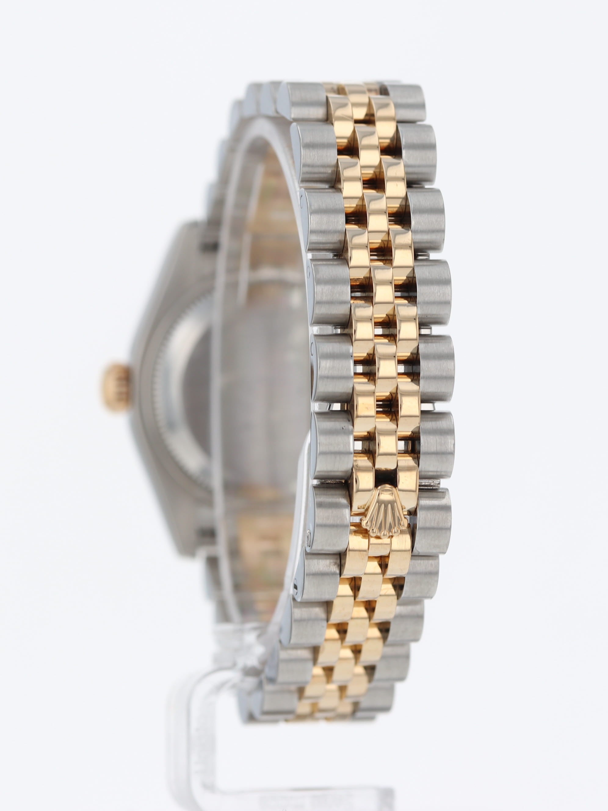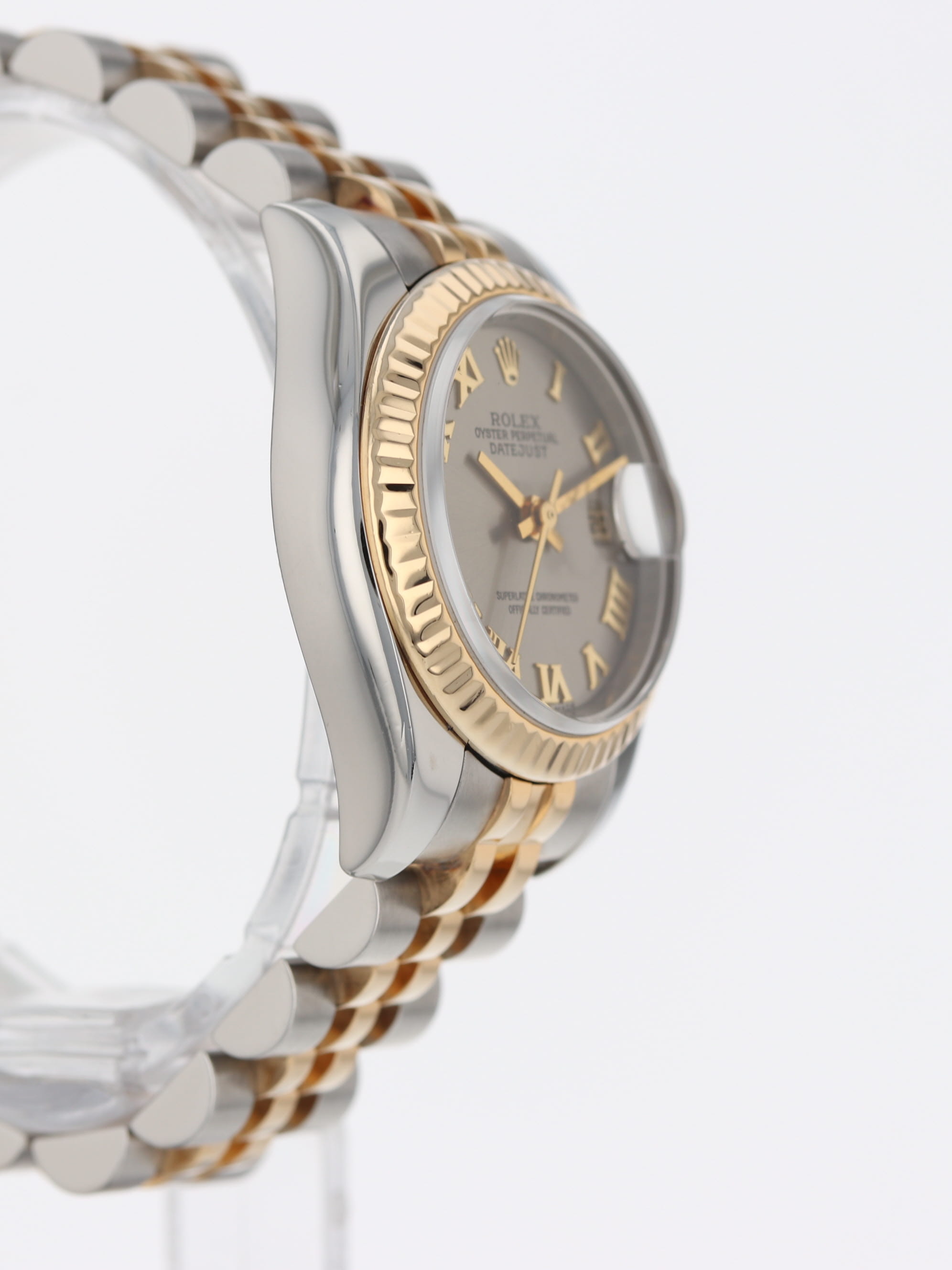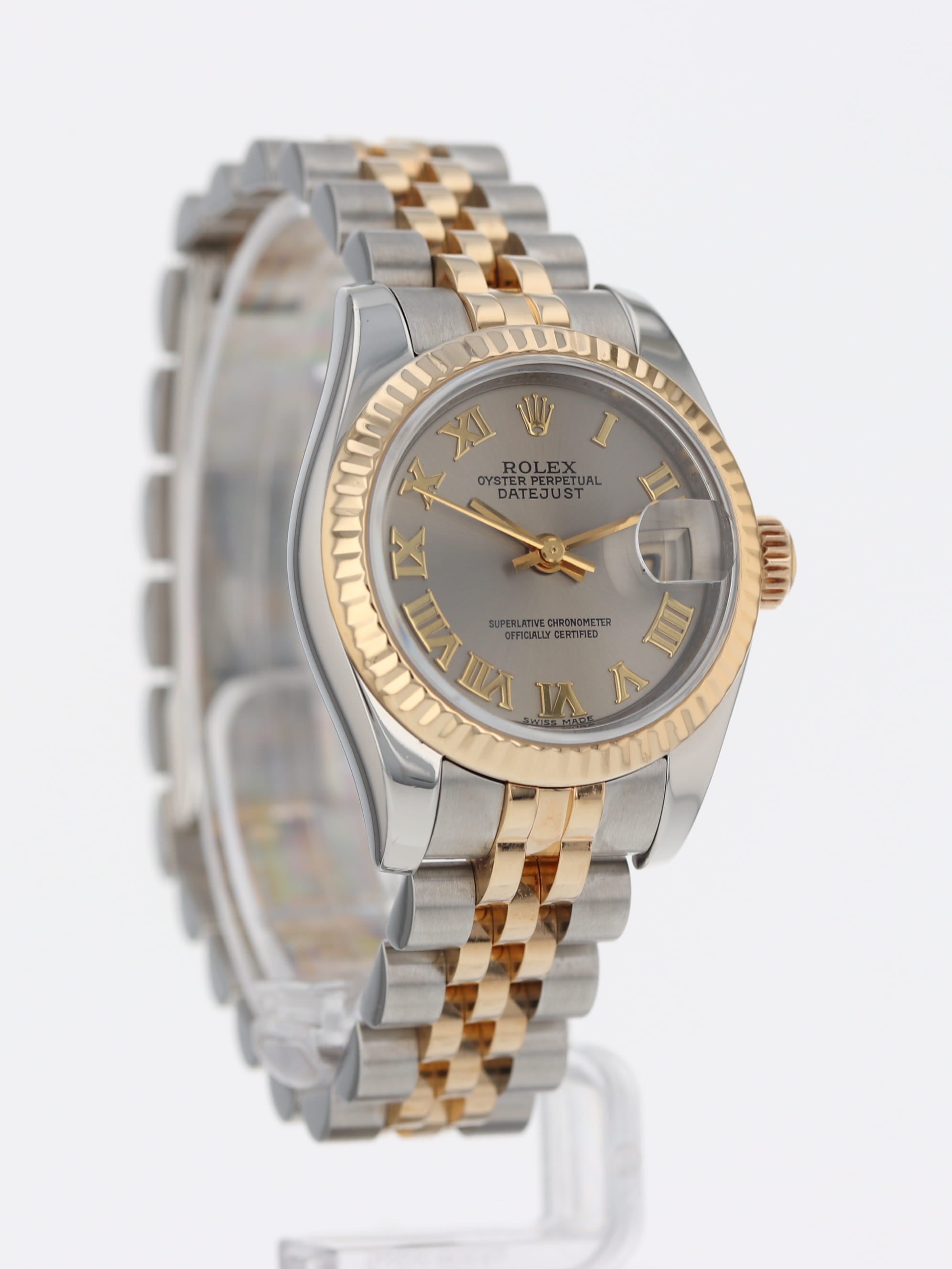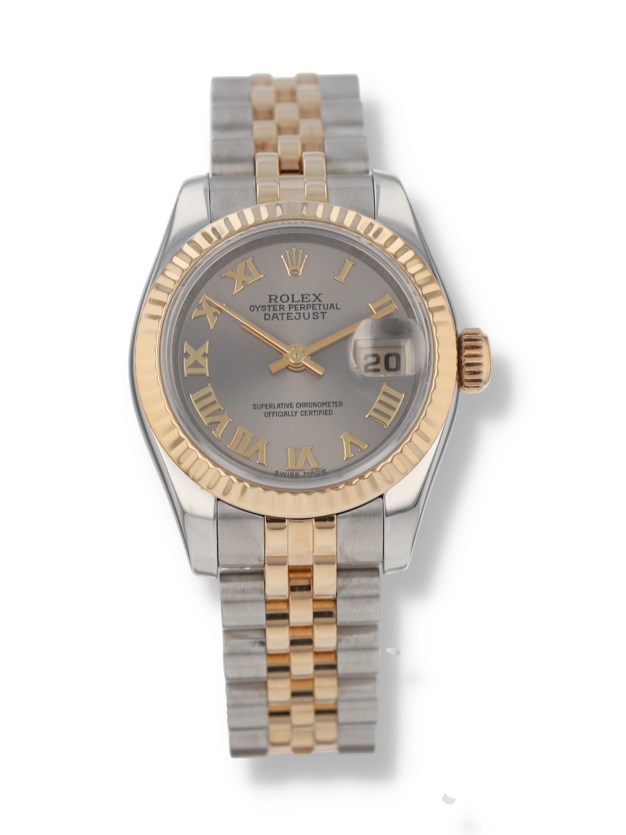 Rolex stainless steel ladies and 18k yellow gold Datejust, automatic, size 26mm. Rolex reference 179173 with a stainless steel case and two tone Jubilee bracelet, hidden folding clasp 18k yellow gold fluted bezel, silver roman dial, magnified date display, sapphire crystal, "G" serial, circa 2010. One year full warranty.