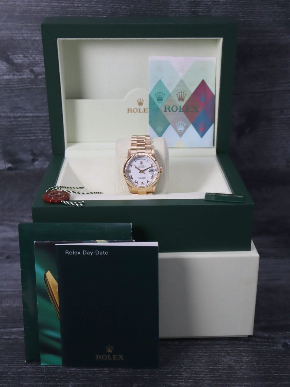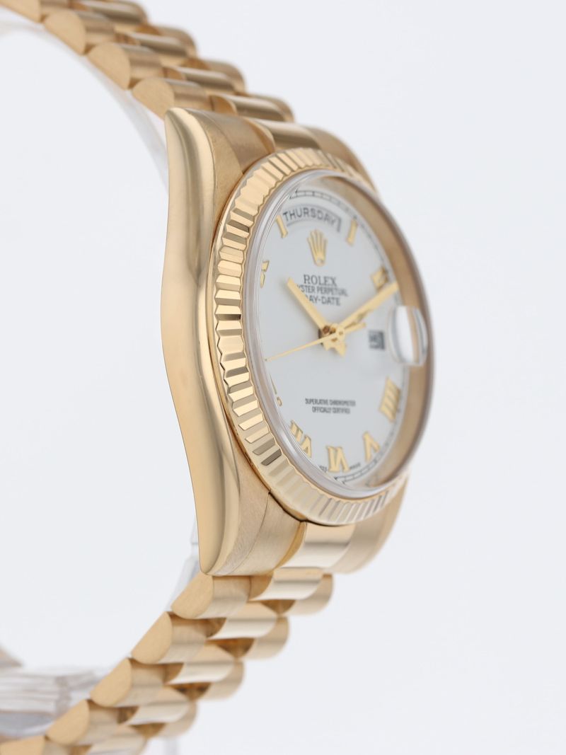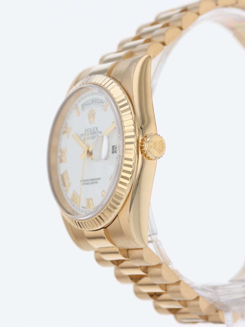 Rolex 18k yellow gold Day-Date, automatic, size 36mm. Rolex reference 118238 with an 18k yellow gold case and Presidential bracelet, 18k fluted bezel, white Roman dial with gold applied numerals, magnified date display, day display, sapphire crystal. "D" serial. Rolex box and papers dated 2006. One year full warranty.