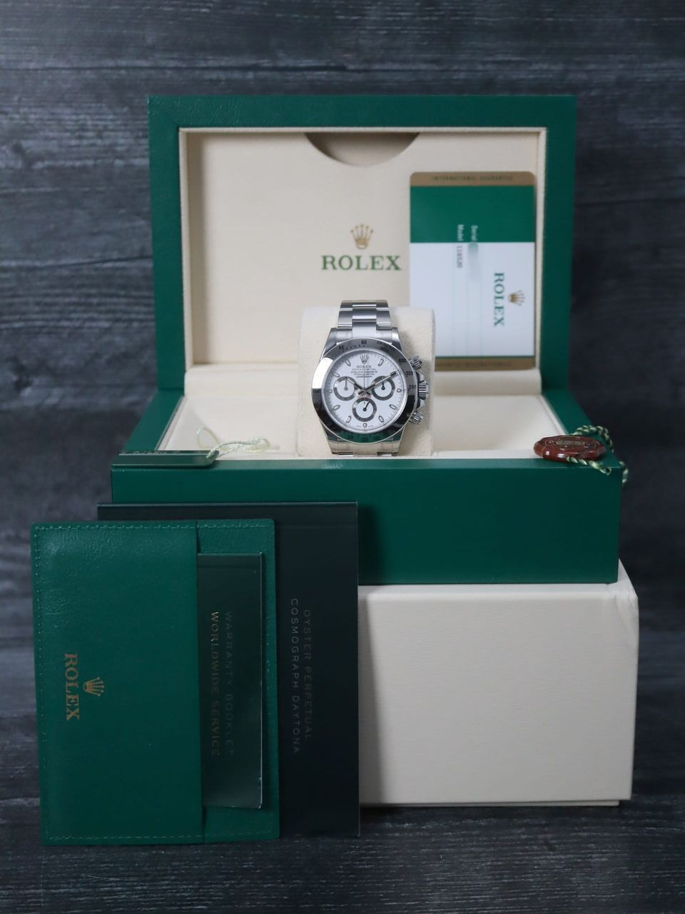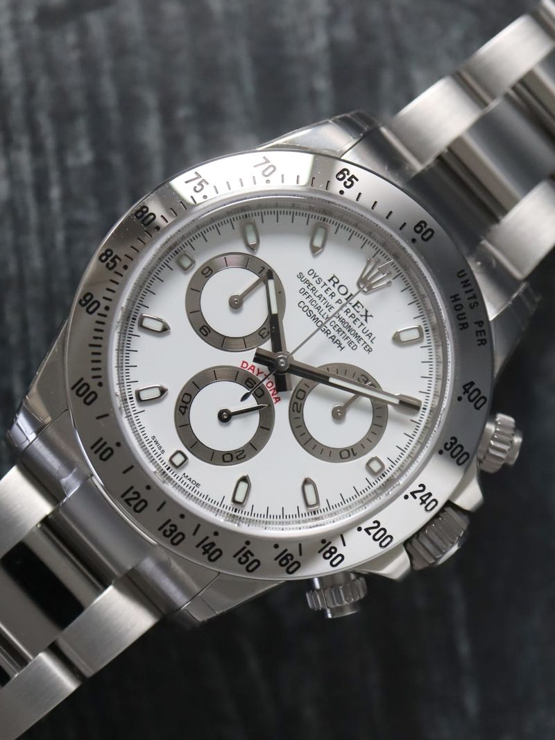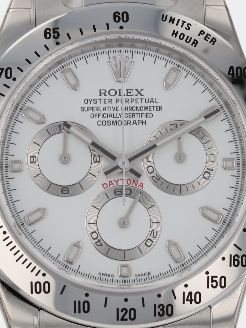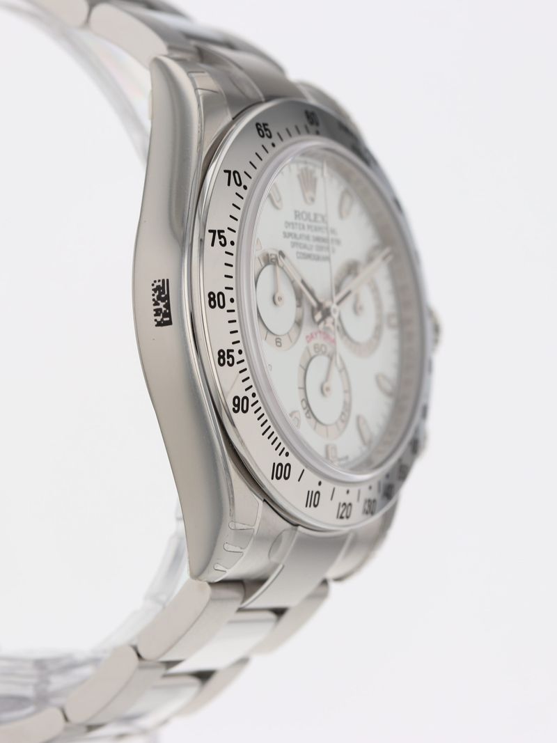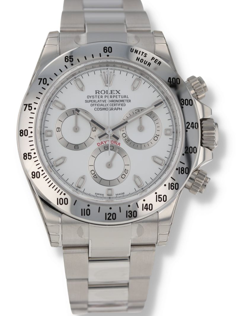 Rolex stainless steel Cosmograph Daytona, automatic, size 40mm. Rolex reference 116520 with a stainless steel case and Oyster bracelet with flip-lock clasp, white Swiss Made index dial, luminescent markers and hands, fixed tachymetre bezel, chronograph, sapphire crystal. Rolex box and card dated 2014. One year full warranty.