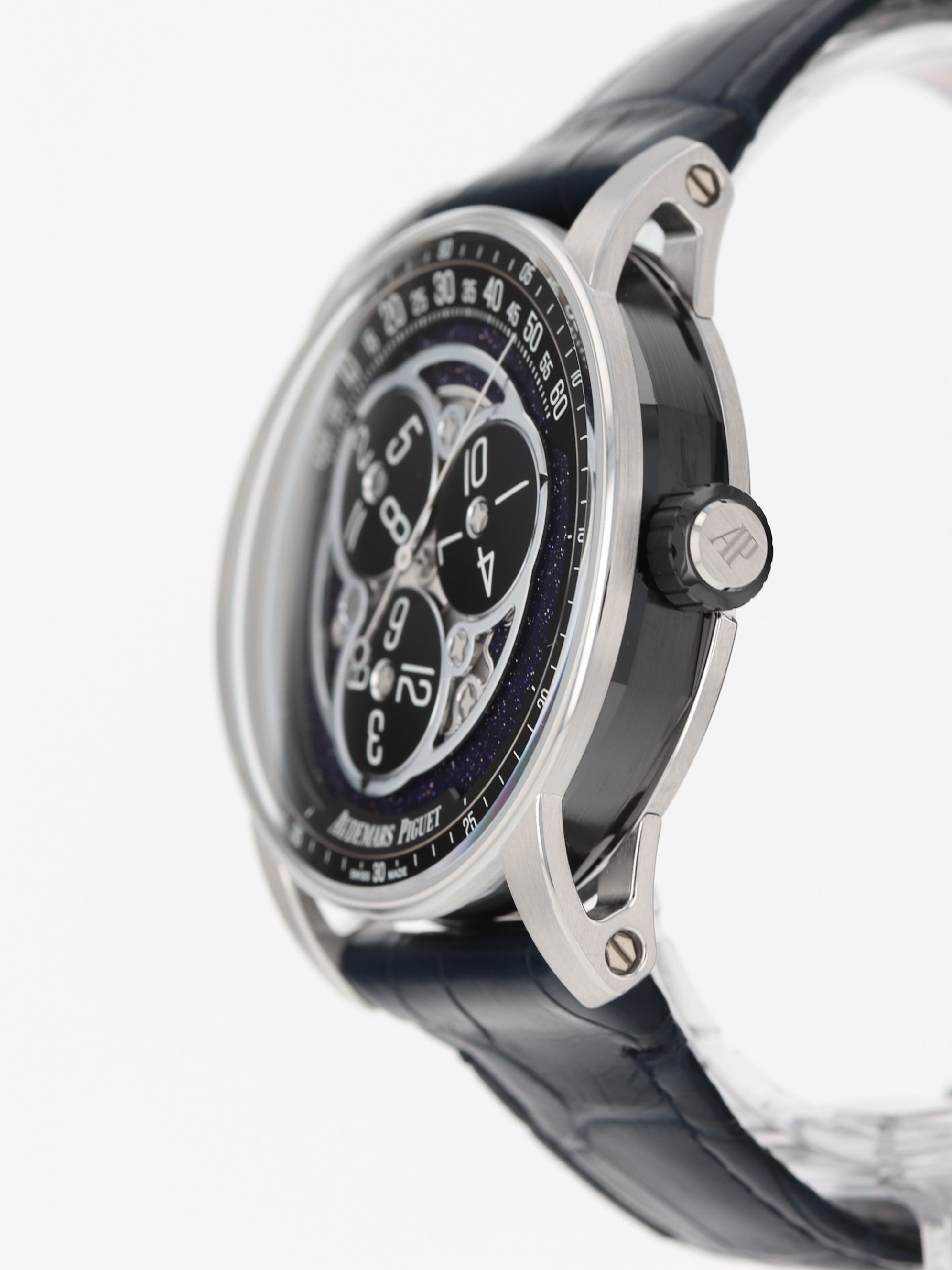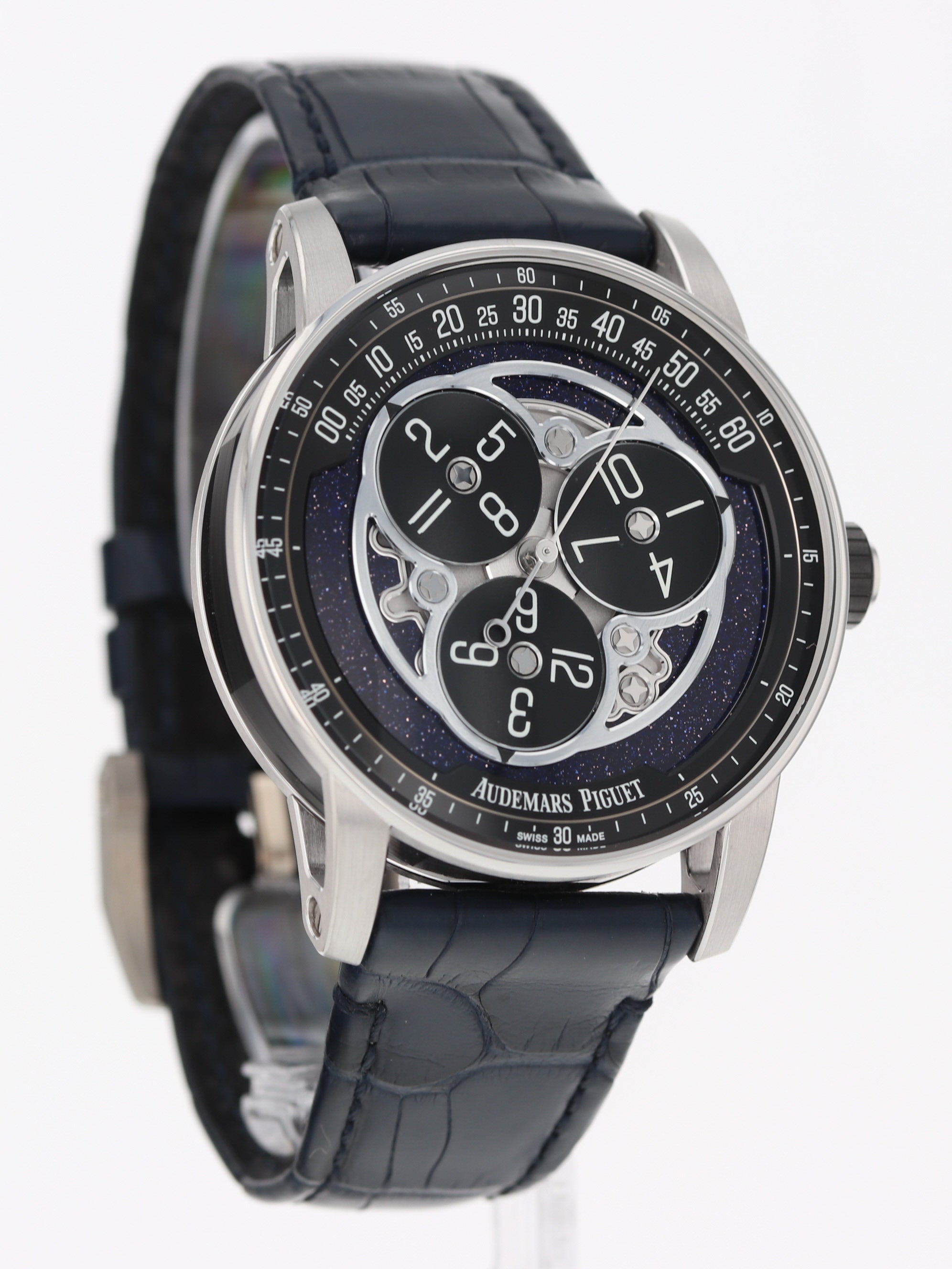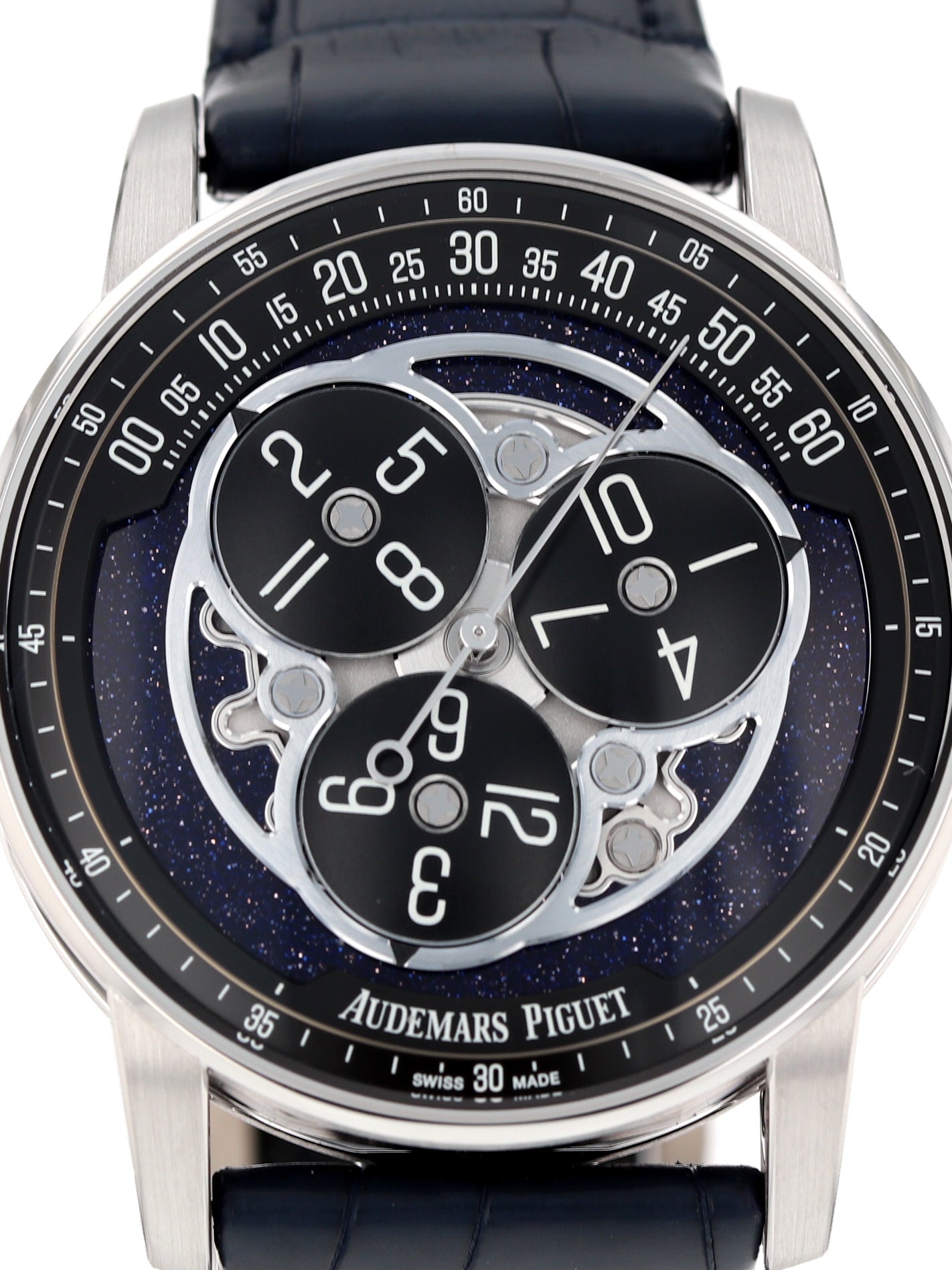 Audemars Piguet Code 11:59 "Starwheel", automatic, size 41mm. Audemars Piguet reference 15212NB.OO.A002KB.01-AB with two tone 18k white gold and black ceramic case, exhibition caseback, blue aventurine dial, black opaline aluminium discs, 18-carat white gold hand and black inner bezel. Audemars blue leather strap. Audemars Box and card.