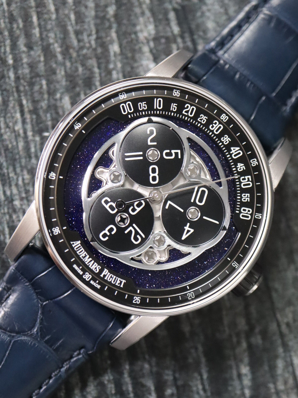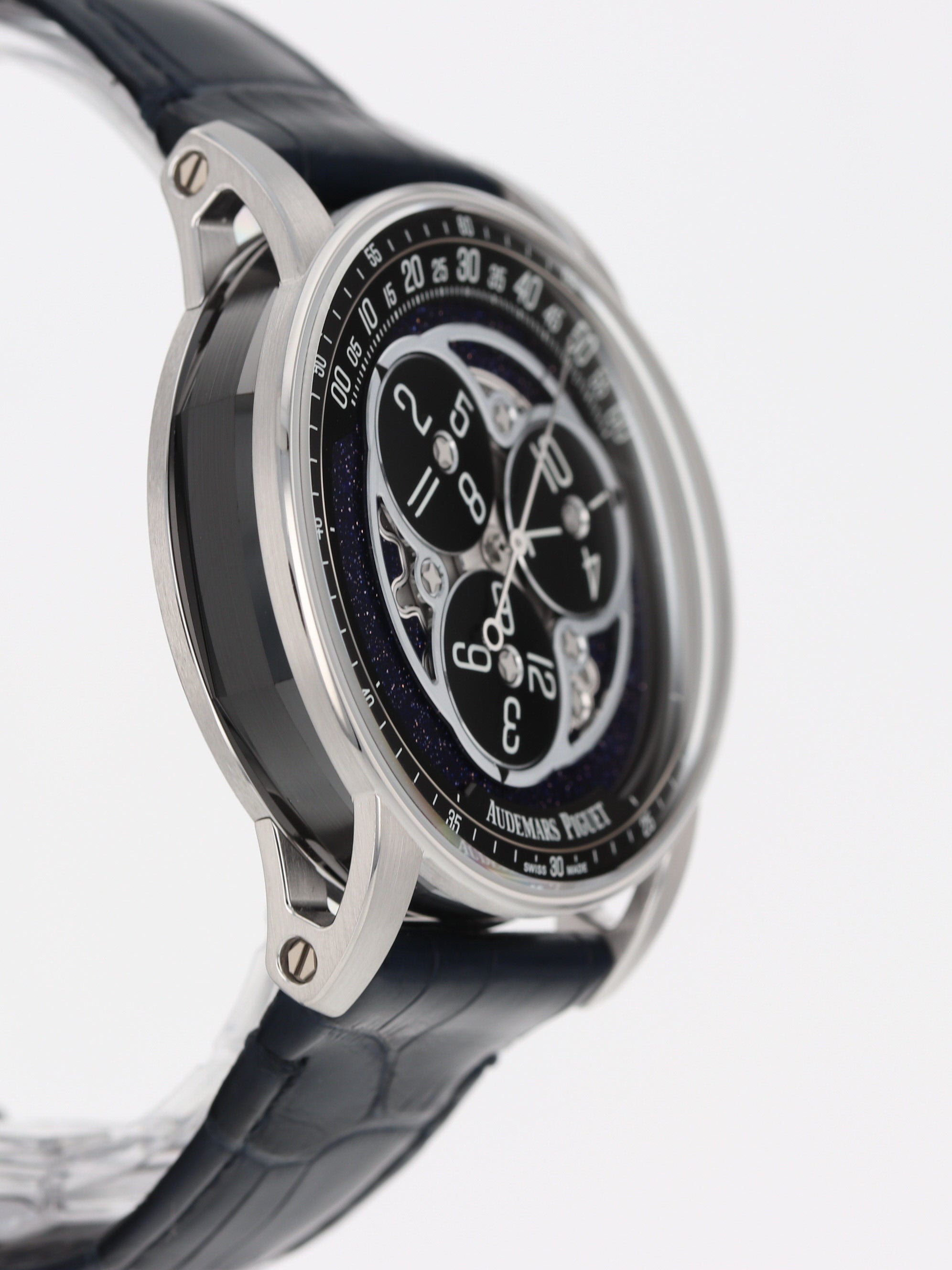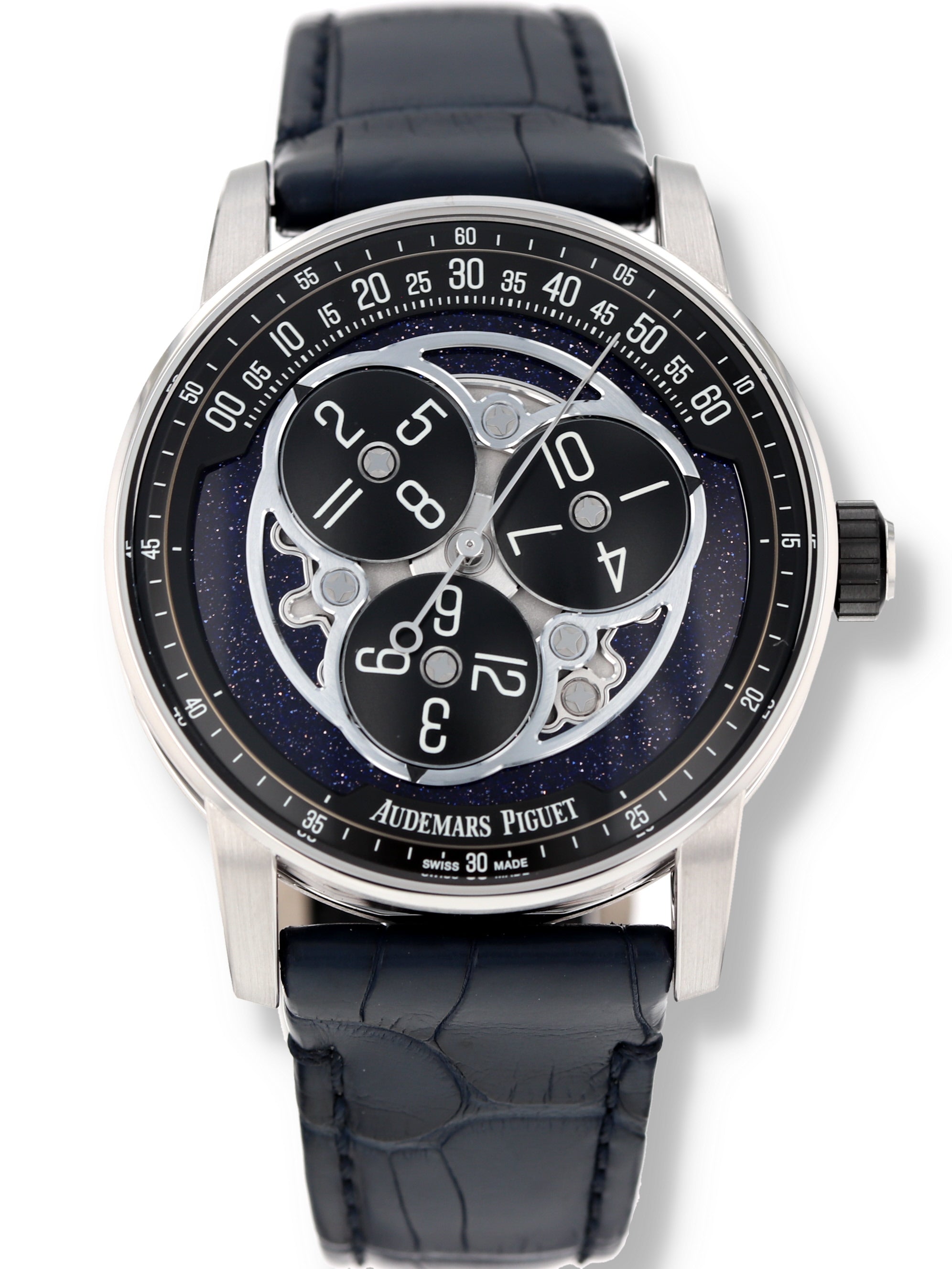 Audemars Piguet Code 11:59 "Starwheel", automatic, size 41mm. Audemars Piguet reference 15212NB.OO.A002KB.01-AB with two tone 18k white gold and black ceramic case, exhibition caseback, blue aventurine dial, black opaline aluminium discs, 18-carat white gold hand and black inner bezel. Audemars blue leather strap. Audemars Box and card.