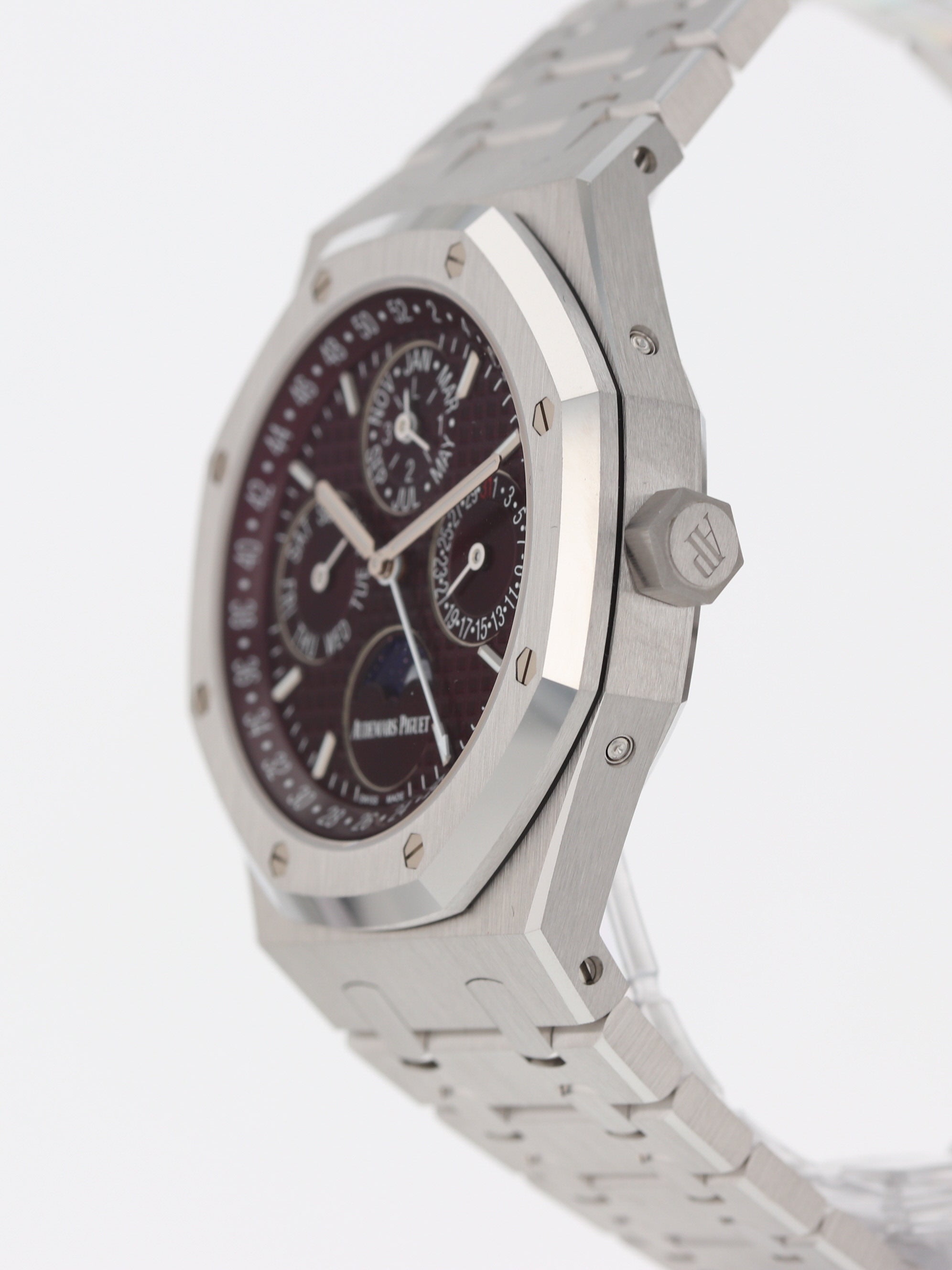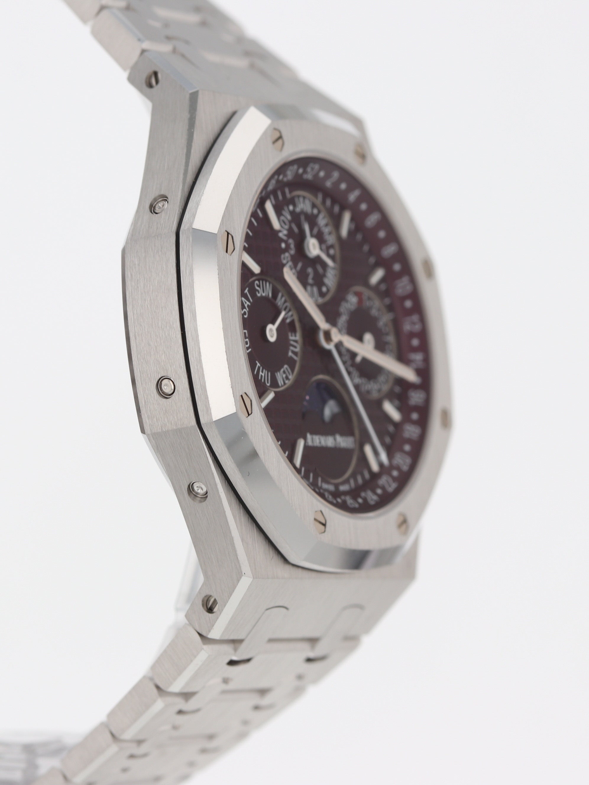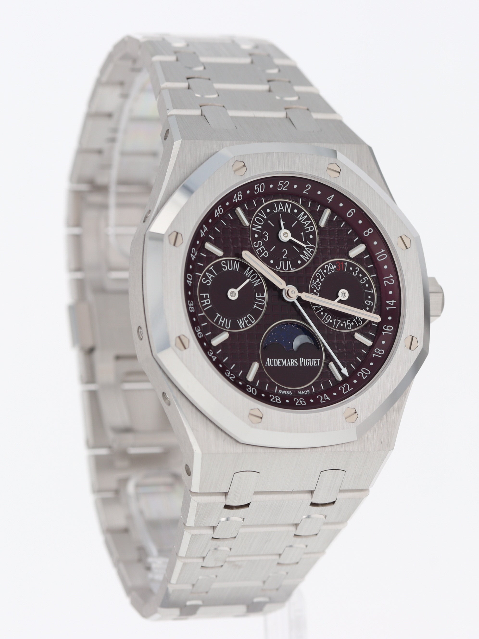 Audemars Piguet Royal Oak Perpetual Calendar "Qatar", automatic, size 41mm. Audemars Piguet reference Ref. 26574BC.OO.1220BC.01 with an 18k white gold case and bracelet, exhibition caseback, "Grande Tapisserie" dial in vivid burgundy hue, white gold applied hour-markers and Royal Oak hands with luminescent coating, burgundy inner bezel, sapphire crystal. Audemars Piguet box and card. Perpetual calendar with week indication, day, date, astronomical moon, month, leap year, hours and minutes. Like New condition.