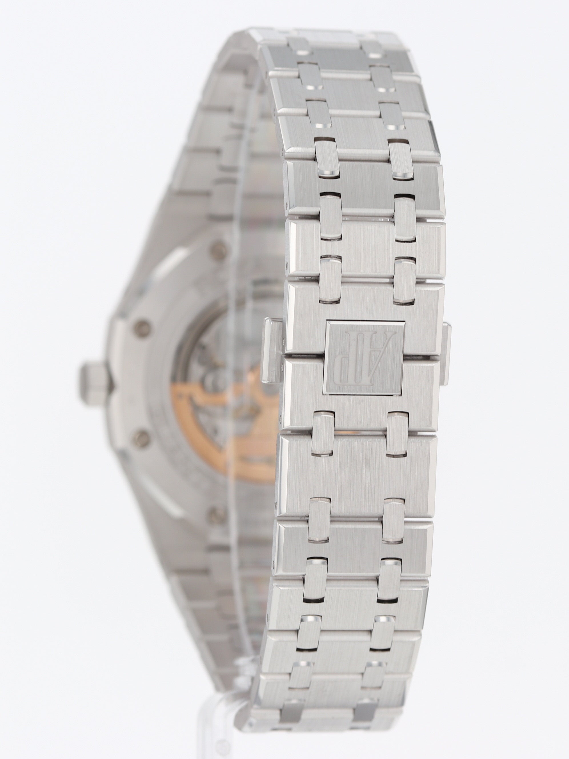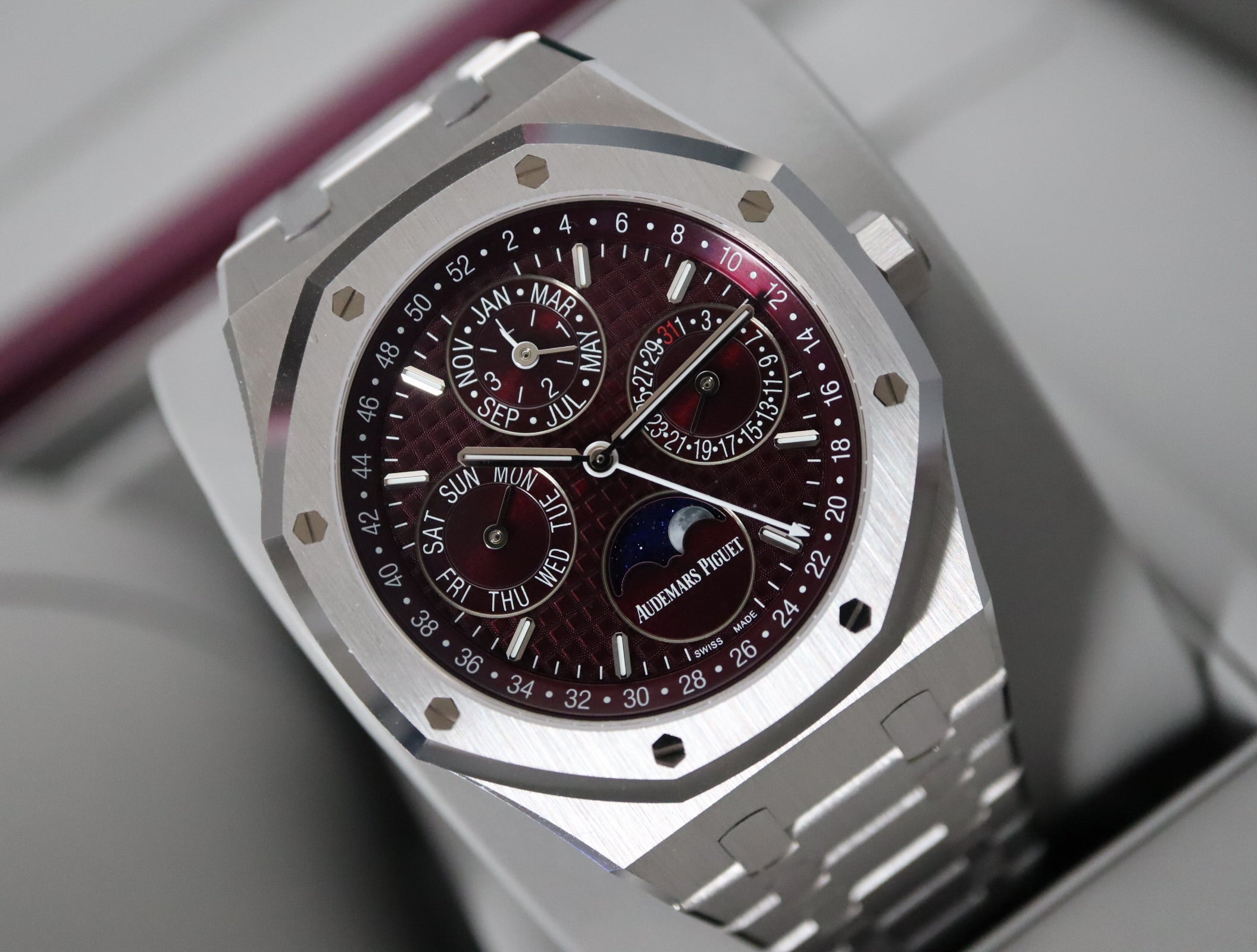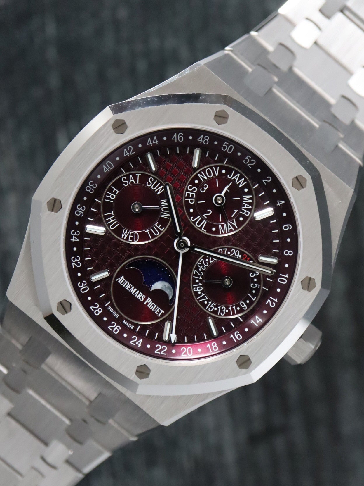 Audemars Piguet Royal Oak Perpetual Calendar "Qatar", automatic, size 41mm. Audemars Piguet reference Ref. 26574BC.OO.1220BC.01 with an 18k white gold case and bracelet, exhibition caseback, "Grande Tapisserie" dial in vivid burgundy hue, white gold applied hour-markers and Royal Oak hands with luminescent coating, burgundy inner bezel, sapphire crystal. Audemars Piguet box and card. Perpetual calendar with week indication, day, date, astronomical moon, month, leap year, hours and minutes. Like New condition.