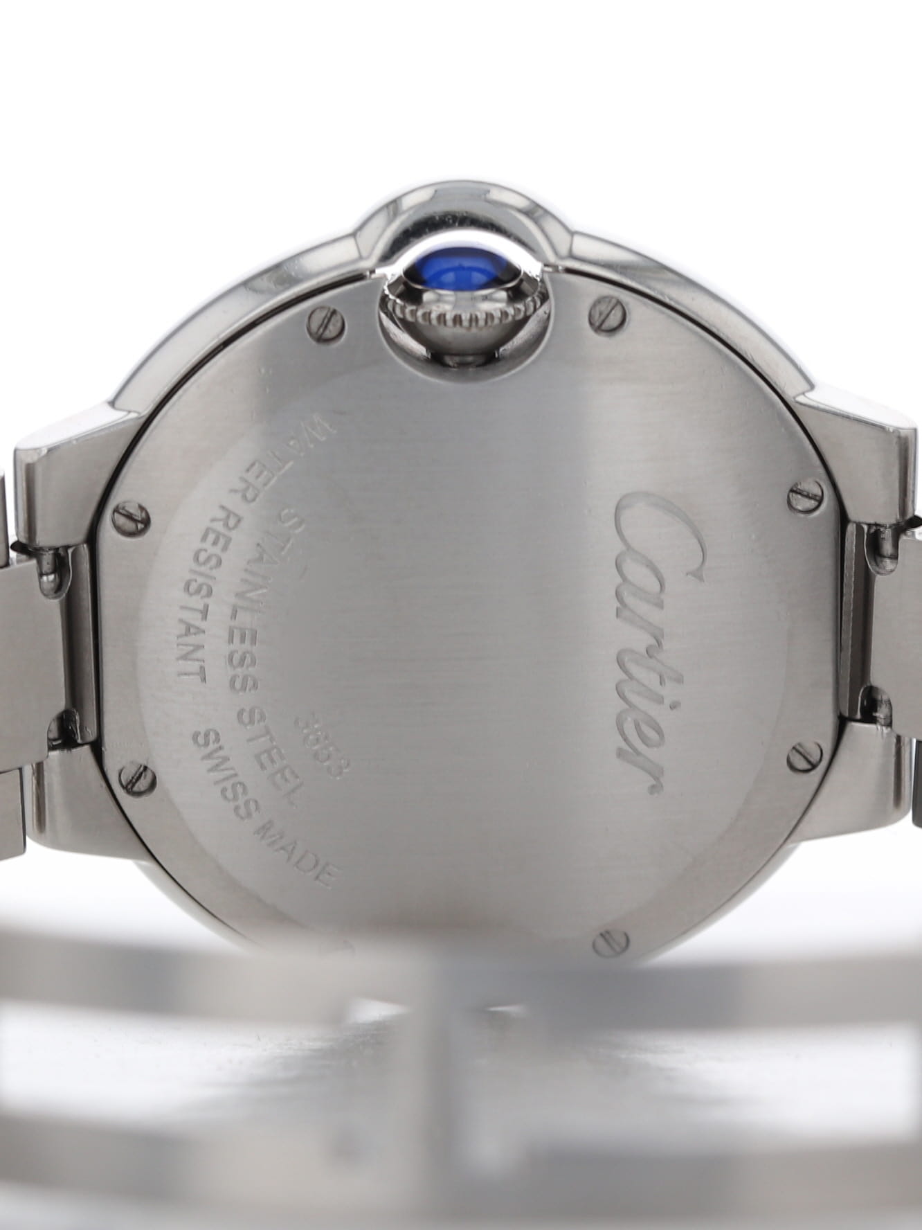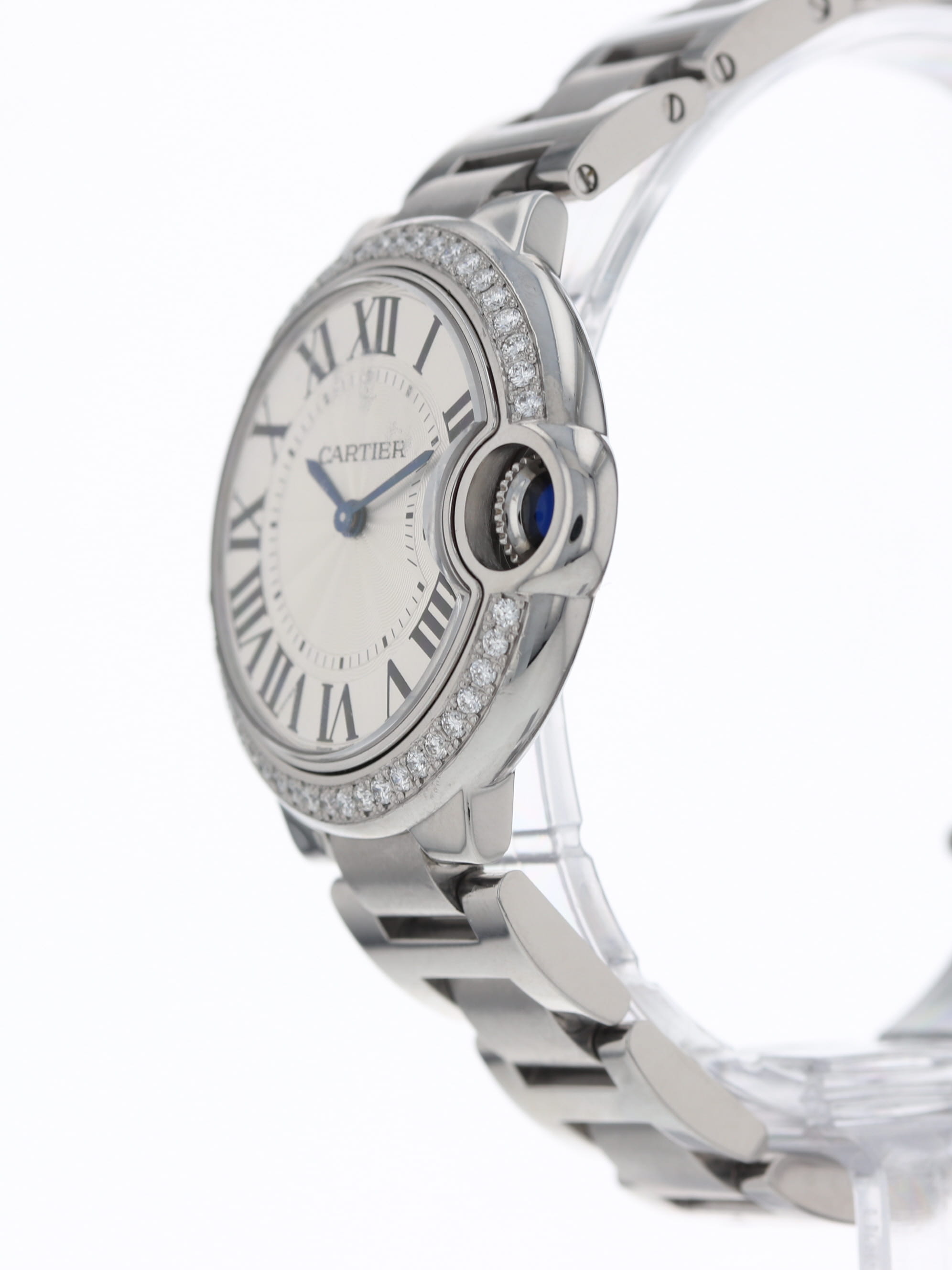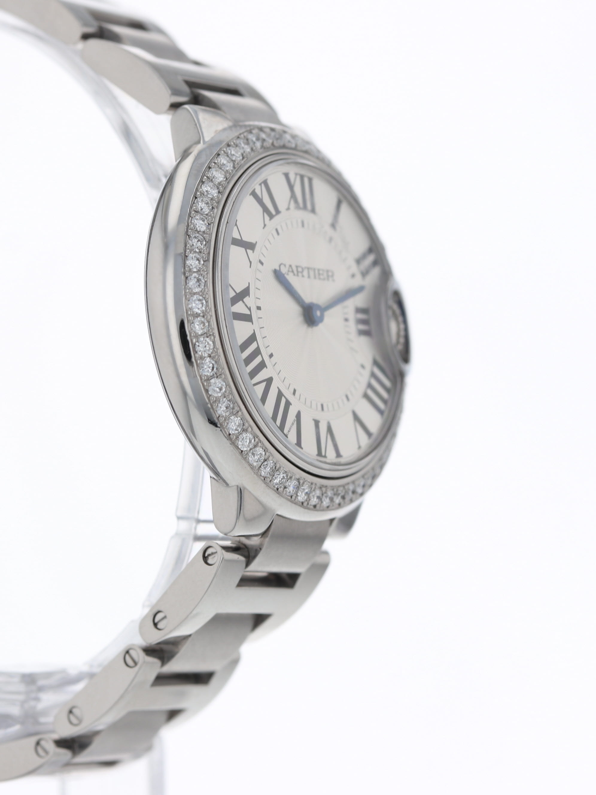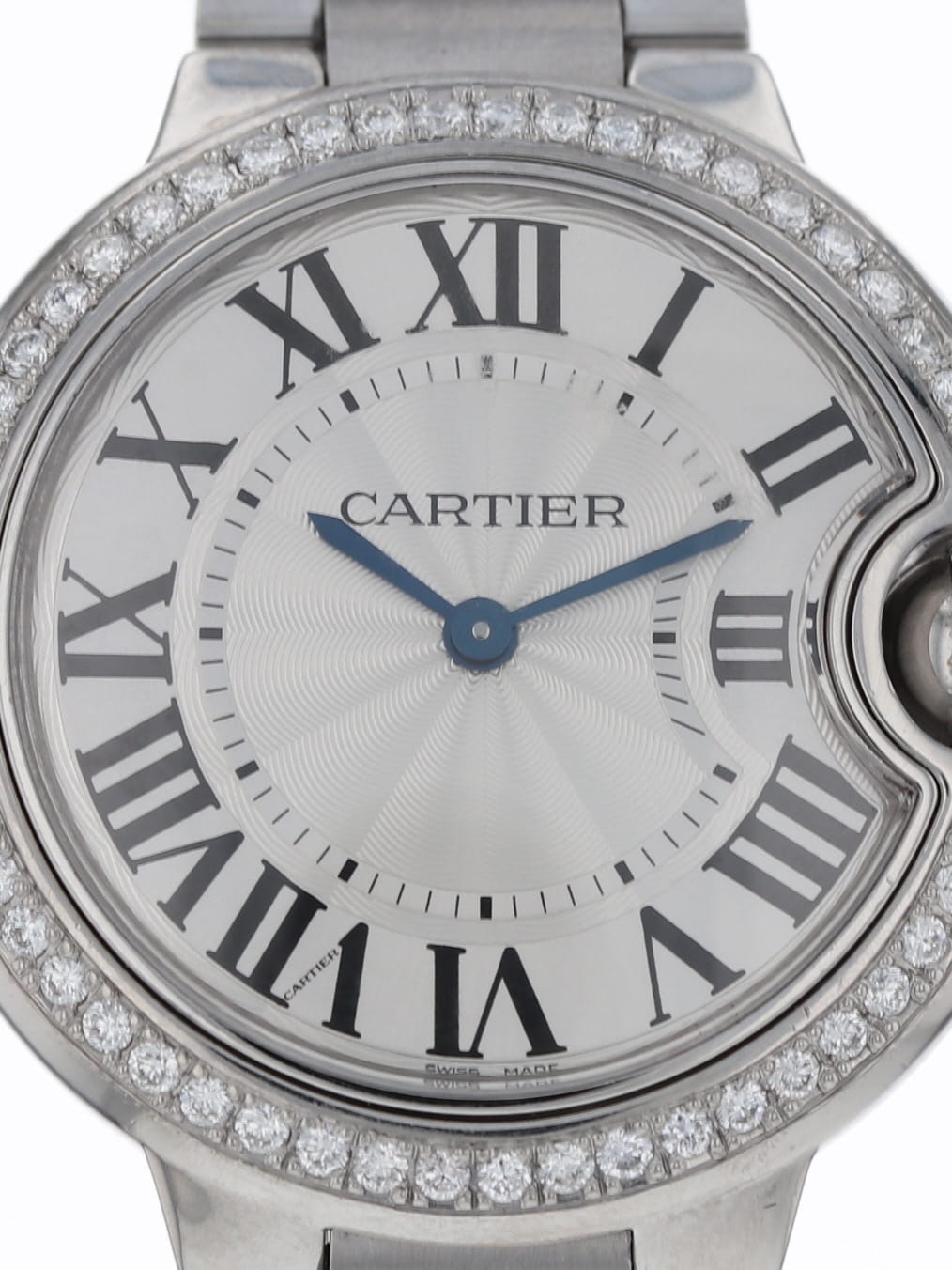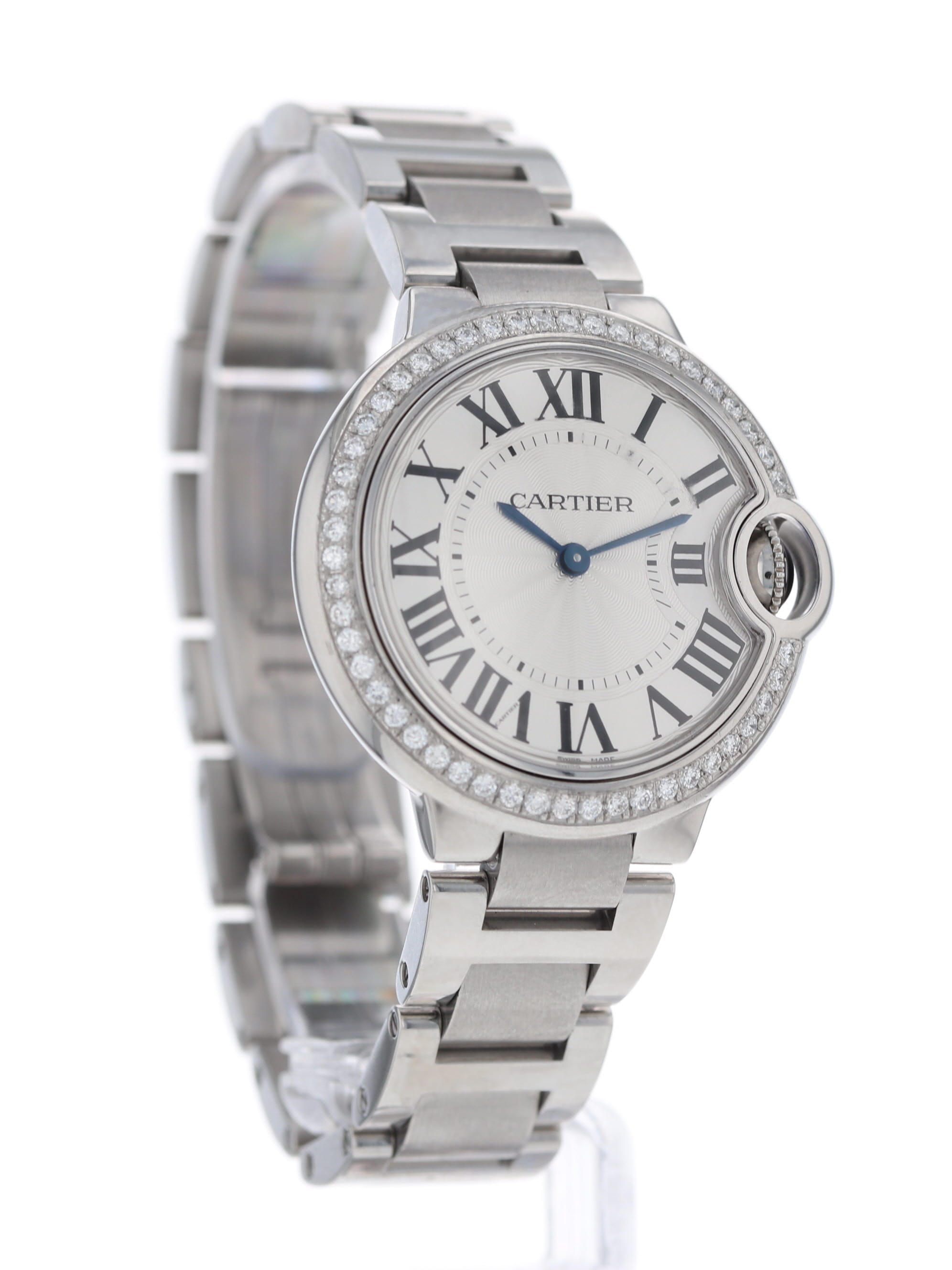 Cartier stainless steel medium model Ballon Bleu, quartz, size 33mm. mid-size 33mm, quartz. Cartier reference W6920084 with a stainless steel steel case and bracelet, custom diamond bezel added, silver guilloché Roman dial, blued-steel sword shaped hands, sapphire crystal. Cartier box and open papers.