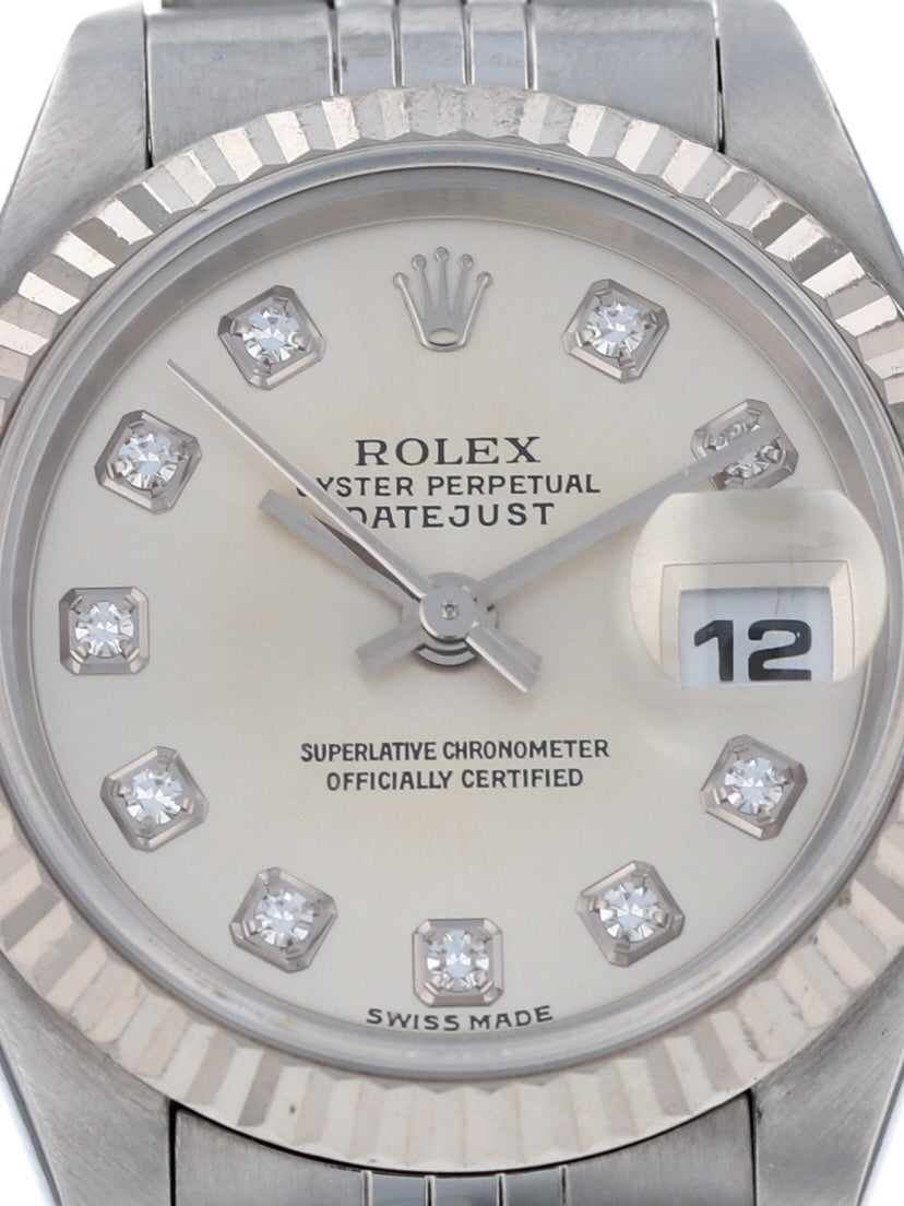 Rolex stainless steel ladies Datejust, automatic, size 26mm. Rolex reference 79174 with a stainless steel case and Jubilee bracelet, 18k white gold fluted bezel, silver diamond dial, magnified date display, sapphire crystal. "Y" serial, circa 2002. One year full warranty.