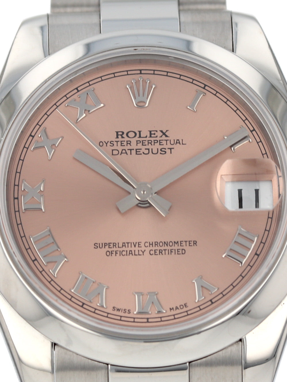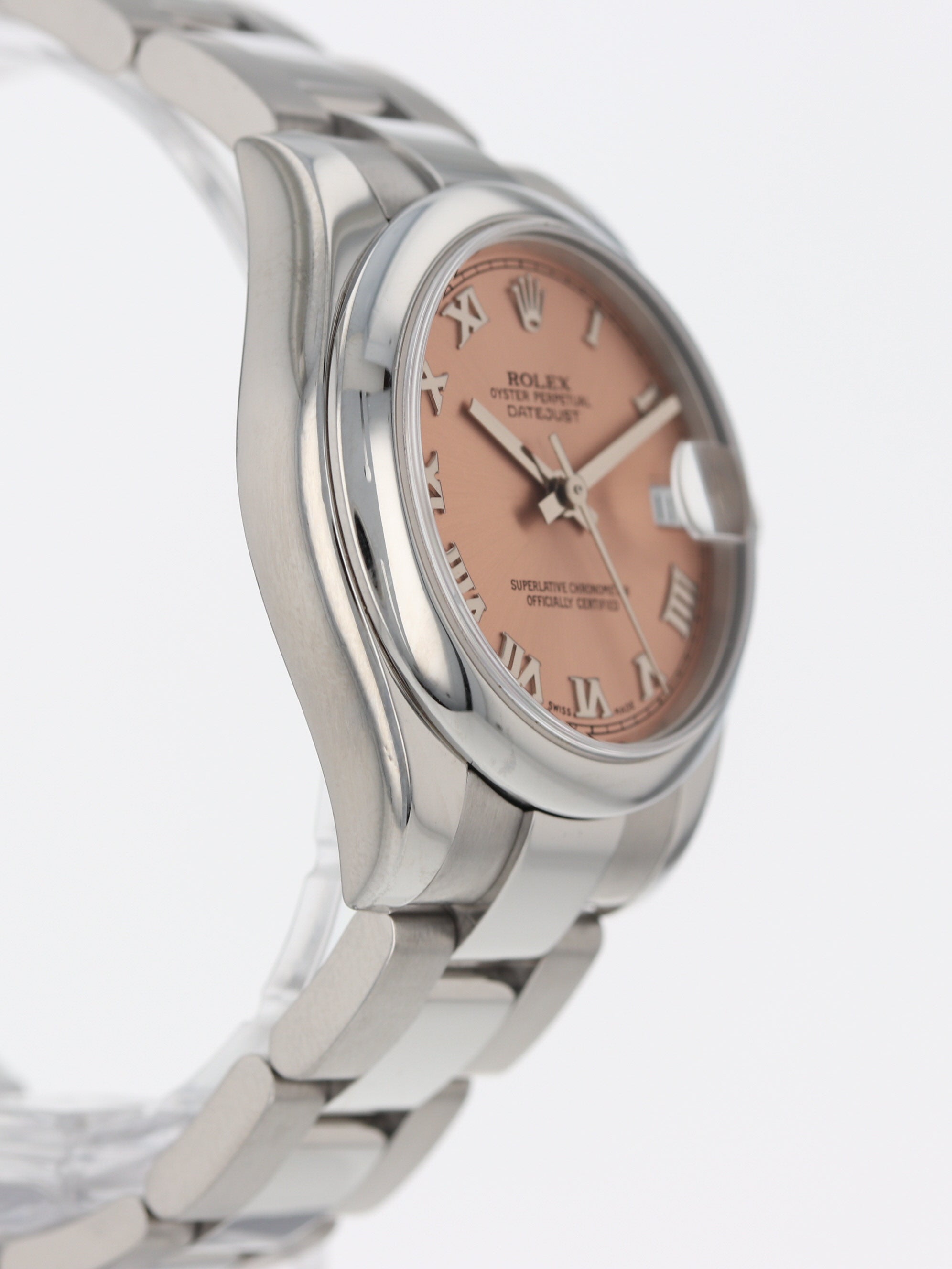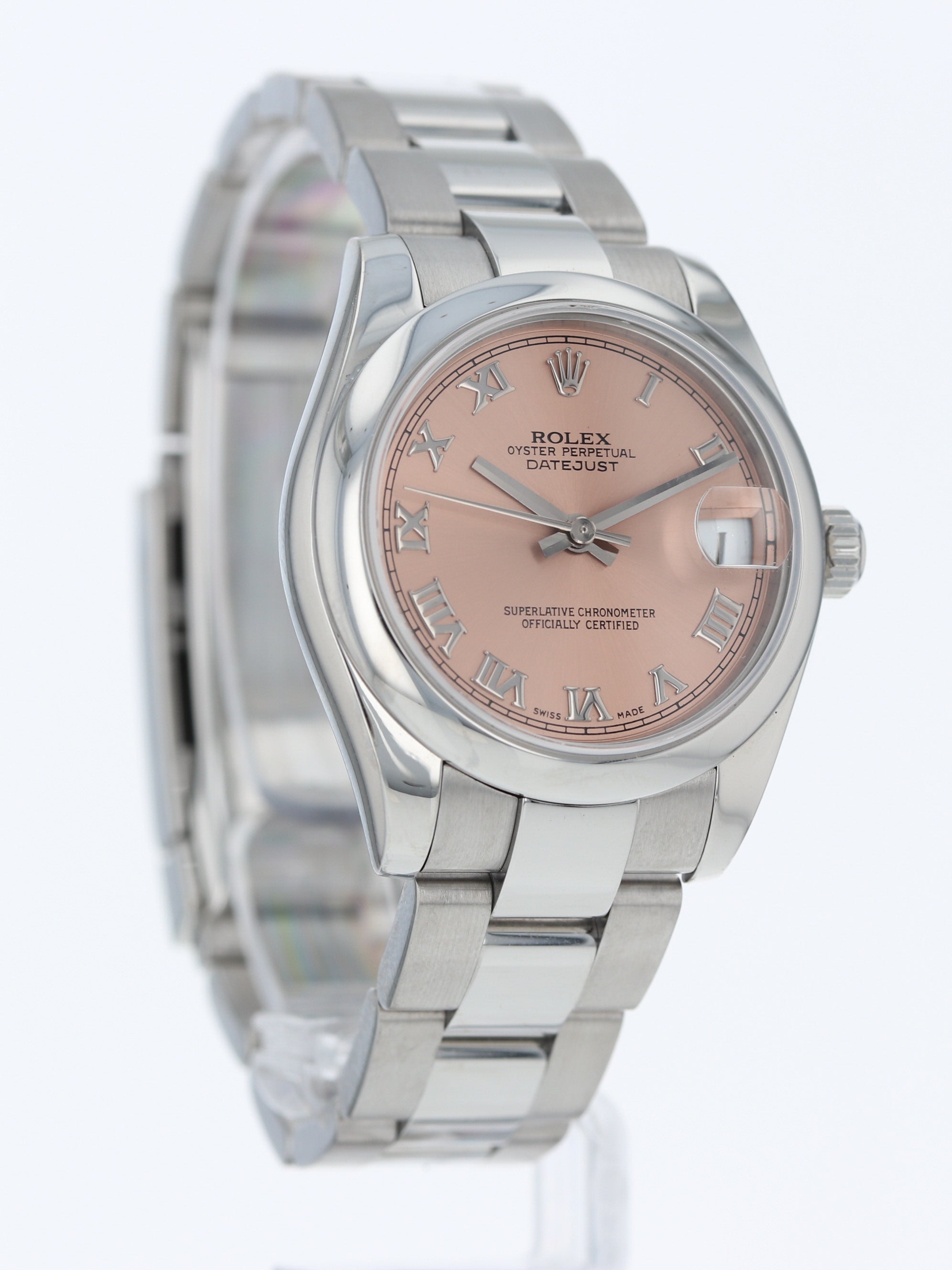 Rolex stainless steel mid-size Datejust, automatic, size 31mm. Rolex reference 178240 with a stainless steel case and Oyster bracelet, smooth bezel, Salmon Roman dial, magnified date display, sapphire crystal. Rolex box and papers dated 2006. "D" serial. One year full warranty.