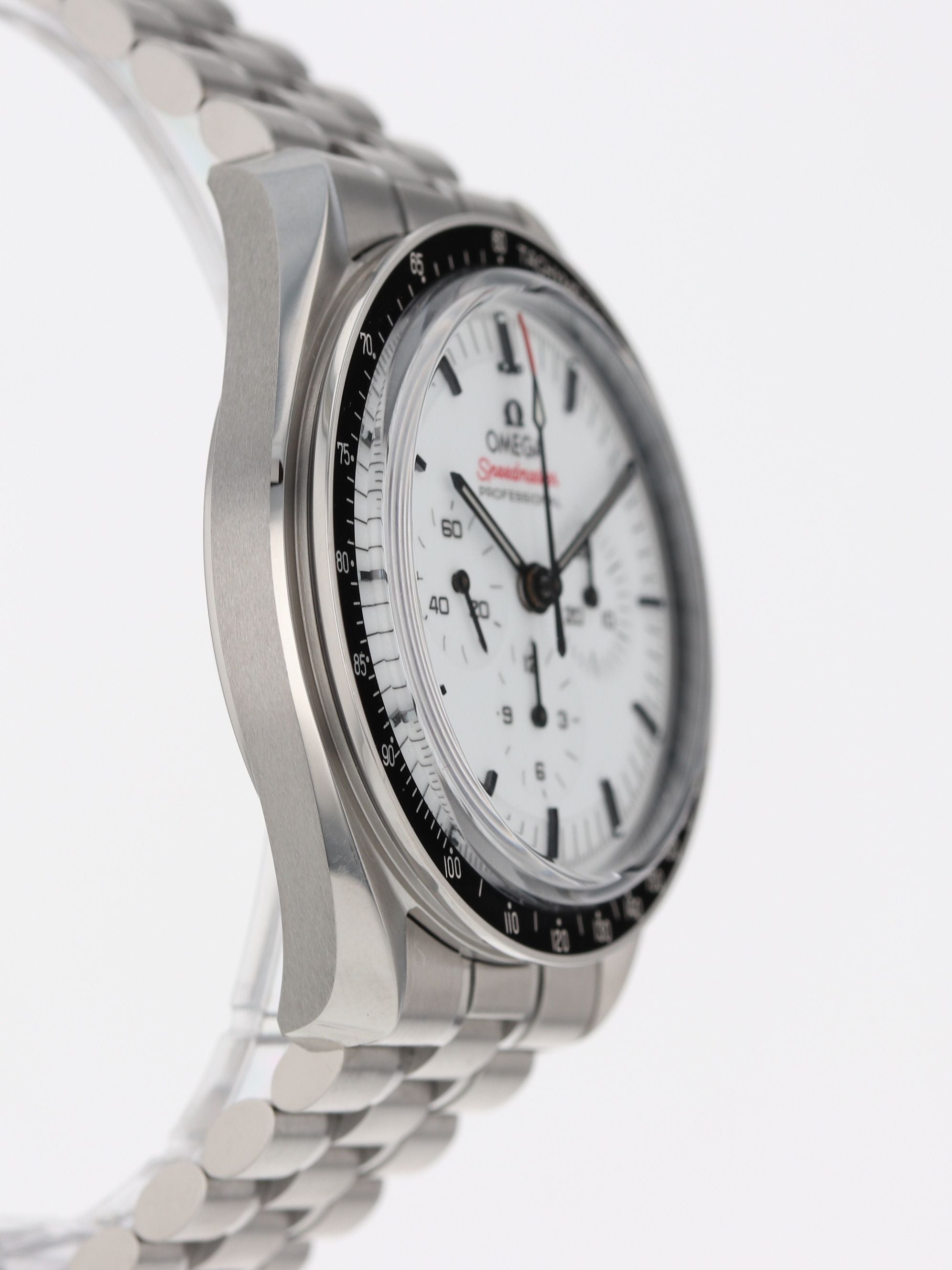 Omega stainless steel Speedmaster Moonwatch Professional, manual, size 42mm. Omega reference 310.30.42.50.04.001 with a stainless steel case and bracelet, exhibition caseback, white dial, chronograph, black tachymetre bezel, sapphire crystal. Omega box and 2024 card. Four year full warranty. List" $9,100.