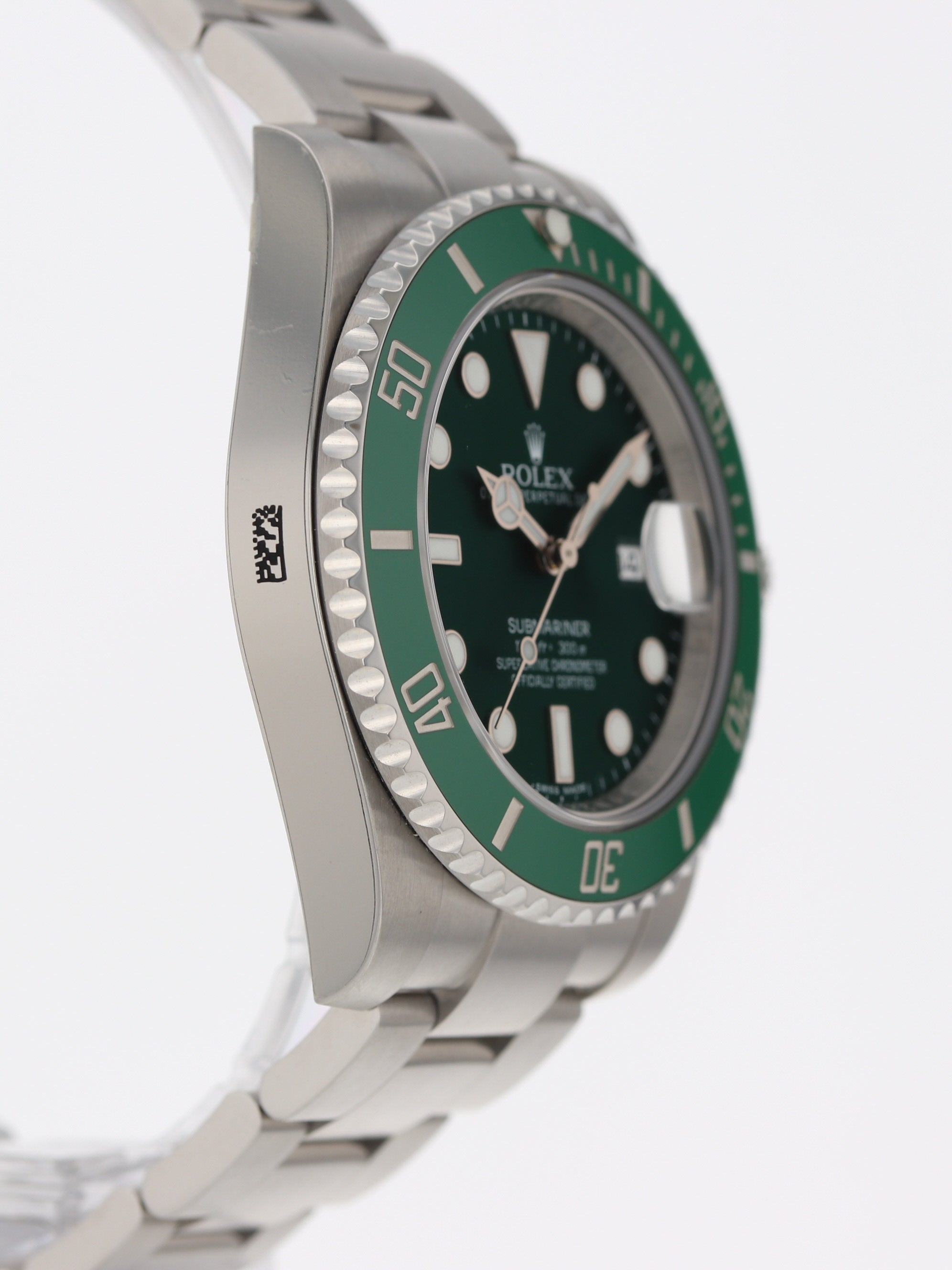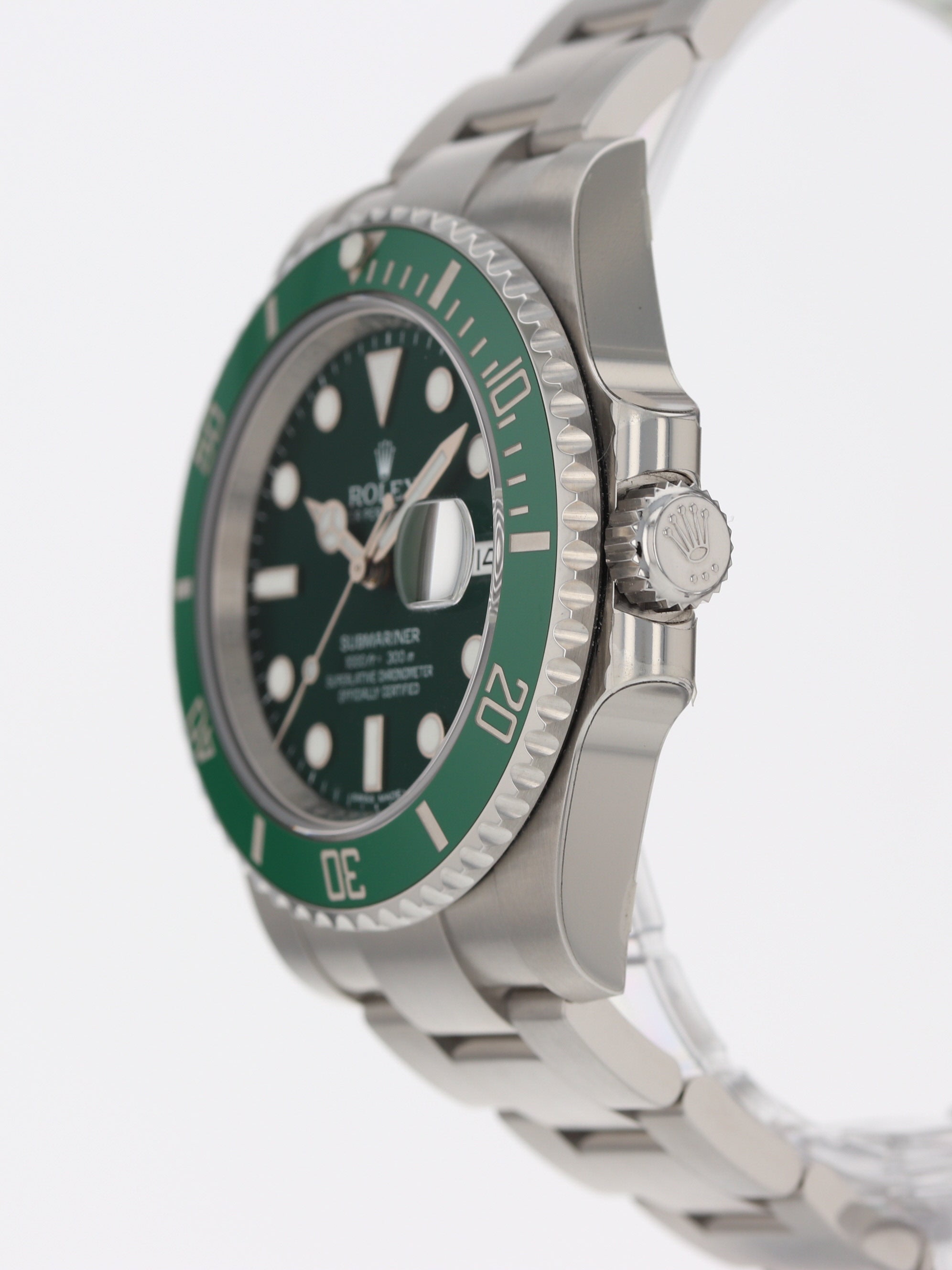 Rolex stainless steel Submariner, automatic, size 40mm. Rolex reference 116610 "Hulk" with a stainless steel case and Oyster bracelet, Glidelock Extension system, green index dial, magnified date display, green Ceramic rotating bezel, luminescent markers and hands, sapphire crystal. Rolex box and 2016 card. Unworn/New Old Stock with factory stickers.