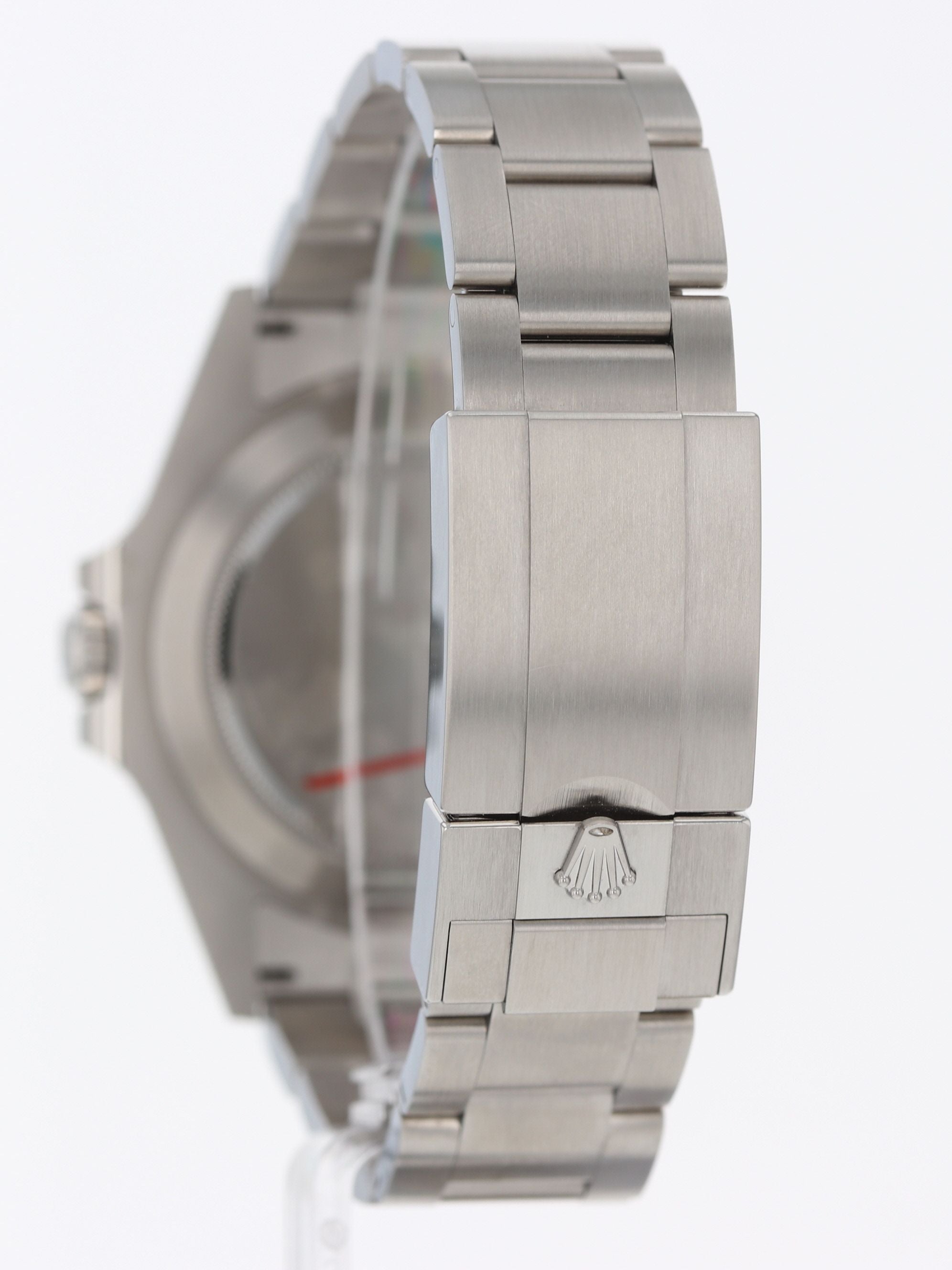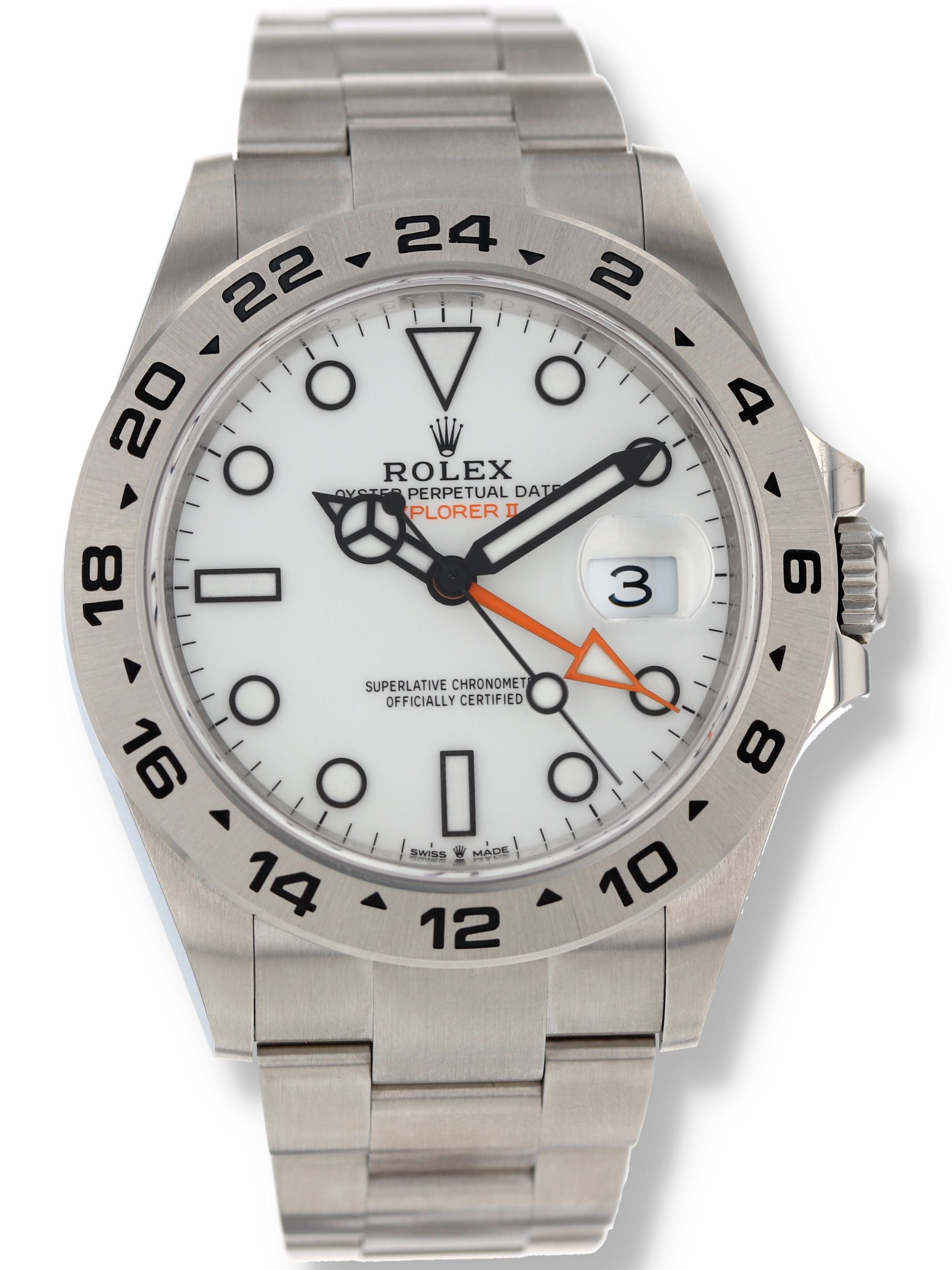 Rolex stainless steel Explorer II, automatic, size 42mm. Rolex reference 226570 with a stainless steel case and Oyster bracelet, Folding Oysterlock safety clasp with Easylink 5 mm comfort extension link, 24-hour bezel, "Polar" white index dial, luminescent markers and hands, magnified date display, sapphire crystal. Rolex box and card dated 2025. Five year full warranty.