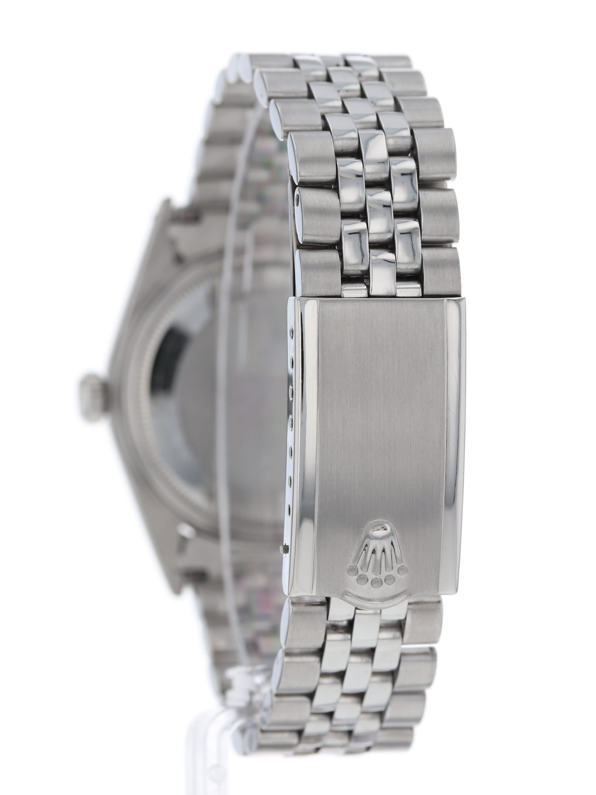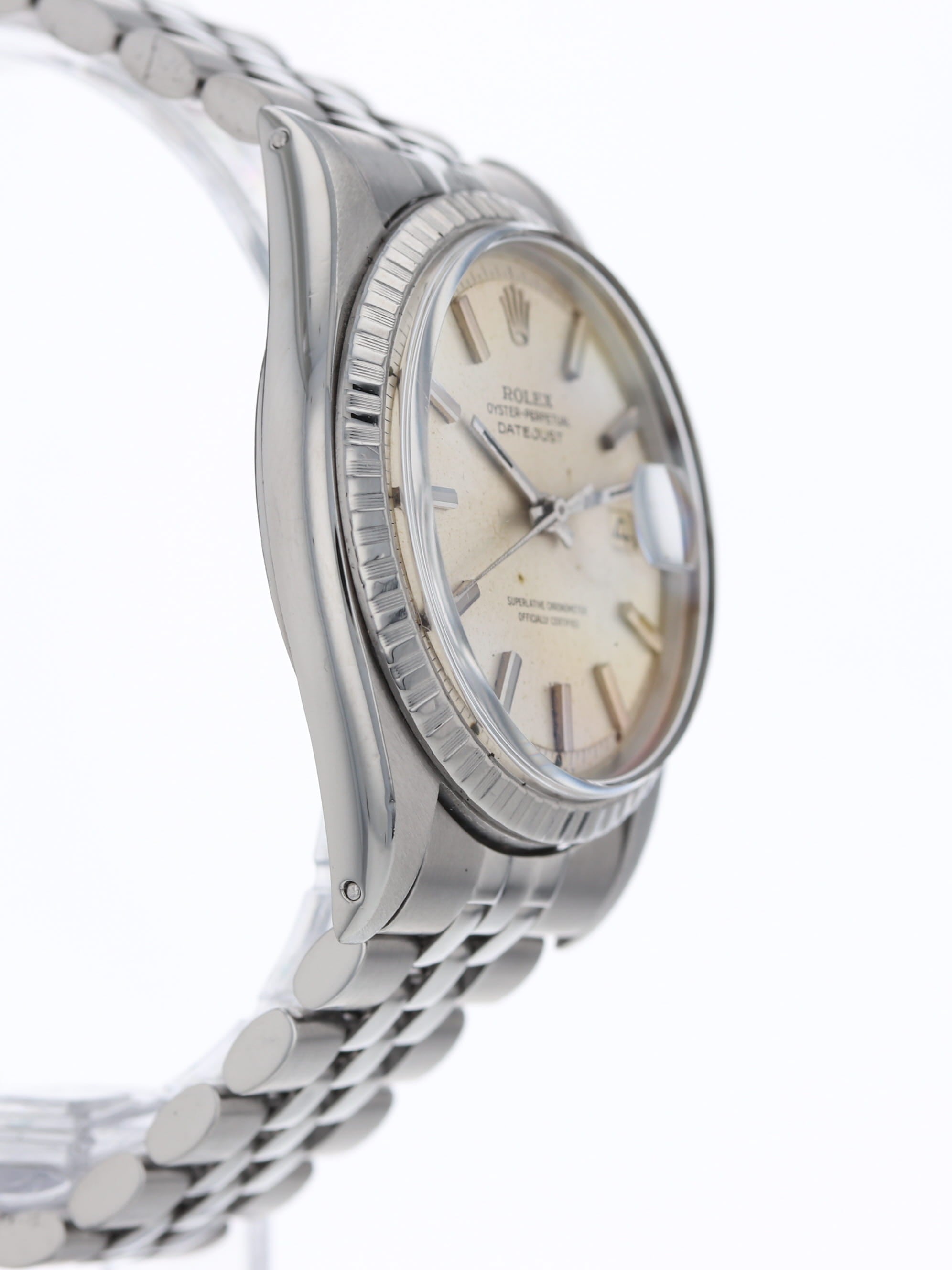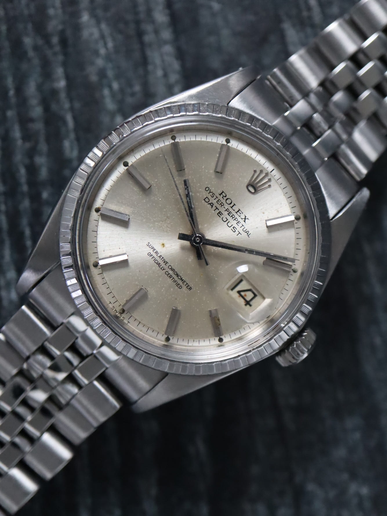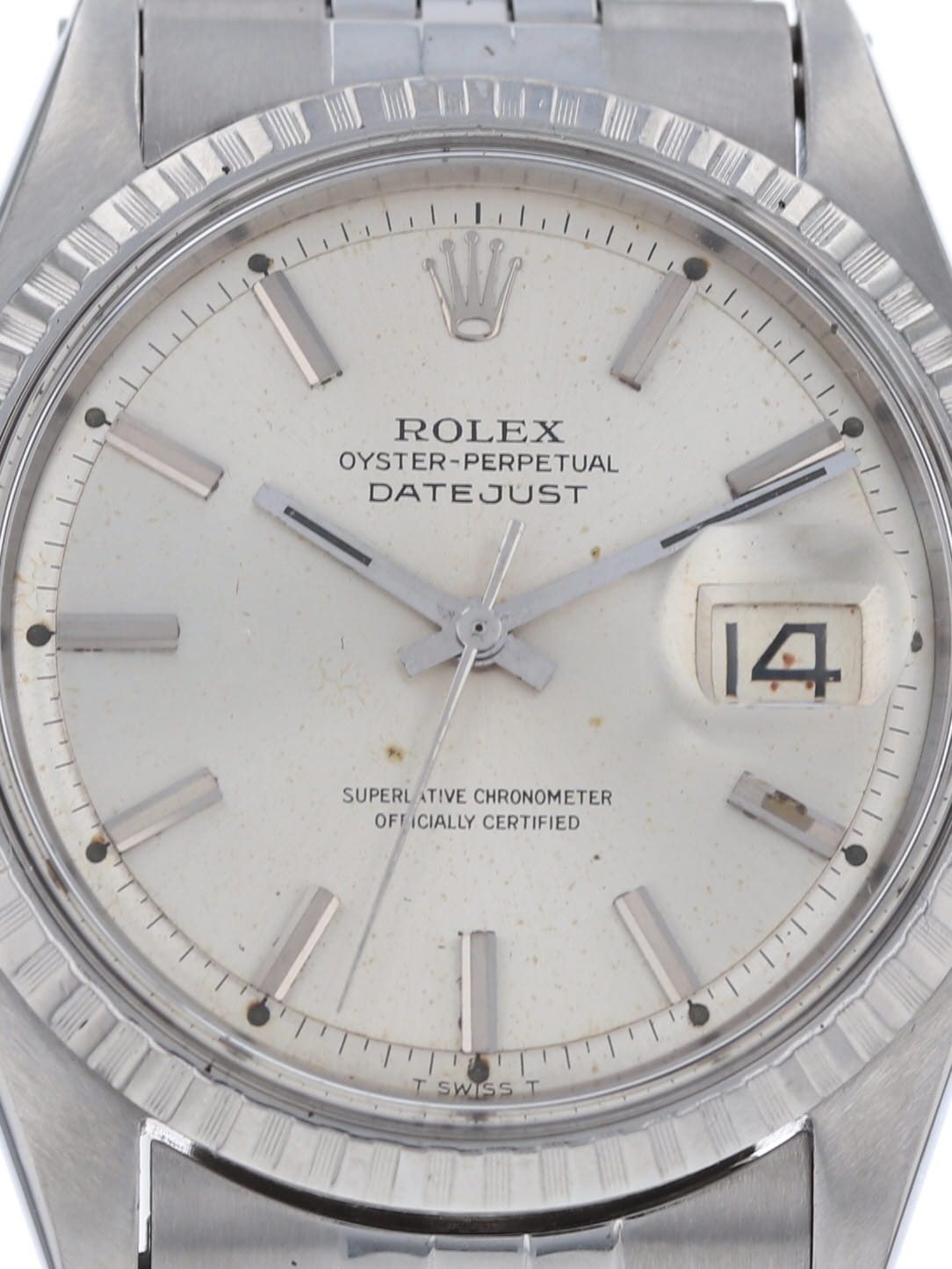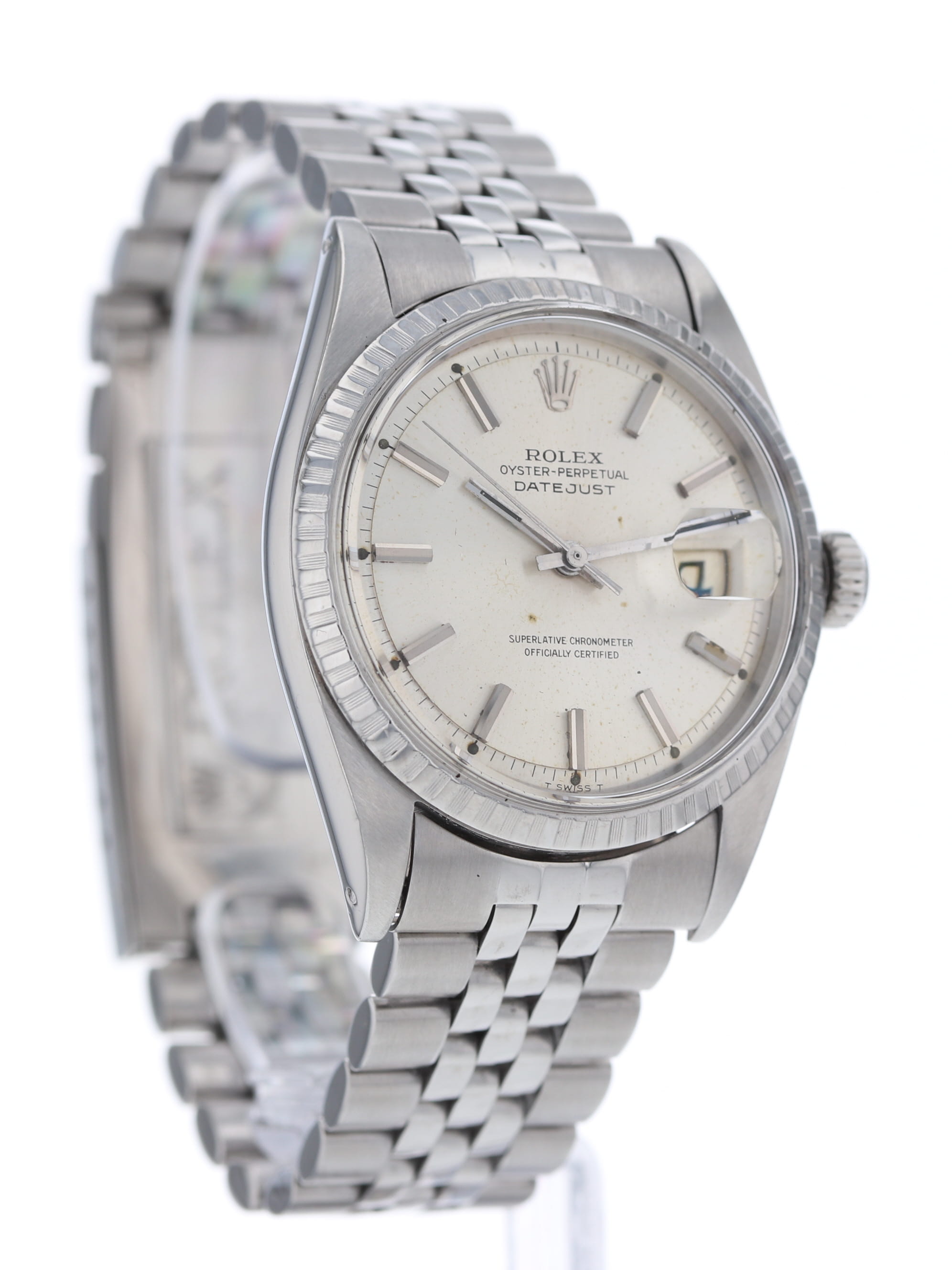 Rolex vintage stainless steel Datejust, automatic, size 36mm. Rolex reference 1603 with a stainless steel case, engine turn bezel and riveted Jubilee brafcelet. Silver stick pie-pan dial, magnified date display, acrylic crystal. 1.2 million serial, circa 1966. Six months full warranty.