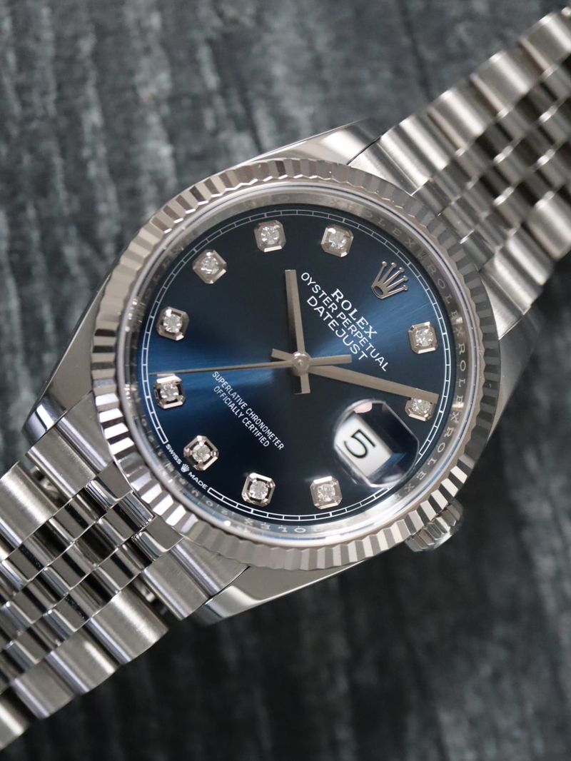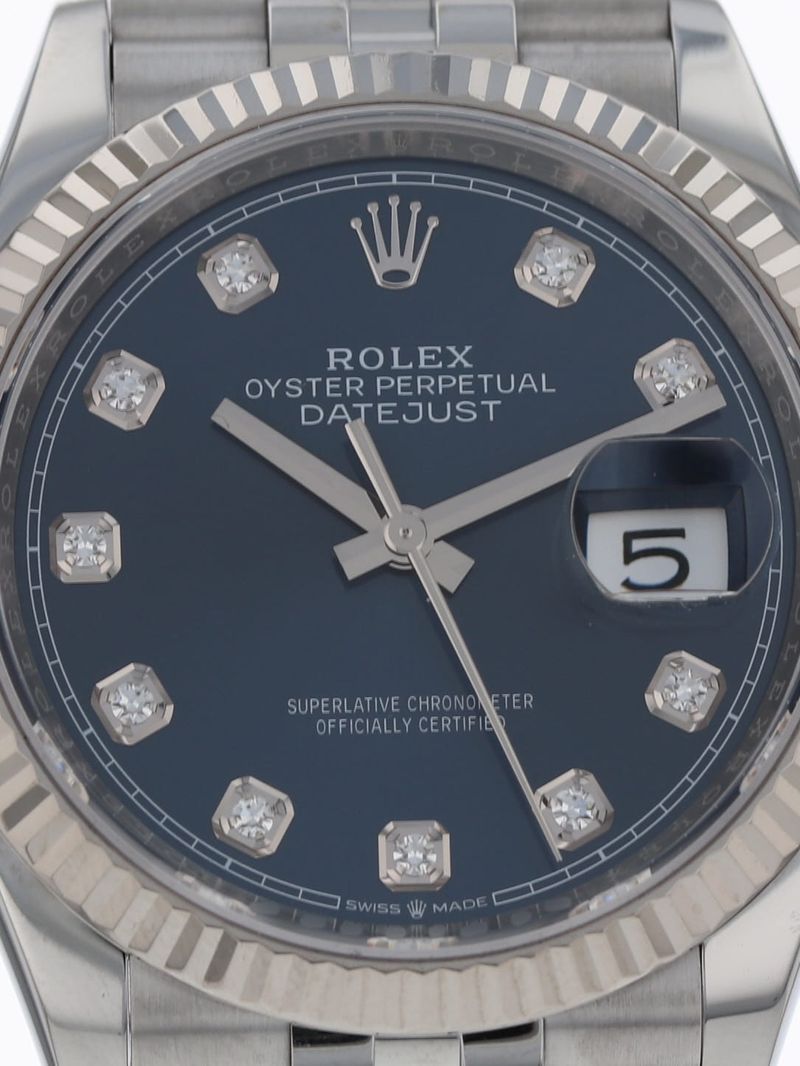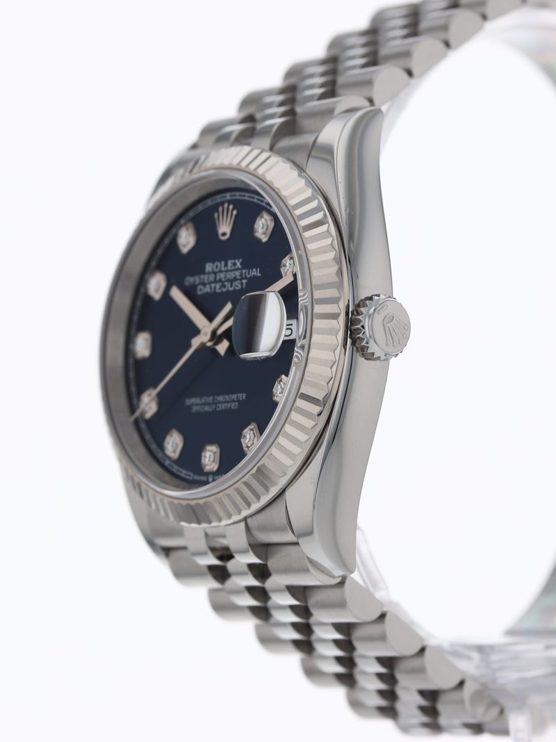 Rolex stainless Datejust 36, automatic, size 36mm. Rolex reference 126234 with a stainless steel case and Jubilee bracelet, 18k white gold fluted bezel, blue diamond dial, magnified date display, sapphire crystal. Rolex box and 2024 card. Four year full warranty.