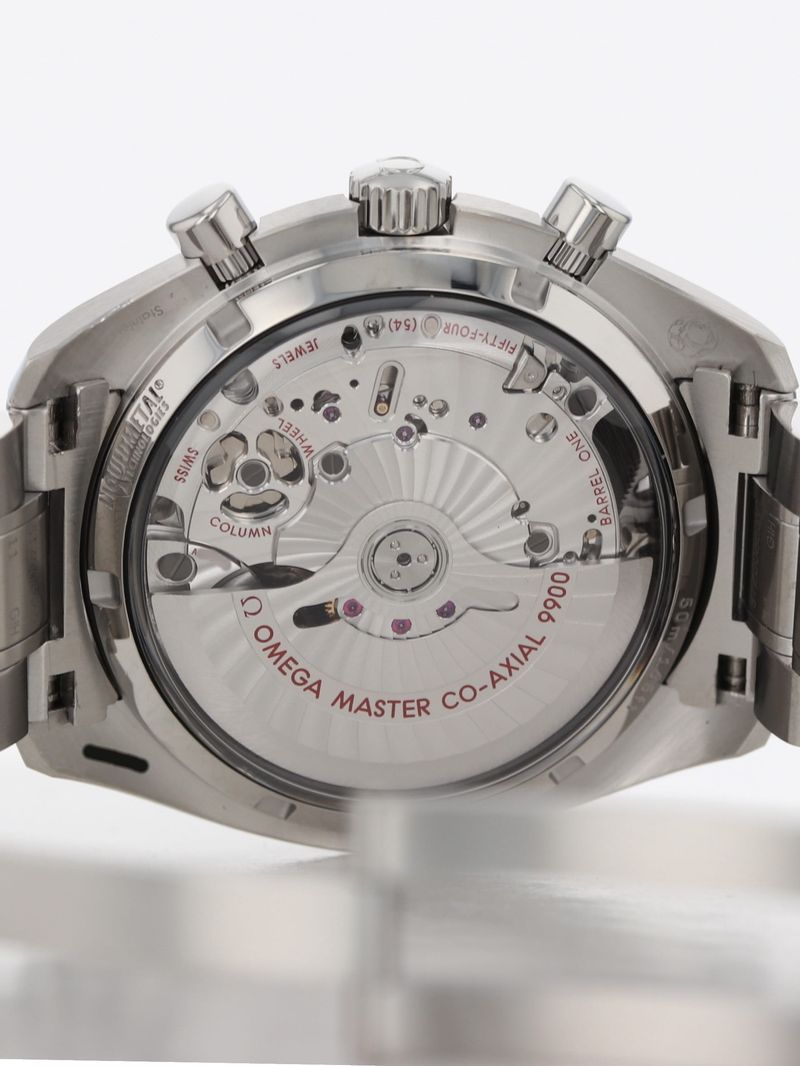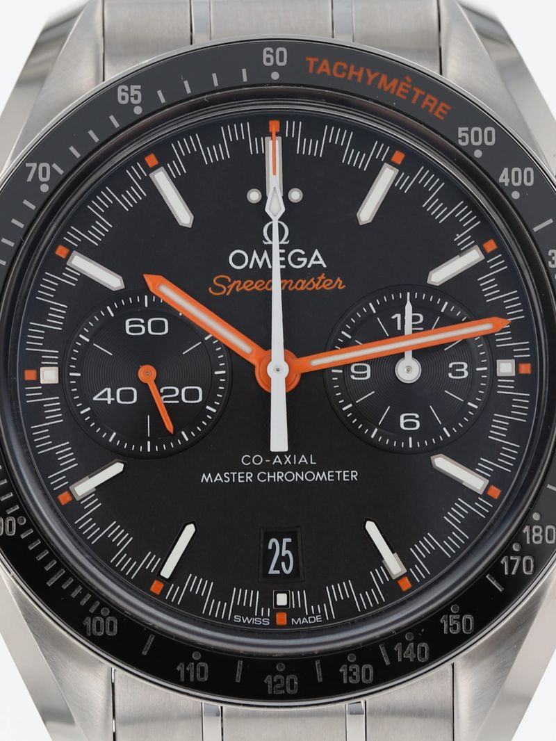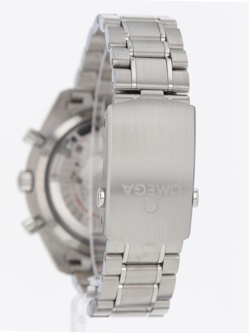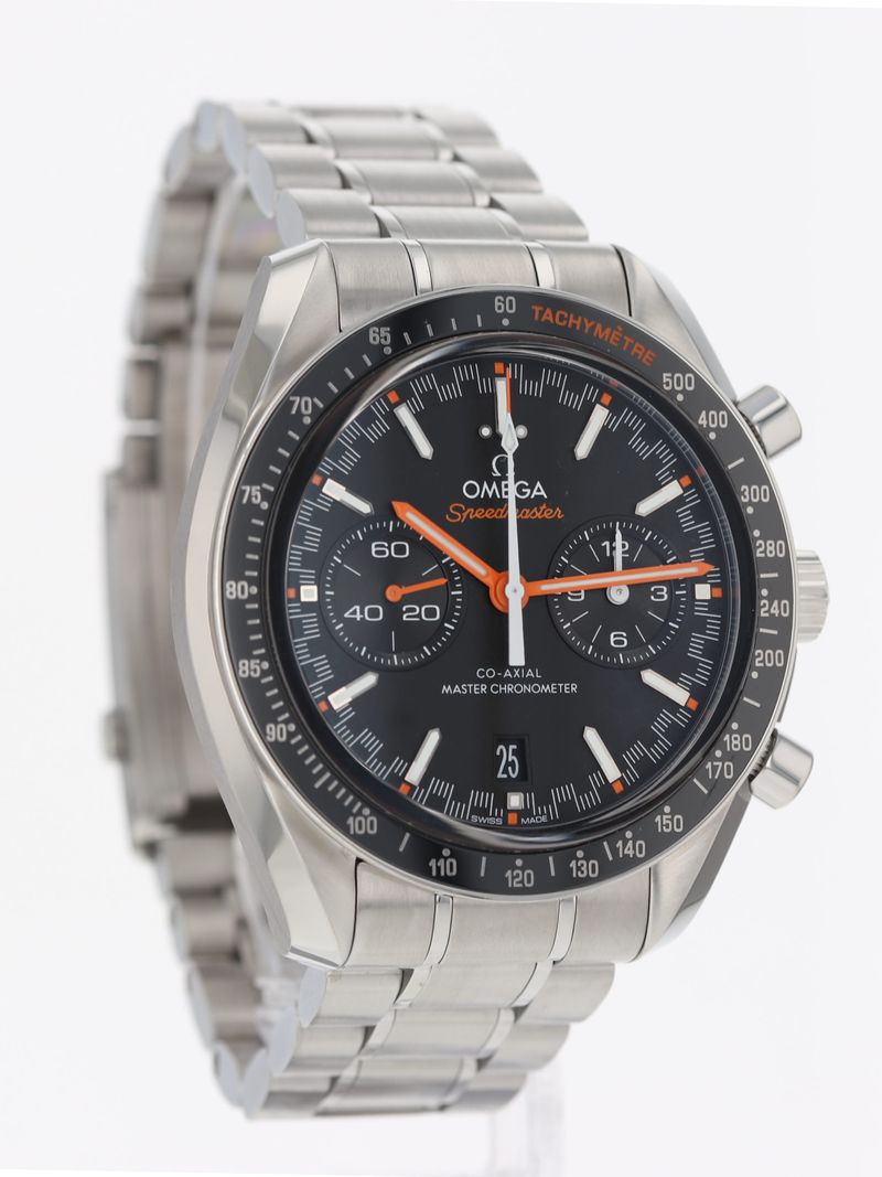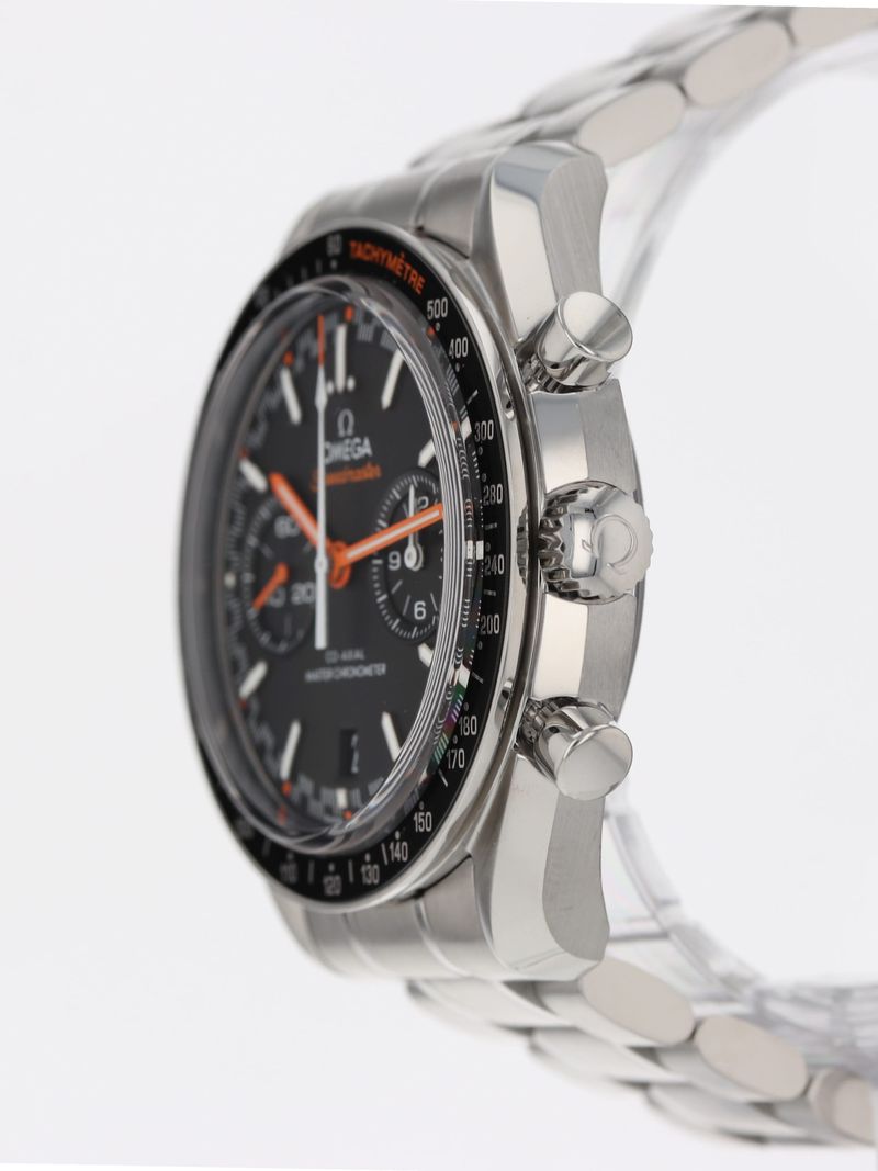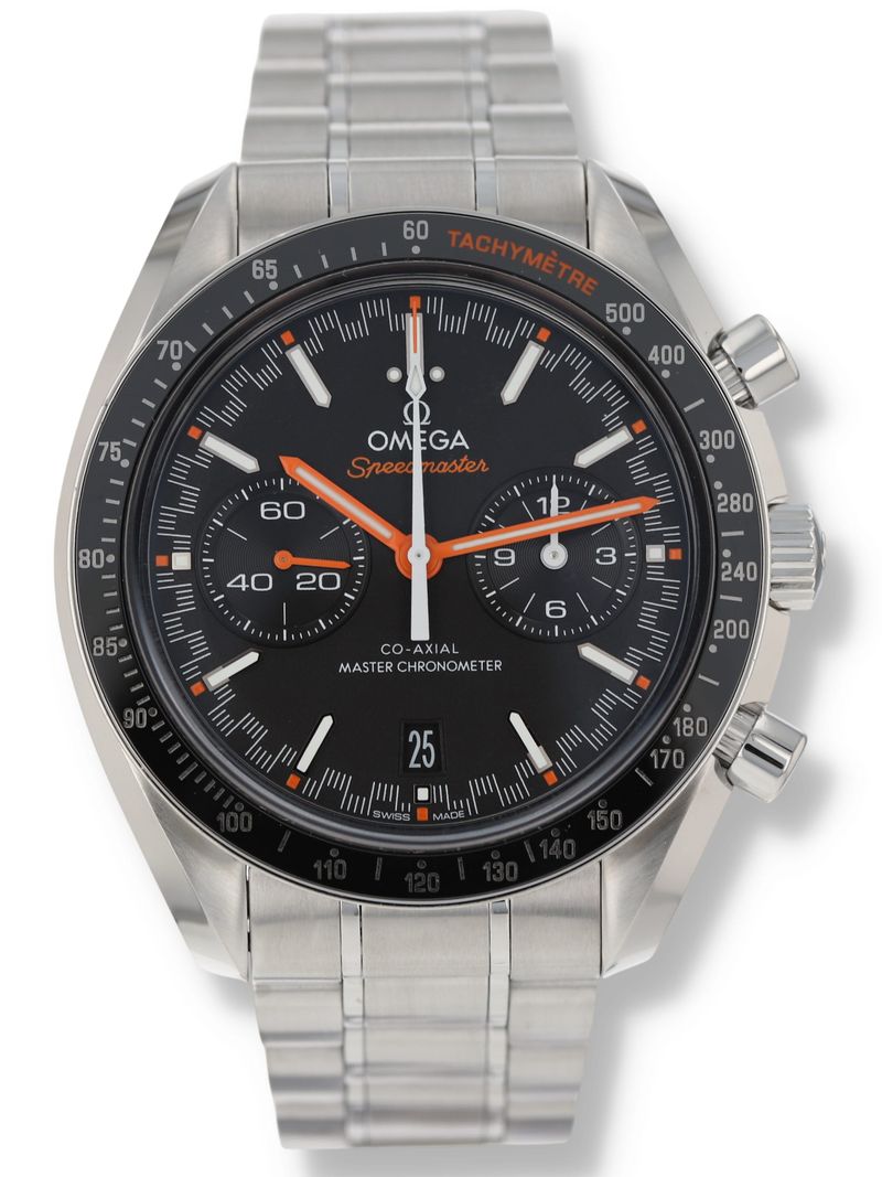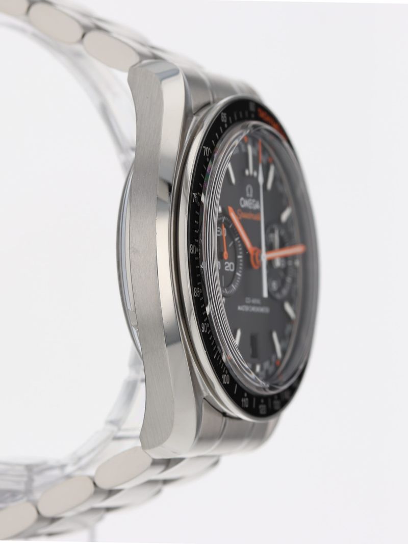 Omega stainless steel Speedmaster Racing Chronograph, automatic, size 44.25mm. Omega ref. 329.30.44.51.01.002 with a stainless steel case and bracelet, matte black racing dial, black tachymetre bezel, date display, exhibition case back, sapphire crystal, chronograph. Omega box List Price $10,800. One year full warranty.