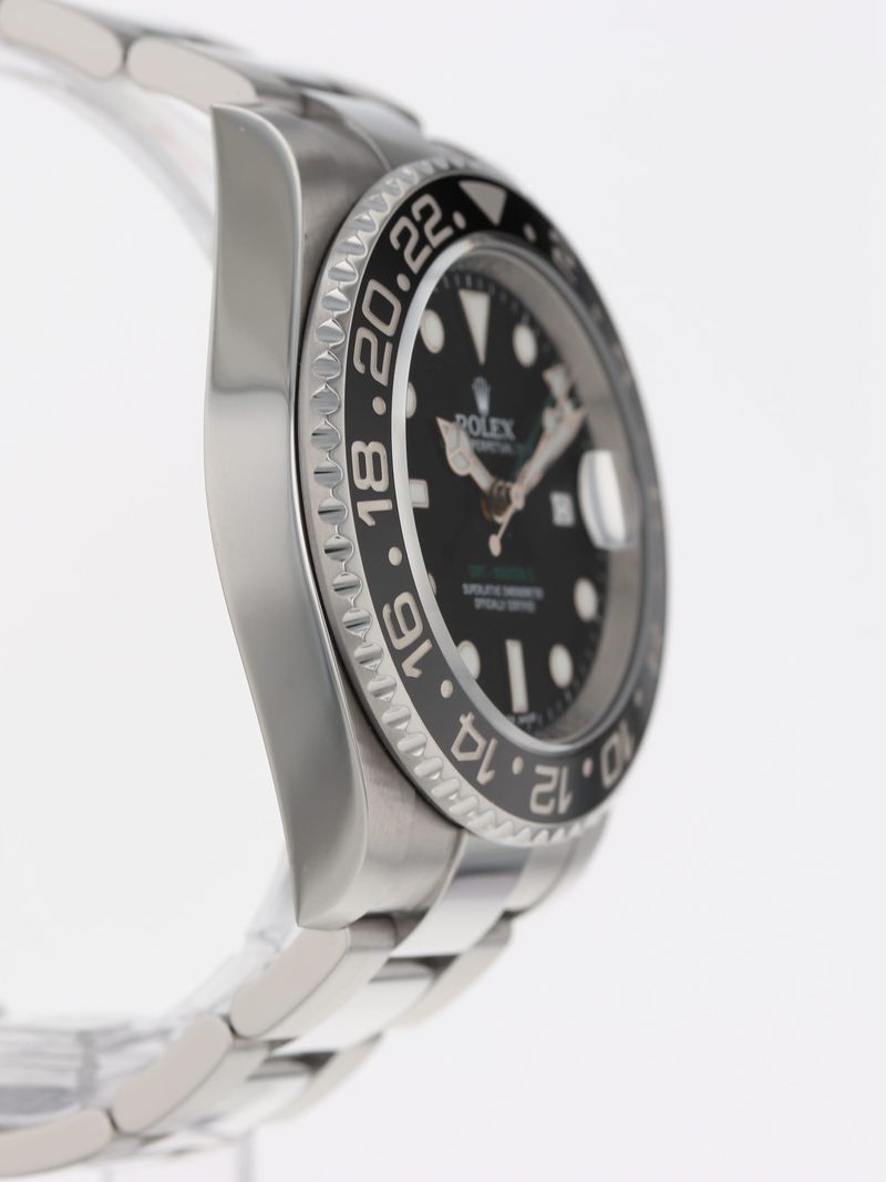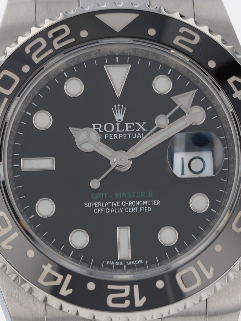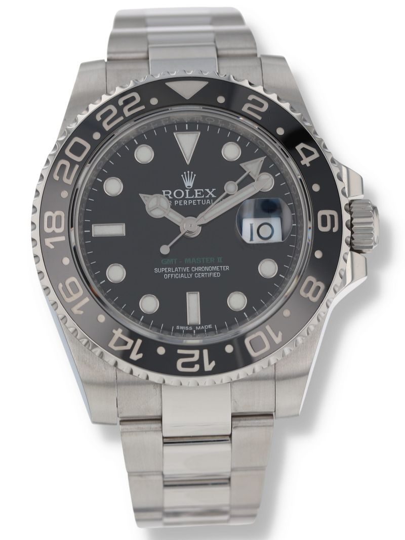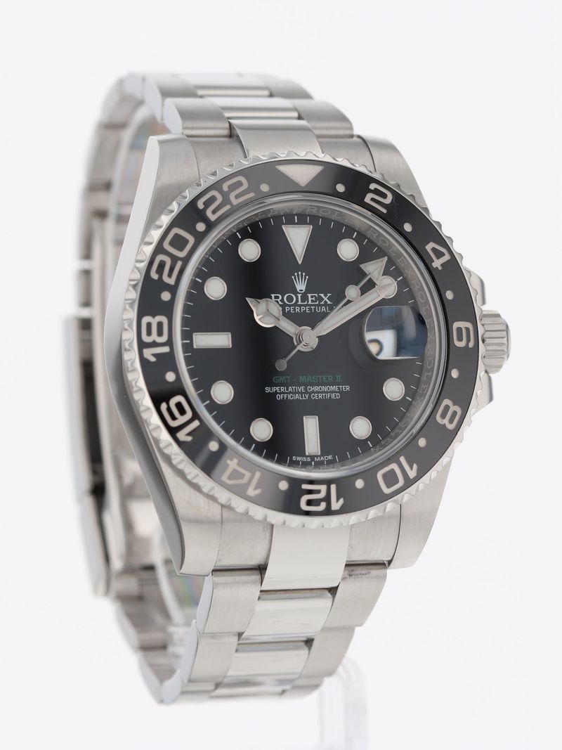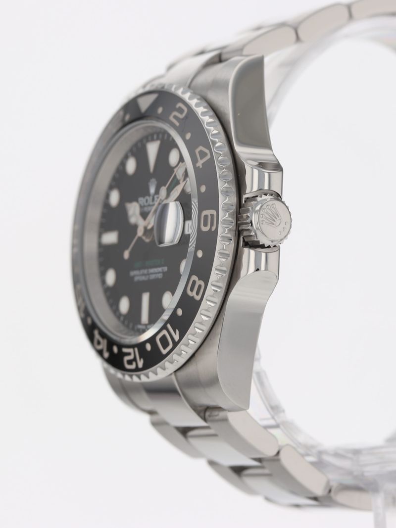 Rolex stainless steel GMT-Master II, automatic, size 40mm. Rolex reference 116710LN with a stainless steel case and Oyster bracelet with folding Oysterlock safety clasp and Easylink 5 mm comfort extension link, black Ceramic rotating 24-hour bezel, black index dial, magnified date display, sapphire crystal. Rolex box and 2017 card. One year full warranty.