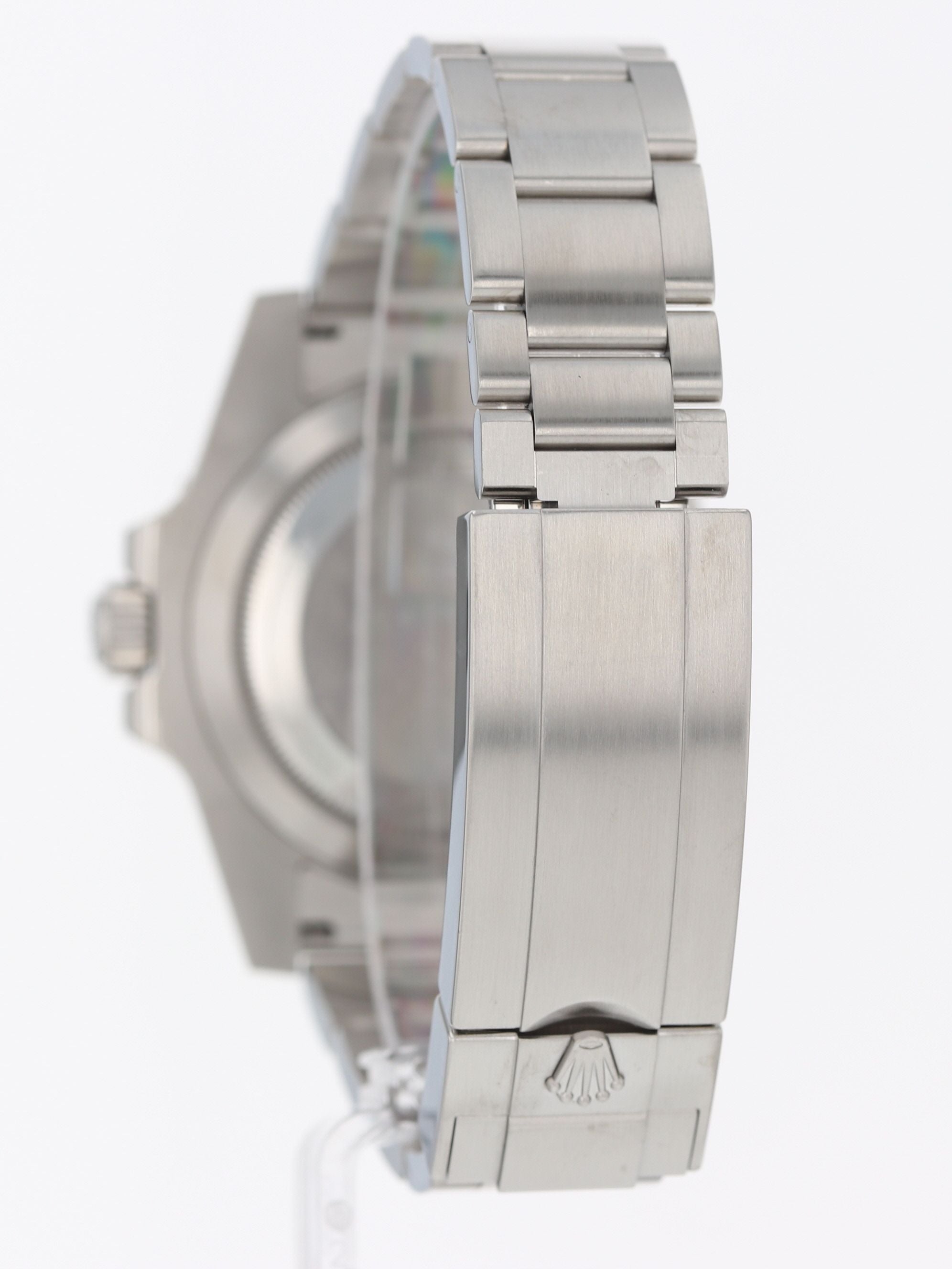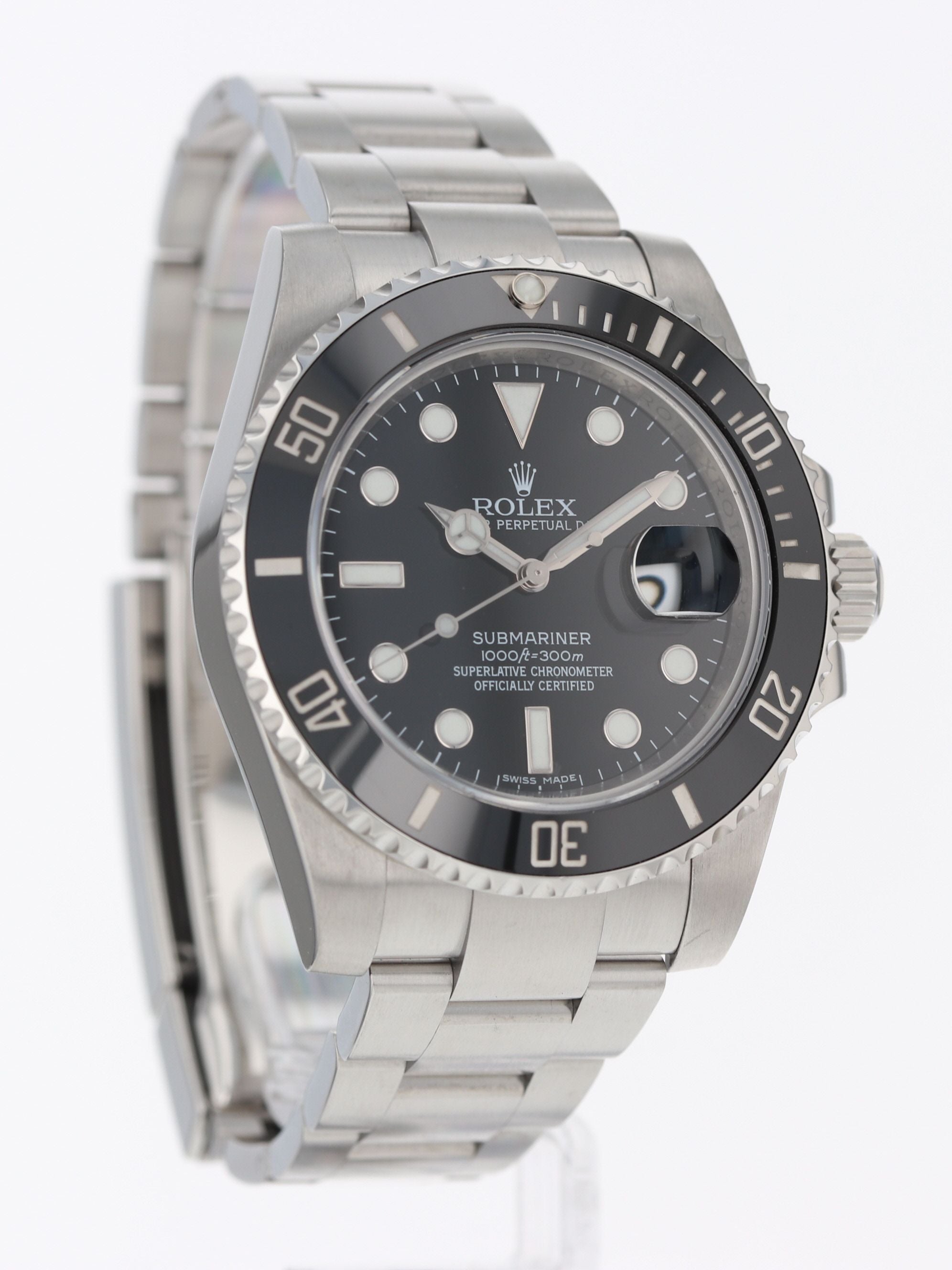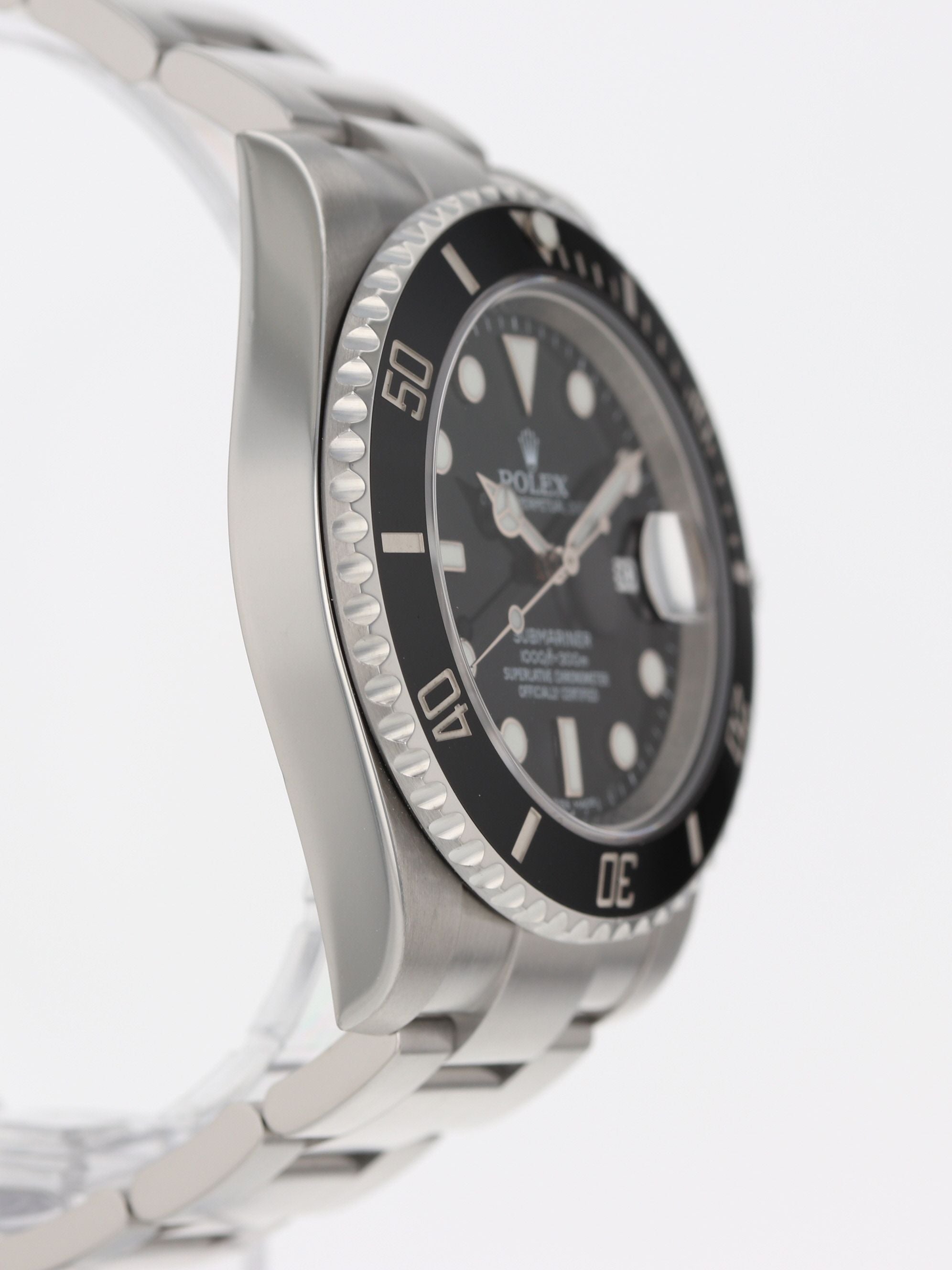 Rolex stainless steel Submariner, automatic, size 40mm. Rolex reference 116610LN with a stainless steel case and Oyster bracelet, Folding Oysterlock safety clasp with Rolex Glidelock extension system black rotating Ceramic bezel, black index dial, luminescent markers and hands, magnified date display, sapphire crystal. Rolex box and 2015 card. One year full warranty.