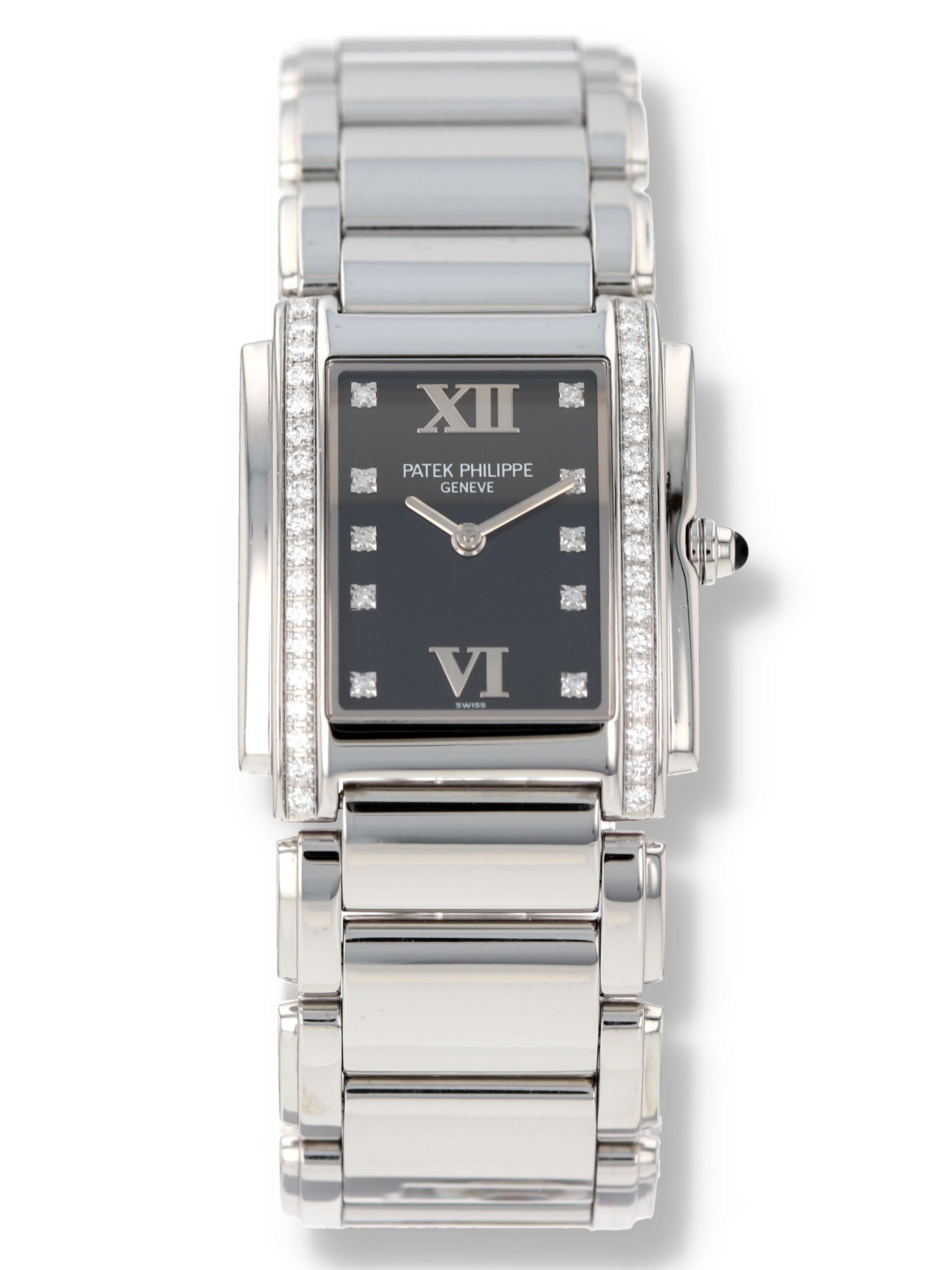 Patek Philippe stainless steel ladies Twenty-4, quartz, size 25mm x 30mm. Patek Reference 4910/10A-001 with a stainless steel case set with 36 diamonds ( 0.45 ct.), stainless steel bracelet. Black diamond dial, sapphire crystal, crown set with onyx. One year full warranty.