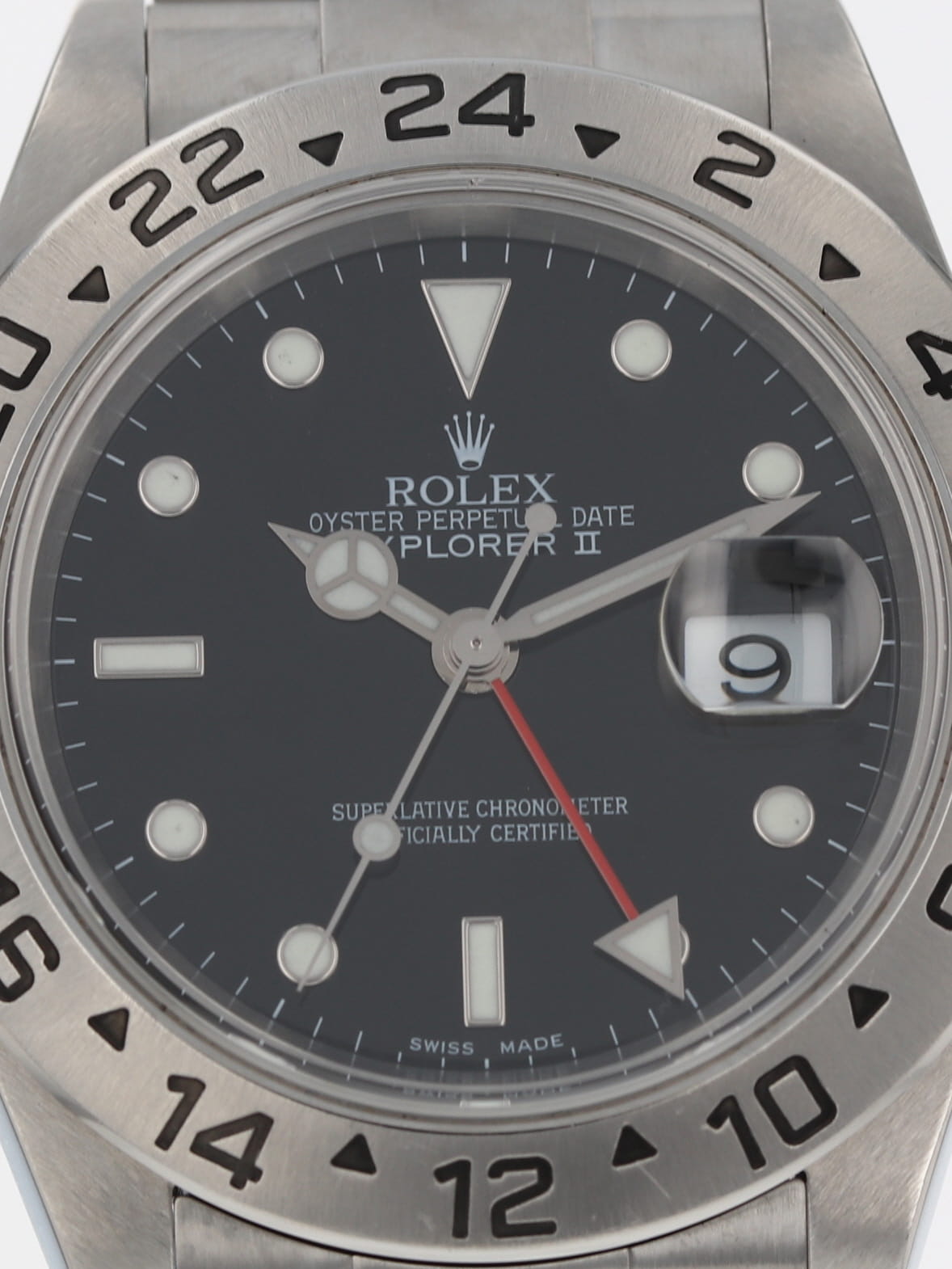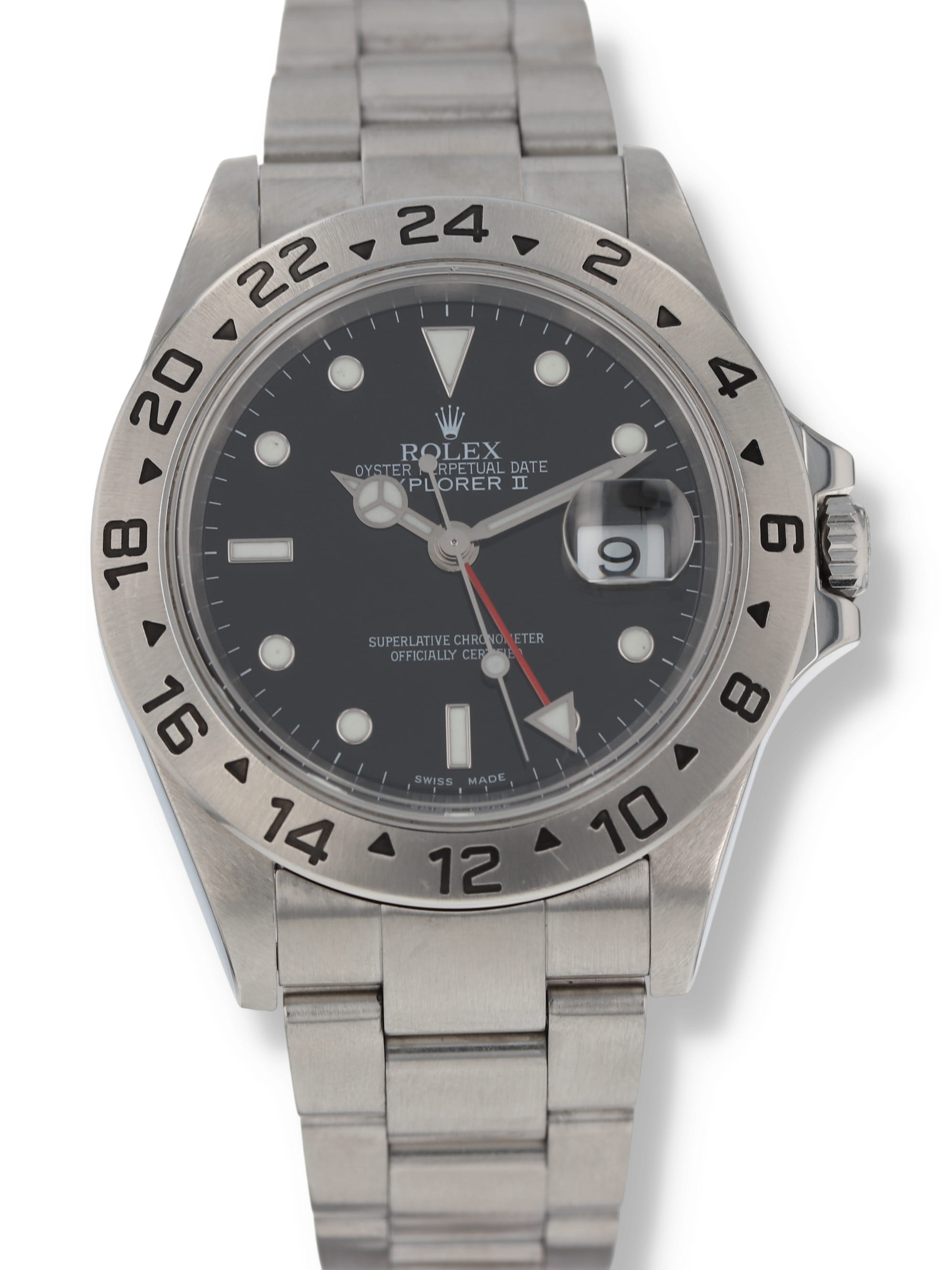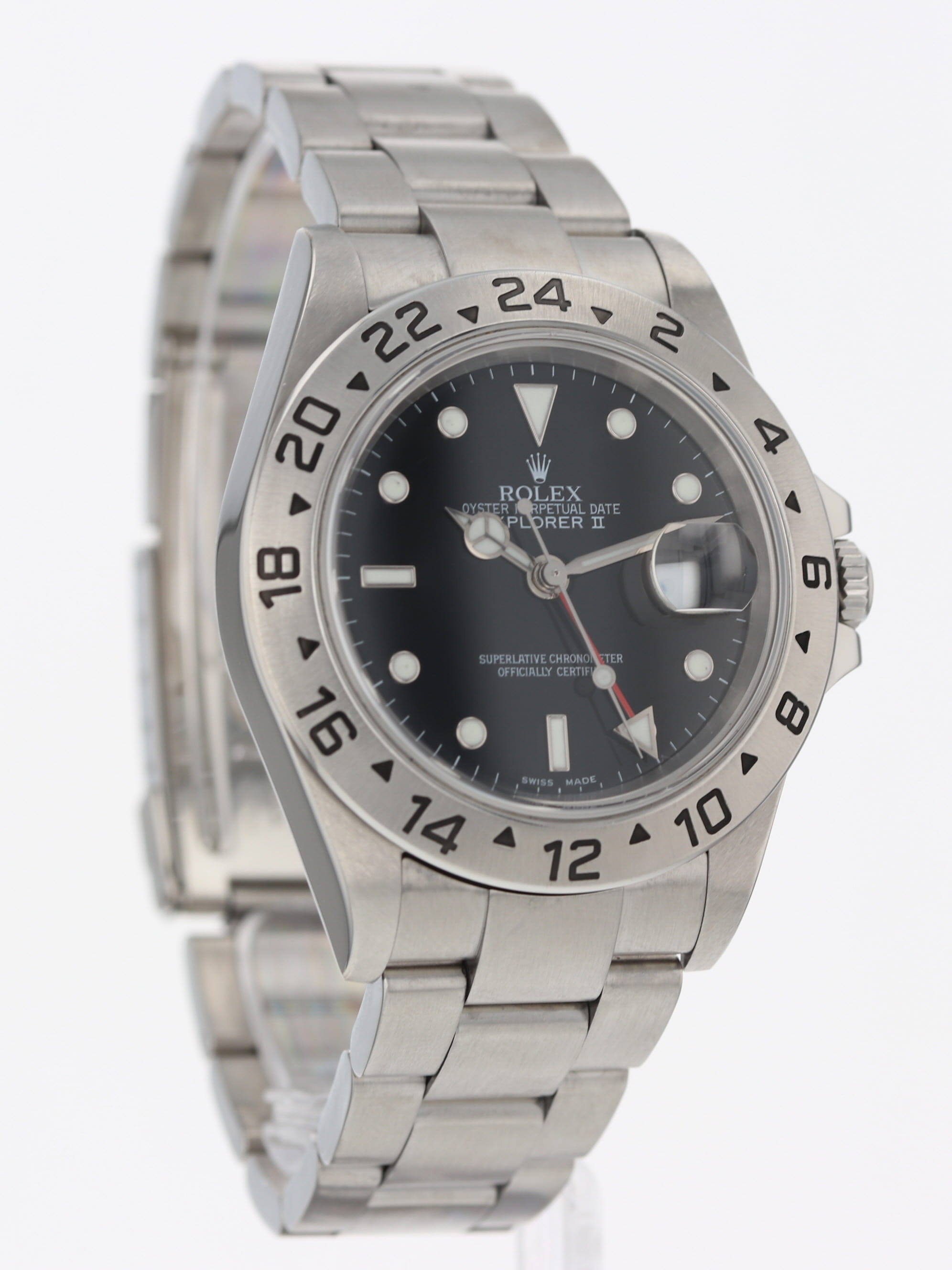 Rolex stainless steel Explorer II, automatic, size 40mm. Rolex reference 16570 with a stainless steel case and Oyster bracelet, black "Swiss Made" index dial, 24-hour engraved fixed bezel, luminescent markers and hands, magnified date display, sapphire crystal. "F" serial. Rolex box and paper dated 2006. One year full warranty.