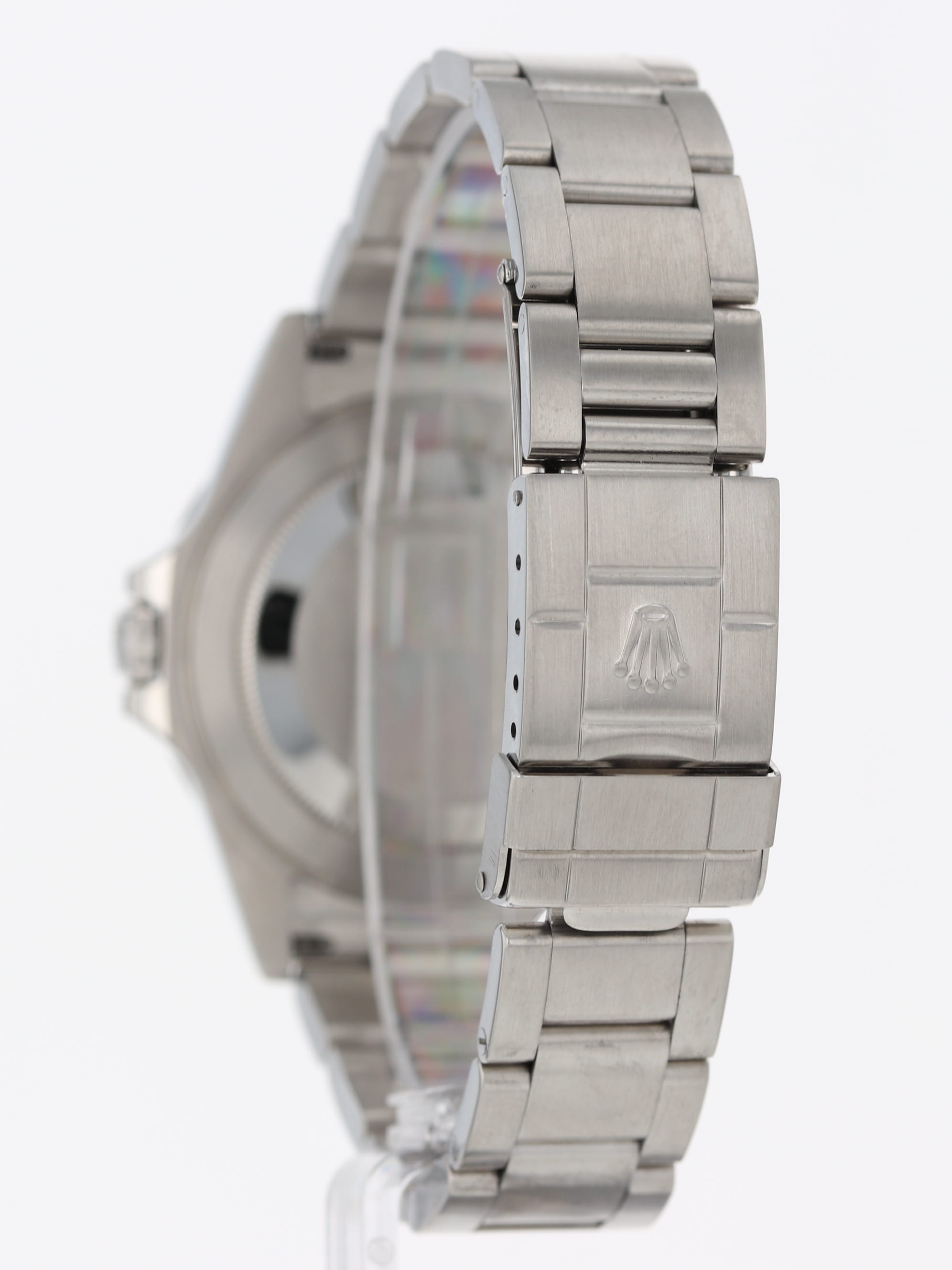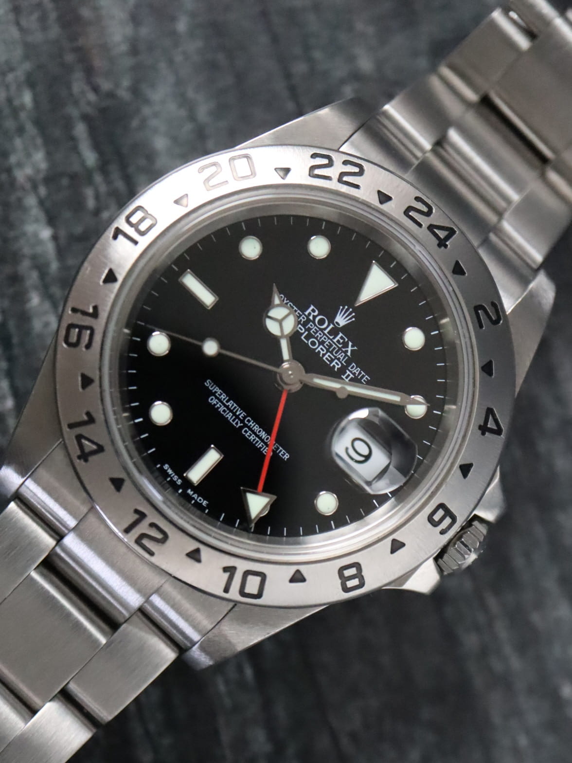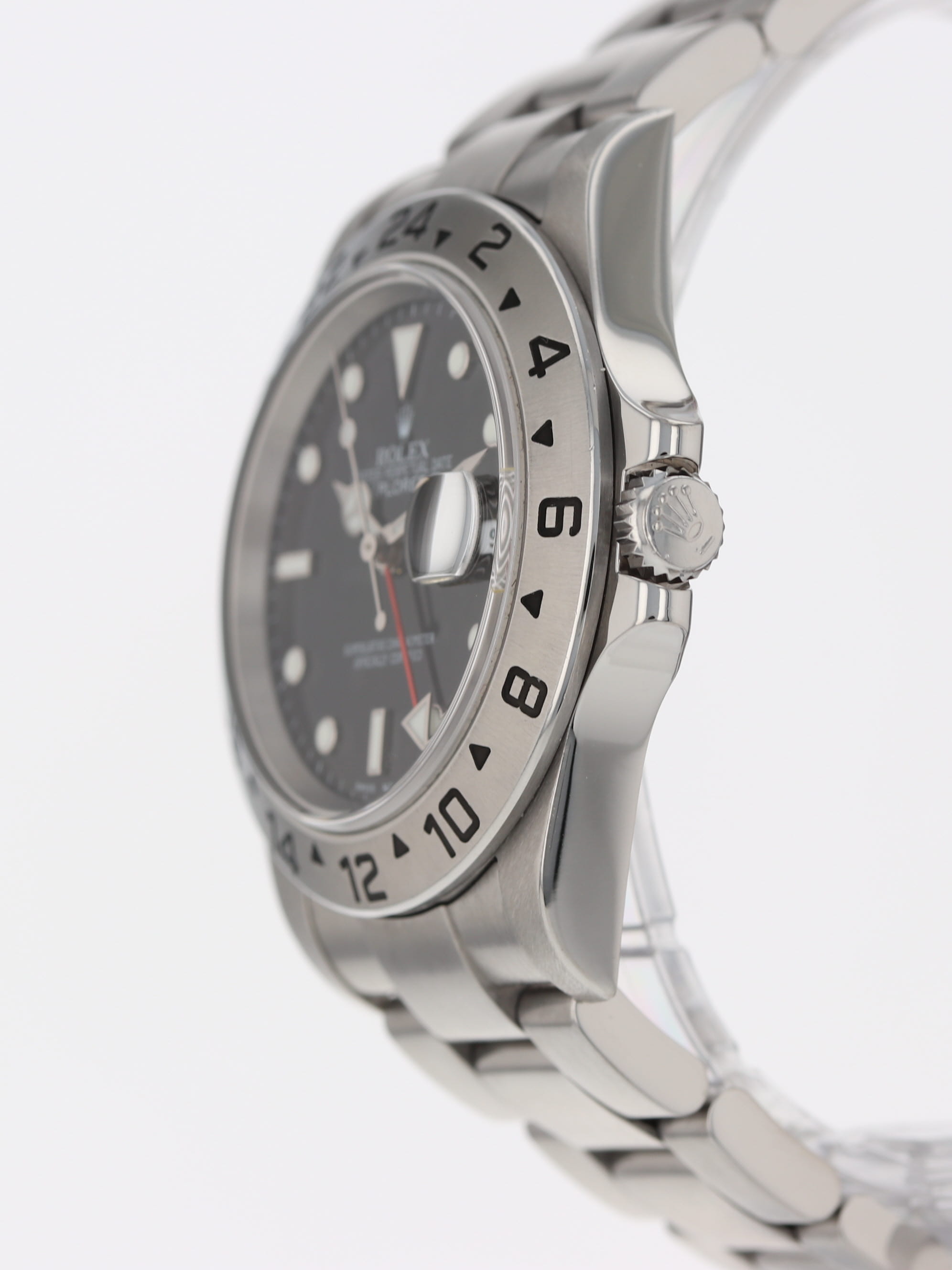 Rolex stainless steel Explorer II, automatic, size 40mm. Rolex reference 16570 with a stainless steel case and Oyster bracelet, black "Swiss Made" index dial, 24-hour engraved fixed bezel, luminescent markers and hands, magnified date display, sapphire crystal. "F" serial. Rolex box and paper dated 2006. One year full warranty.
