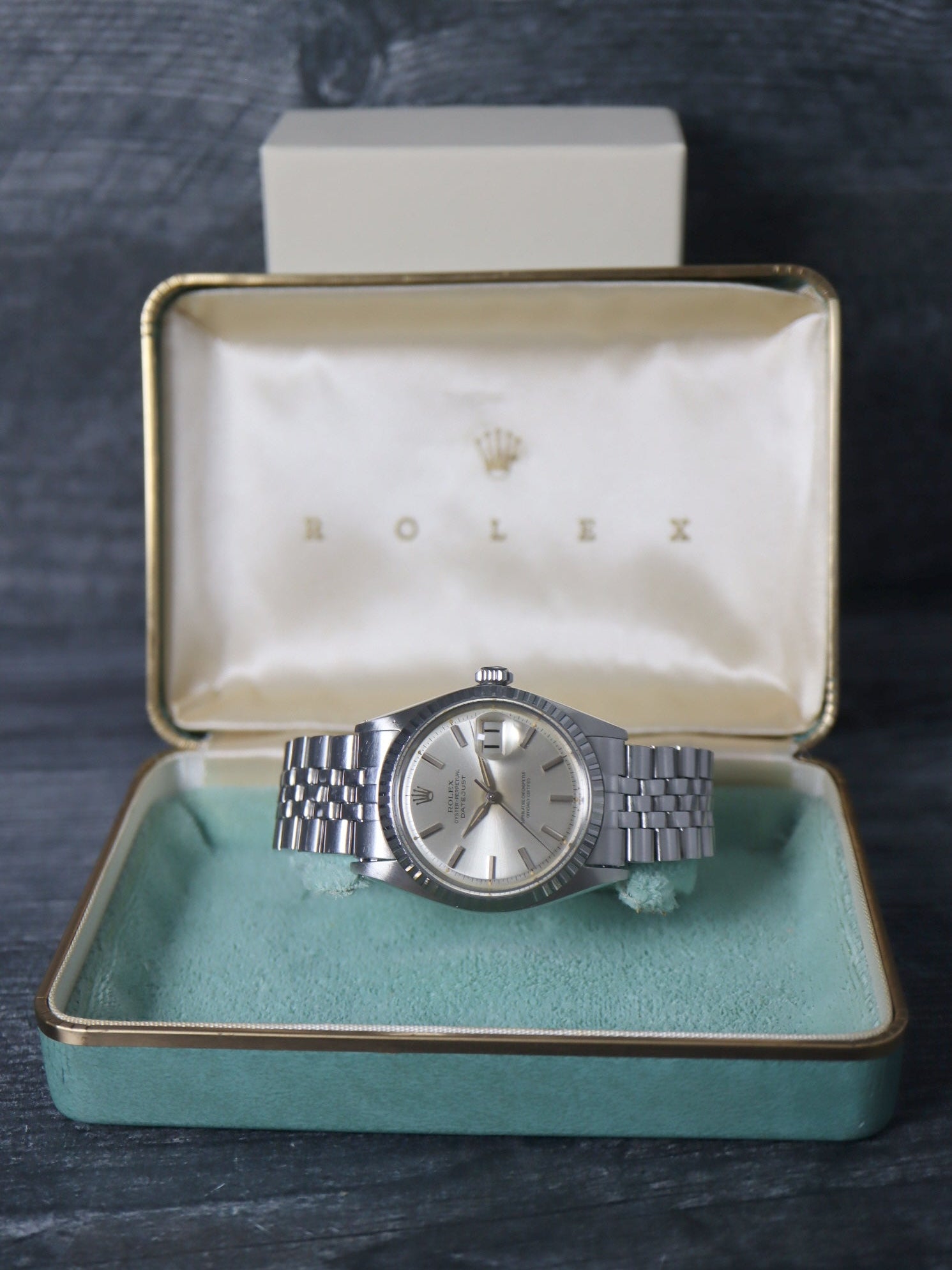 Rolex stainless steel vintage Datejust, automatic, size 36mm. Rolex reference 1603/0 with a stainless steel case and riveted Jubilee bracelet, silver stick dial, engine turn bezel, magnified date display, acrylic crystal. Original vintage Rolex box and factory service card valid until June 2027. Circa 1965.
