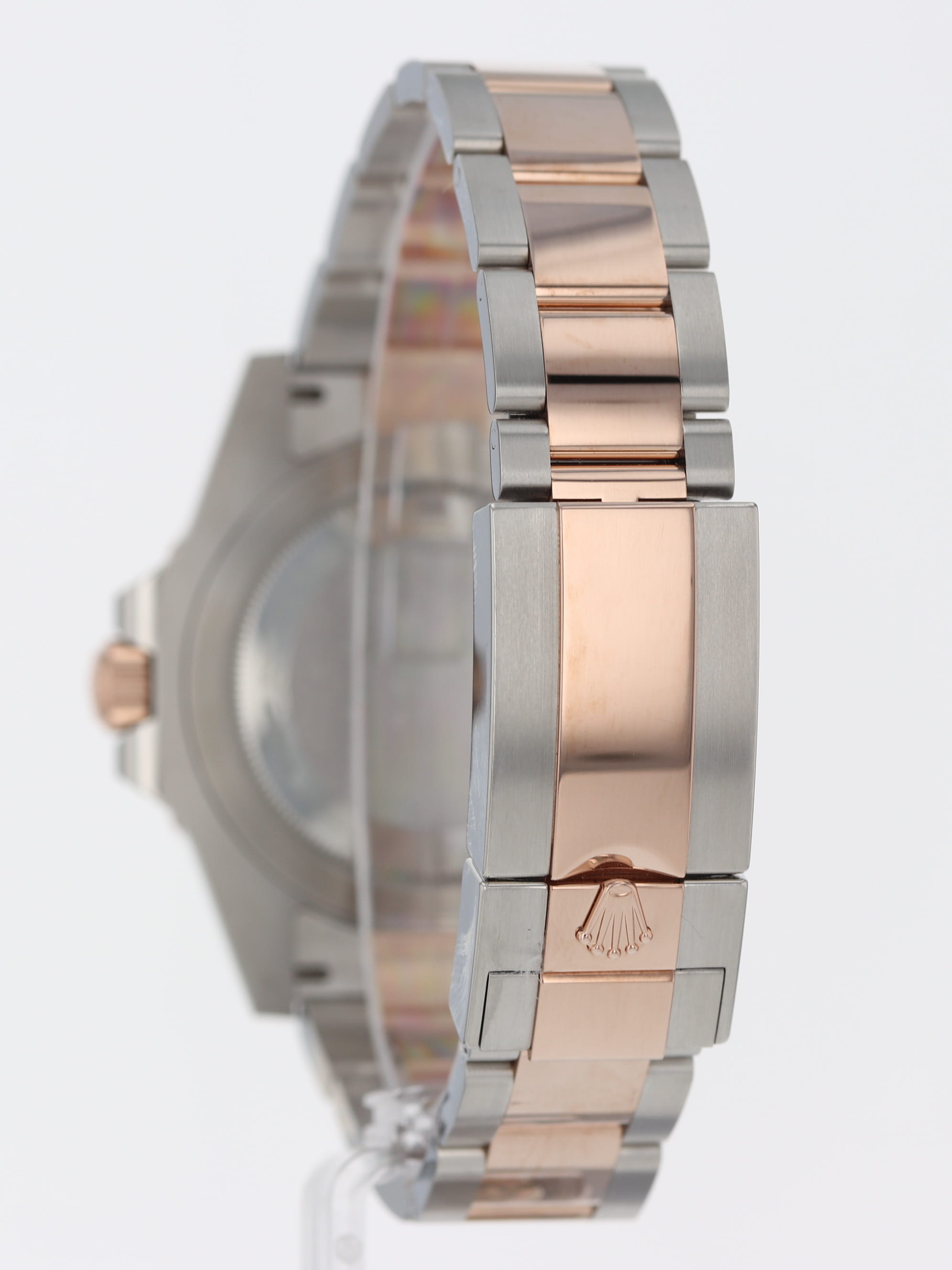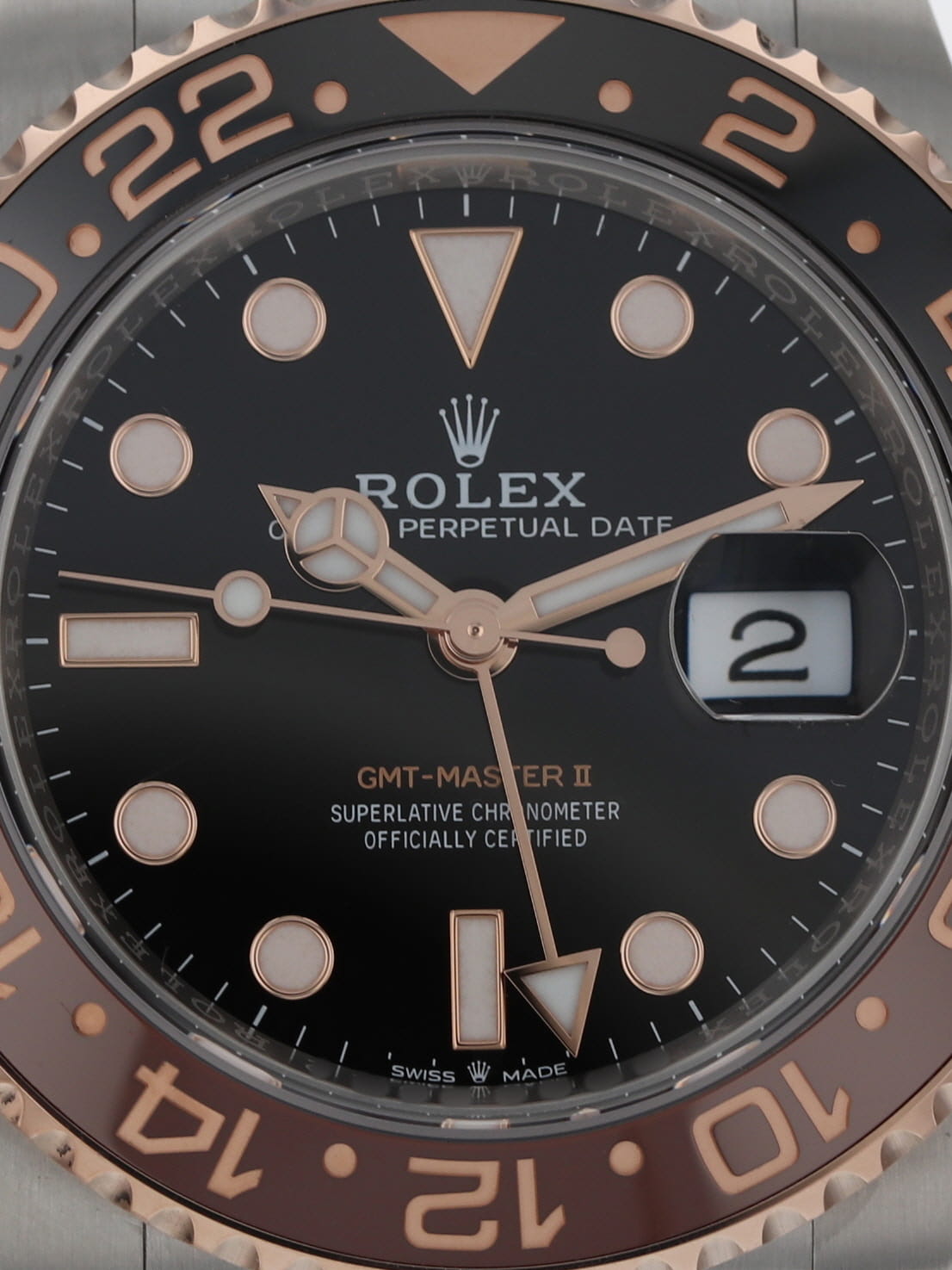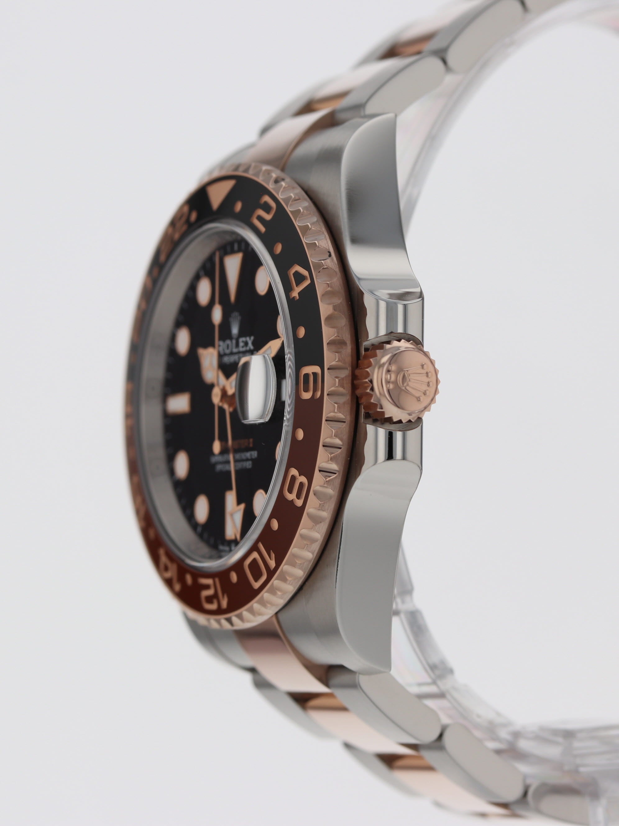 Rolex stainless steel and 18k rose gold GMT-Master II, automatic, size 40mm. Rolex ref. 126711CHNR with a stainless steel case, two tone Oyster bracelet, "Root Beer" ceramic 24-hour bezel, black index dial, magnified date display, luminescent markers and hands, independent GMT hand, sapphire crystal. Rolex box and 2023 card. Three year full warranty.