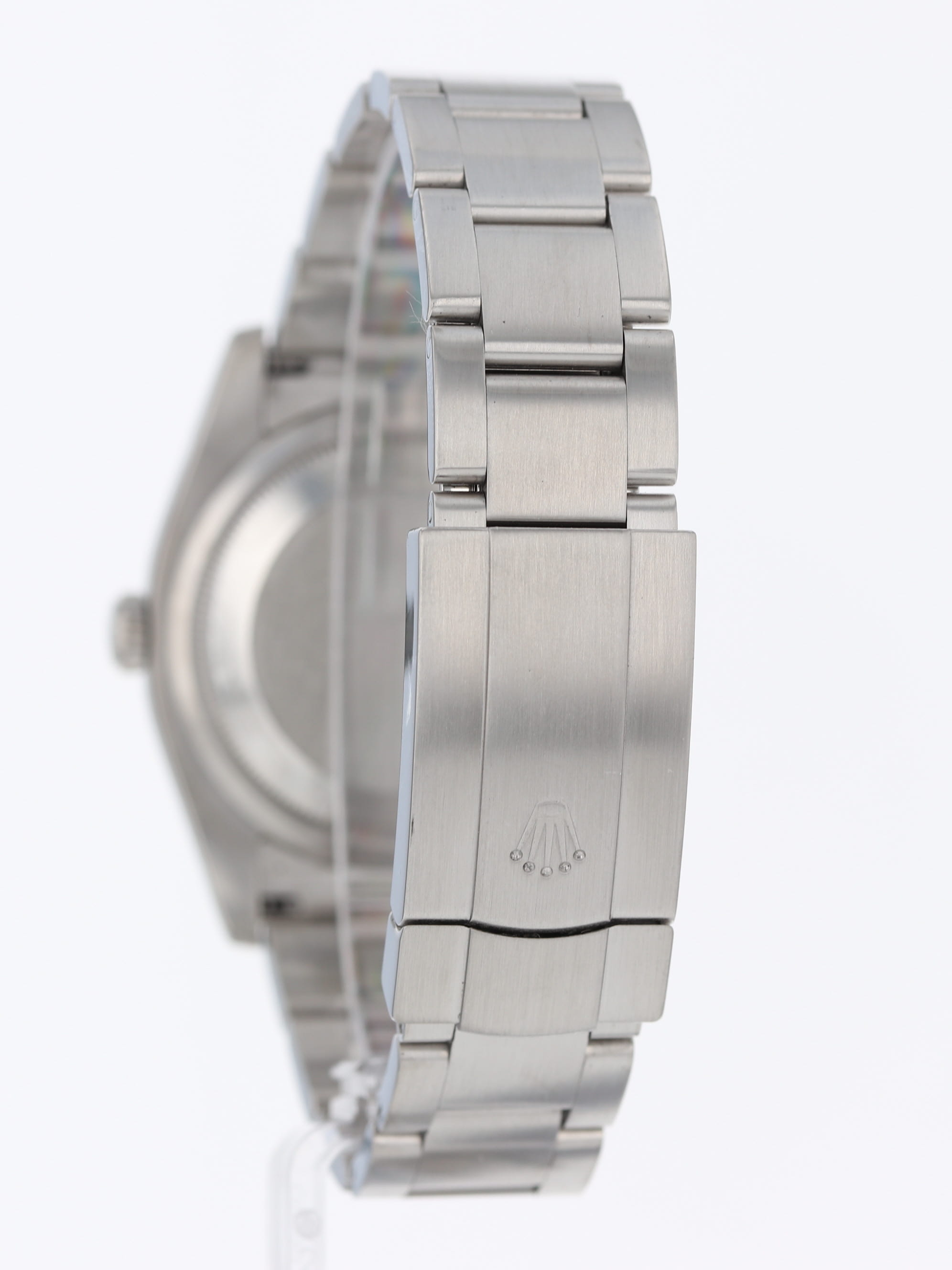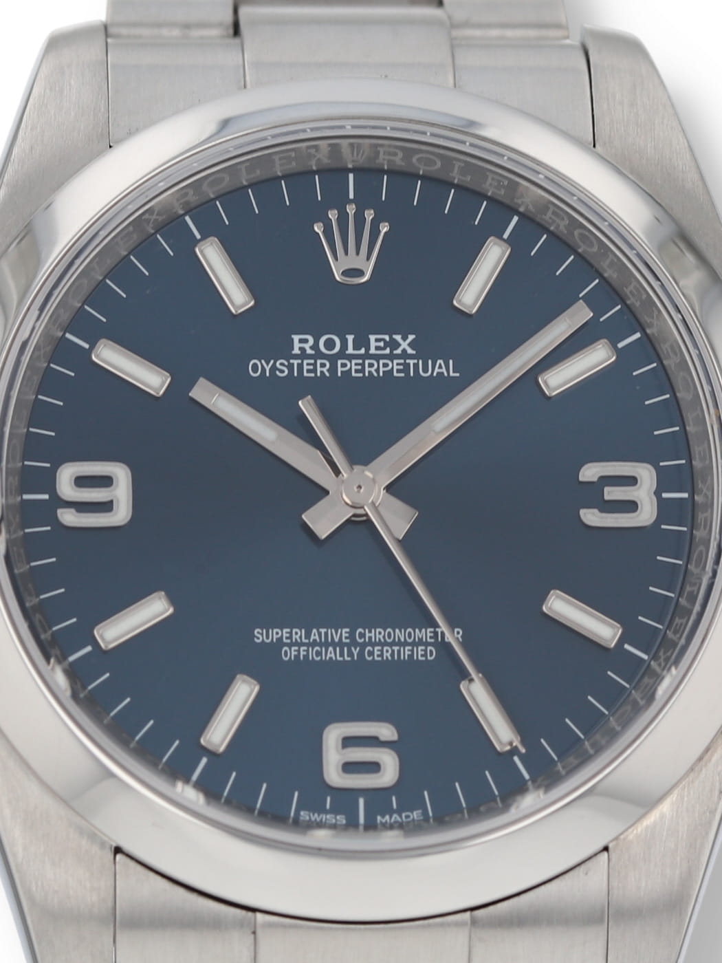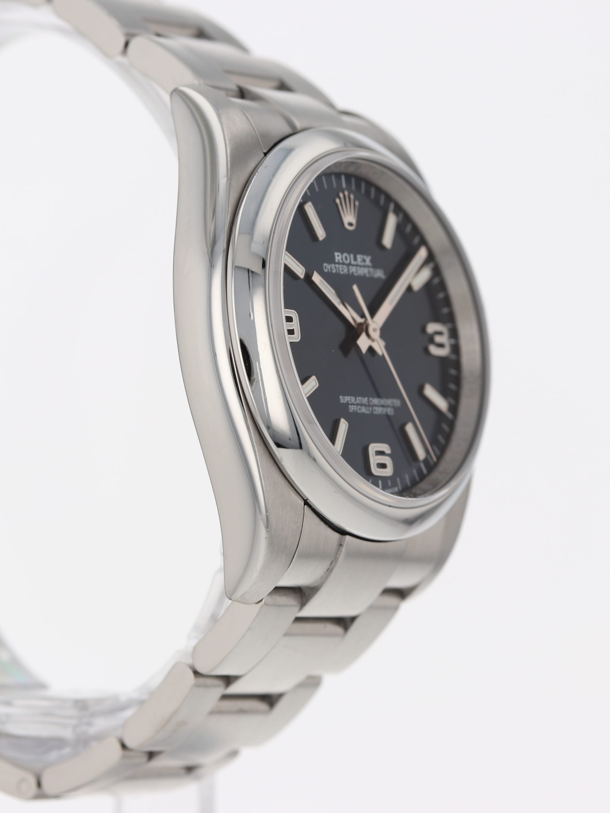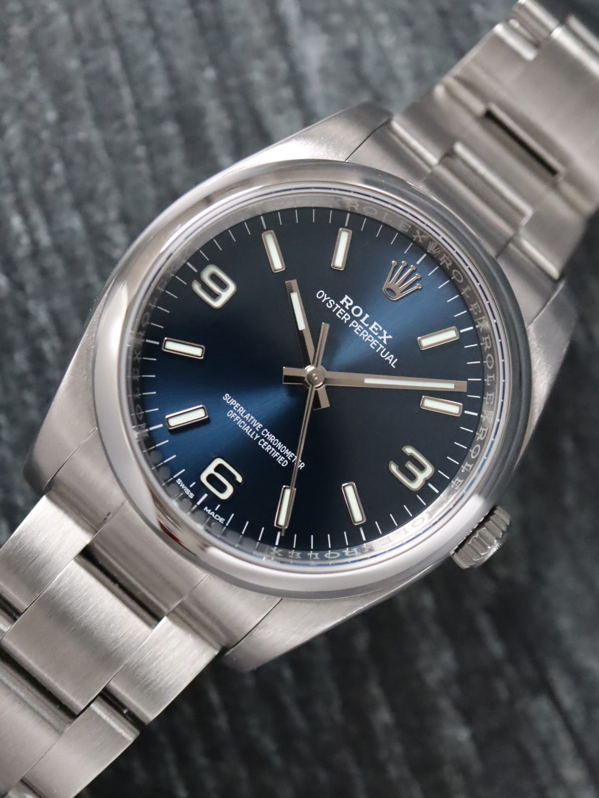Rolex stainless steel Oyster Perpetual 36, automatic, size 36mm. Rolex reference 116000 with a stainless steel case and Oyster bracelet, smooth bezel, blue Arabic 3,6,9 dial, luminescent markers and hands, sapphire crystal. One year full warranty.