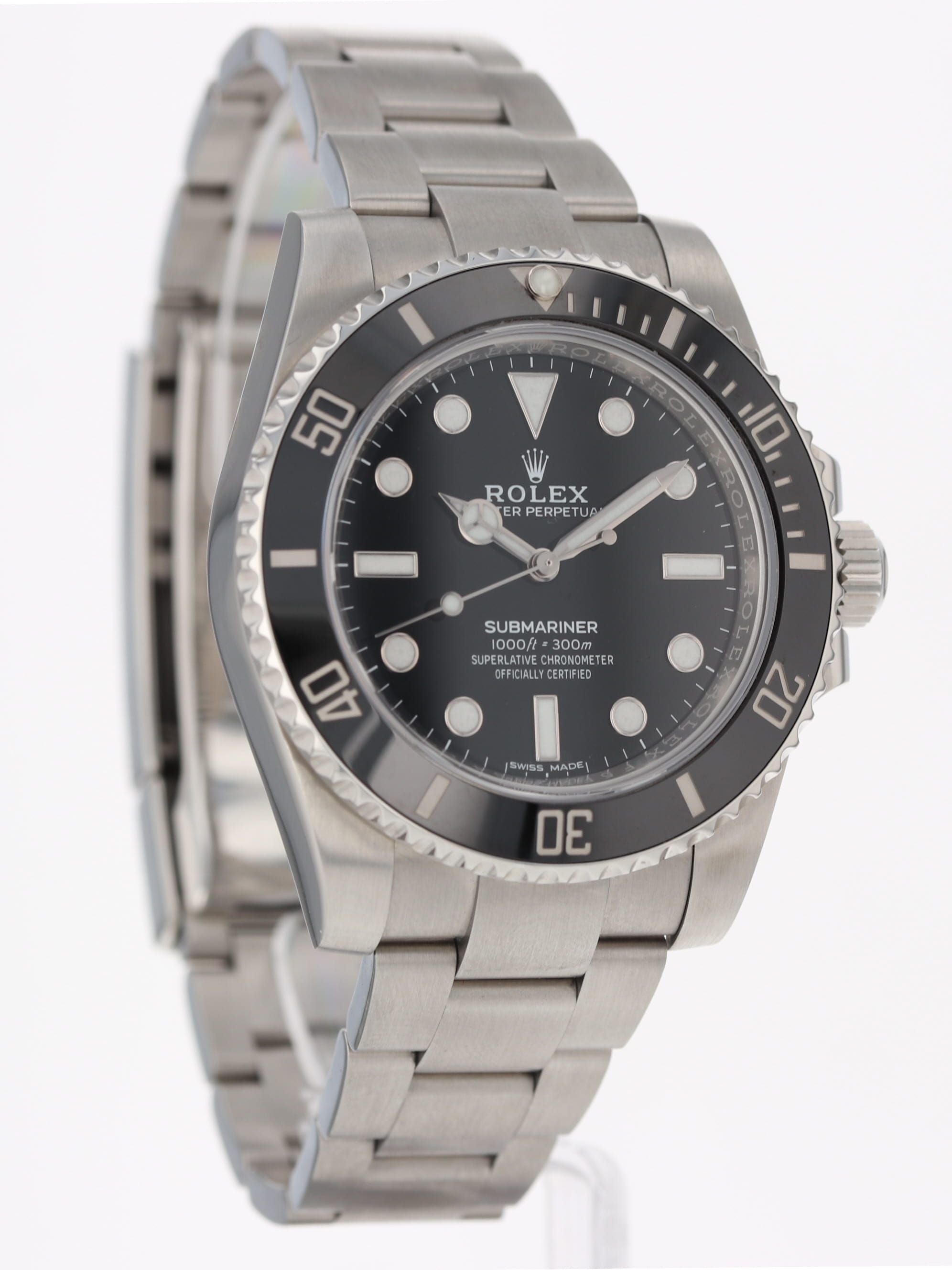 Rolex stainless steel Submariner "No Date", automatic, size 40mm. Rolex reference 114060 with a stainless steel case and Oyster bracelet, Glidelock extension system, black index dial, Chromalight display with long-lasting blue luminescence, black Ceramic unidirectional rotating bezel, sapphire crystal. Rolex box and 2018 card. One year full warranty.