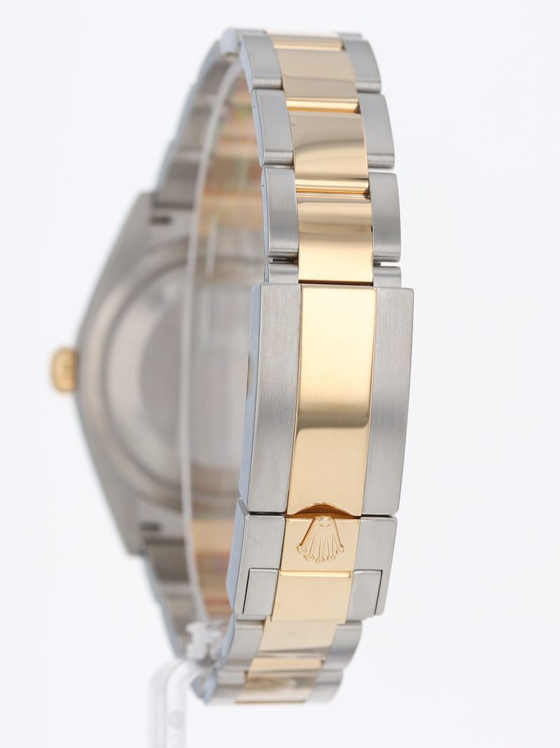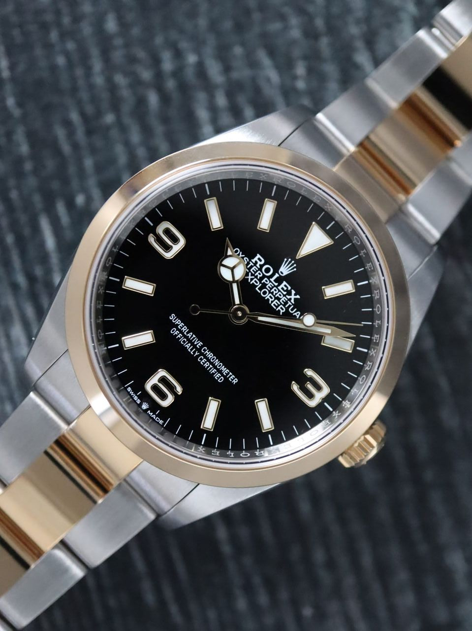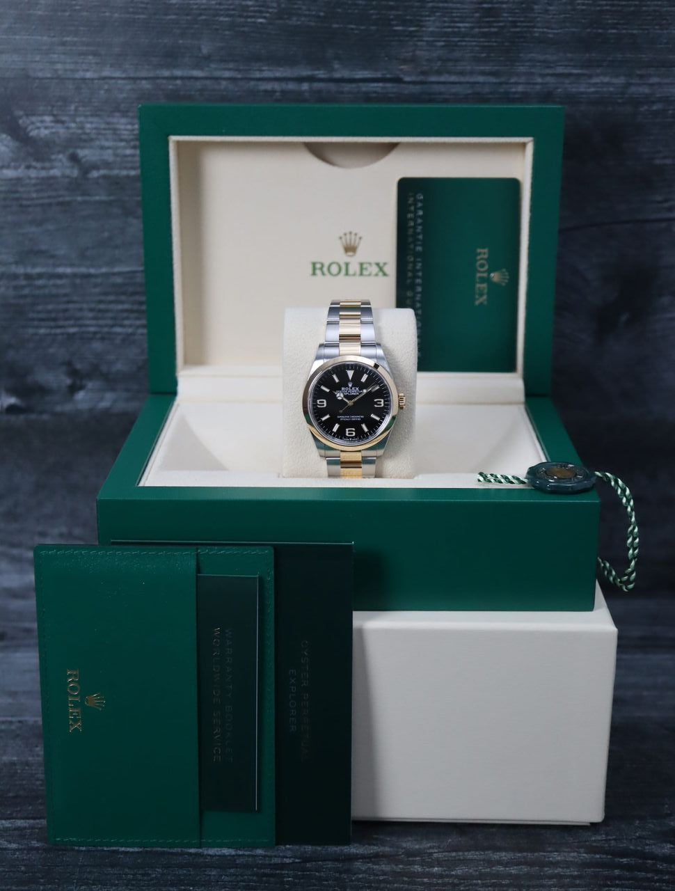 Rolex stainless steel and 18k yellow gold Explorer, automatic, size 36mm. Rolex reference 124273 with a stainless steel case, 18k smooth bezel, two tone Oyster bracelet with Easylink 5mm comfort extension link, black 3, 6, 9 Arabic dial, luminescent markers and hands, sapphire crystal. Rolex box and 2024 card. Four year full warranty.