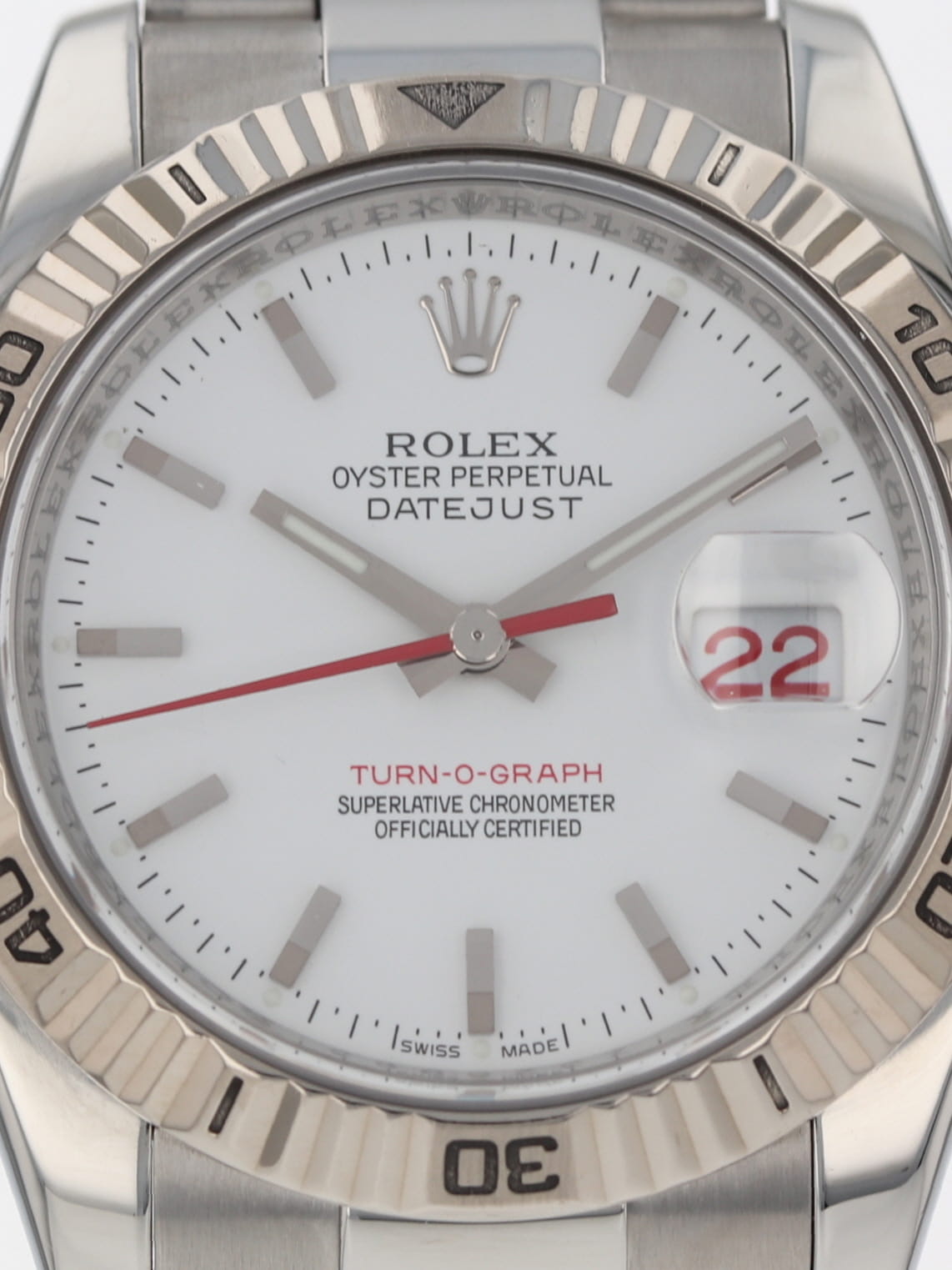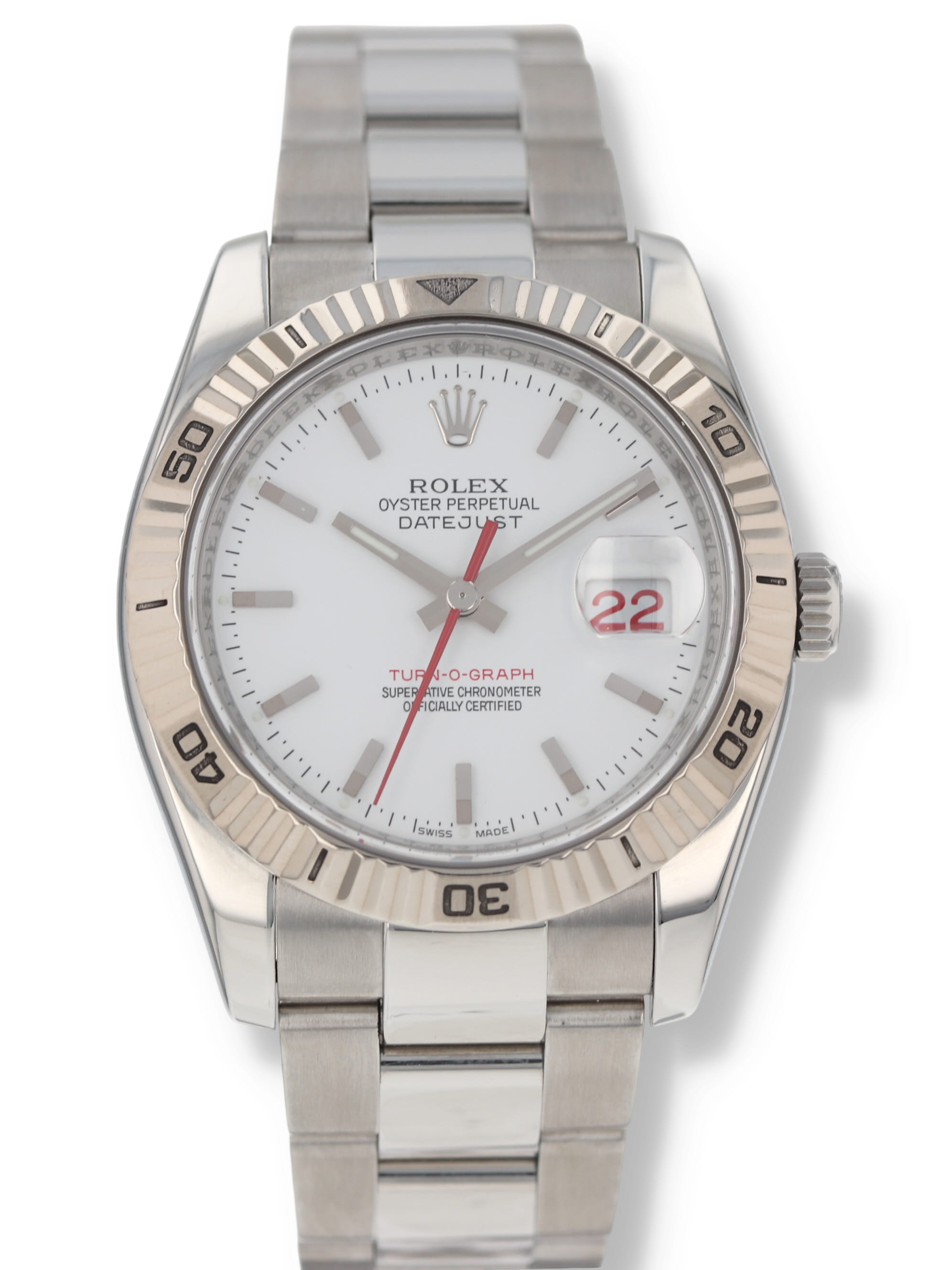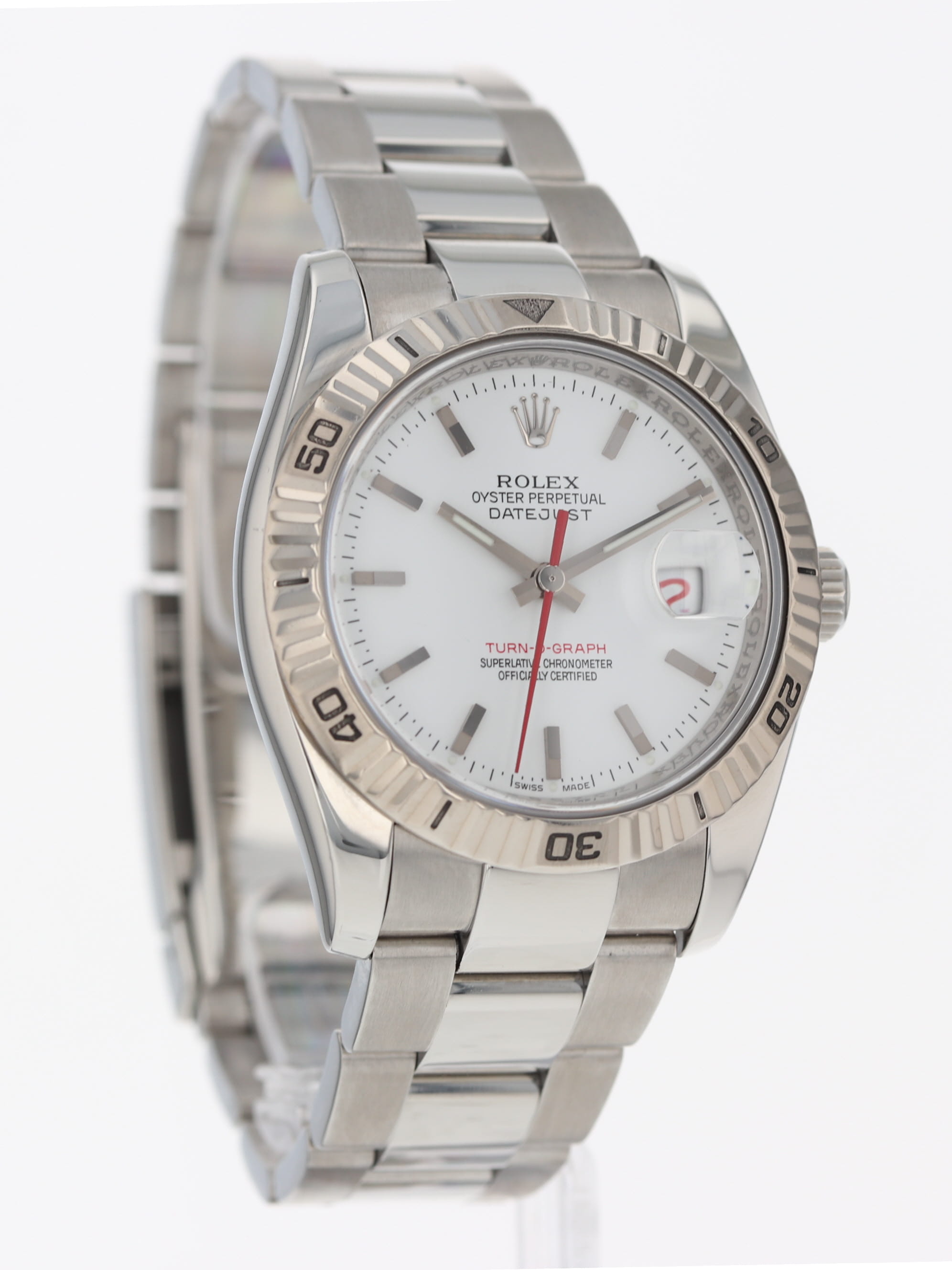 Rolex stainless steel Datejust Turn-O-Graph, automatic, size 36mm. Rolex reference 116264 with a stainless steel case and Oyster bracelet, 18k white gold fluted bidirectional rotating bezel, white index dial, luminescent markers and hands, magnified date display with red date wheel, sapphire crystal. "Z" serial, circa 2006. One year full warranty.