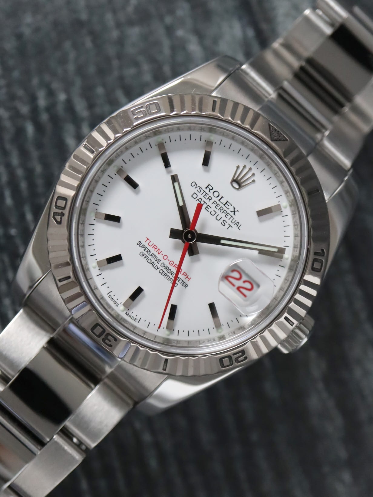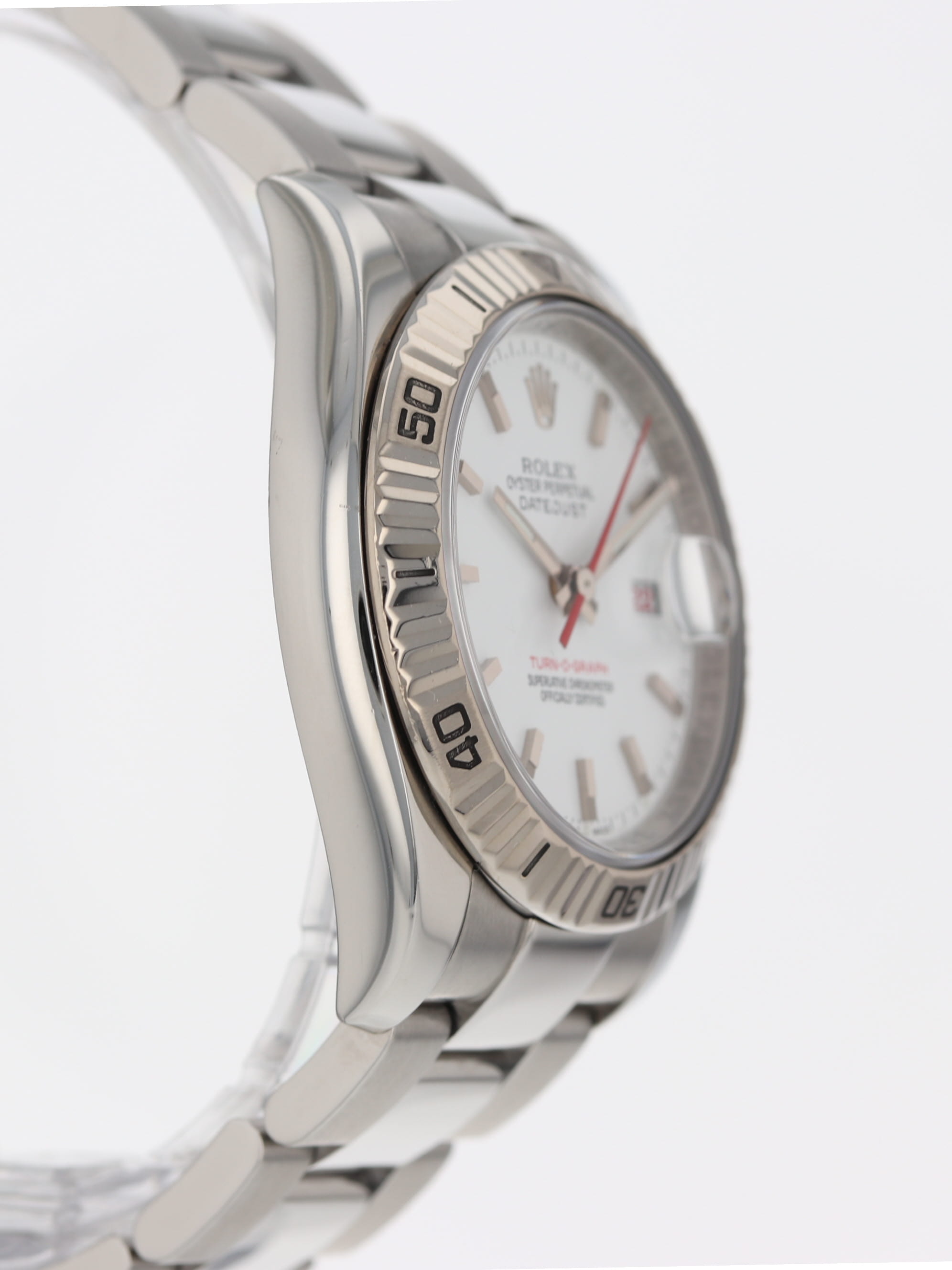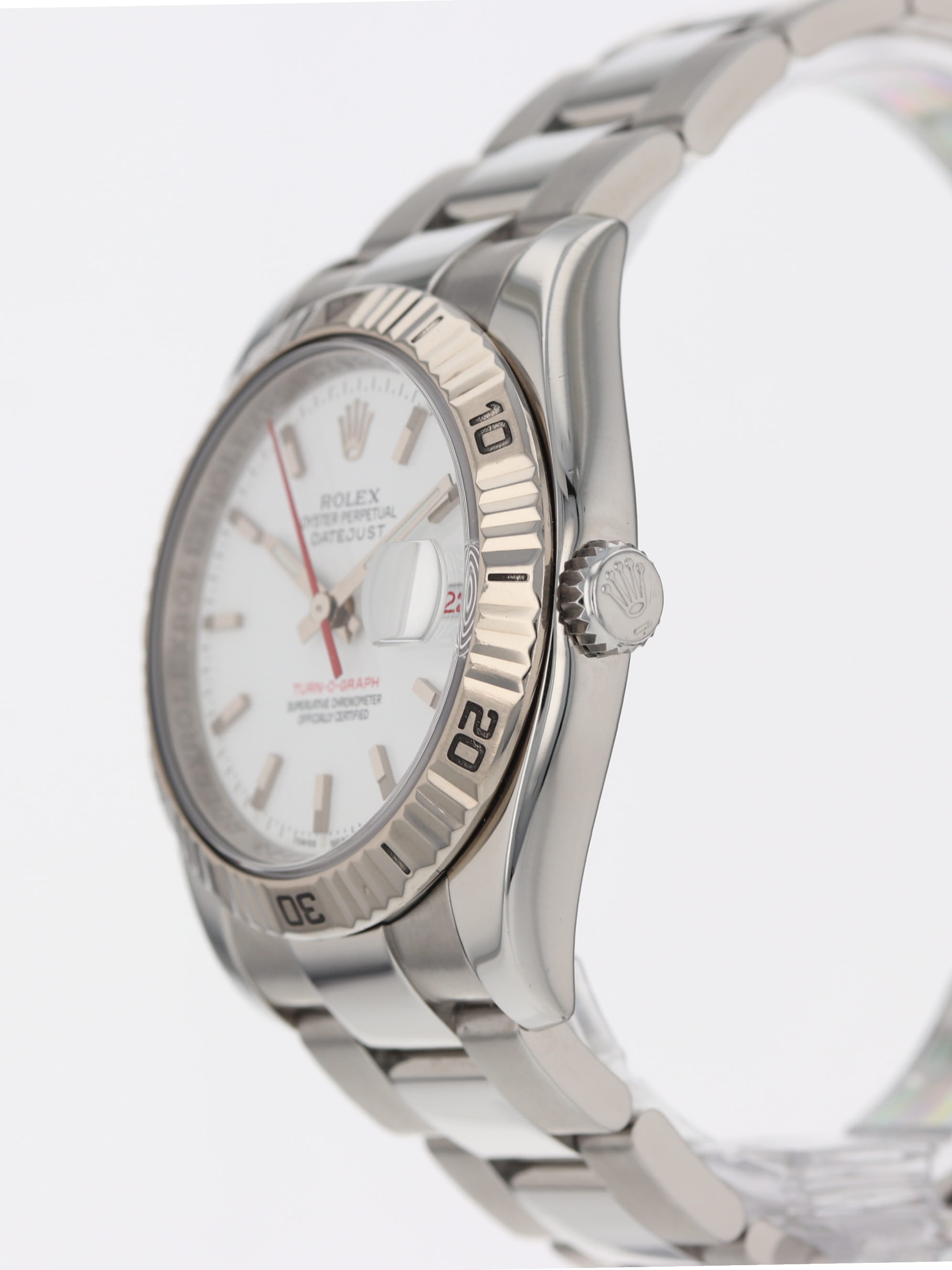 Rolex stainless steel Datejust Turn-O-Graph, automatic, size 36mm. Rolex reference 116264 with a stainless steel case and Oyster bracelet, 18k white gold fluted bidirectional rotating bezel, white index dial, luminescent markers and hands, magnified date display with red date wheel, sapphire crystal. "Z" serial, circa 2006. One year full warranty.