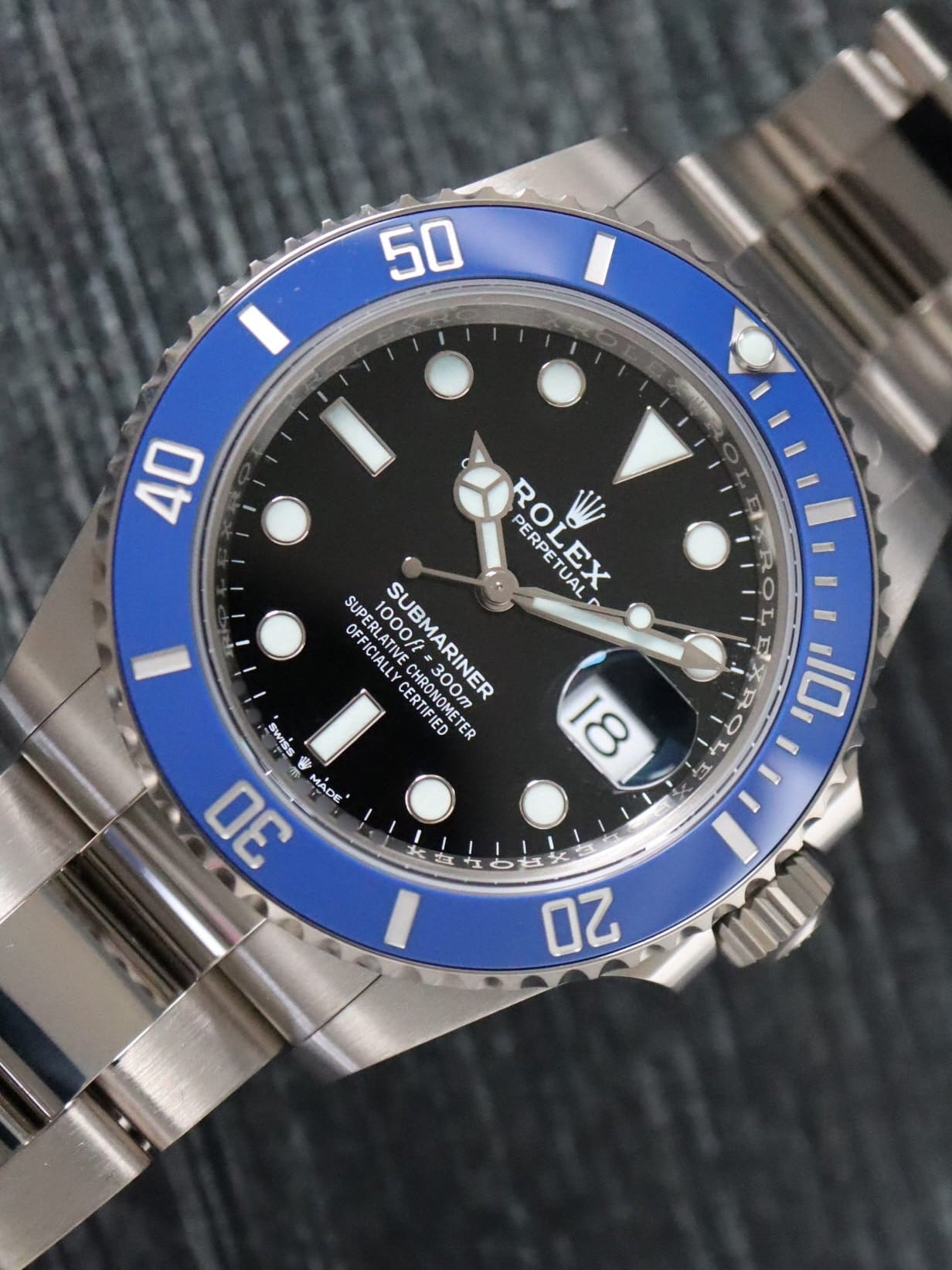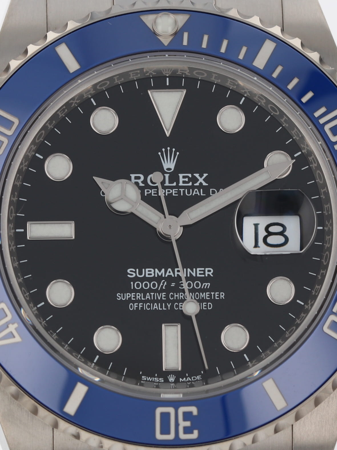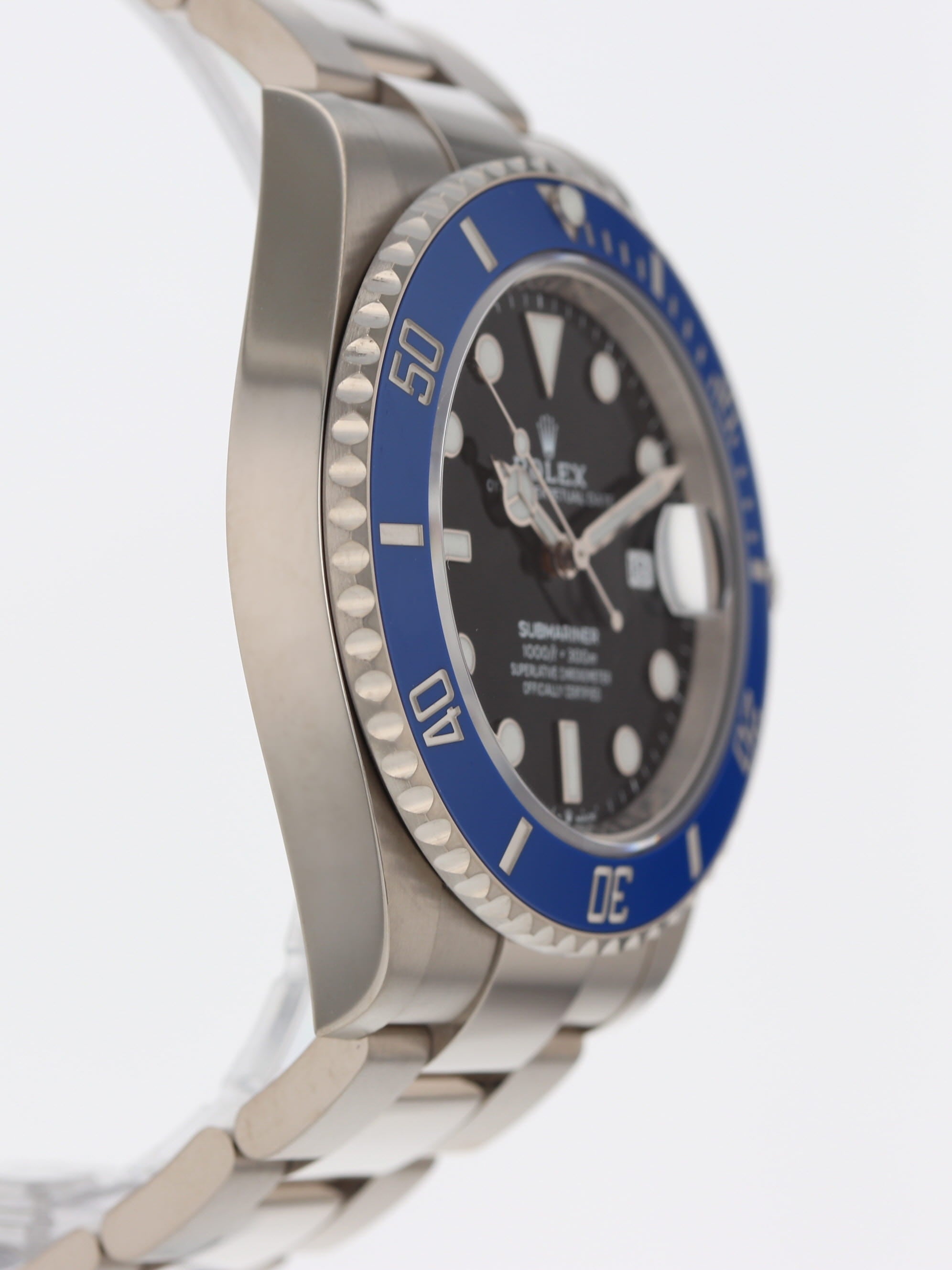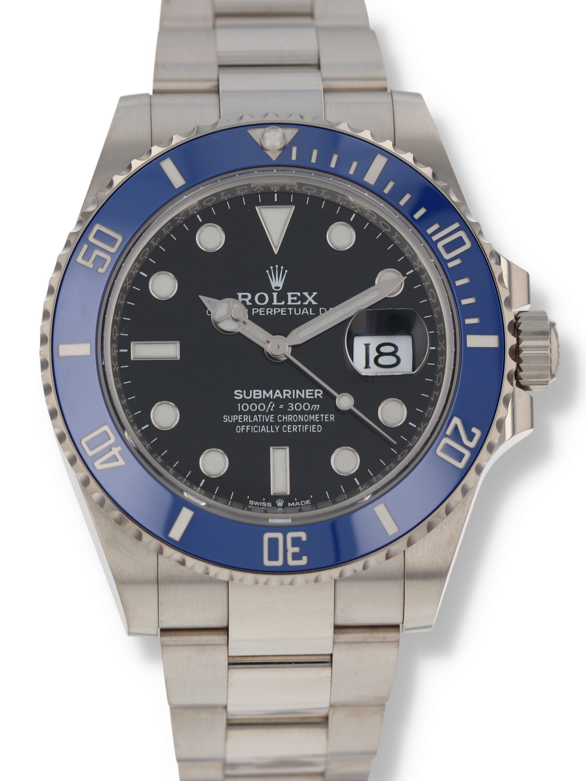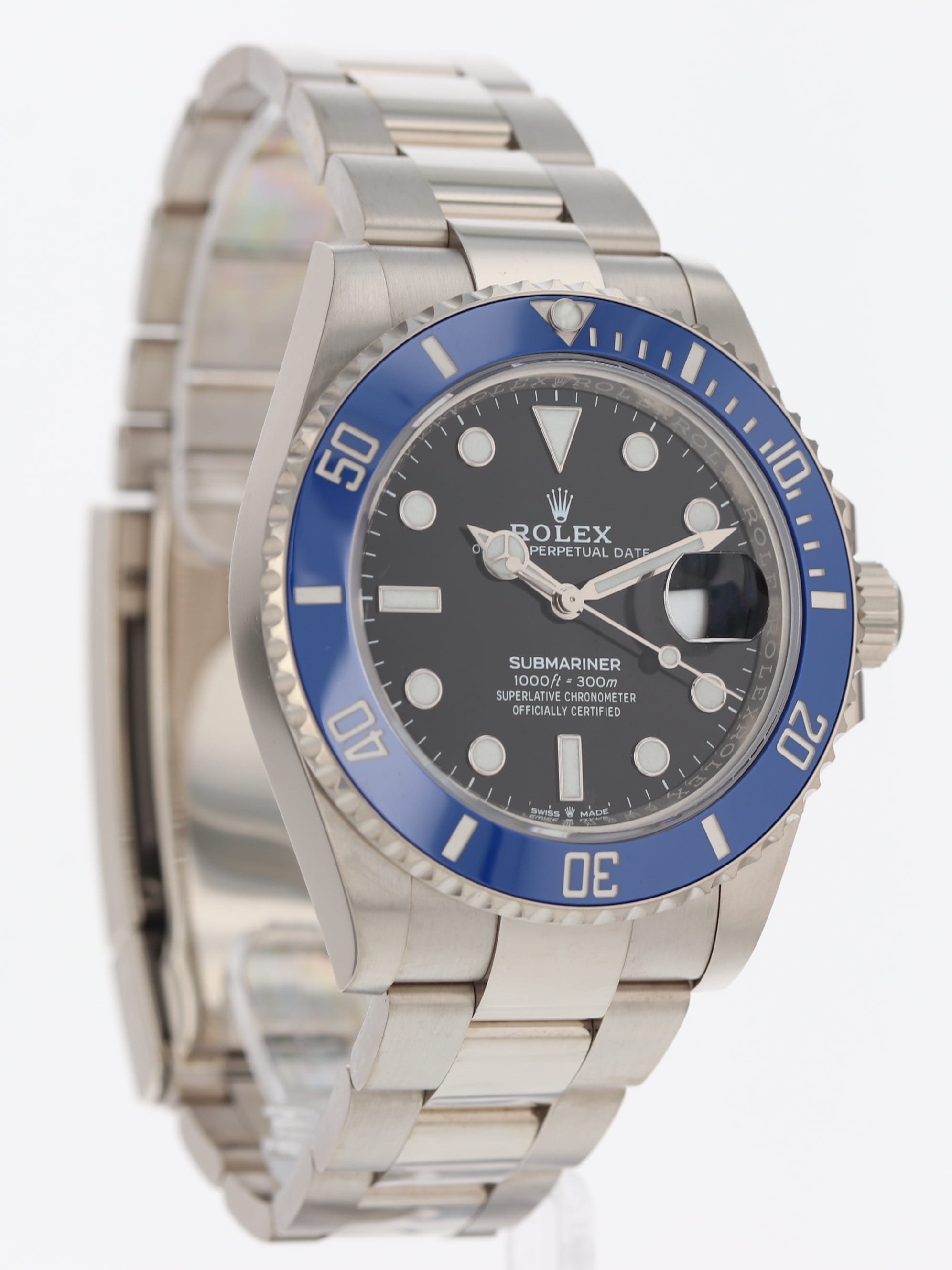 Rolex 18k white gold Submariner, automatic, size 41mm. Rolex ref. 126619LB with an 18k white gold case and Oyster bracelet, Folding Oysterlock safety clasp with Rolex Glidelock extension system, 18k uni-directional blue ceramic bezel, black index dial, blue luminescence, magnified date display, sapphire crystal. Rolex box and card dated 2023.