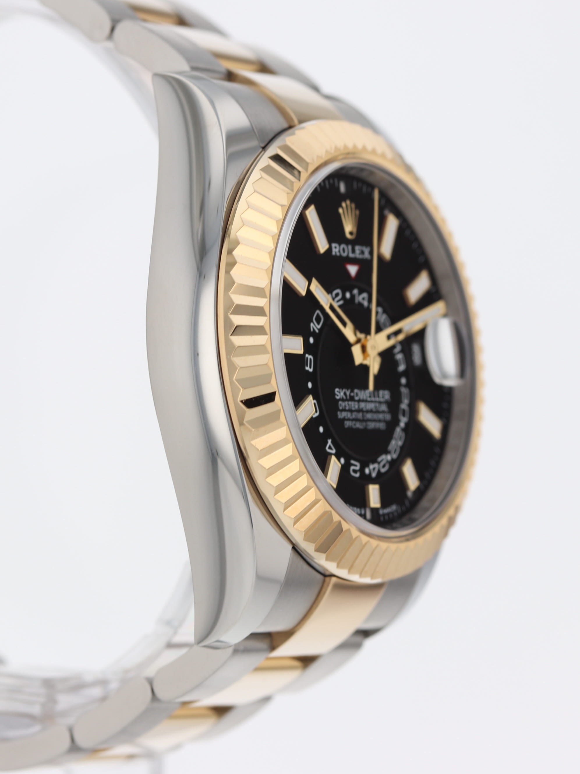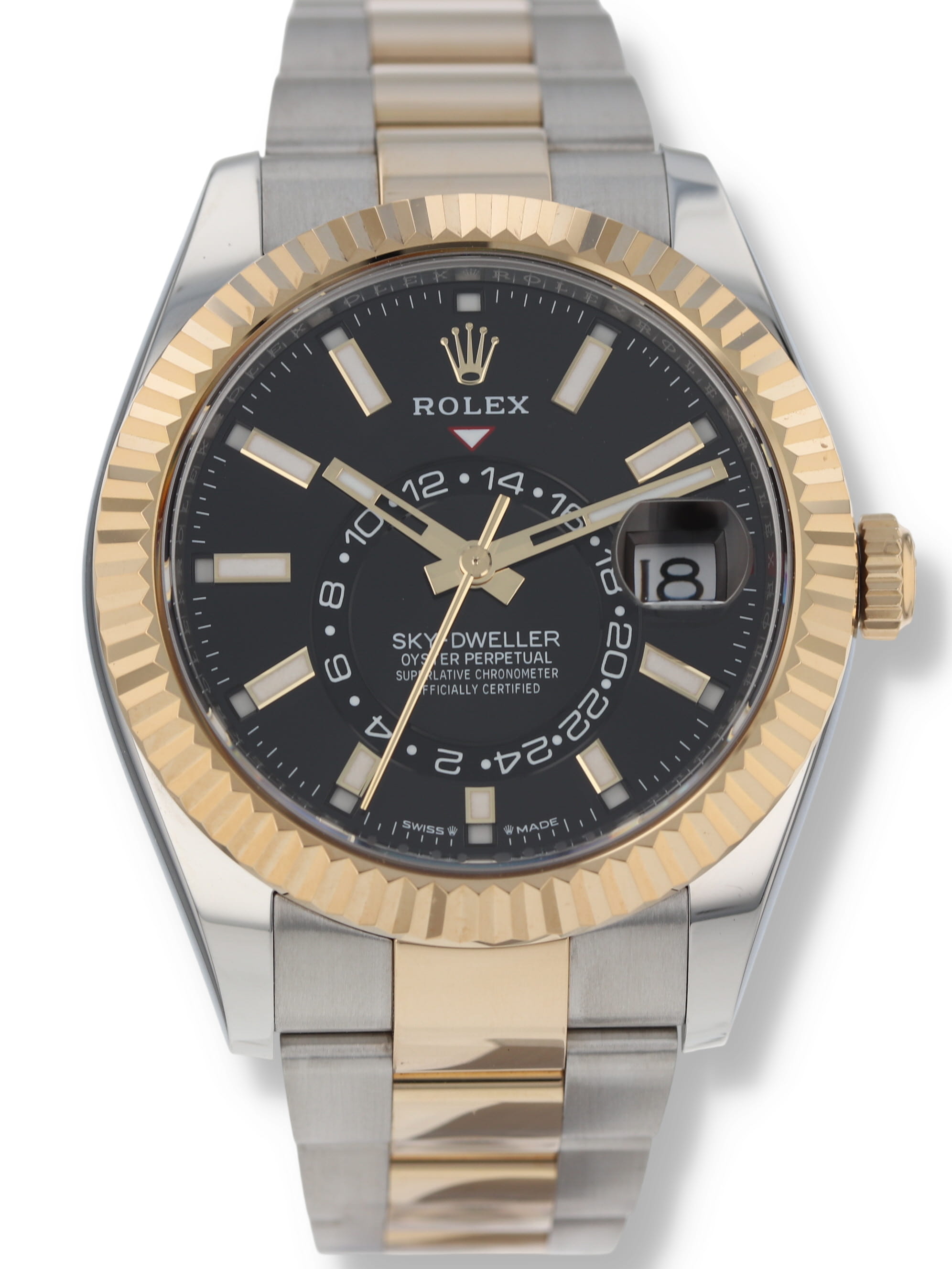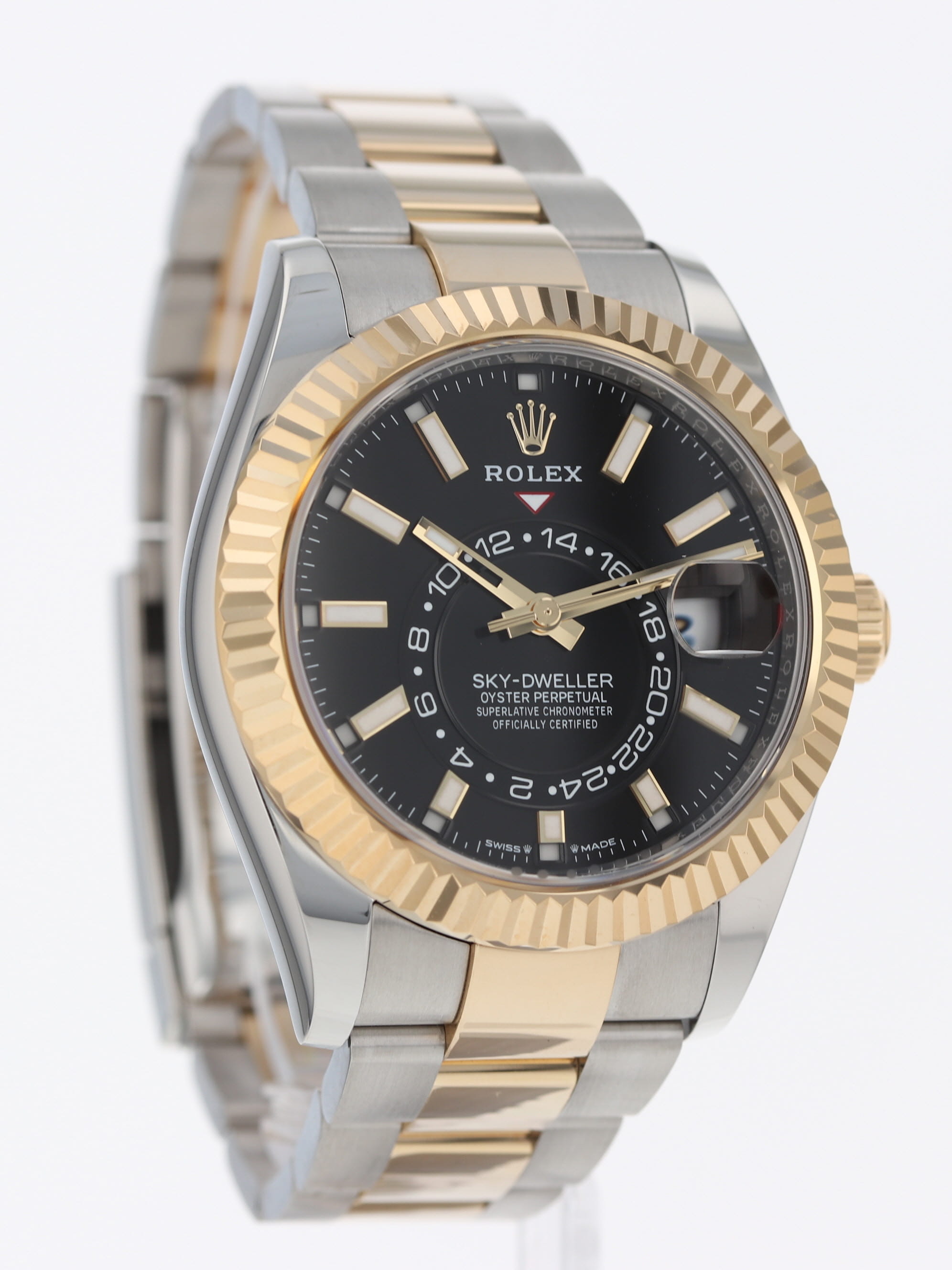 Rolex stainless steel and 18k yellow gold Sky-Dweller, automatic, size 42mm. Rolex reference 336933 with a stainless steel case and two tone Oyster bracelet, 18k yellow gold fluted bezel, black index dial, luminescent markers and hands, centre hours, minute, seconds, 24-hour display, second time zone, annual calendar, rapid setting of date, month display, stop seconds, sapphire crystal. Rolex box and card dated 2024.