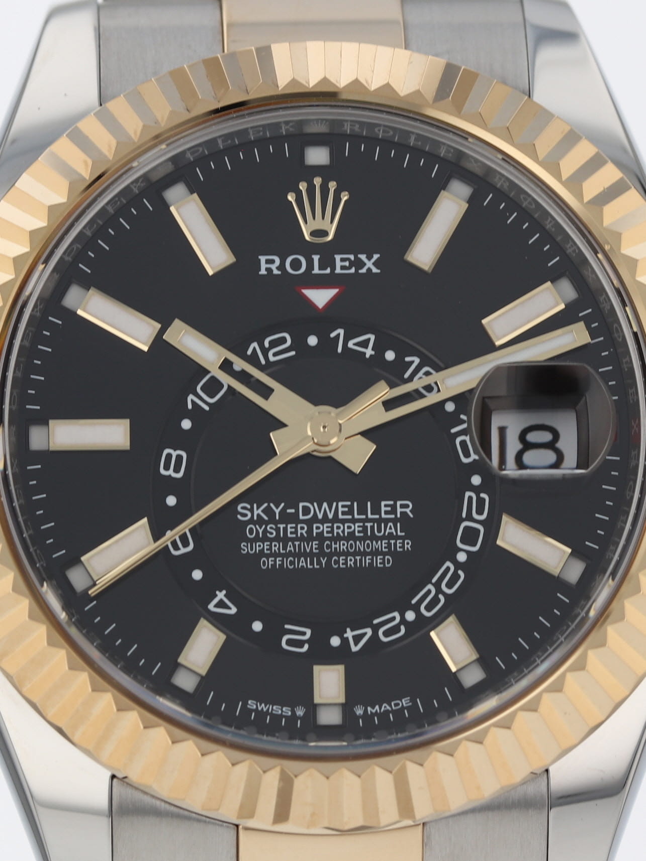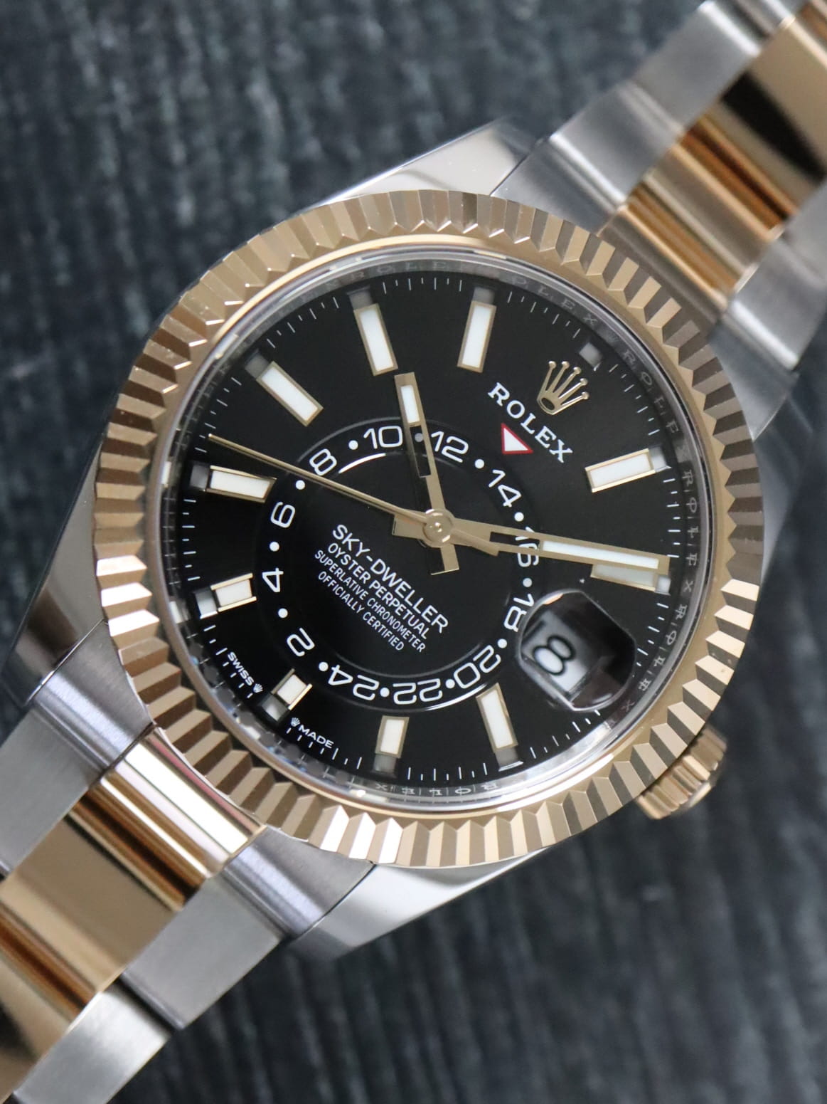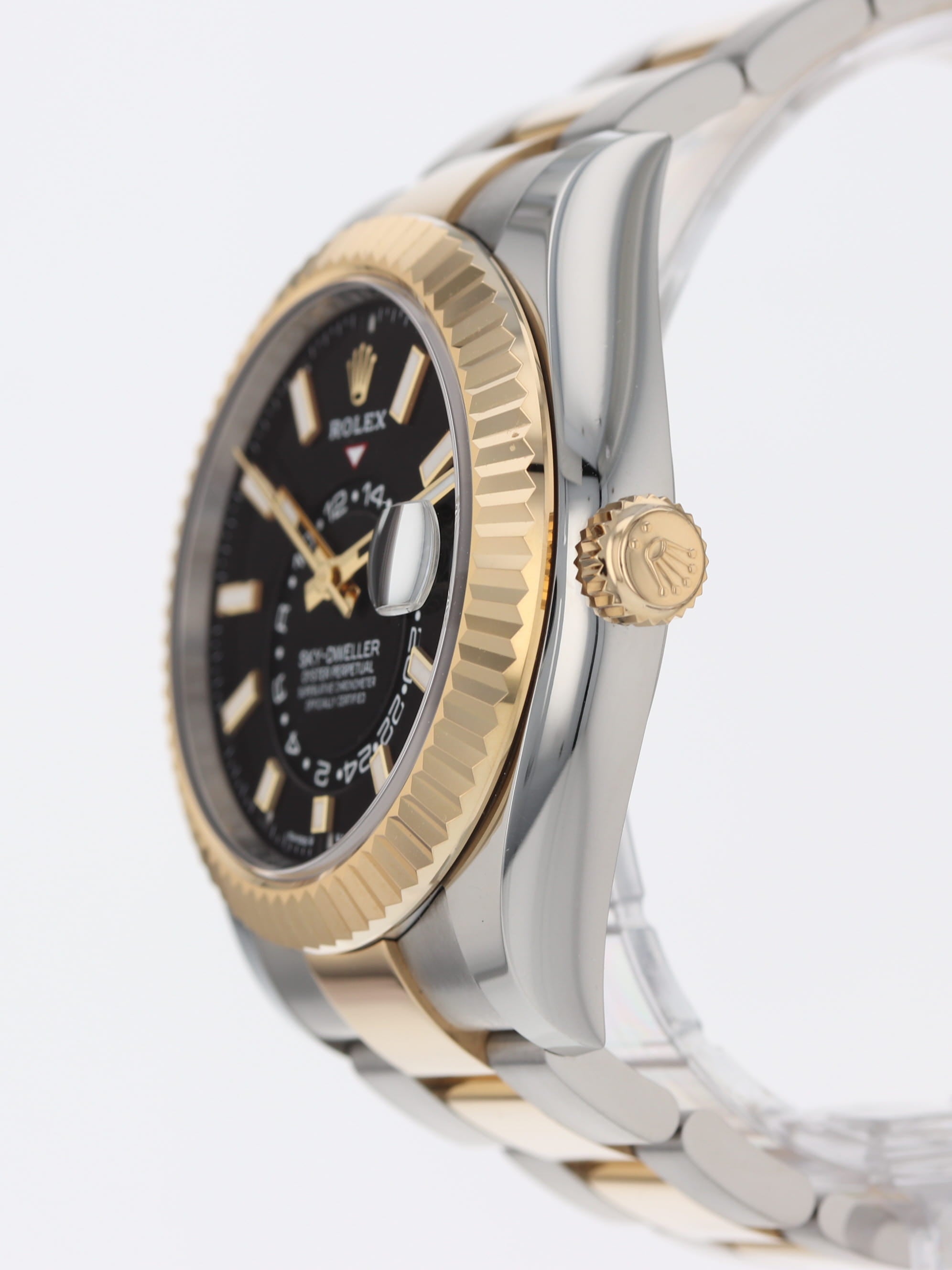 Rolex stainless steel and 18k yellow gold Sky-Dweller, automatic, size 42mm. Rolex reference 336933 with a stainless steel case and two tone Oyster bracelet, 18k yellow gold fluted bezel, black index dial, luminescent markers and hands, centre hours, minute, seconds, 24-hour display, second time zone, annual calendar, rapid setting of date, month display, stop seconds, sapphire crystal. Rolex box and card dated 2024.