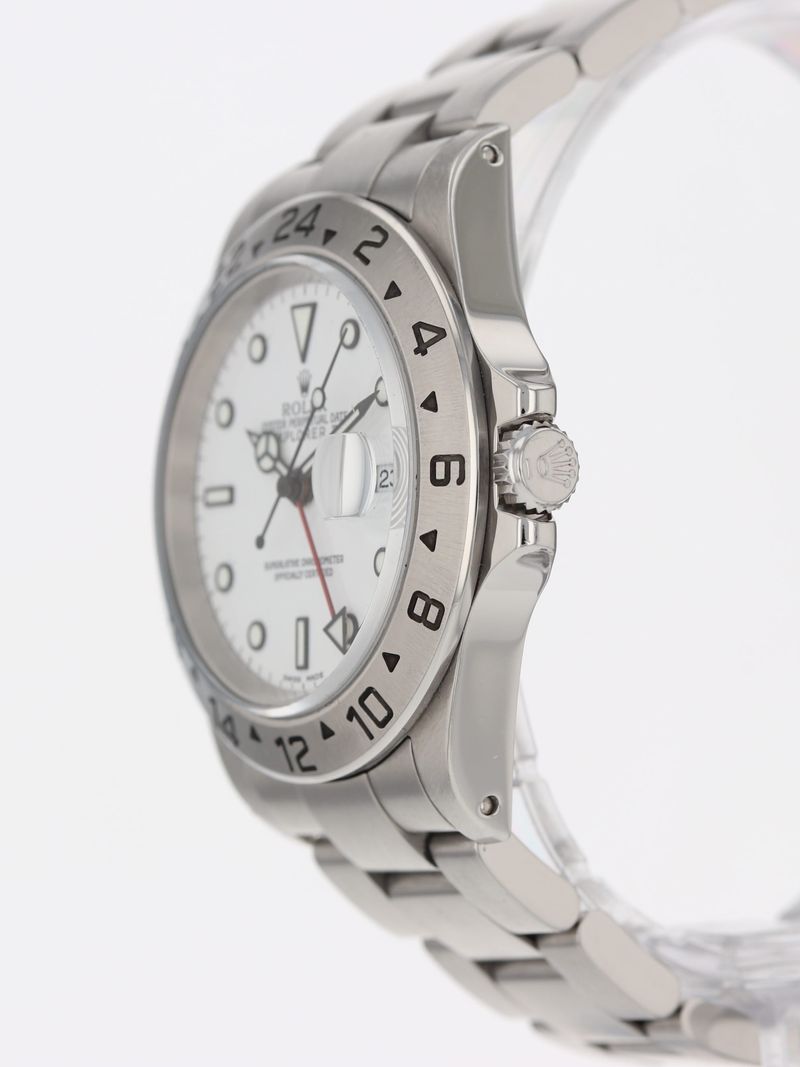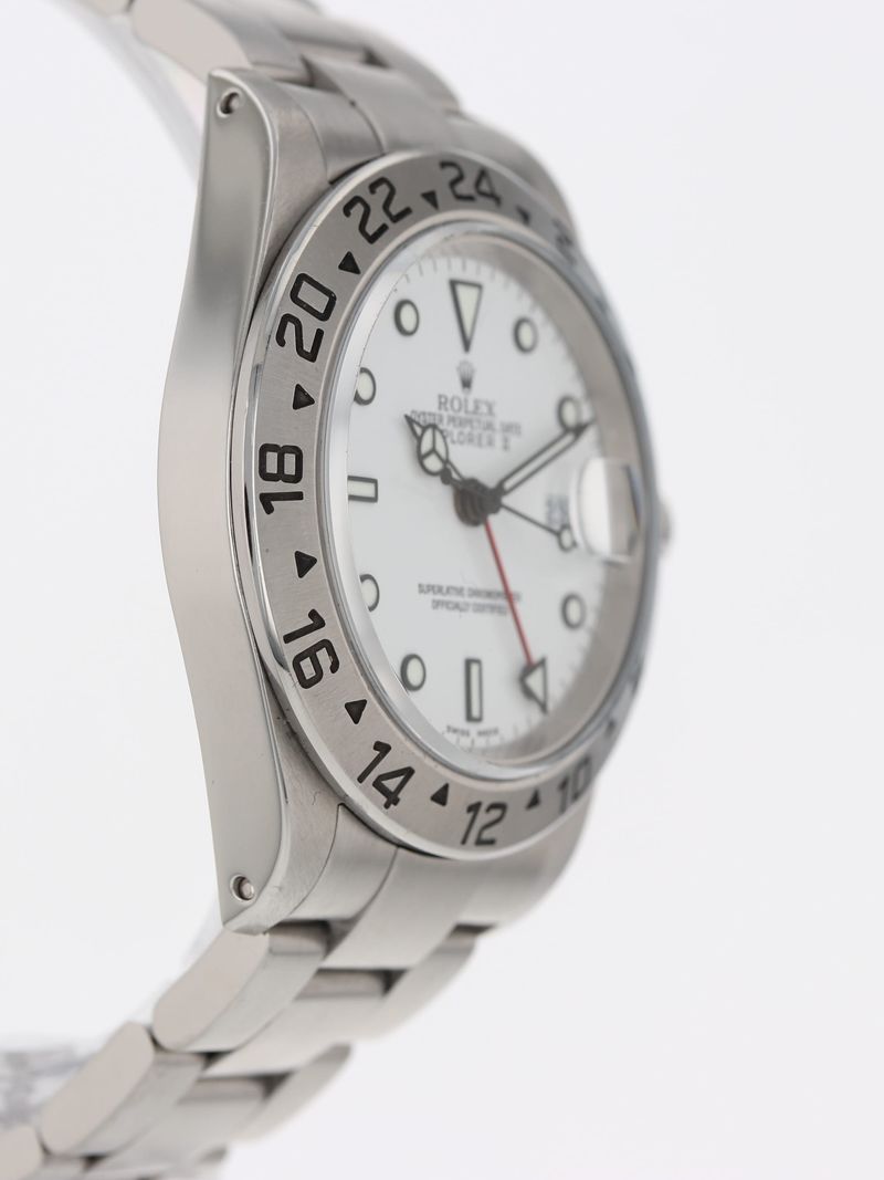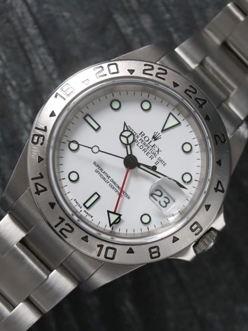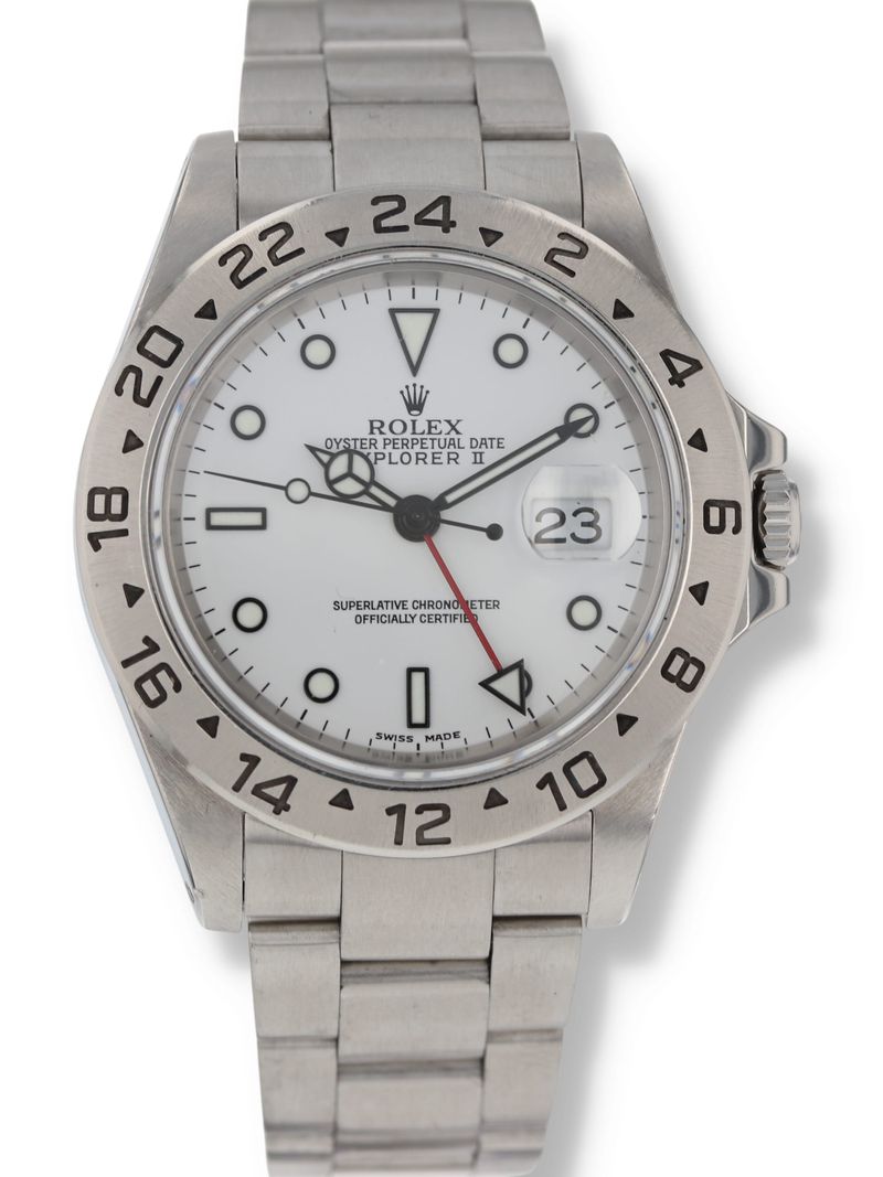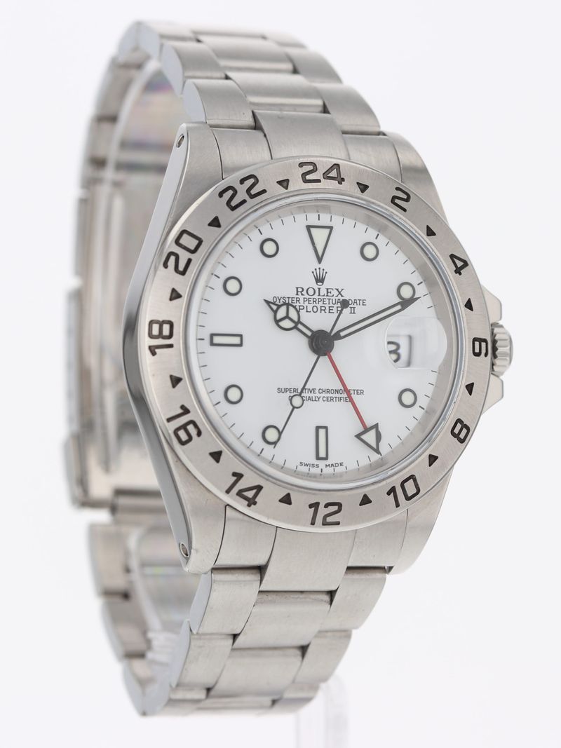 Rolex stainless steel Explorer II "Polar", automatic, size 40mm. Rolex reference 16570 with a stainless steel case and Oyster bracelet, white Swiss Made index dial, 24-hour engraved fixed bezel, luminescent markers and hands, magnified date display, sapphire crystal. "Y" serial. Rolex box and papers dated 2003. One year full warranty.