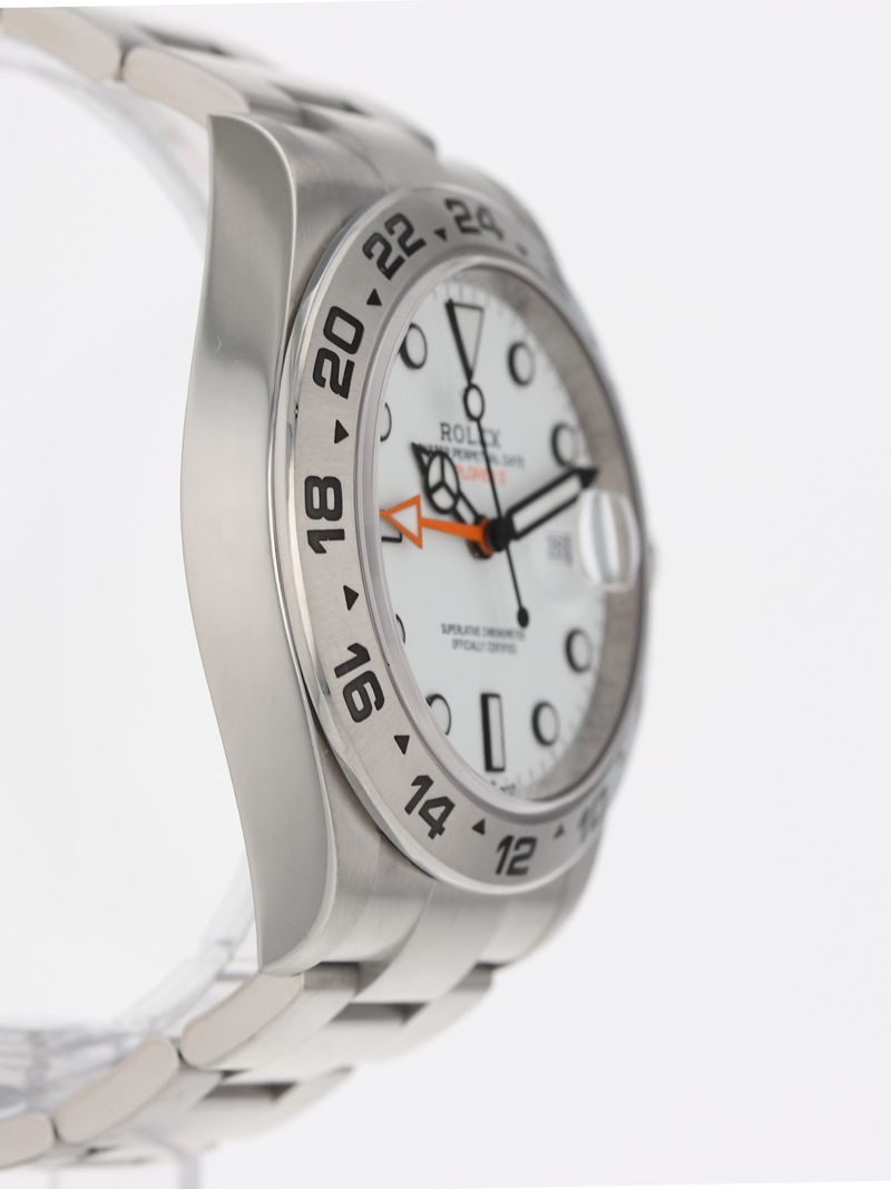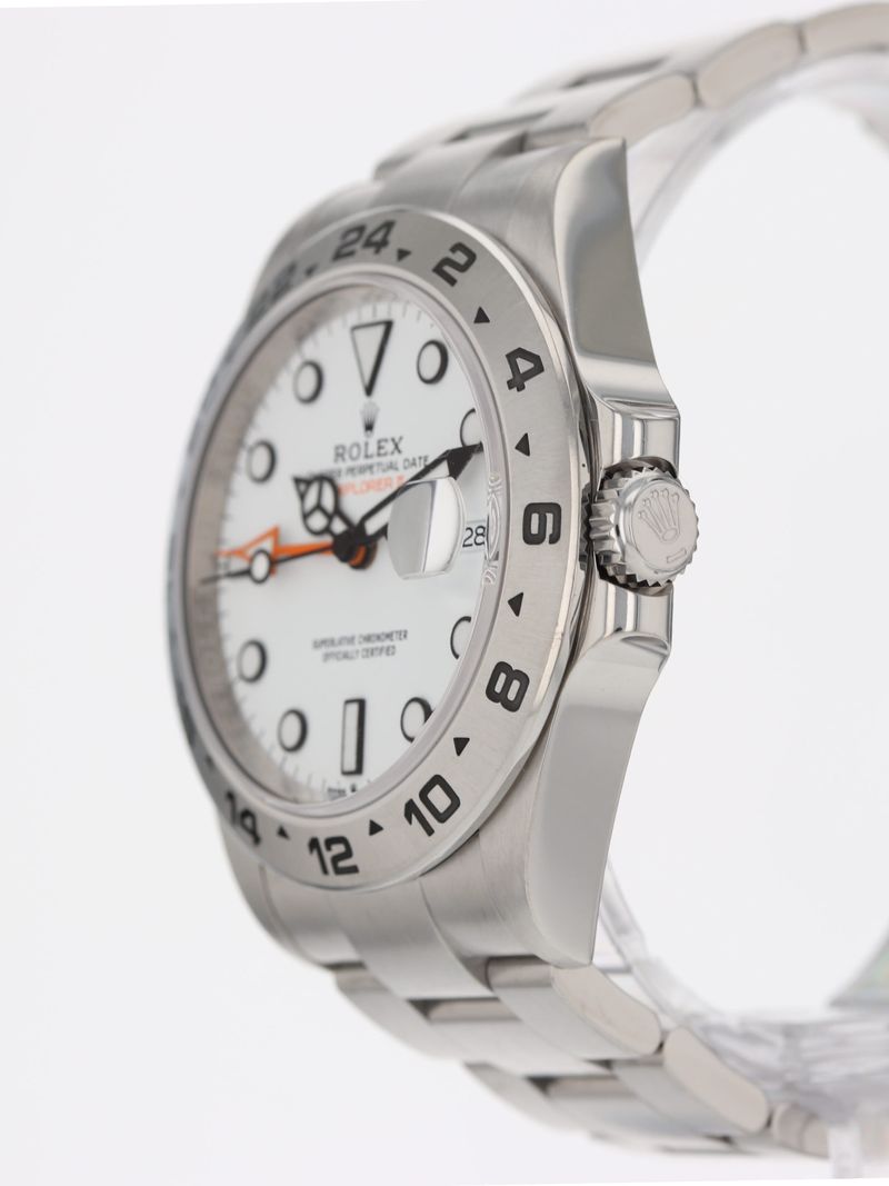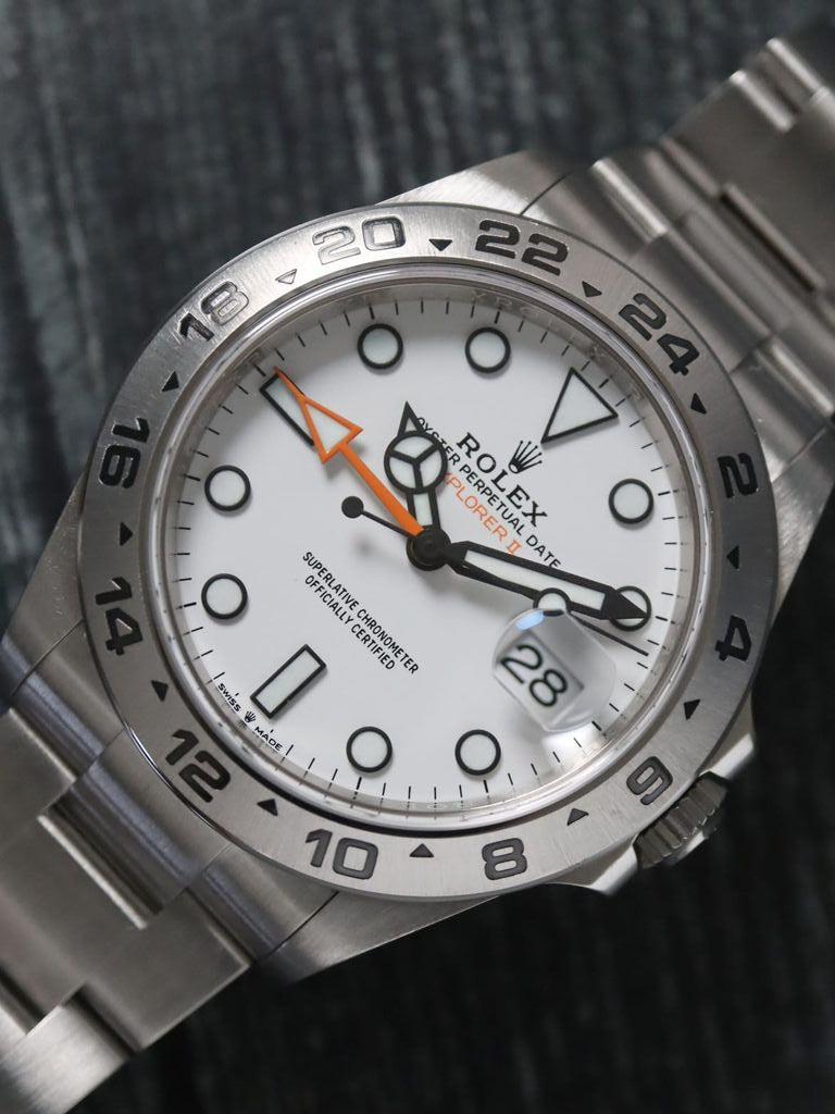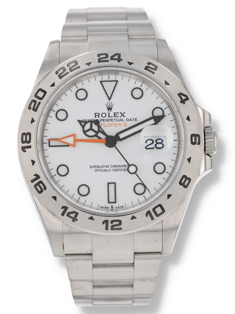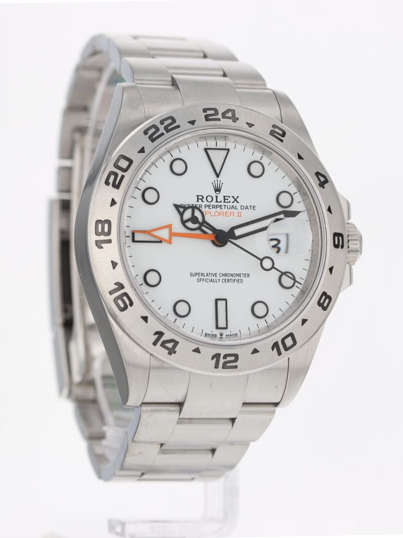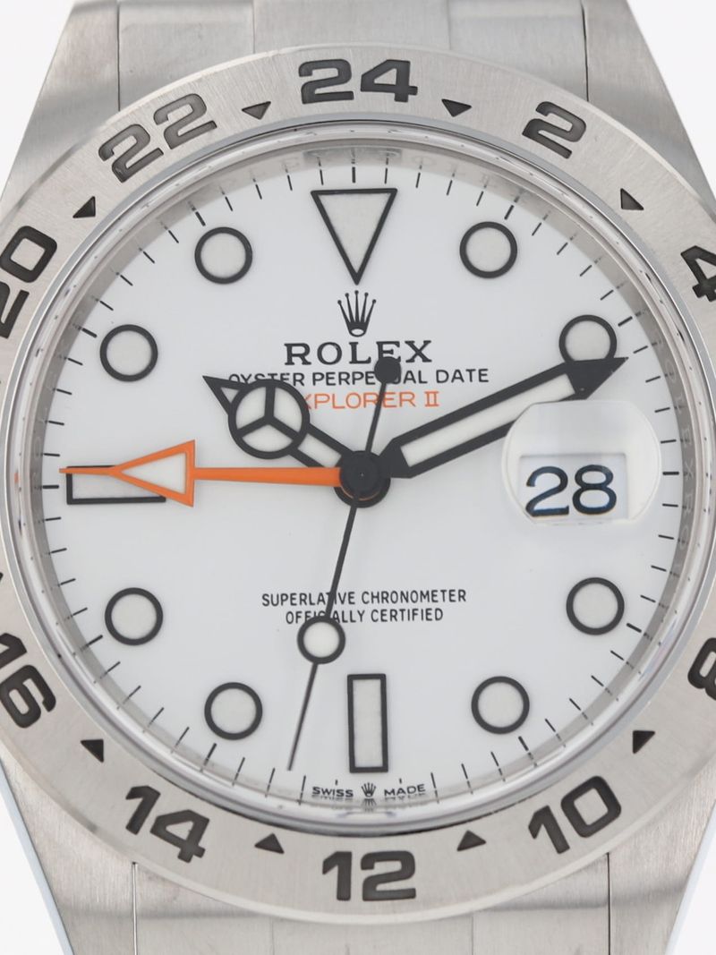 Rolex stainless steel Explorer II, automatic, size 42mm. Rolex reference 226570 with a stainless steel case and Oyster bracelet, Folding Oysterlock safety clasp with Easylink 5 mm comfort extension link, 24-hour bezel, "Polar" white index dial, luminescent markers and hands, magnified date display, sapphire crystal. Rolex box and card dated 2022.